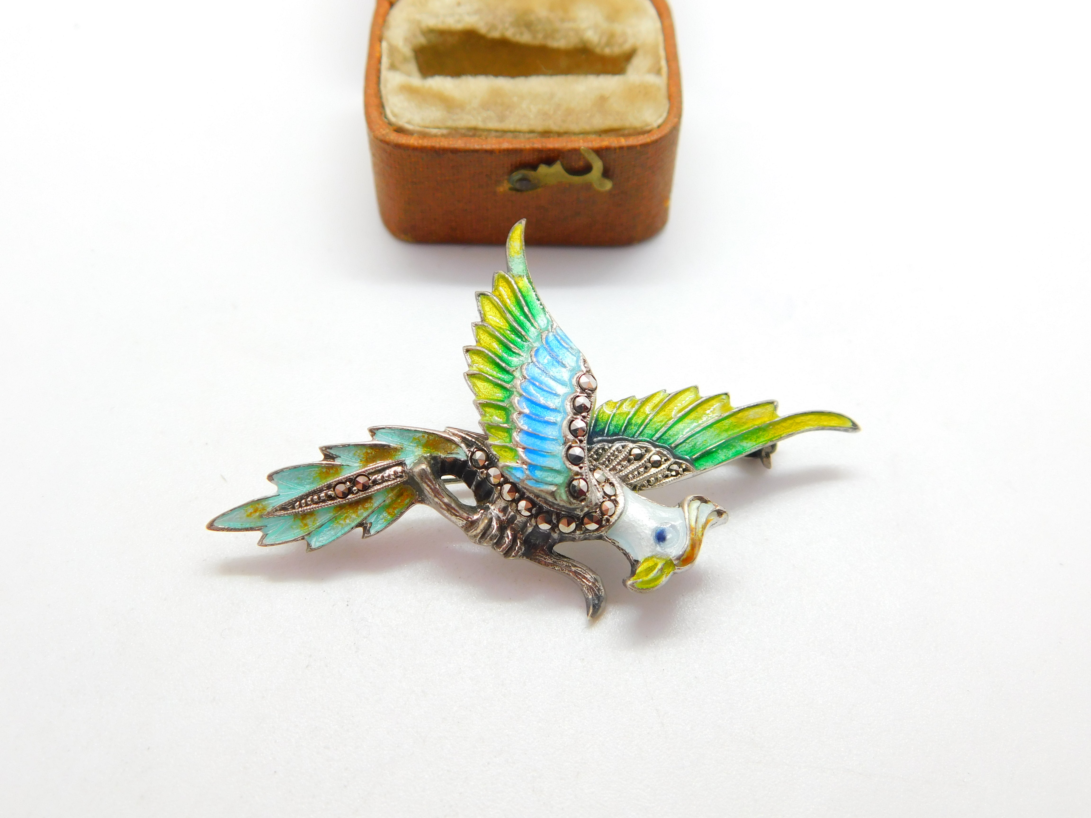 .800 Silver & Colourful Enamel Parrot on Perch Statement Brooch c1990 Vintage