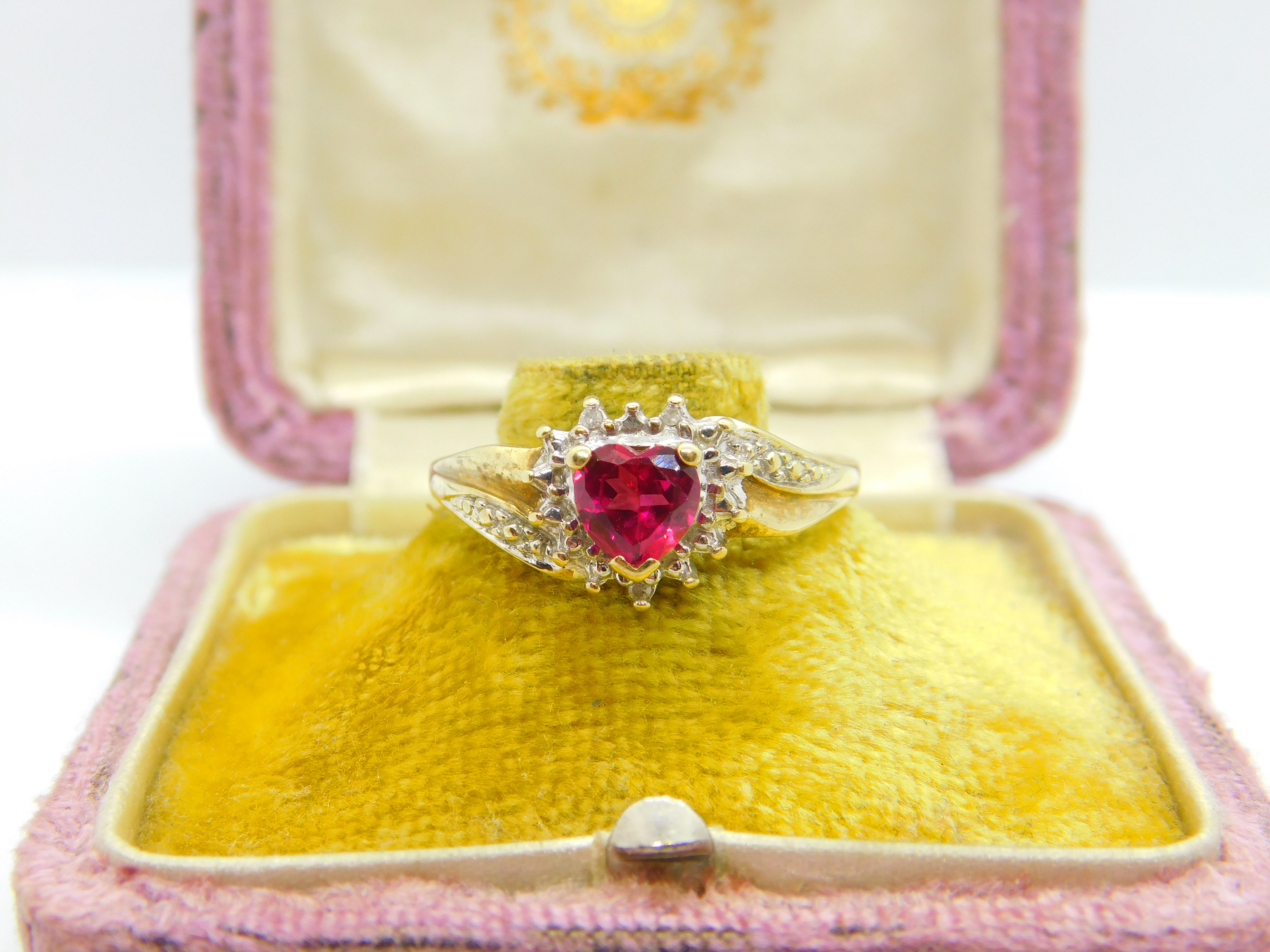 10ct Yellow Gold & Heart Cut Ruby Band Ring Vintage c1990 Size V UK
