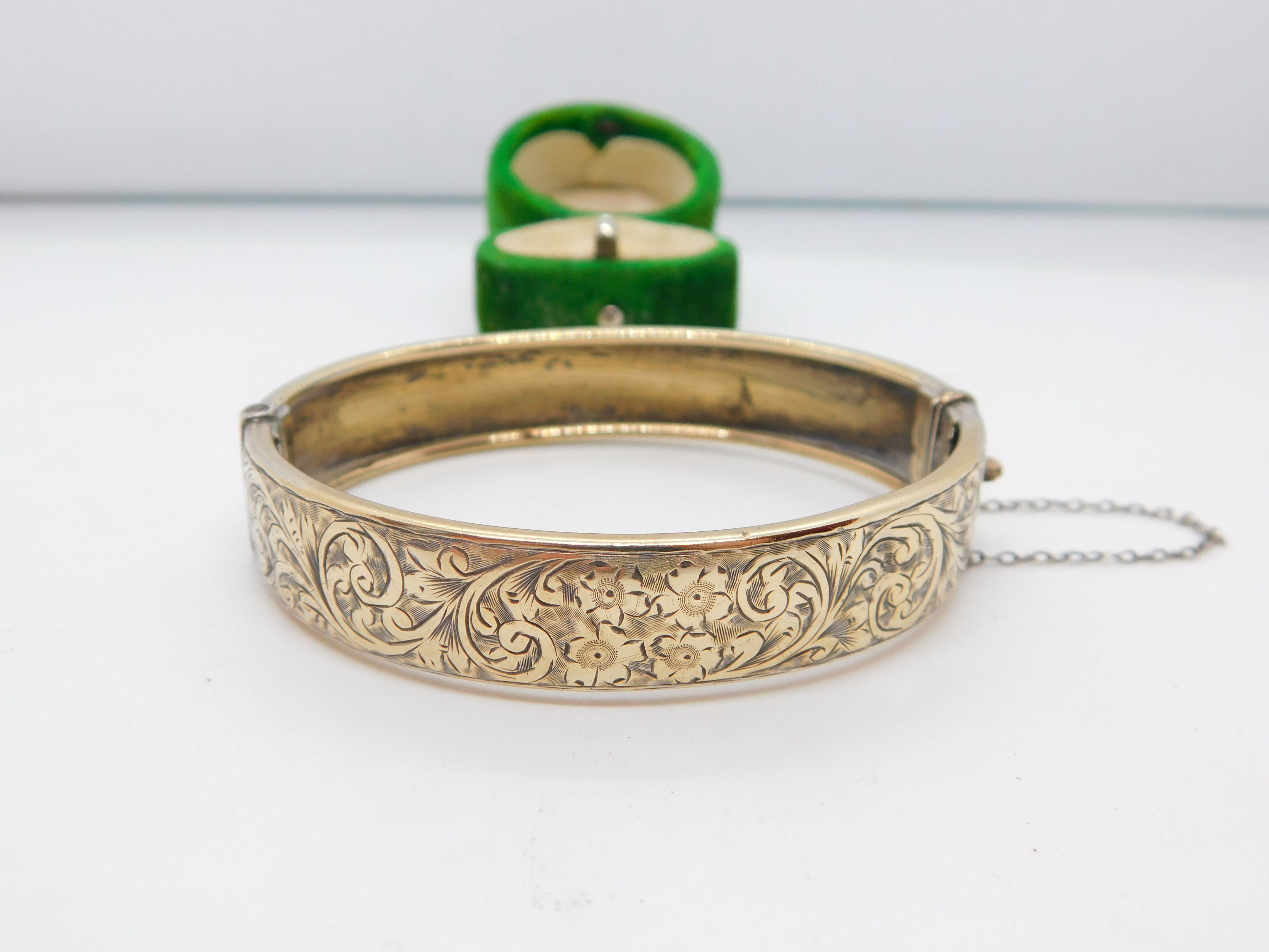 '19ct Gold on Silver' Floral Pattern Cuff Bangle Bracelet Antique c1920 Art Deco
