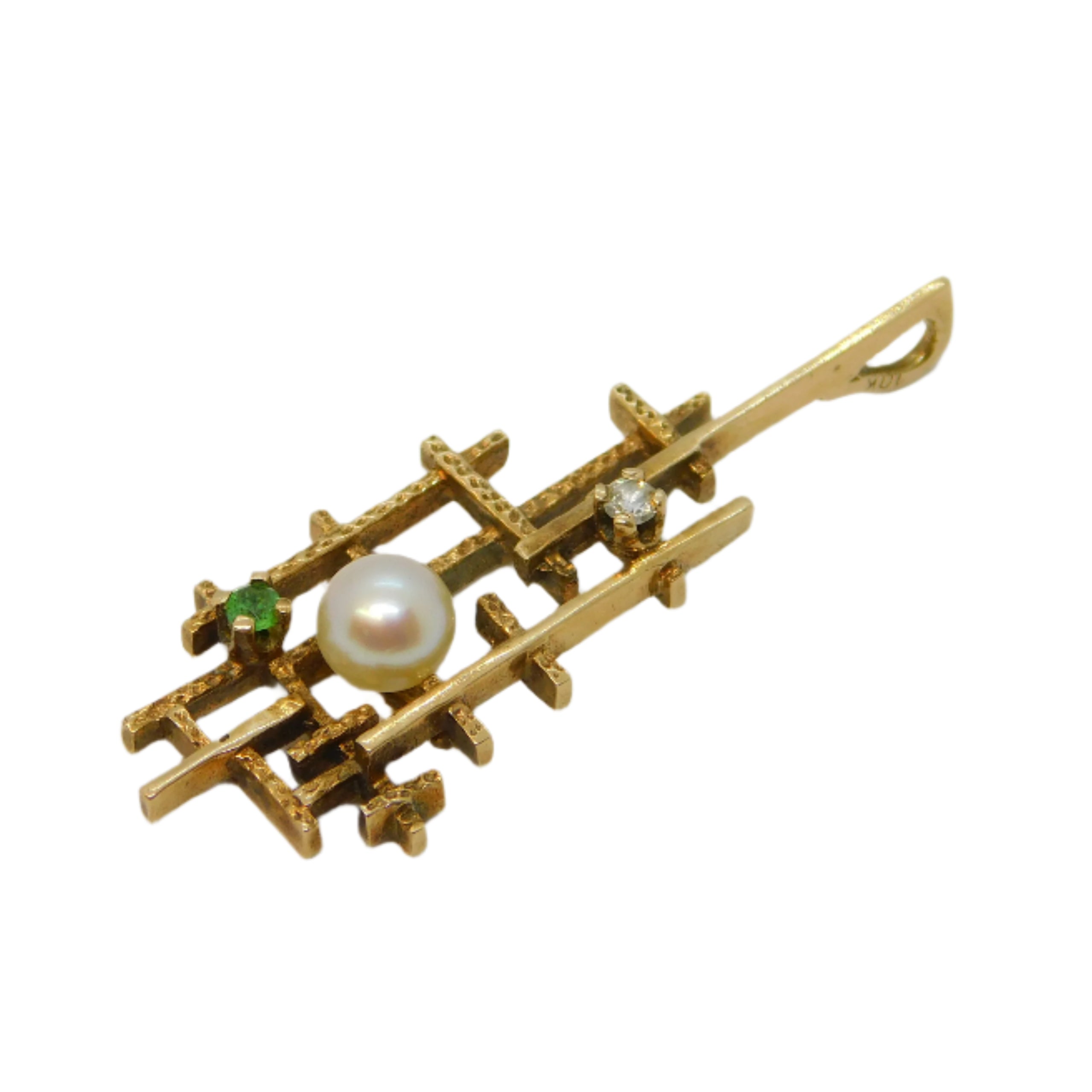 10ct Yellow Gold Brutalist Diamond, Peridot, Pearl Pendant Vintage c1970