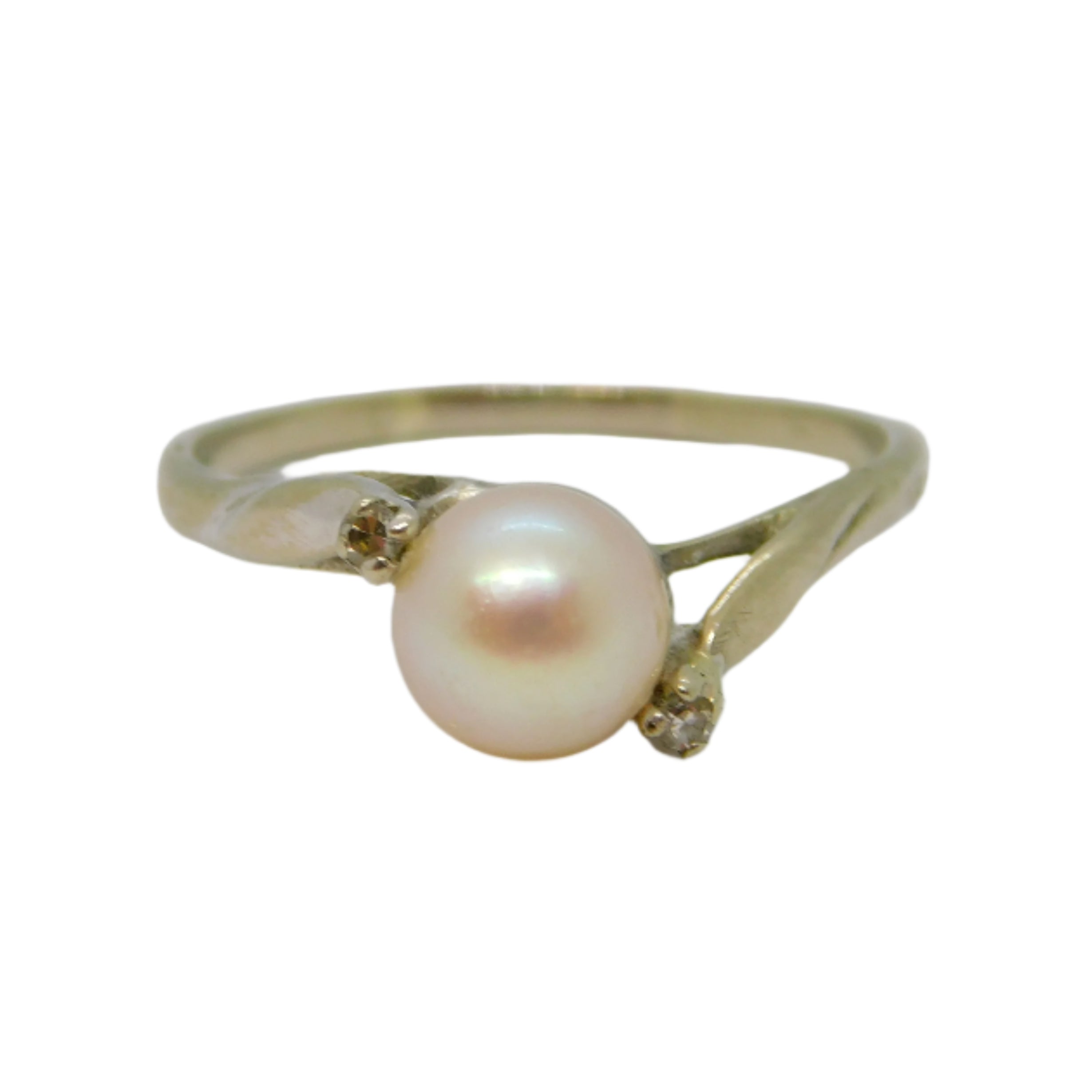 10ct White Gold, Cultured Pearl & Diamond Crossover Ring Vintage c1970