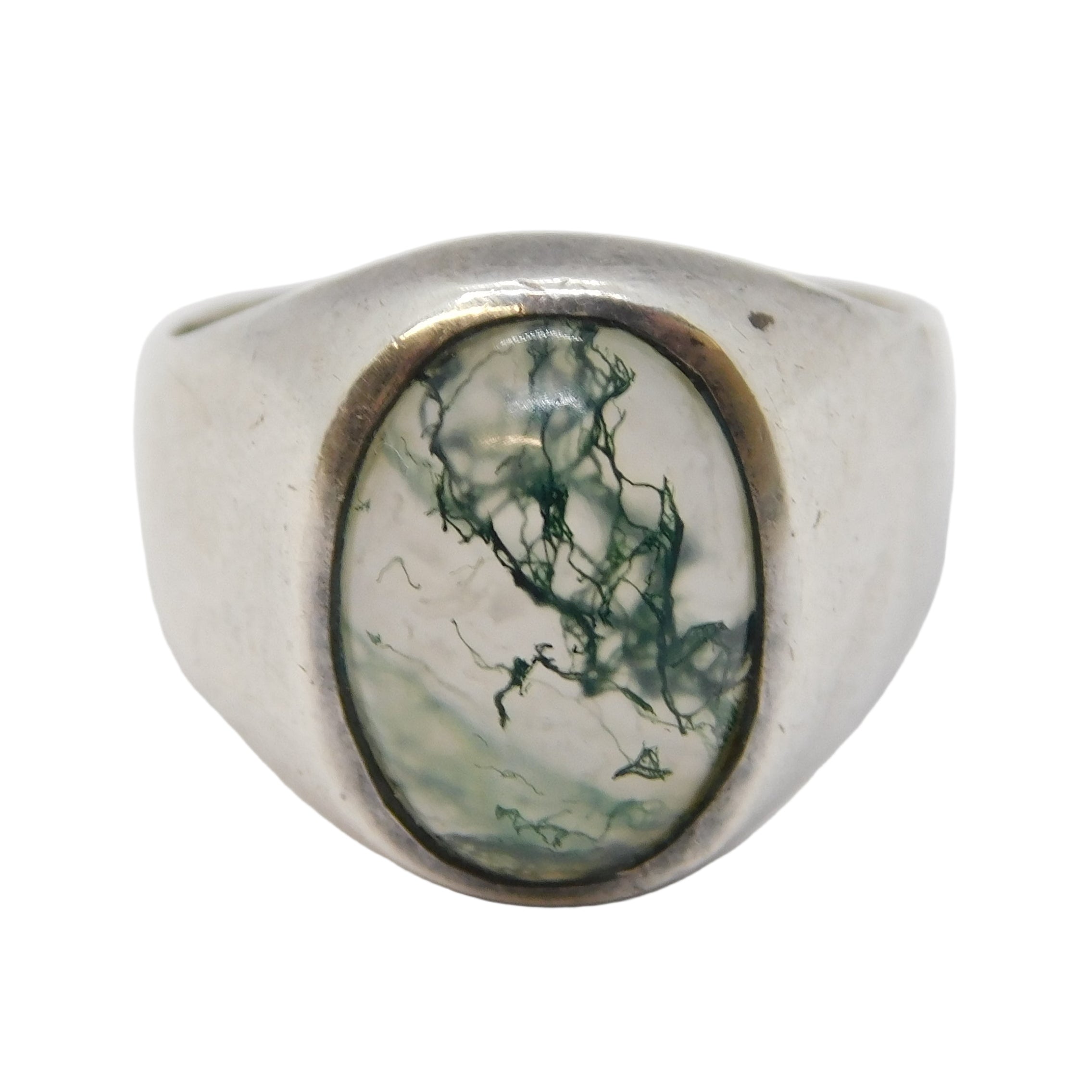 Sterling Silver & Cabochon Moss Agate Signet Ring Vintage c1970