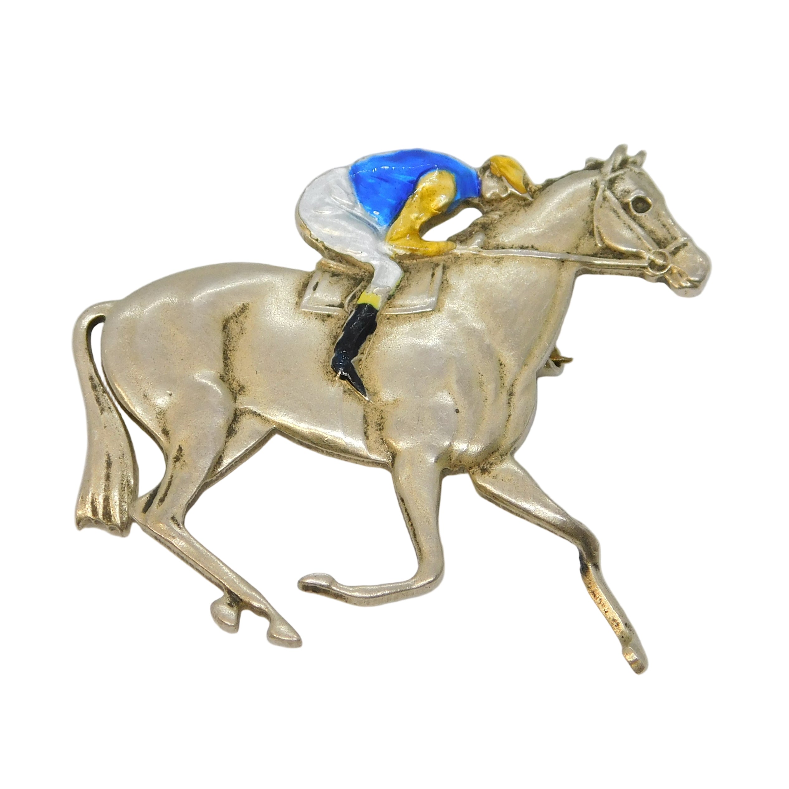 Sterling Silver & Enamel Horse Racing Interest Brooch Pin Antique c1920 Art Deco