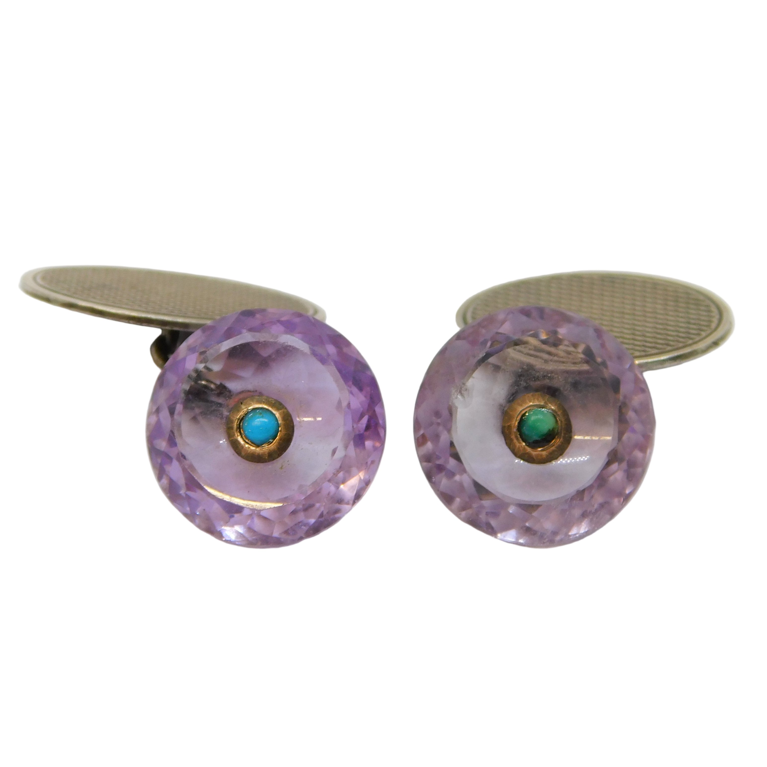 Sterling Silver, Faceted Amethyst, Turquoise Dress Cufflinks Antique c1920 Deco