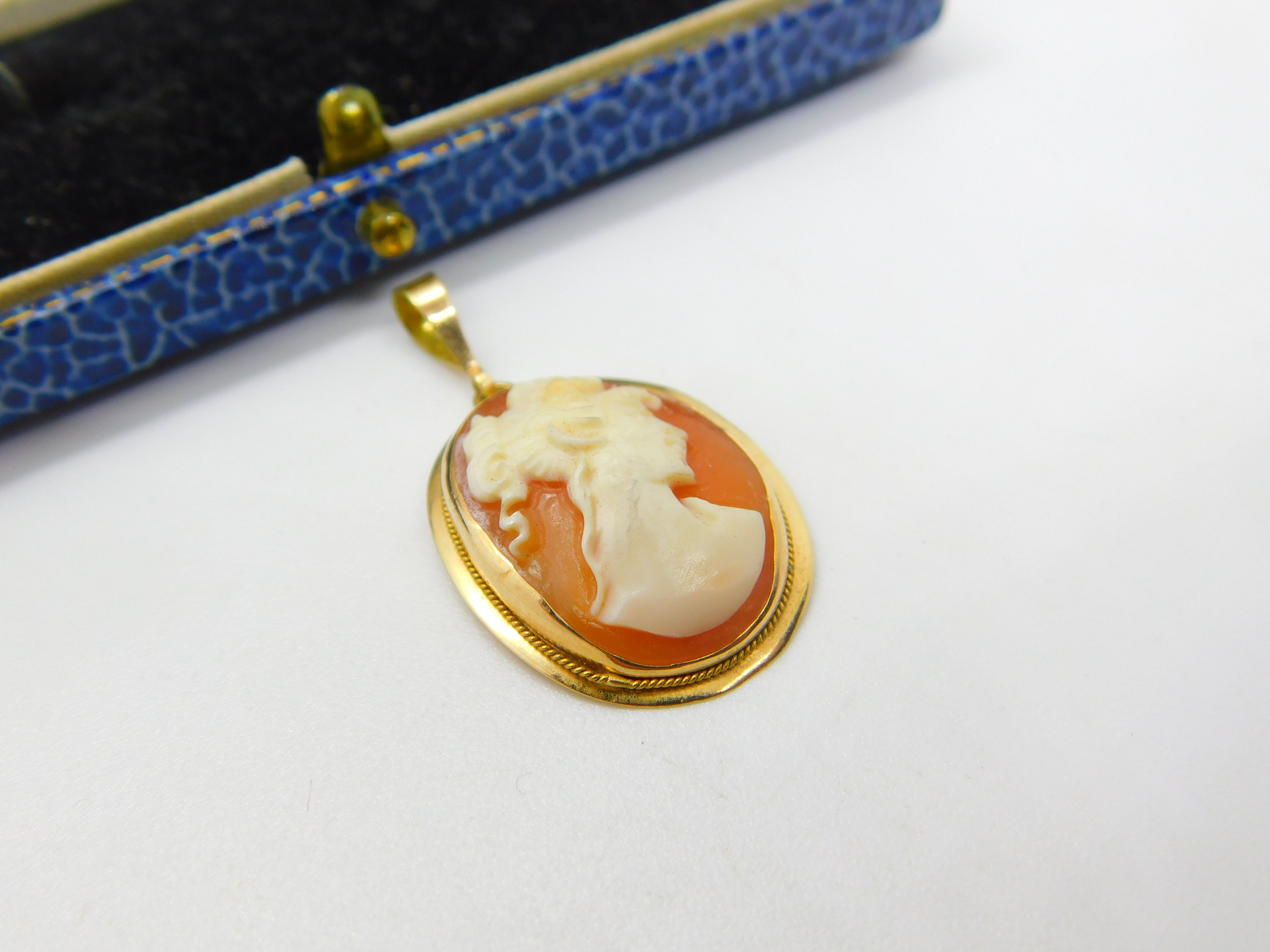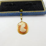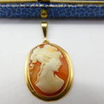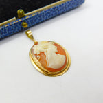 14ct Yellow Gold & Carved Shell Cameo Classical Lady Pendant Vintage c1970