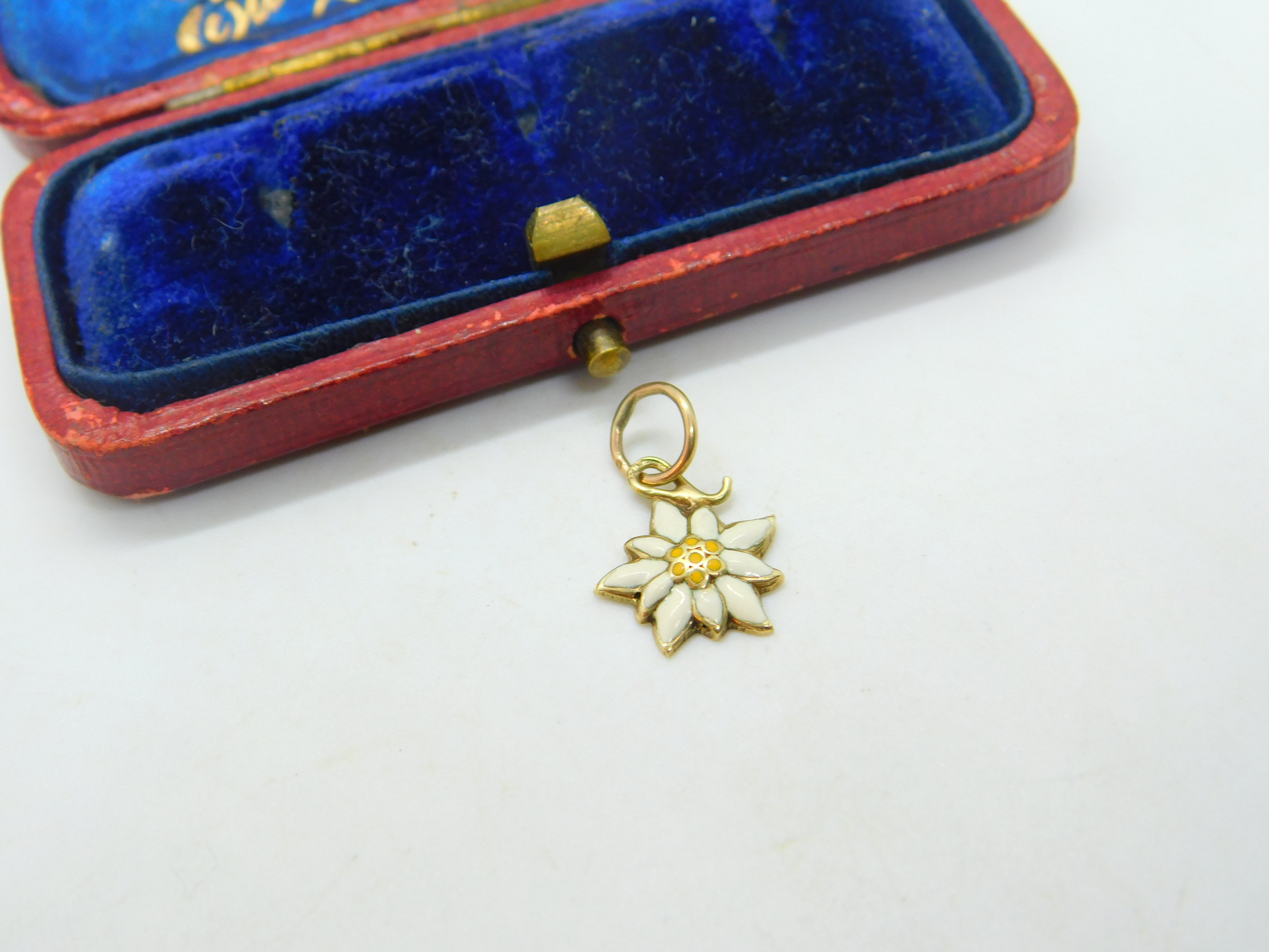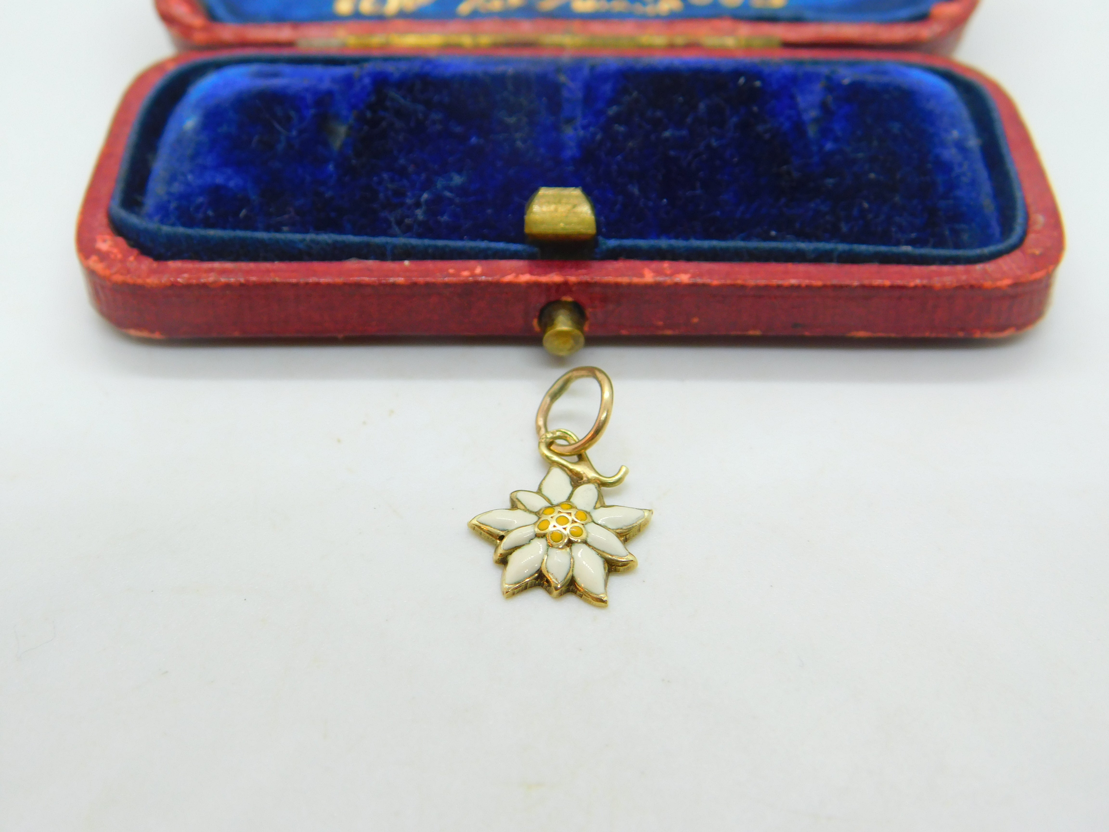 Details: A fantastic and wonderfully designed antique art deco 14ct yellow gold and white-yellow enamel edelweiss mountain flower charm pendant with lovely design marked 585 to the bale and tested c1940. This is a wonderful item that would make a perfect gift or addition to any collection. The BOX pictured is for PRESENTATION ONLY and is NOT included in the listings but used to frame the pictures unless specifically stated otherwise.