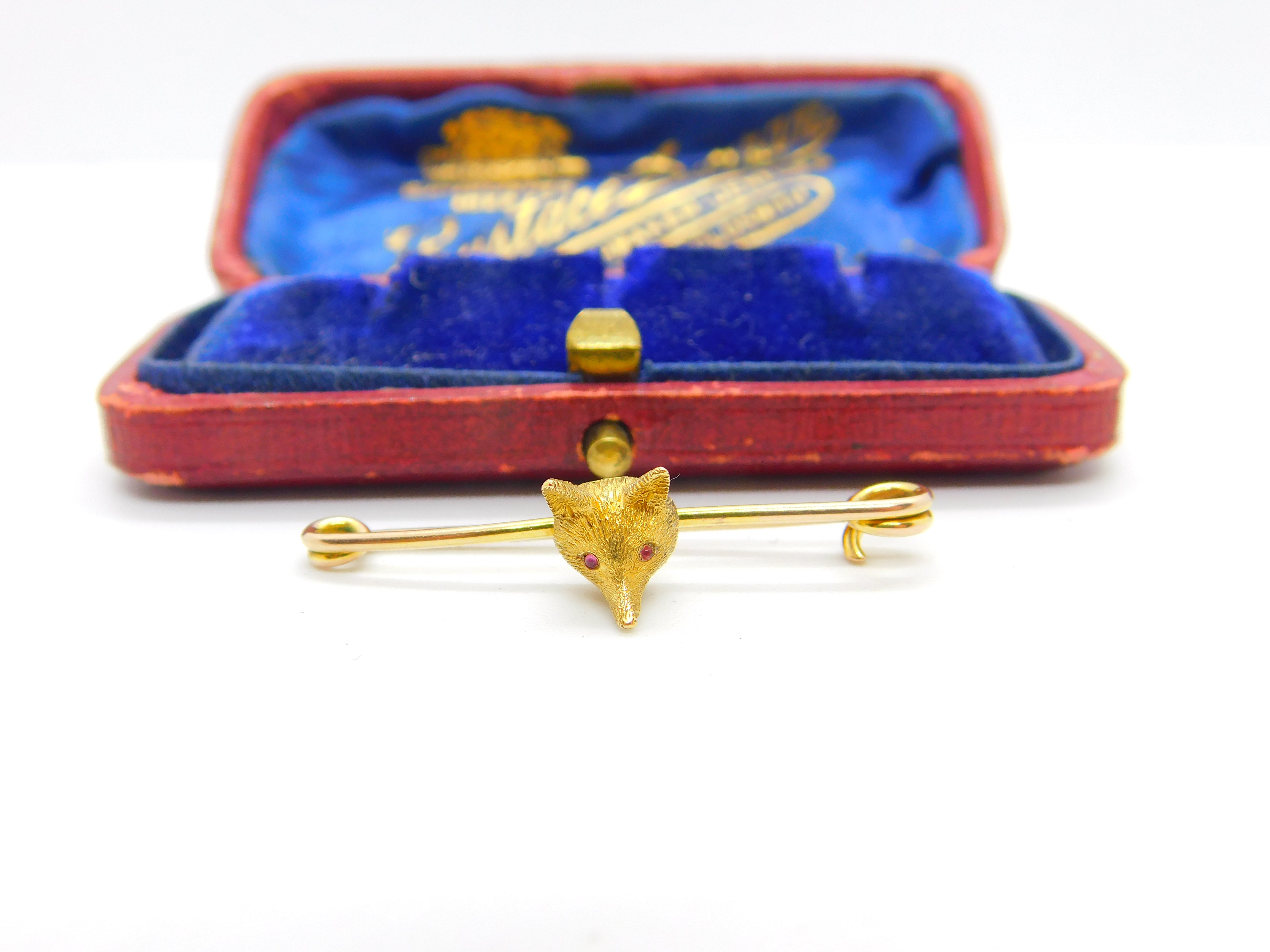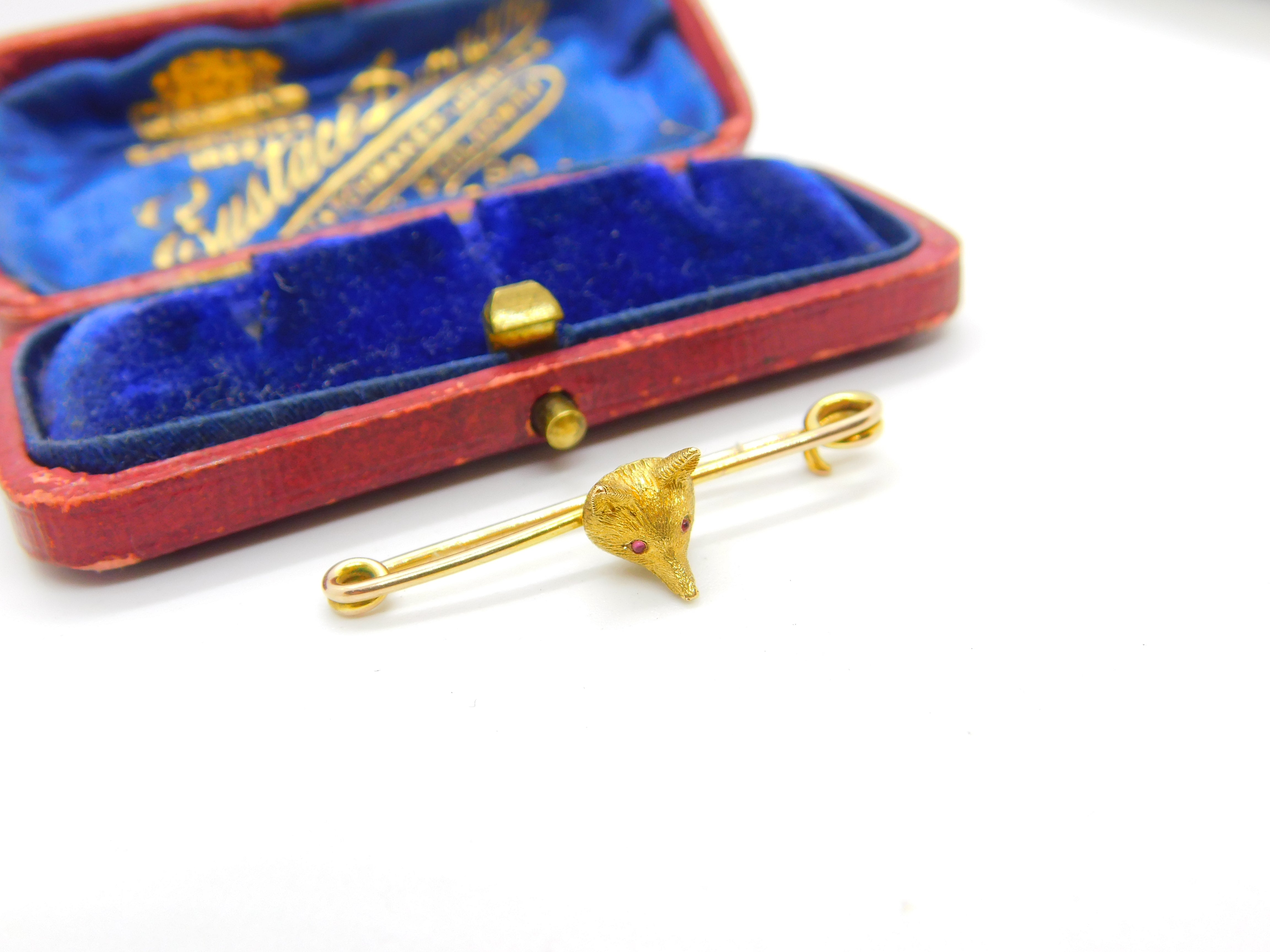 Details: A fantastic and wonderfully designed antique art deco 14ct yellow gold fox mask stock pin or bar brooch with lovely little ruby eyes to the fox c1930 - the gold has been XRF tested. This is a wonderful item that would make a perfect gift or addition to any collection. The BOX pictured is for PRESENTATION ONLY and is NOT included in the listings but used to frame the pictures unless specifically stated otherwise.