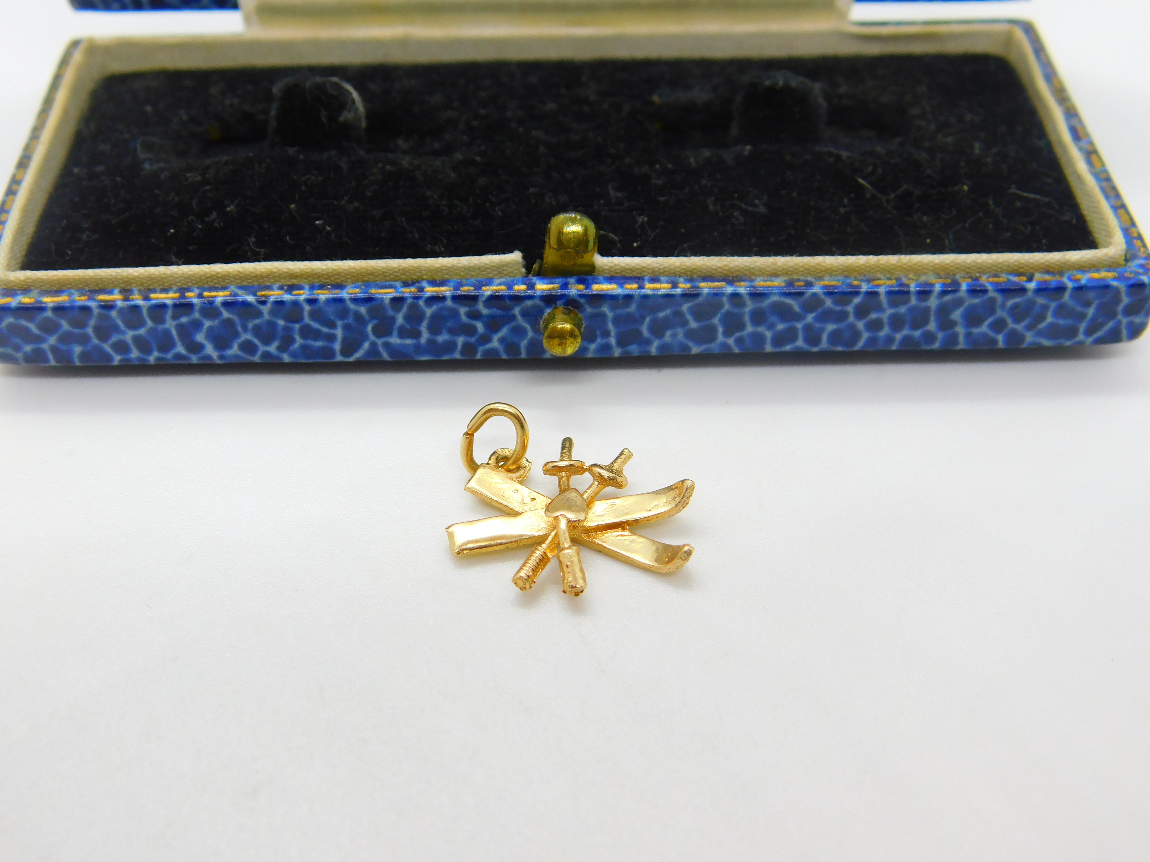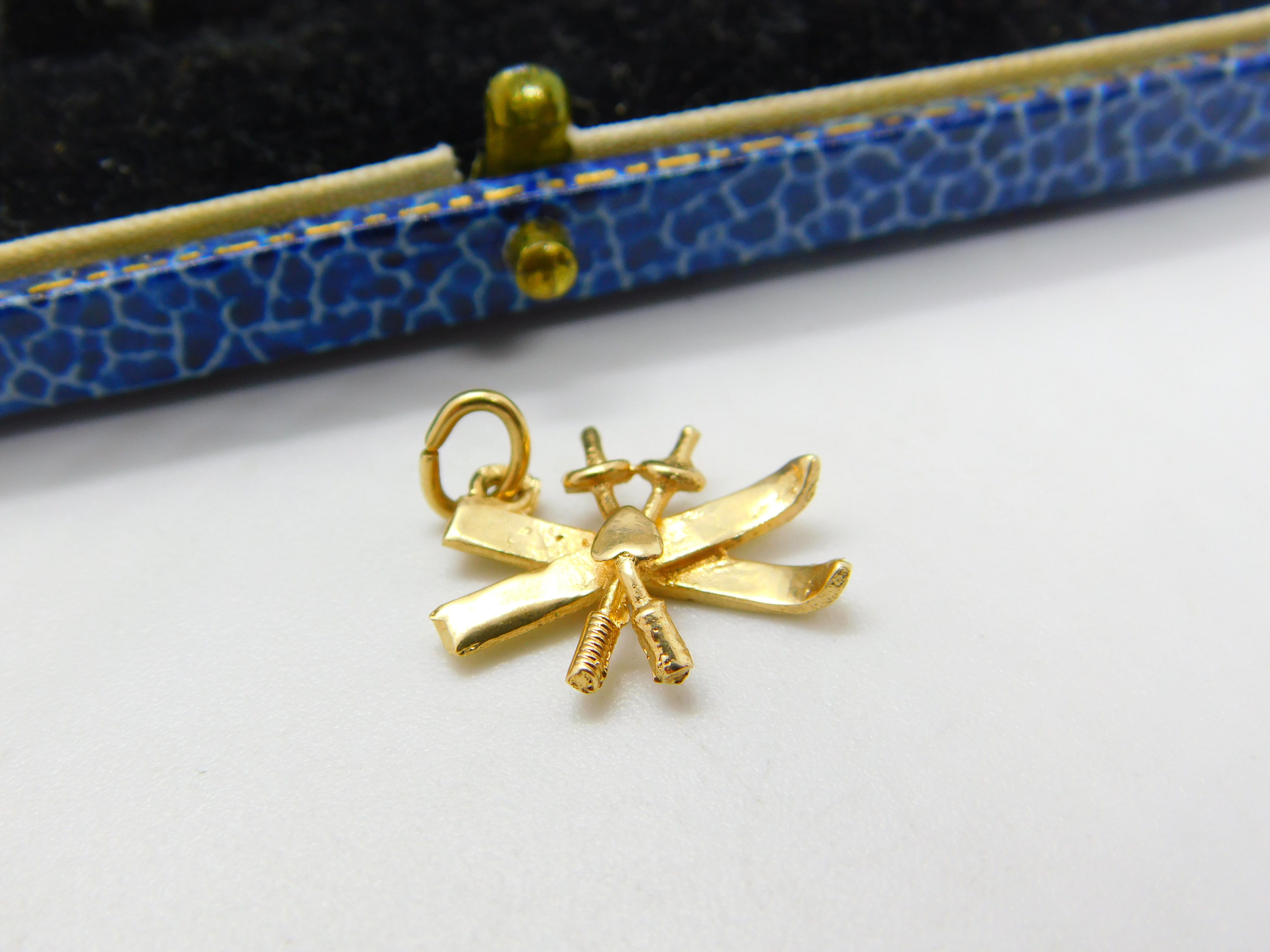 Details: A fantastic and wonderfully designed vintage 14ct yellow gold skiing interest skis and poles charm pendant hallmarked to the bale 585 c1970. This is a wonderful item that would make a perfect gift or addition to any collection. The BOX pictured is for PRESENTATION ONLY and is NOT included in the listings but used to frame the pictures unless specifically stated otherwise.