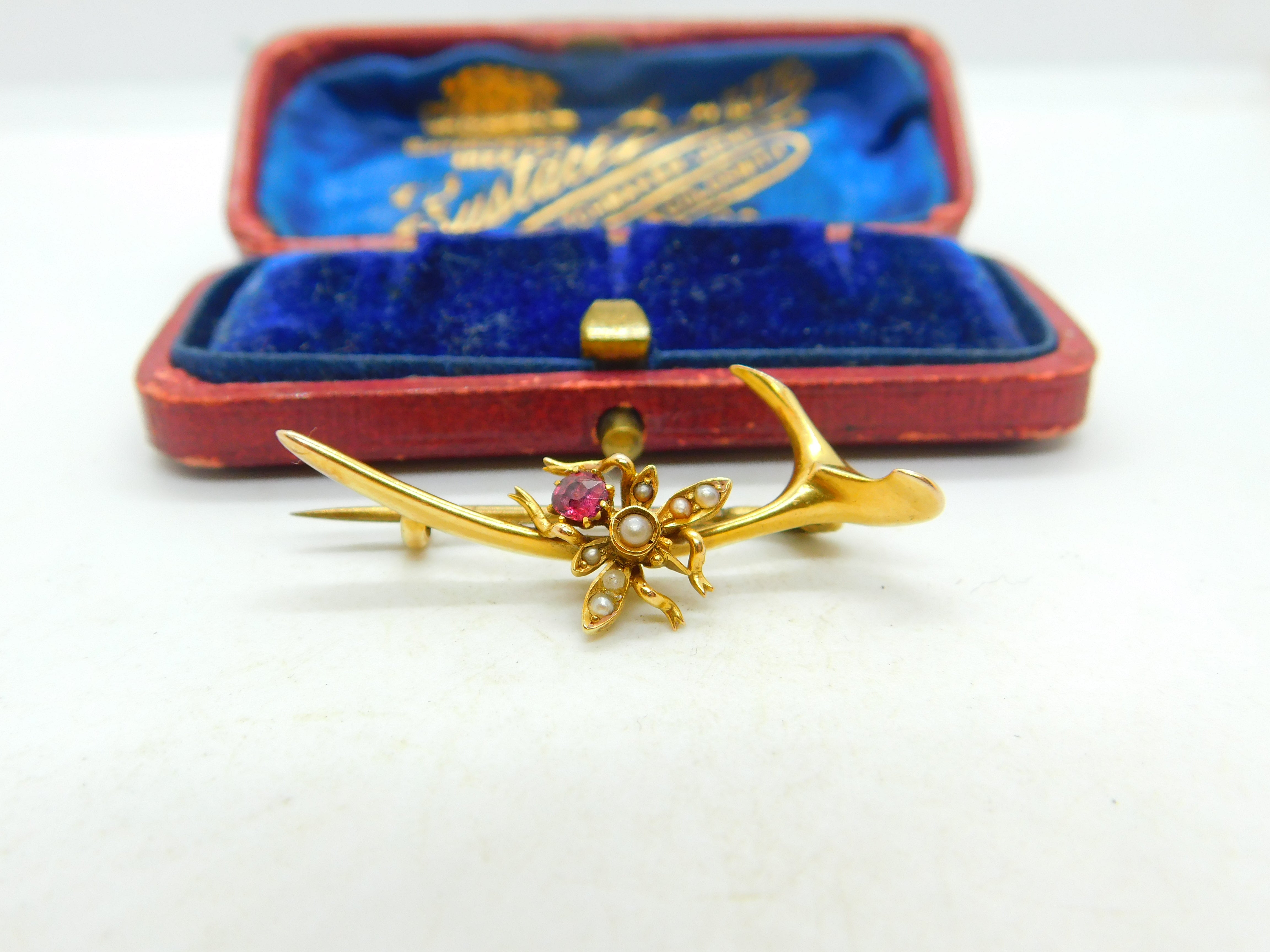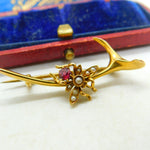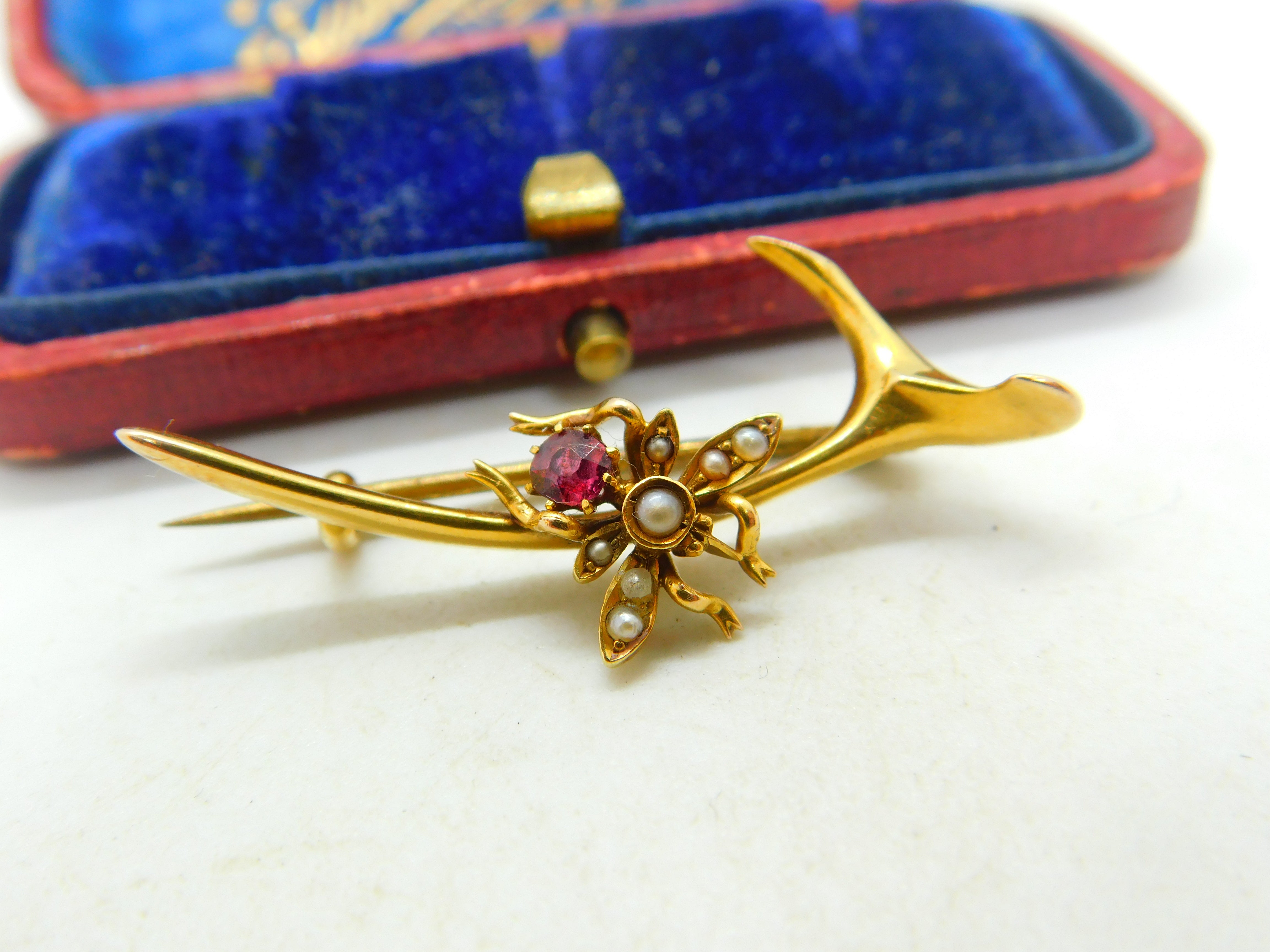 15ct Yellow Gold Wishbone Form Insect Bug Brooch With Pearl & Garnet Edwardian