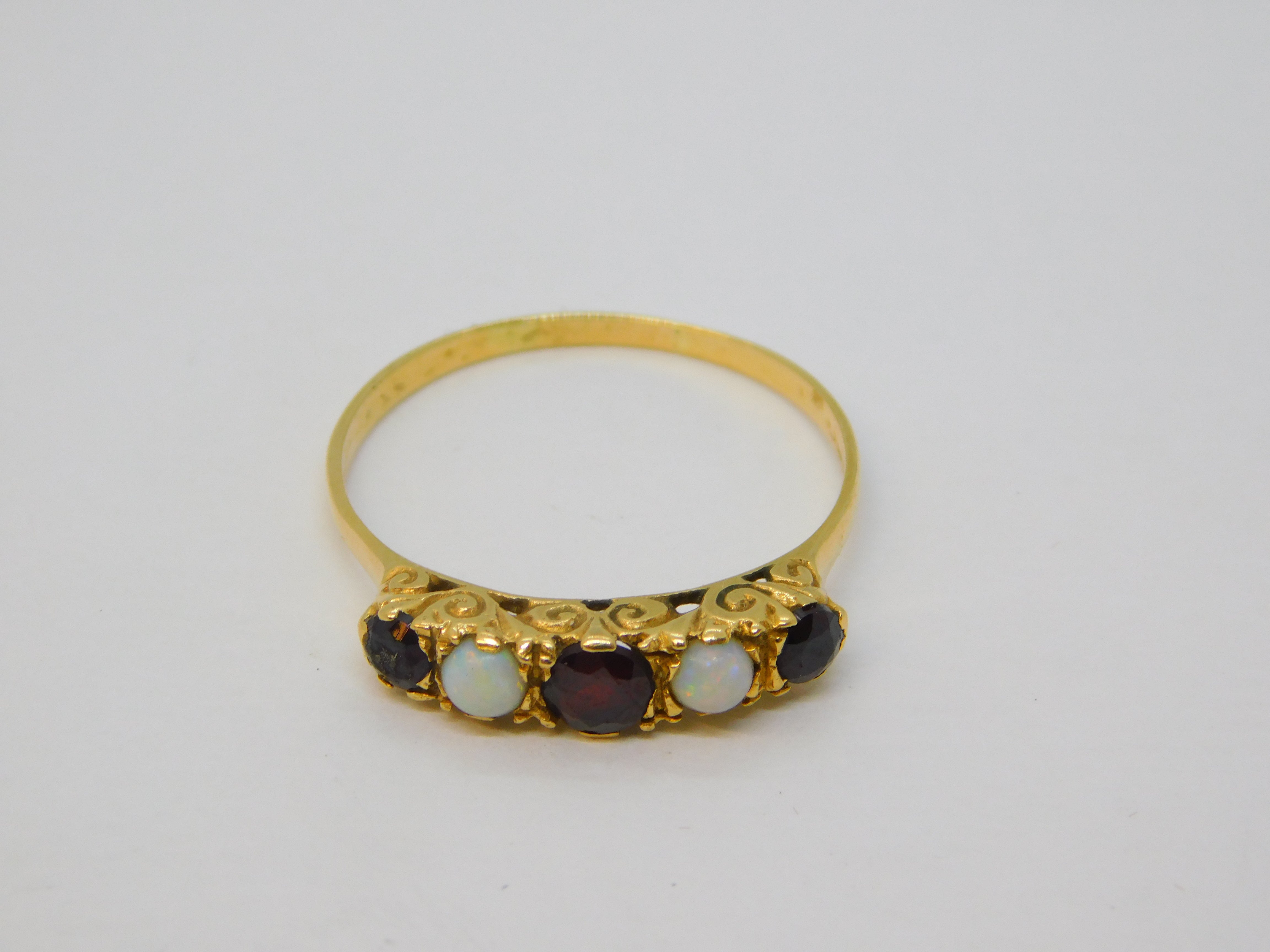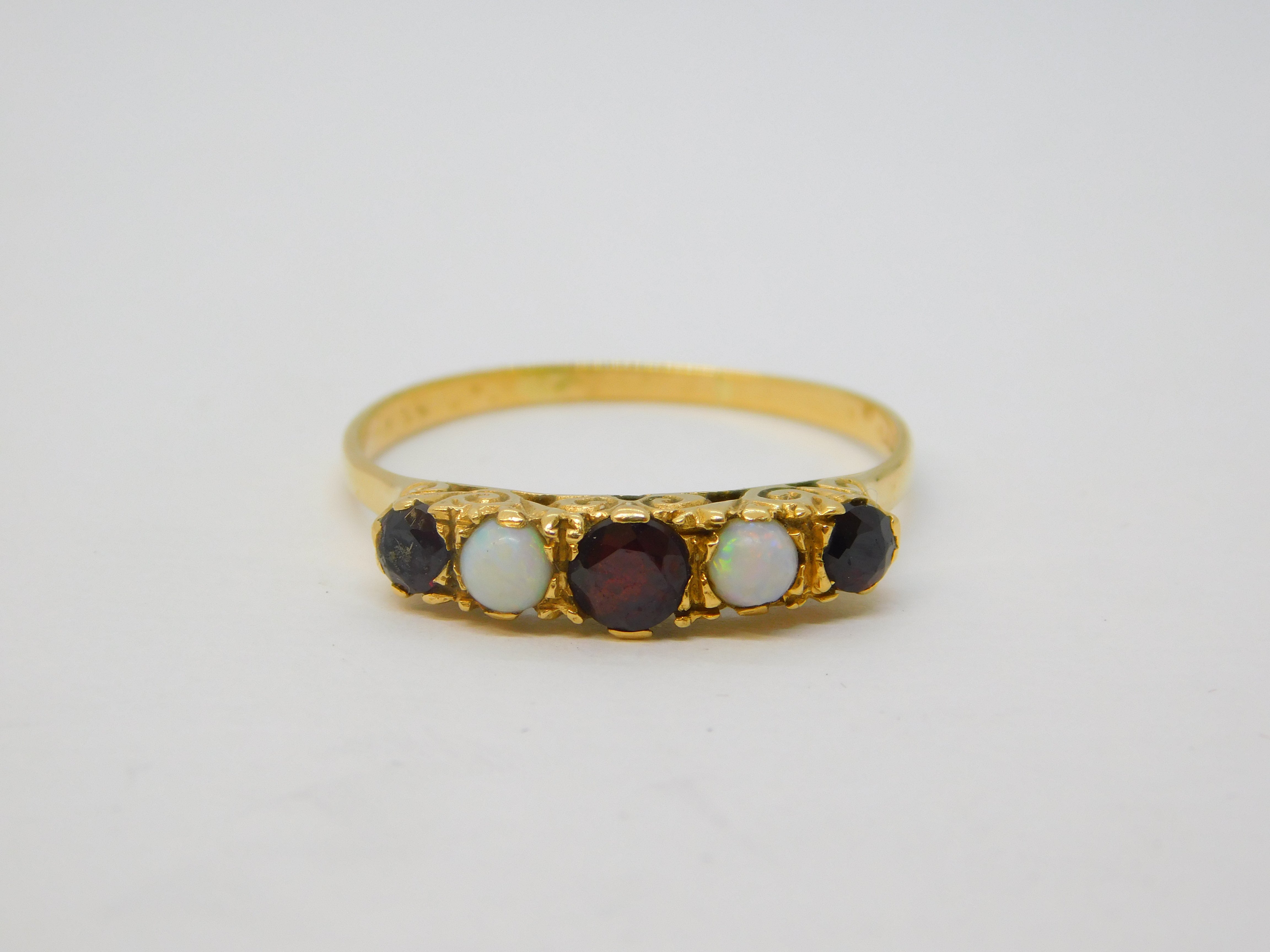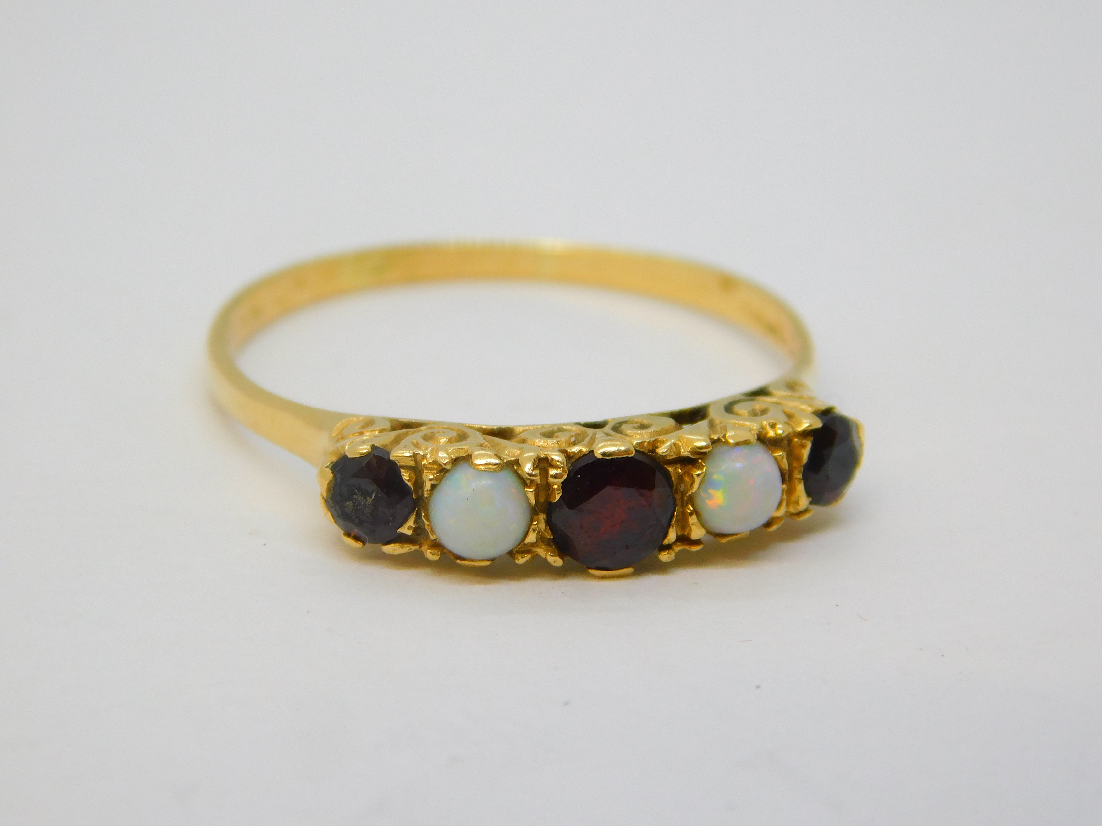 18ct Yellow Gold, Bohemian Garnet & Opal Five-Stone Ring Vintage c1970