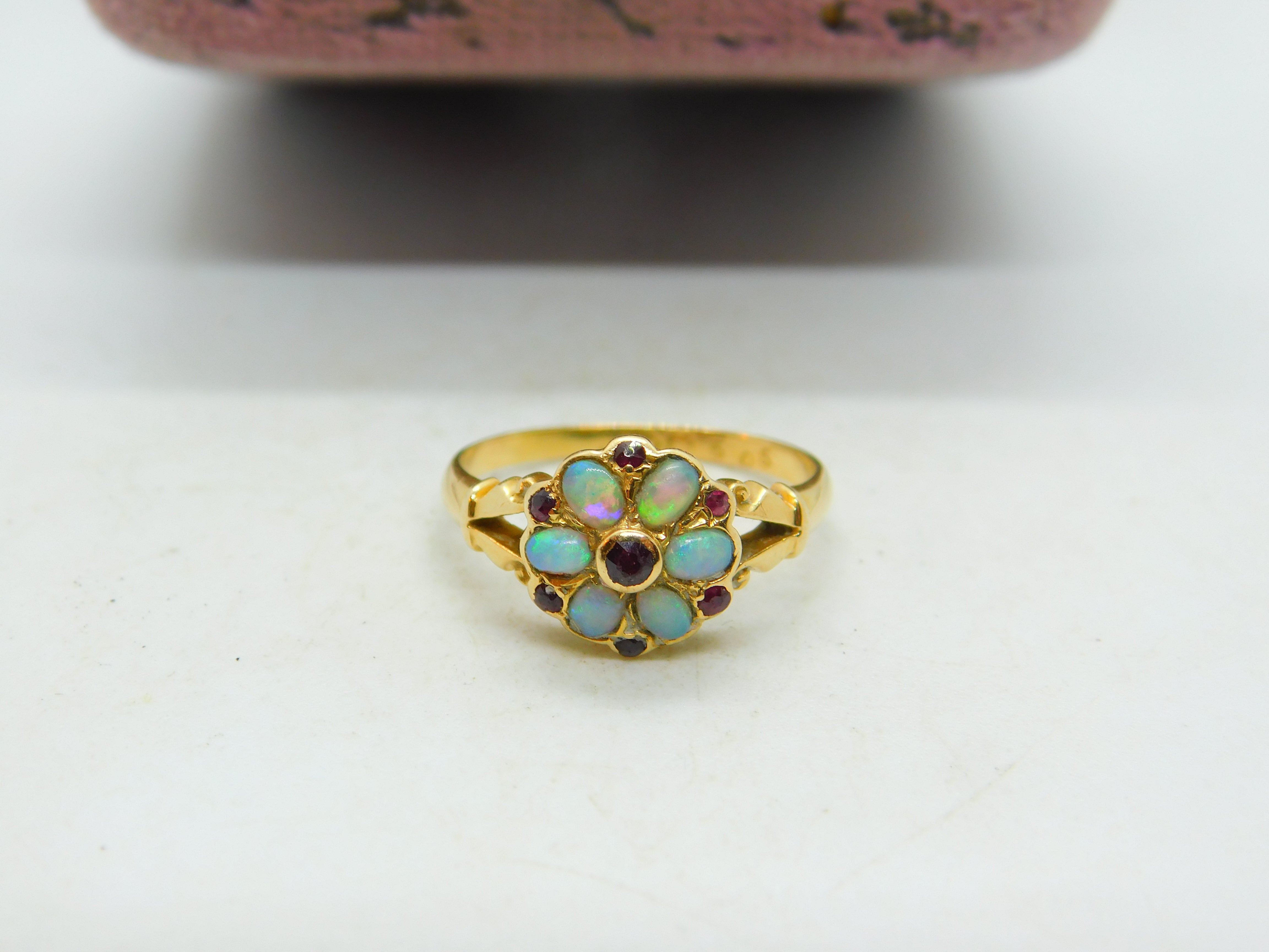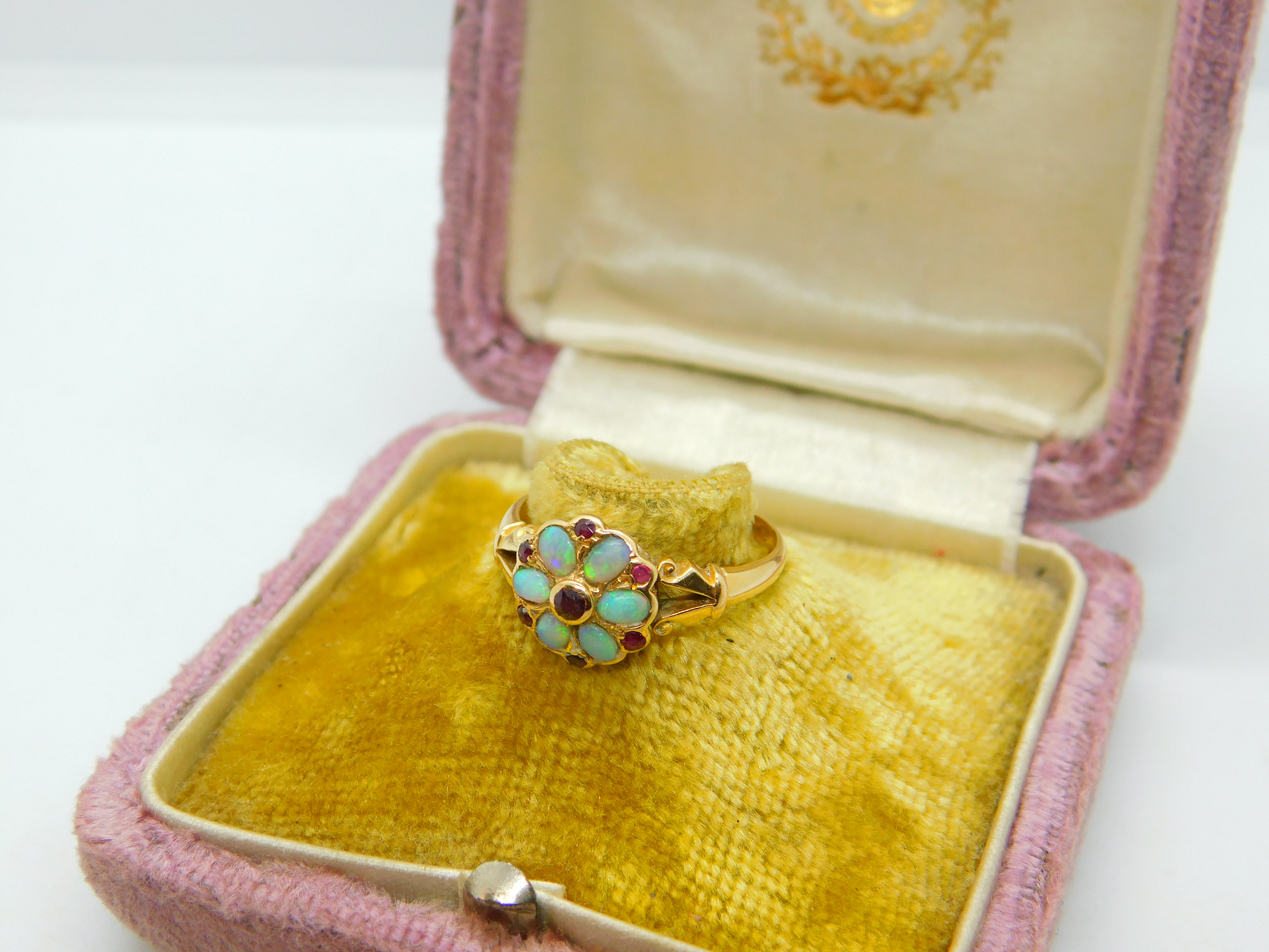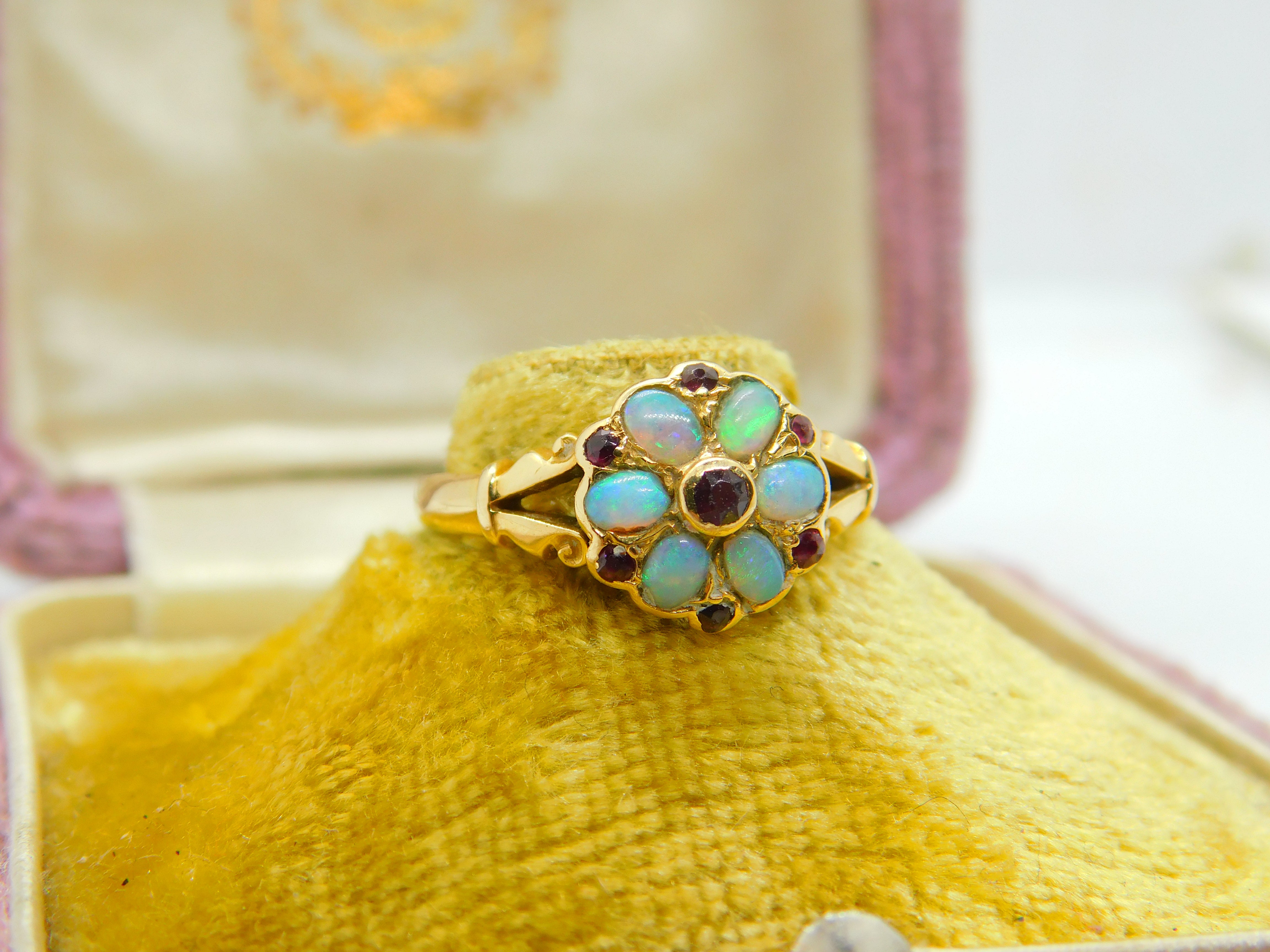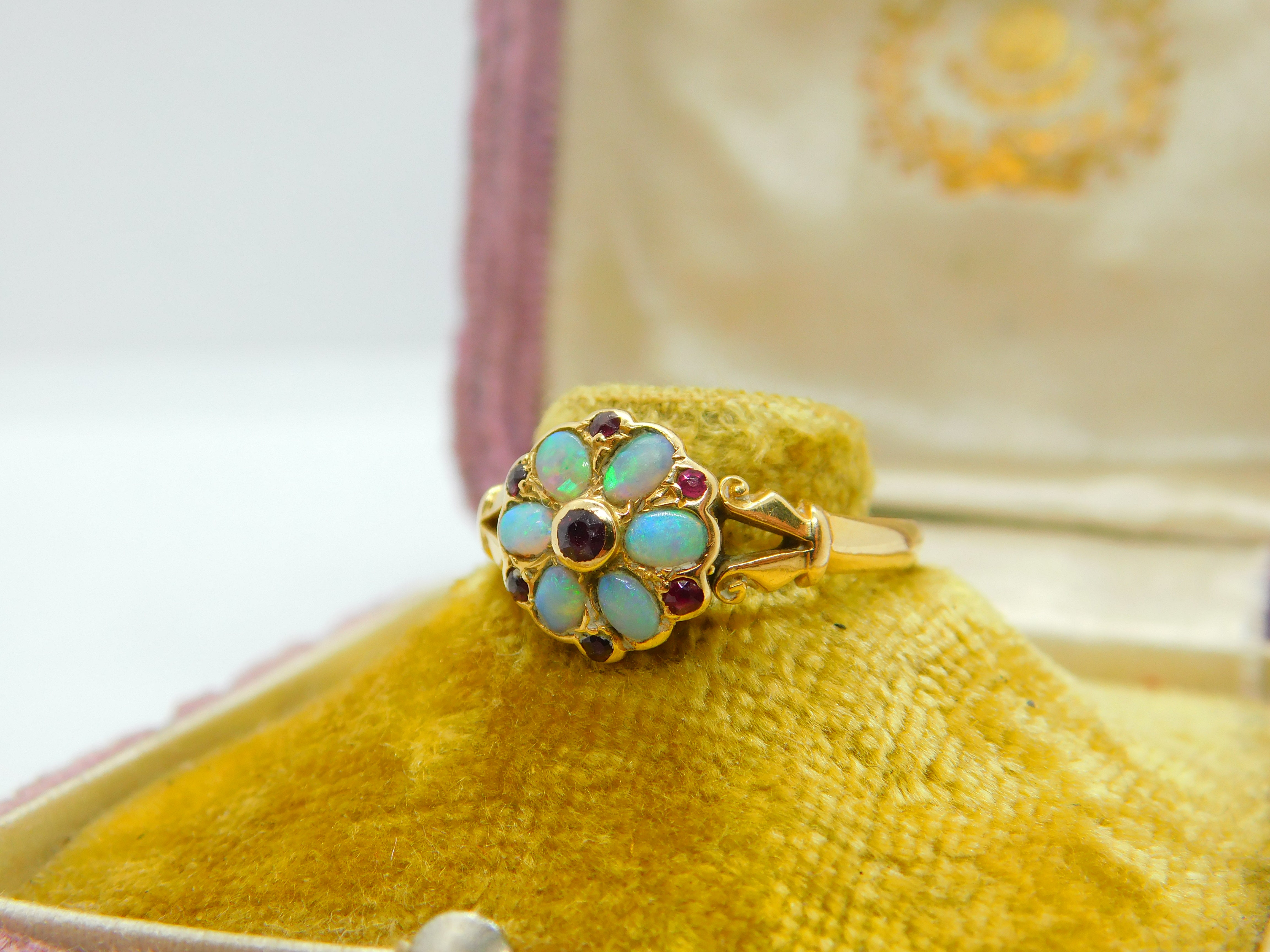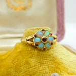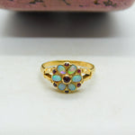 18ct Yellow Gold, Fire Opal & Ruby Floral Band Ring Antique 1912 Chester Deco