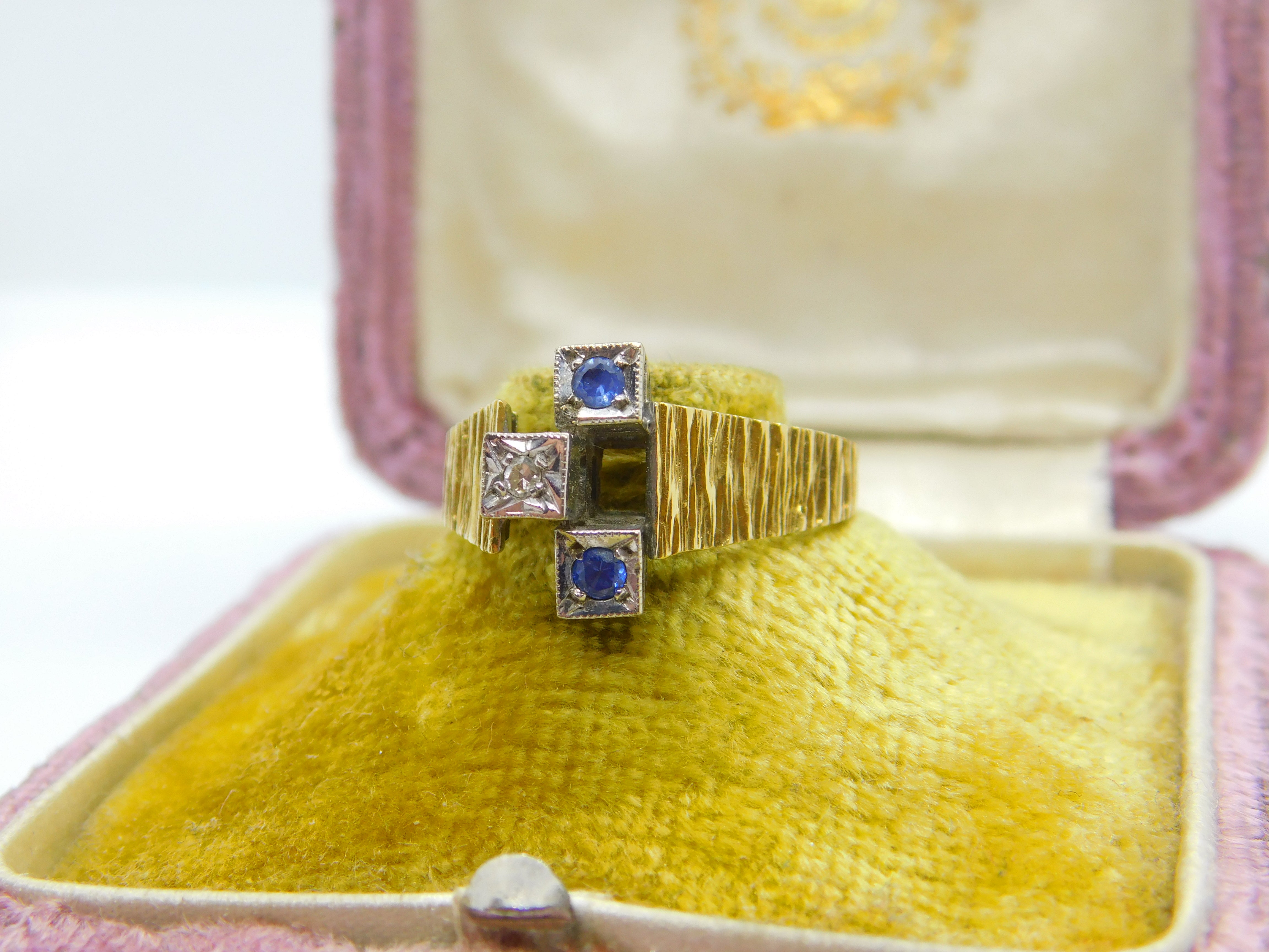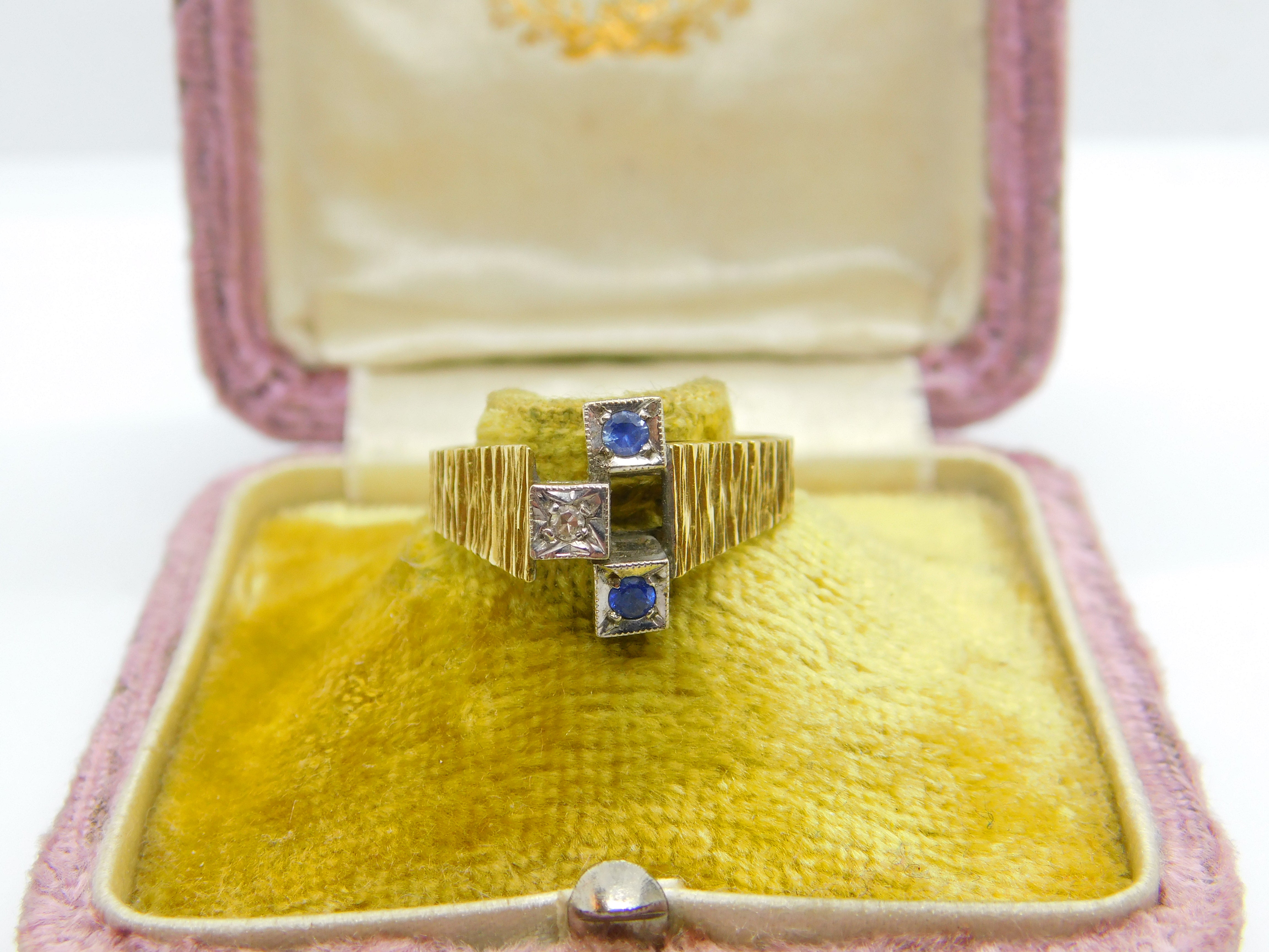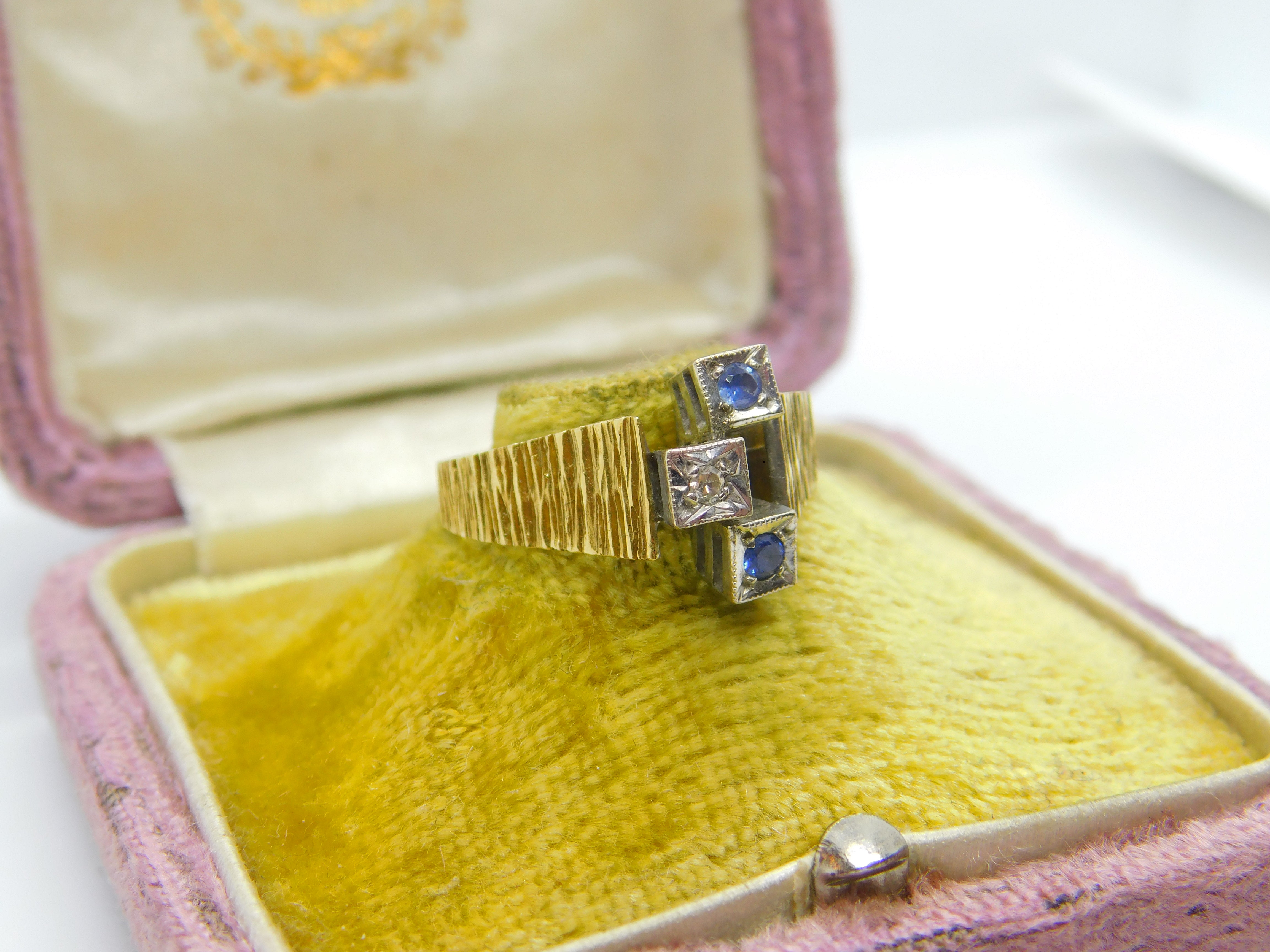 Details: A fantastic and wonderfully designed vintage 18ct yellow gold abstract modernist band ring set with sapphires and diamonds hallmarked London 1971 to the interior band - the stones have been tested. This is a wonderful item that would make a perfect gift or addition to any collection. The BOX pictured is for PRESENTATION ONLY and is NOT included in the listings but used to frame the pictures unless specifically stated otherwise.
