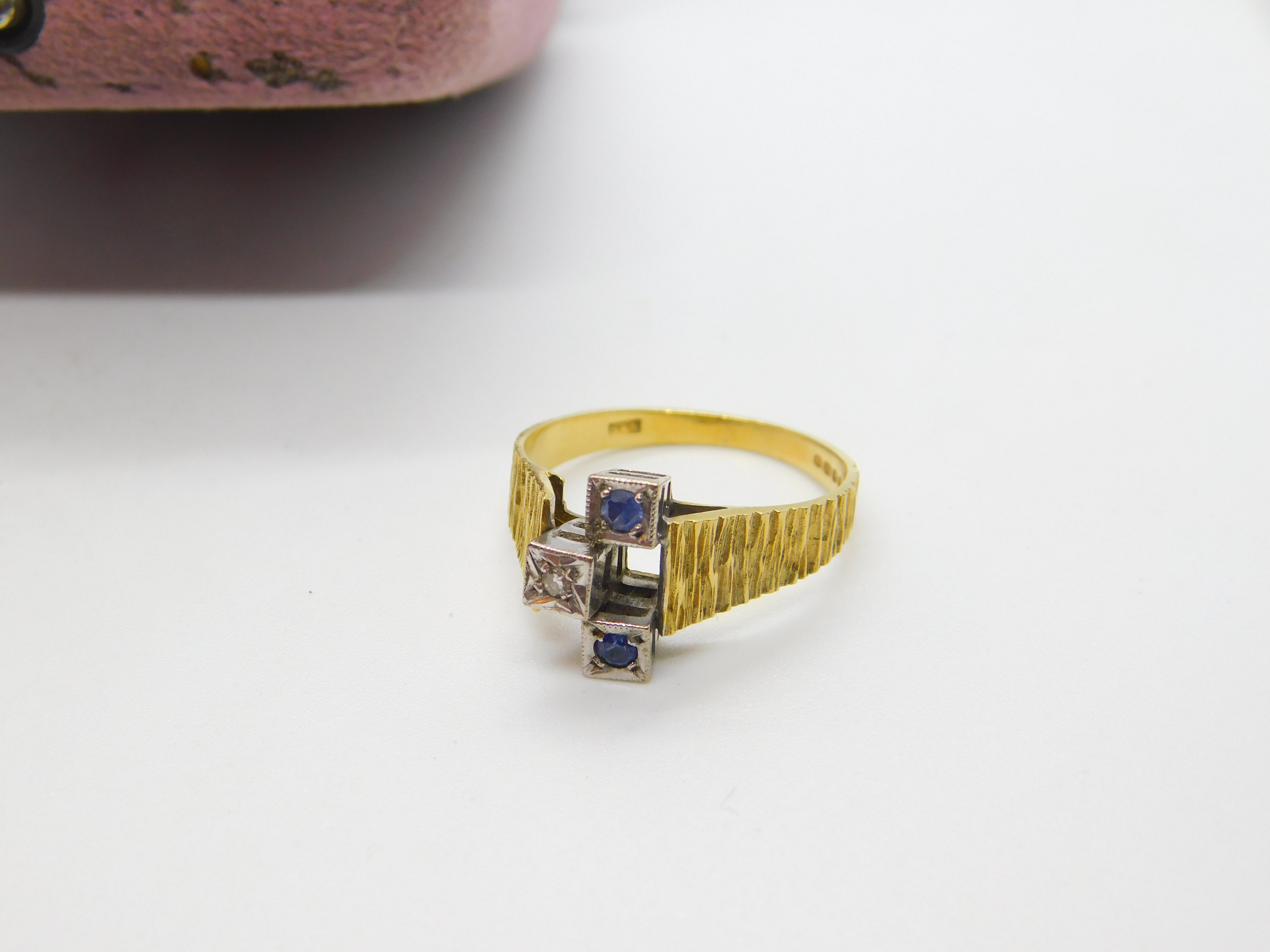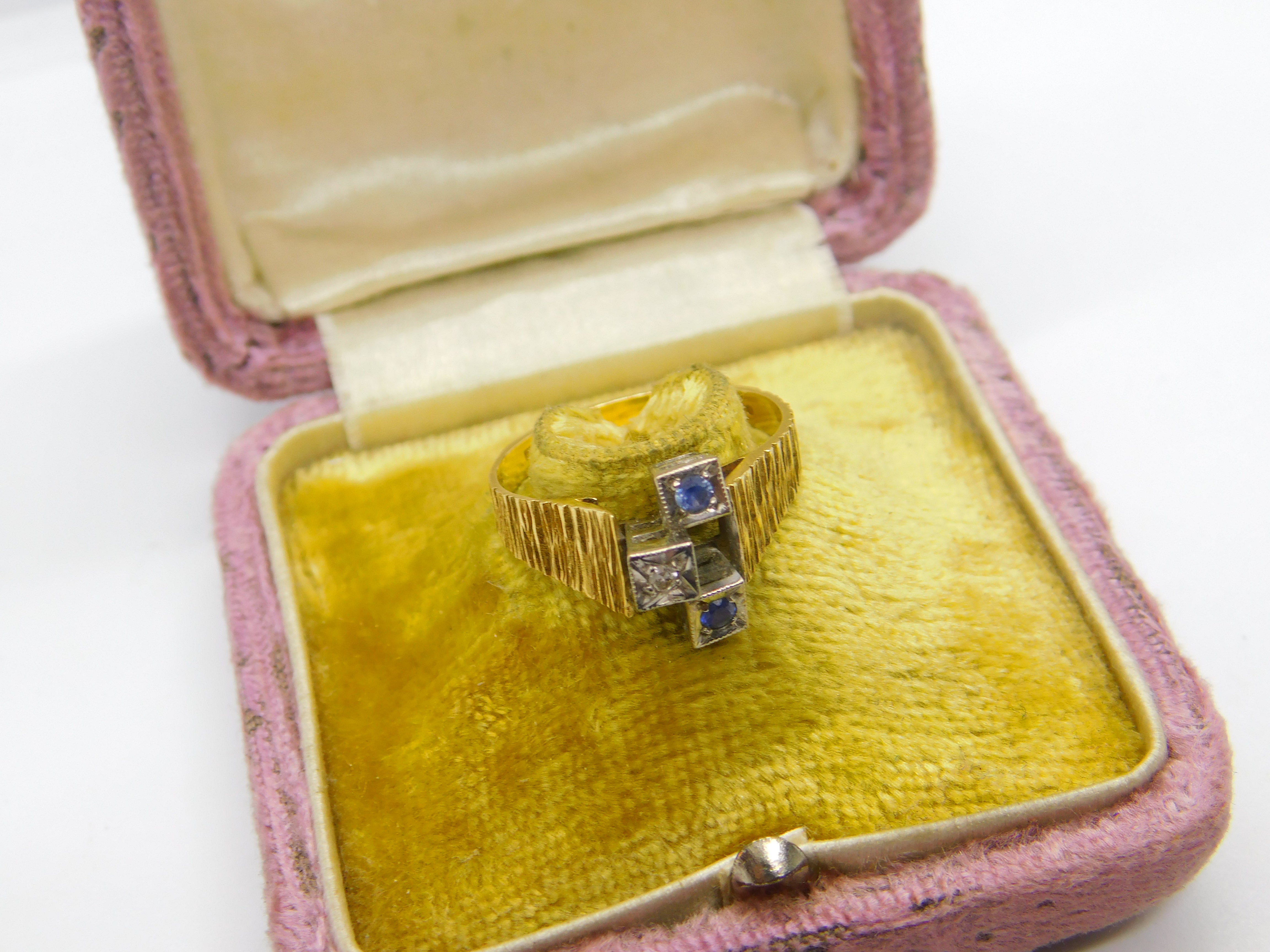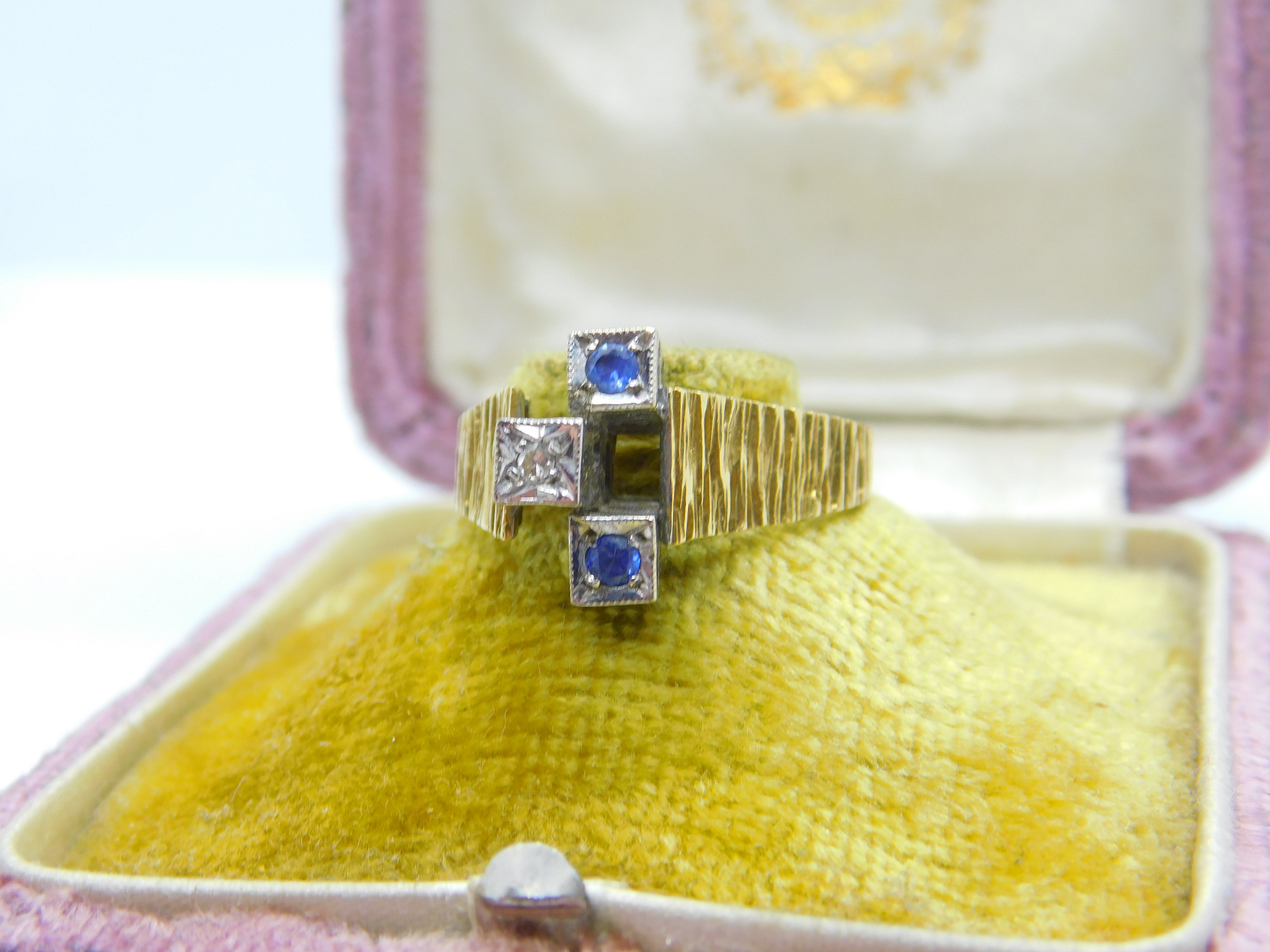 Details: A fantastic and wonderfully designed vintage 18ct yellow gold abstract modernist band ring set with sapphires and diamonds hallmarked London 1971 to the interior band - the stones have been tested. This is a wonderful item that would make a perfect gift or addition to any collection. The BOX pictured is for PRESENTATION ONLY and is NOT included in the listings but used to frame the pictures unless specifically stated otherwise.