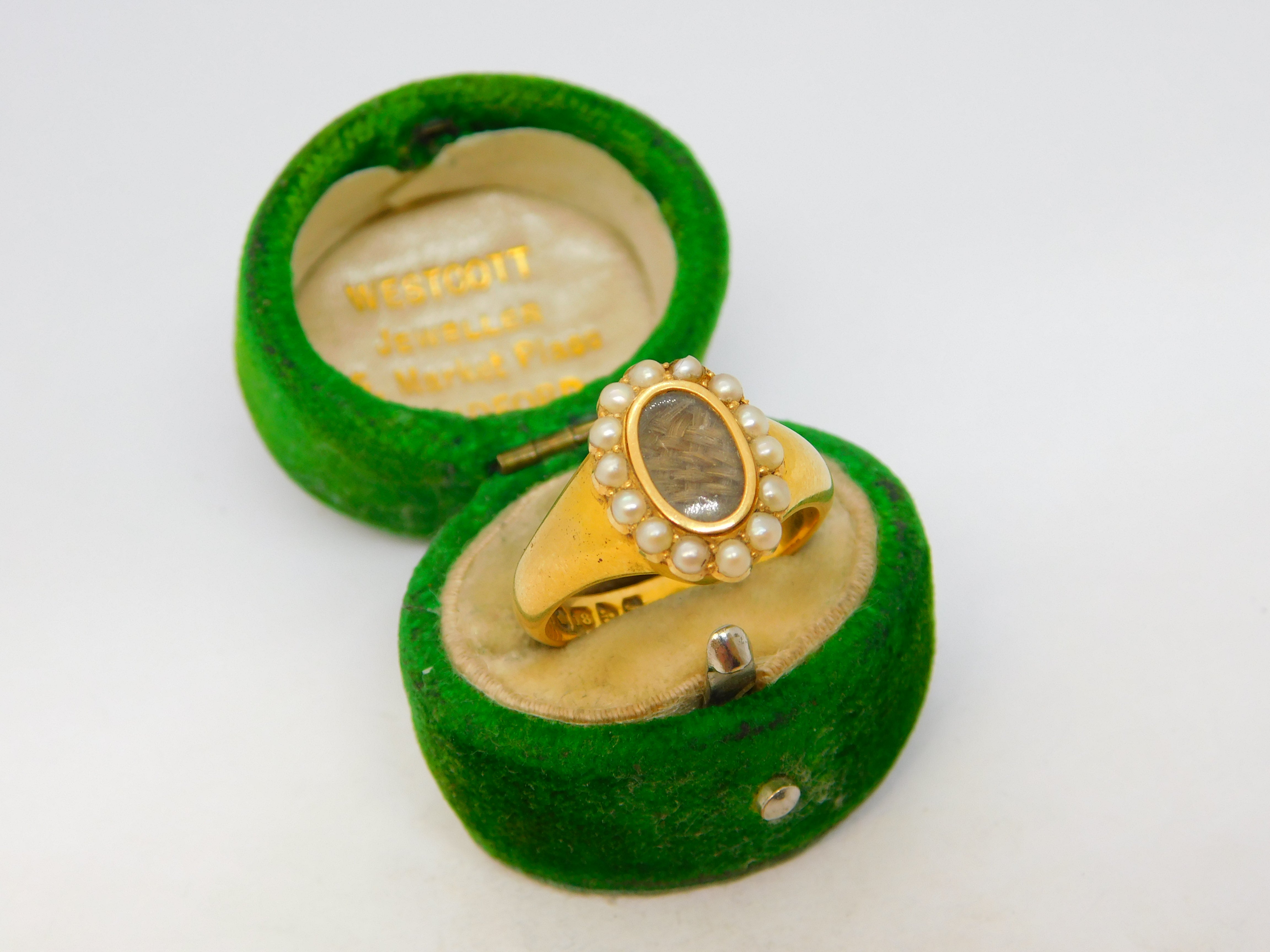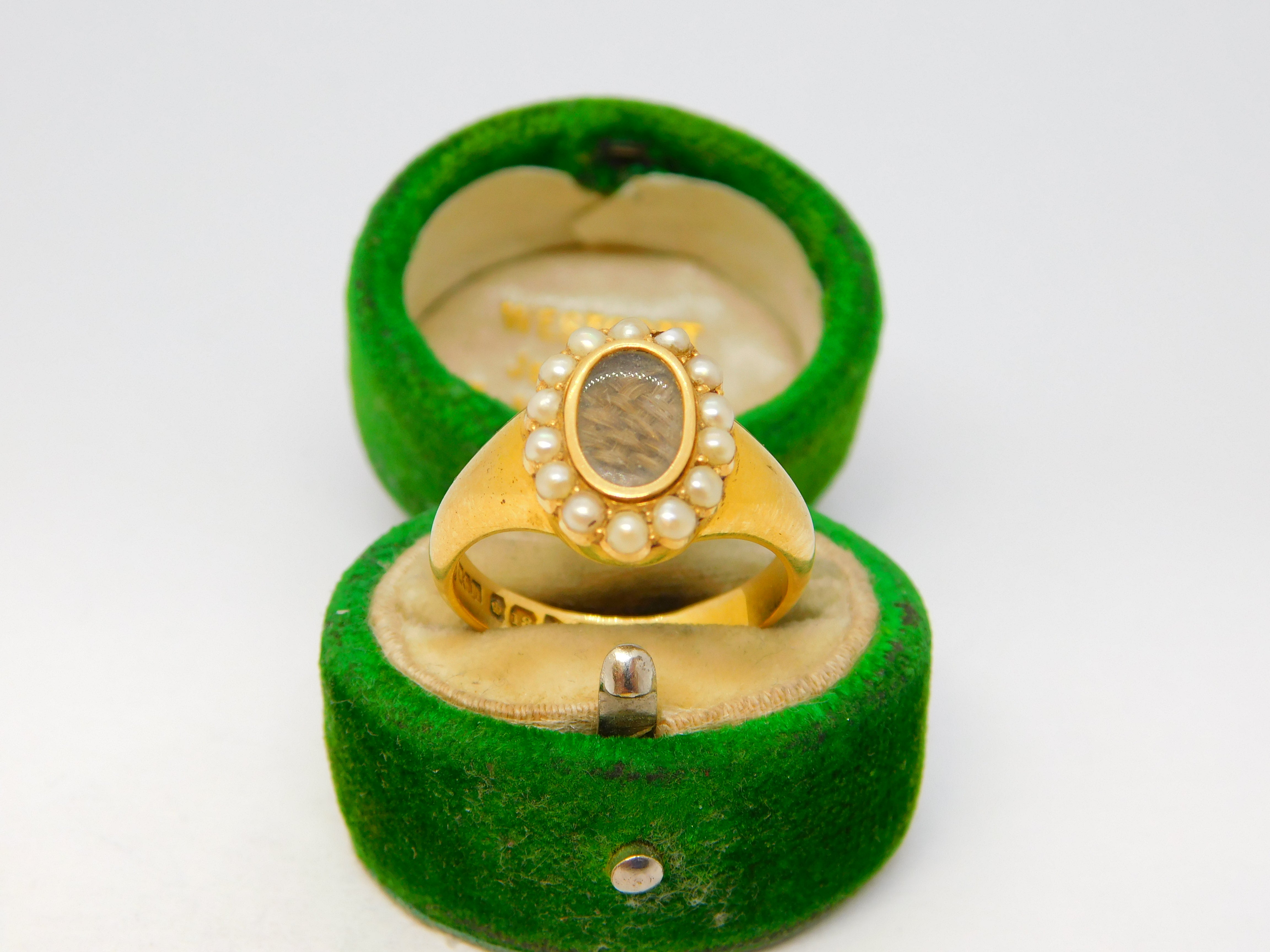 Details: A fantastic and wonderfully designed antique art deco 18ct yellow gold mourning ring set with central woven hair flanked by seed pearls hallmarked Chester 1913 Walter George Matthews. This is a wonderful item that would make a perfect gift or addition to any collection. The BOX pictured is for PRESENTATION ONLY and is NOT included in the listings but used to frame the pictures unless specifically stated otherwise.