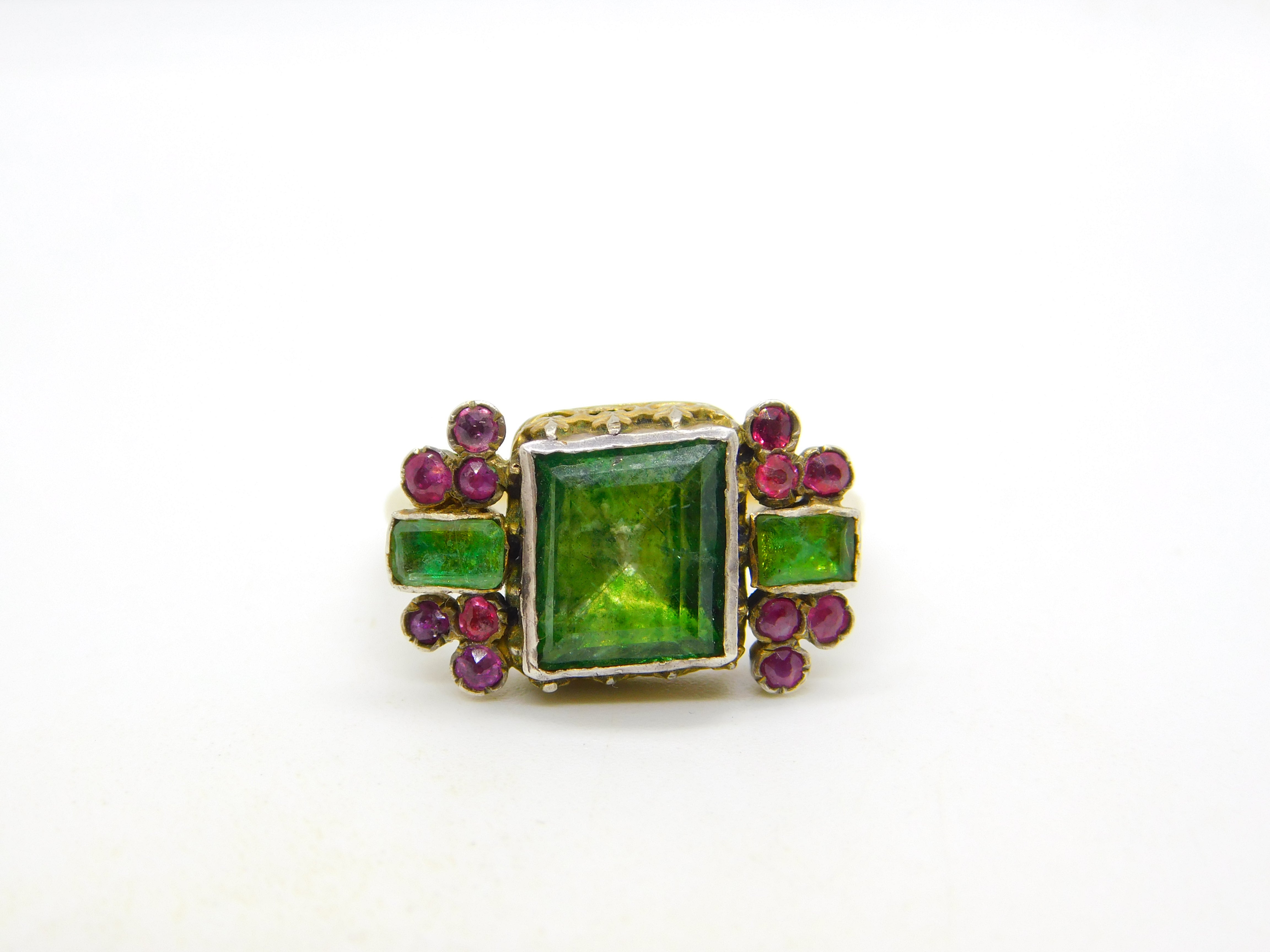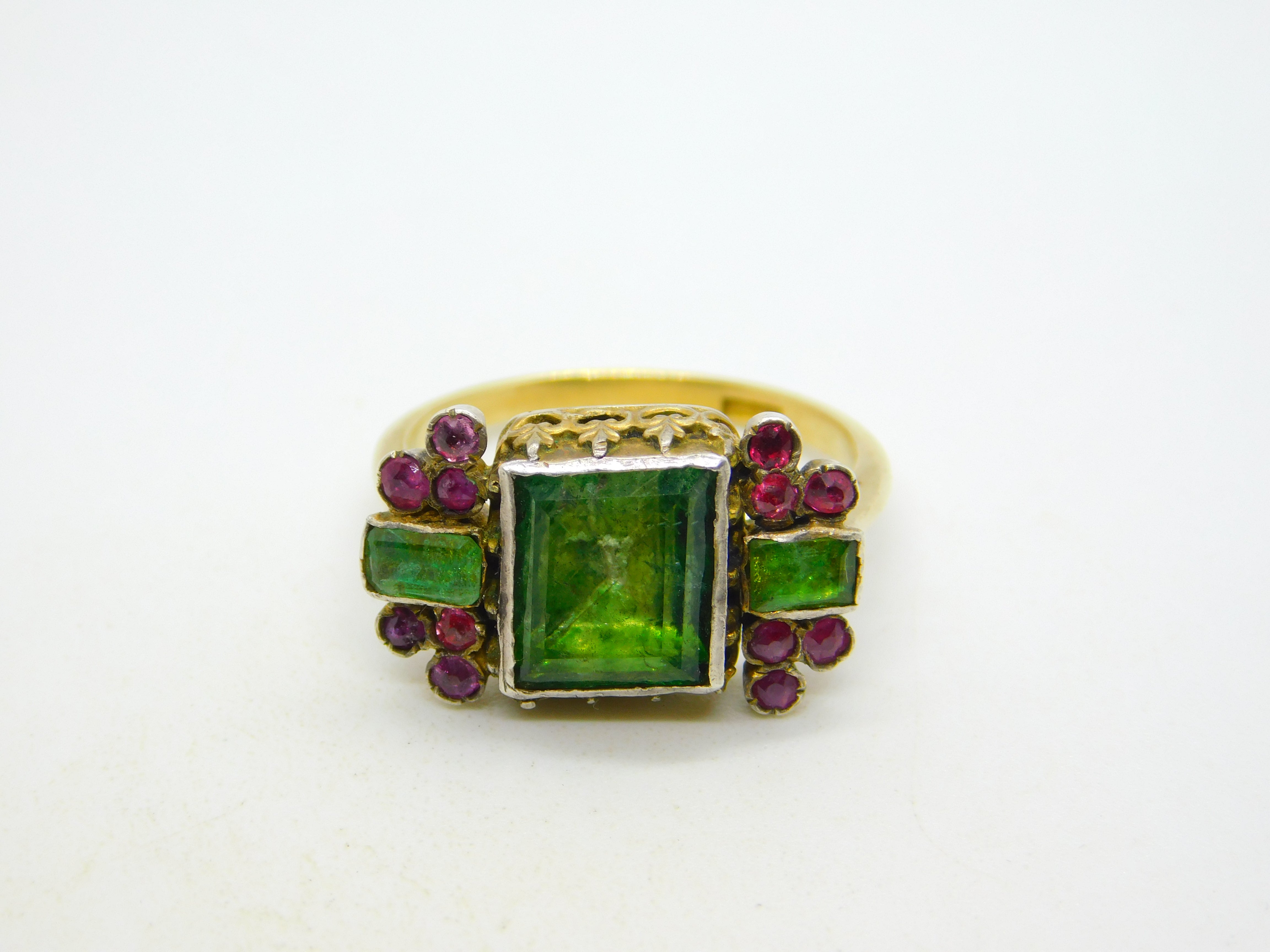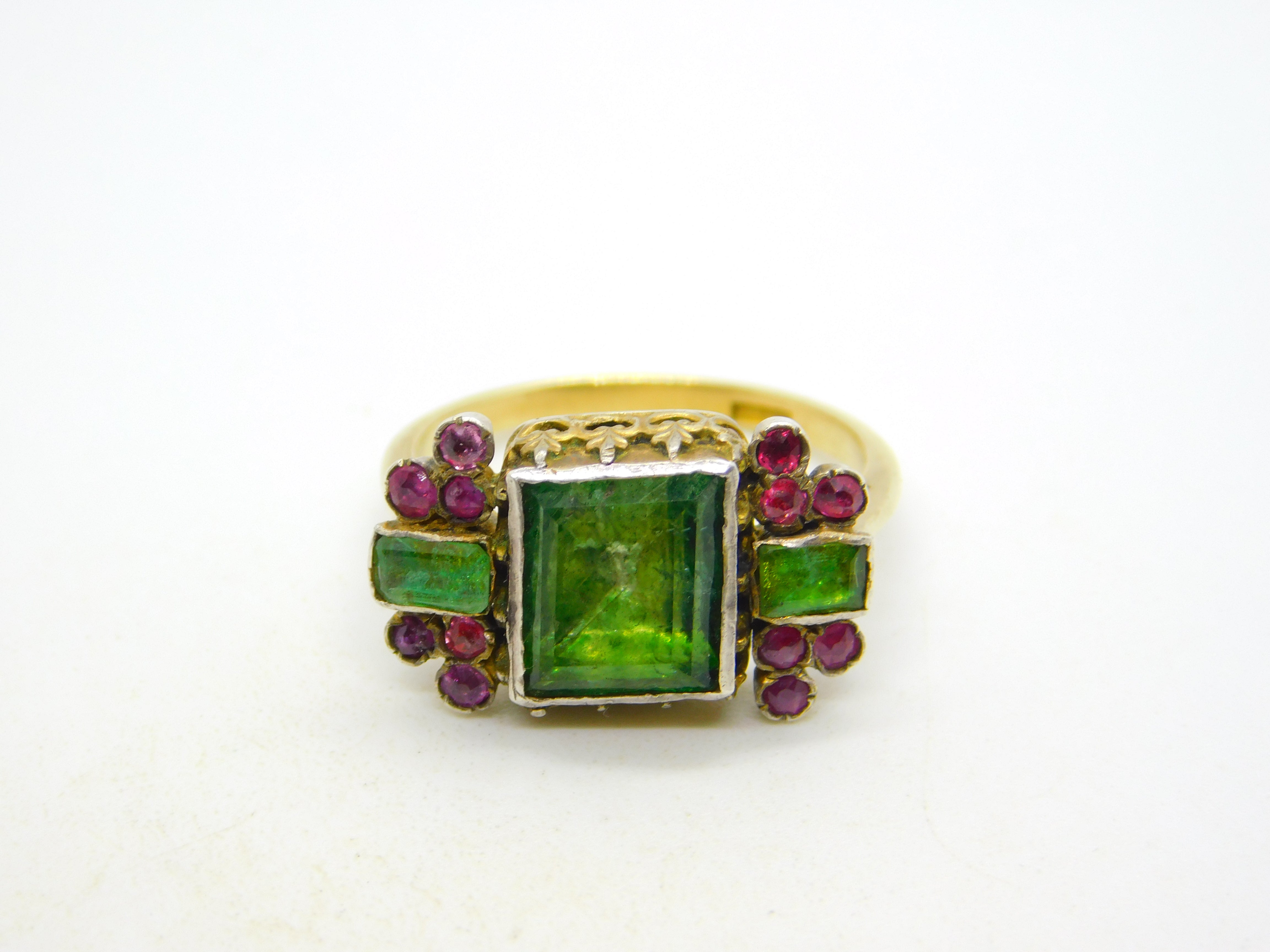 Details: A fantastic and wonderfully designed antique georgian 18th century 18ct yellow gold mourning ring set with stunning green foil-back paste stones flanked by old-cut rubies, hallmarked 18ct to the band which has been later added, the central brooch is significantly older and is adorned with charming shoulders. A superb ring with unique style and quality. This is a wonderful item that would make a perfect gift or addition to any collection.
