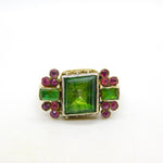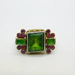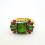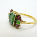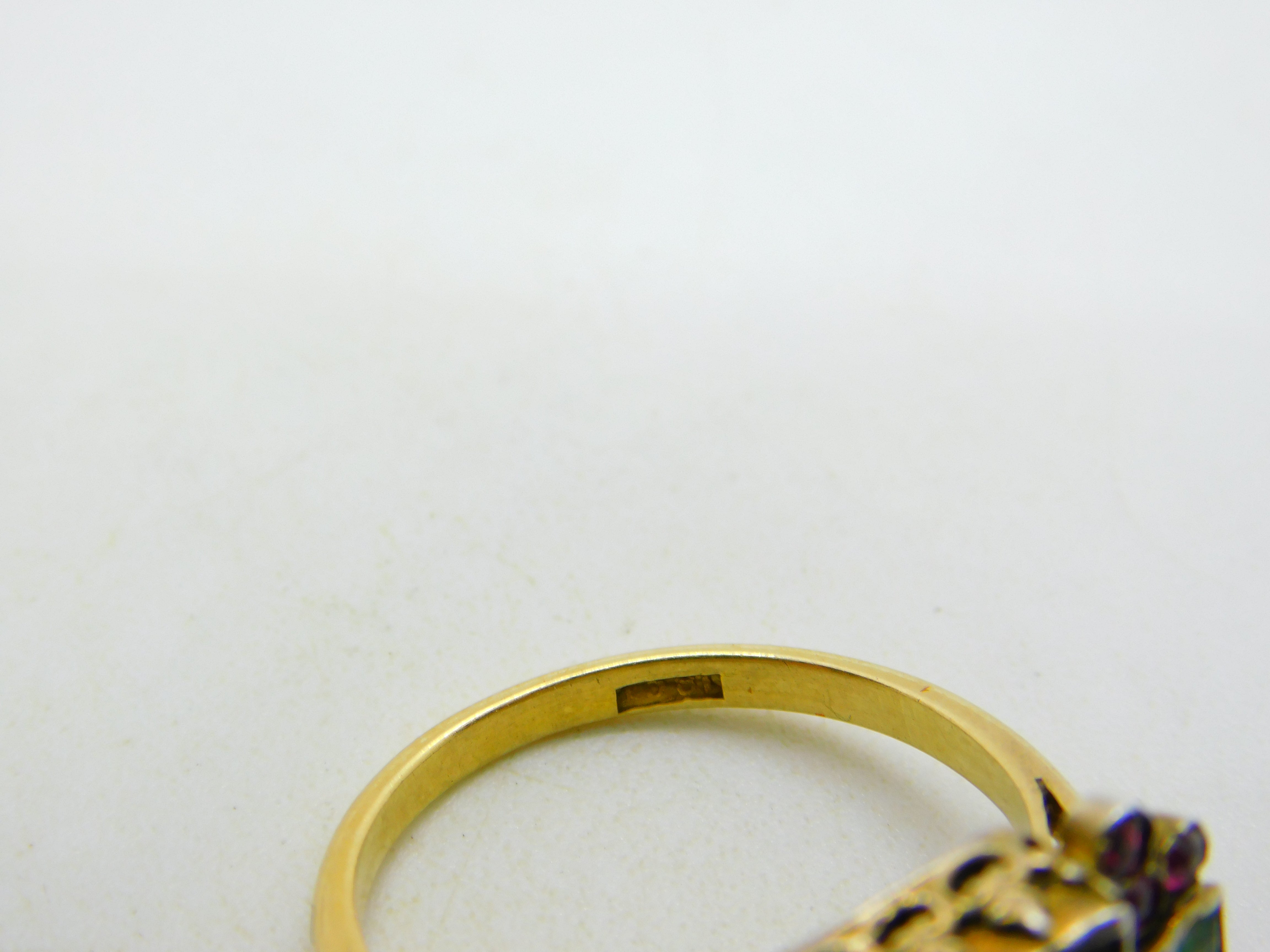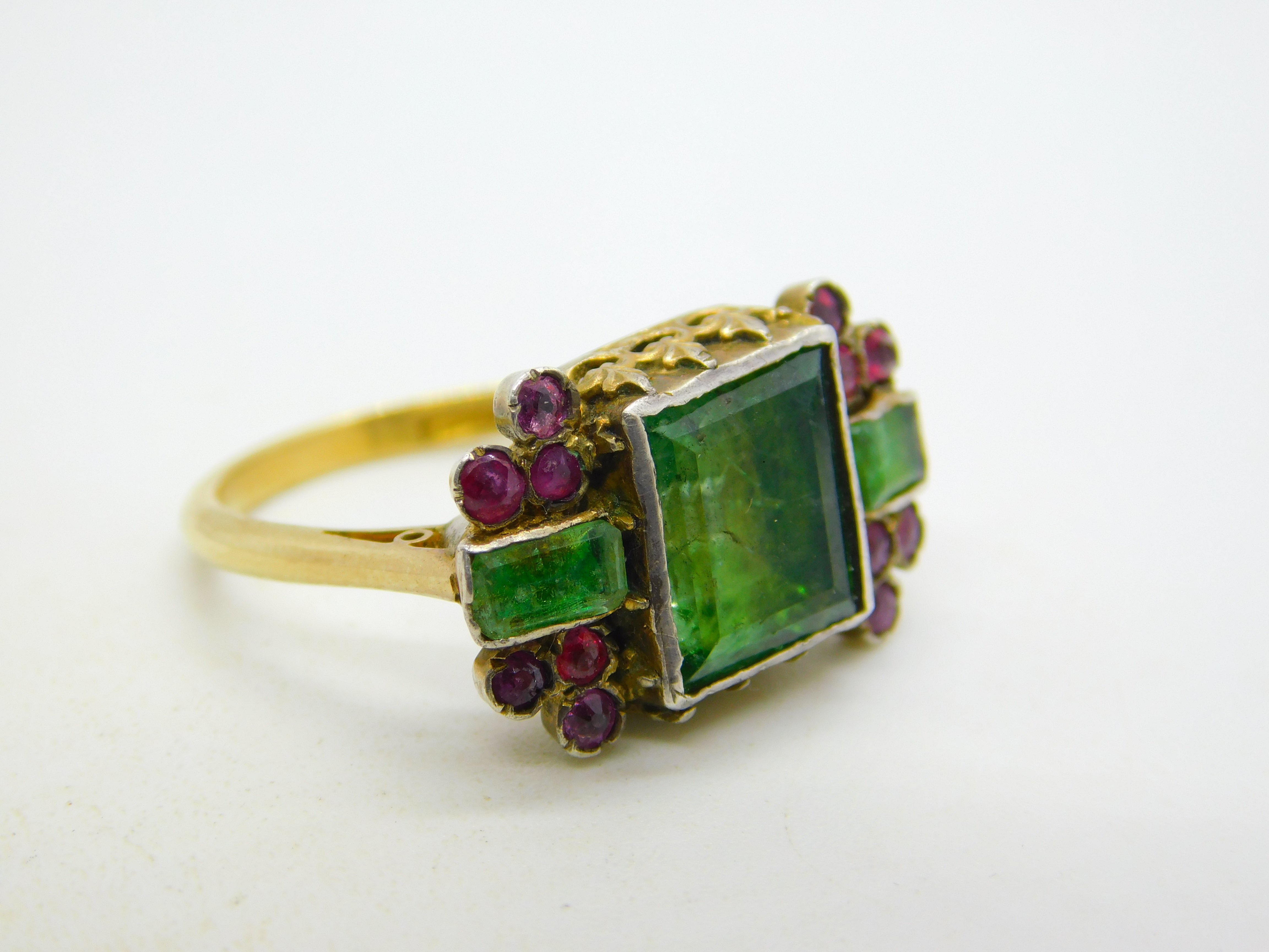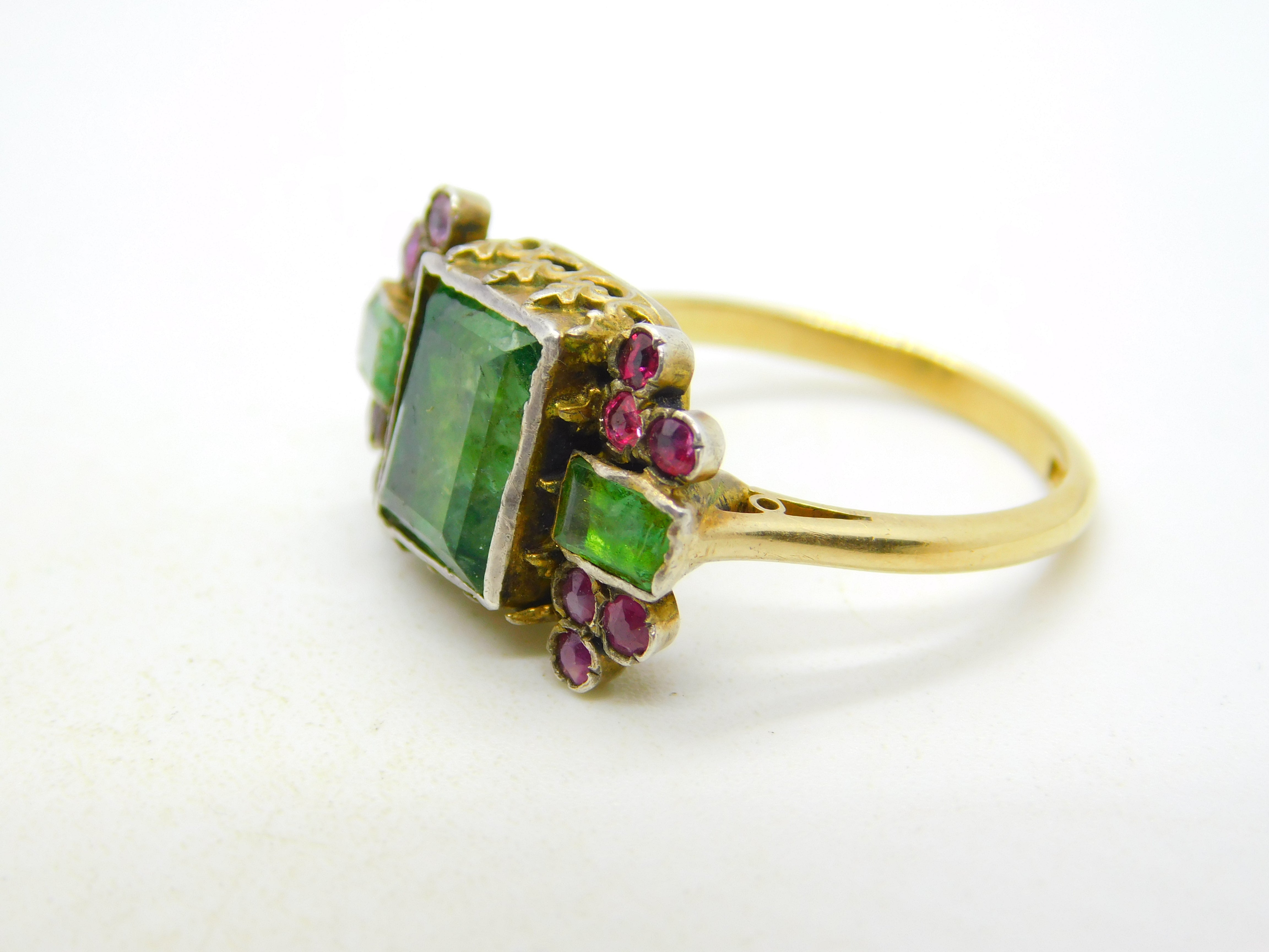 Details: A fantastic and wonderfully designed antique georgian 18th century 18ct yellow gold mourning ring set with stunning green foil-back paste stones flanked by old-cut rubies, hallmarked 18ct to the band which has been later added, the central brooch is significantly older and is adorned with charming shoulders. A superb ring with unique style and quality. This is a wonderful item that would make a perfect gift or addition to any collection.