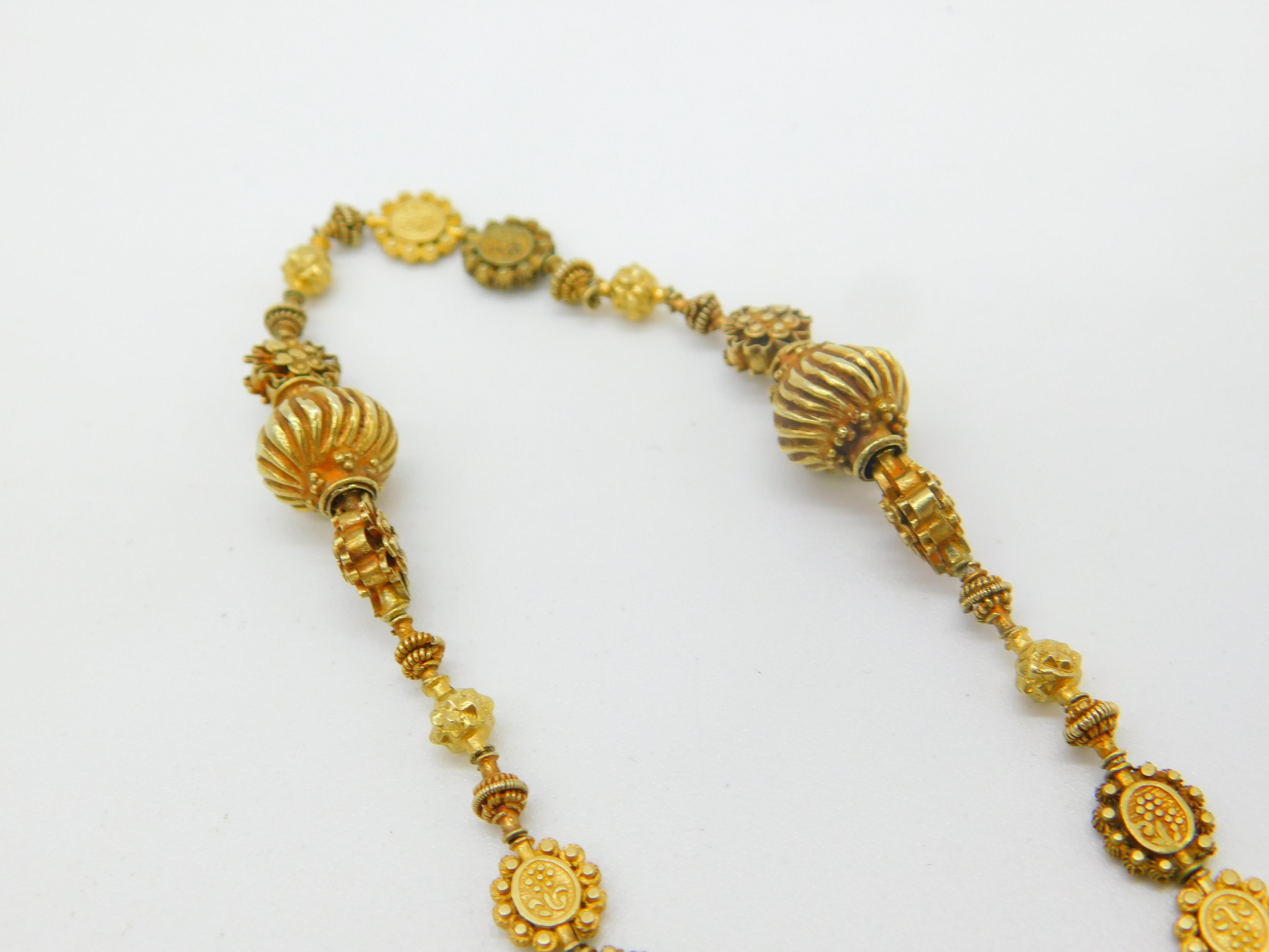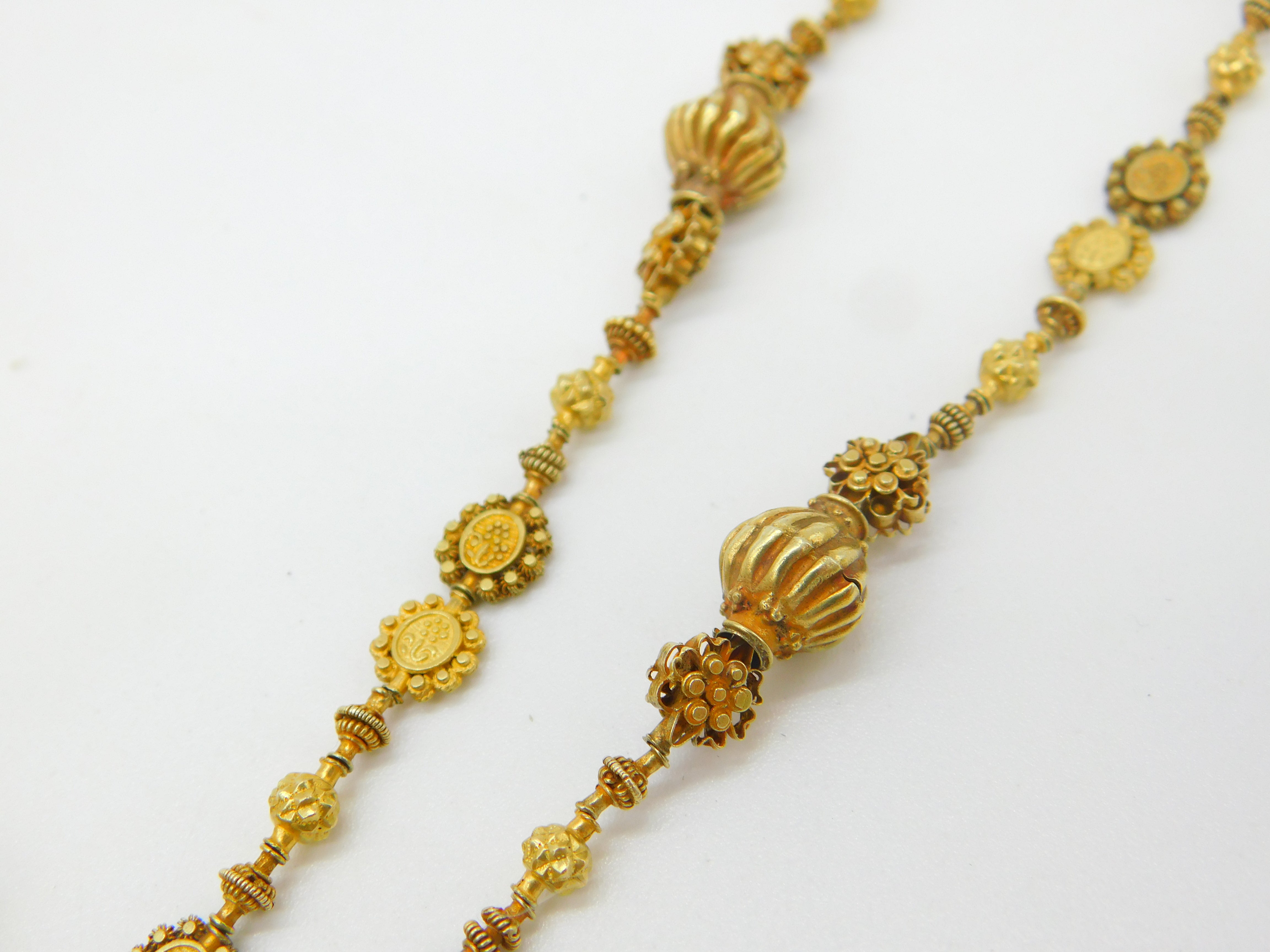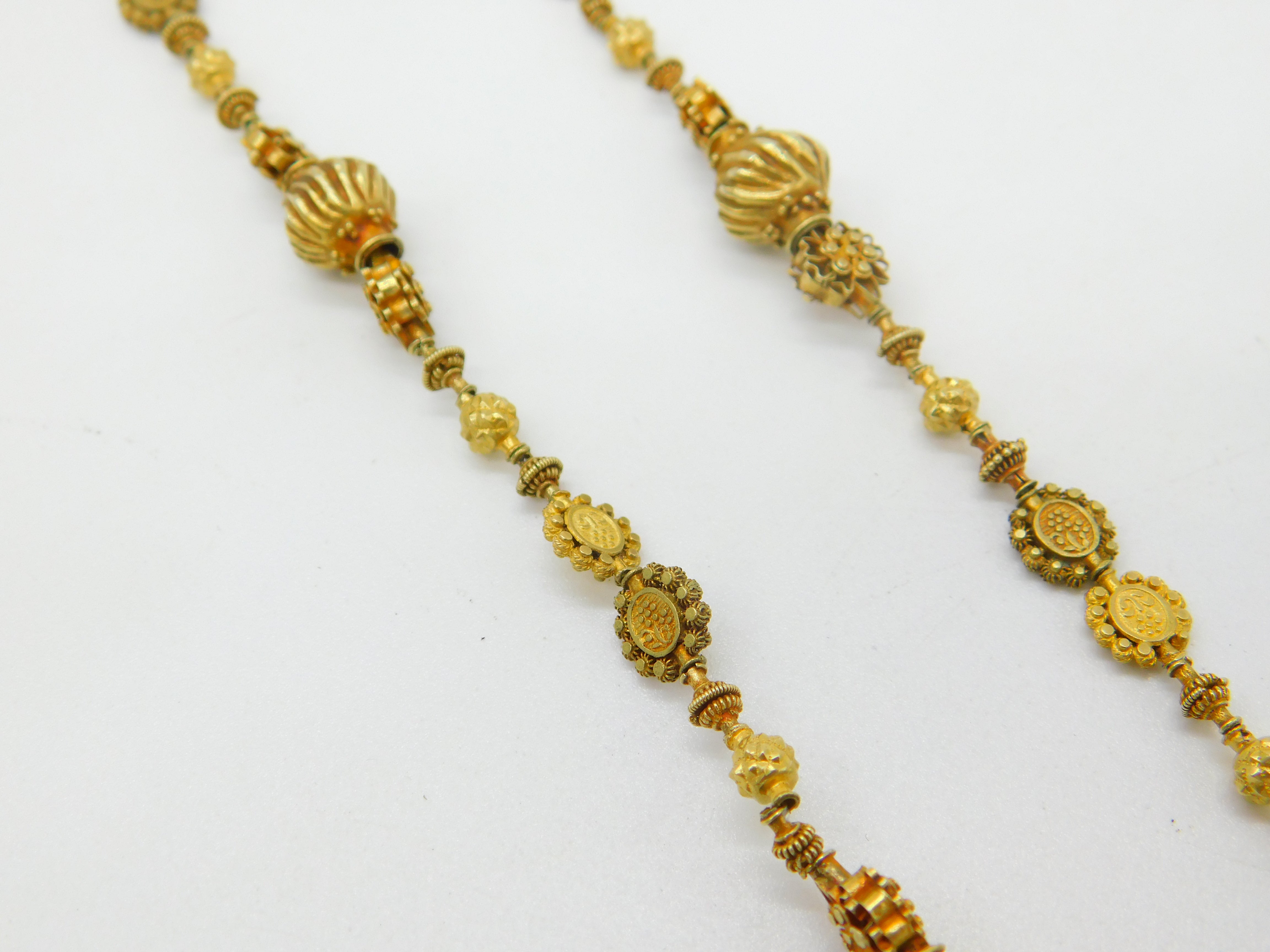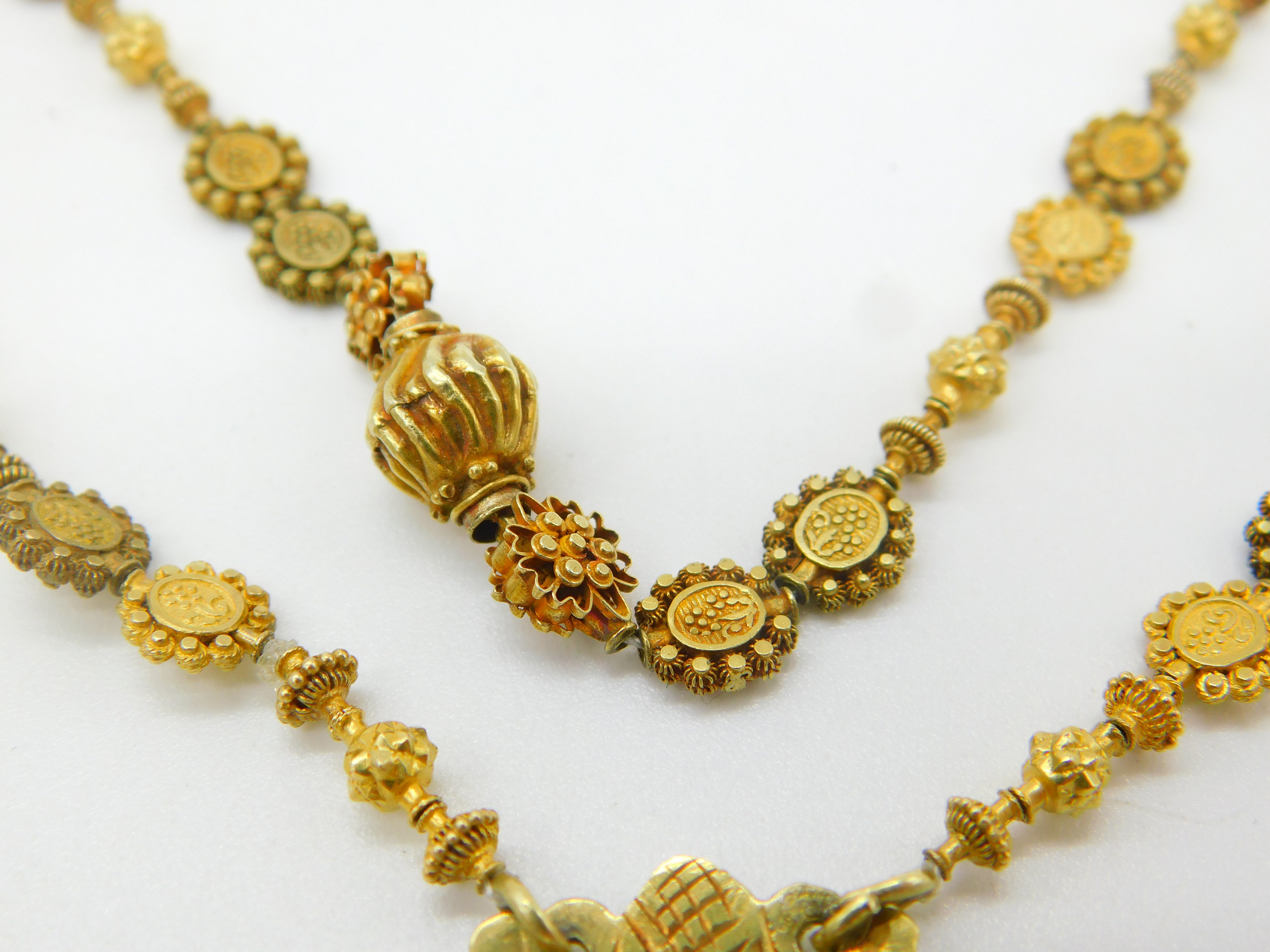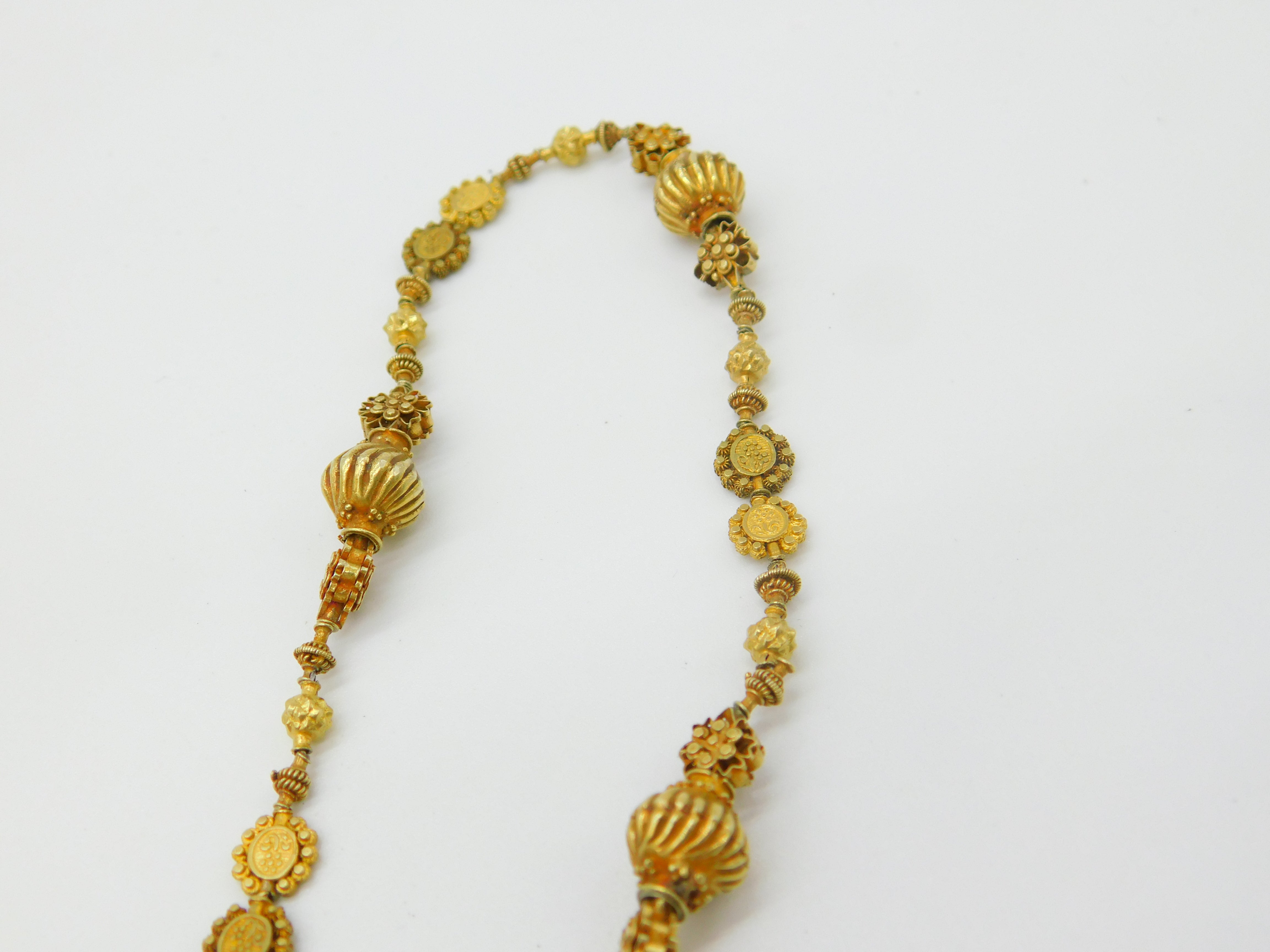 Details: A fantastic and wonderfully designed 18th century Spanish colonial Philippines 18ct yellow gold devotional necklace crafted from over 150 beads each with stunning workmanship; the item finished with a superb reliquary glass floral pendant c1750. For reference please note the collection of Spanish Jewellery in the Metropolitan Museum of Art donated on 1912 by JP Morgan. An extremely unique example, genuinely beautiful. The gold has been XRF tested as there are no marks. This is a wonderful item that would make a perfect gift or addition to any collection. The BOX pictured is for PRESENTATION ONLY and is NOT included in the listings but used to frame the pictures unless specifically stated otherwise.