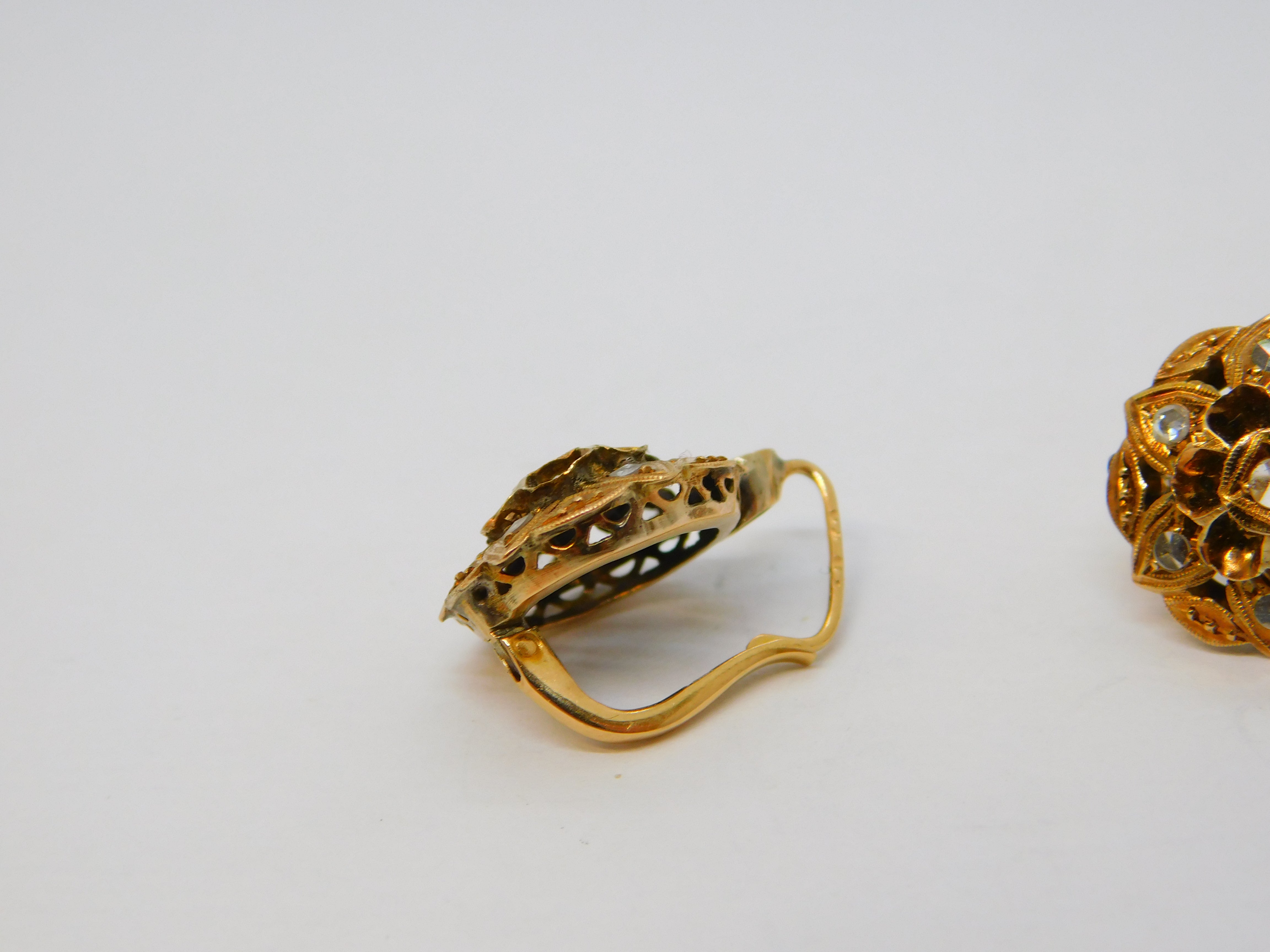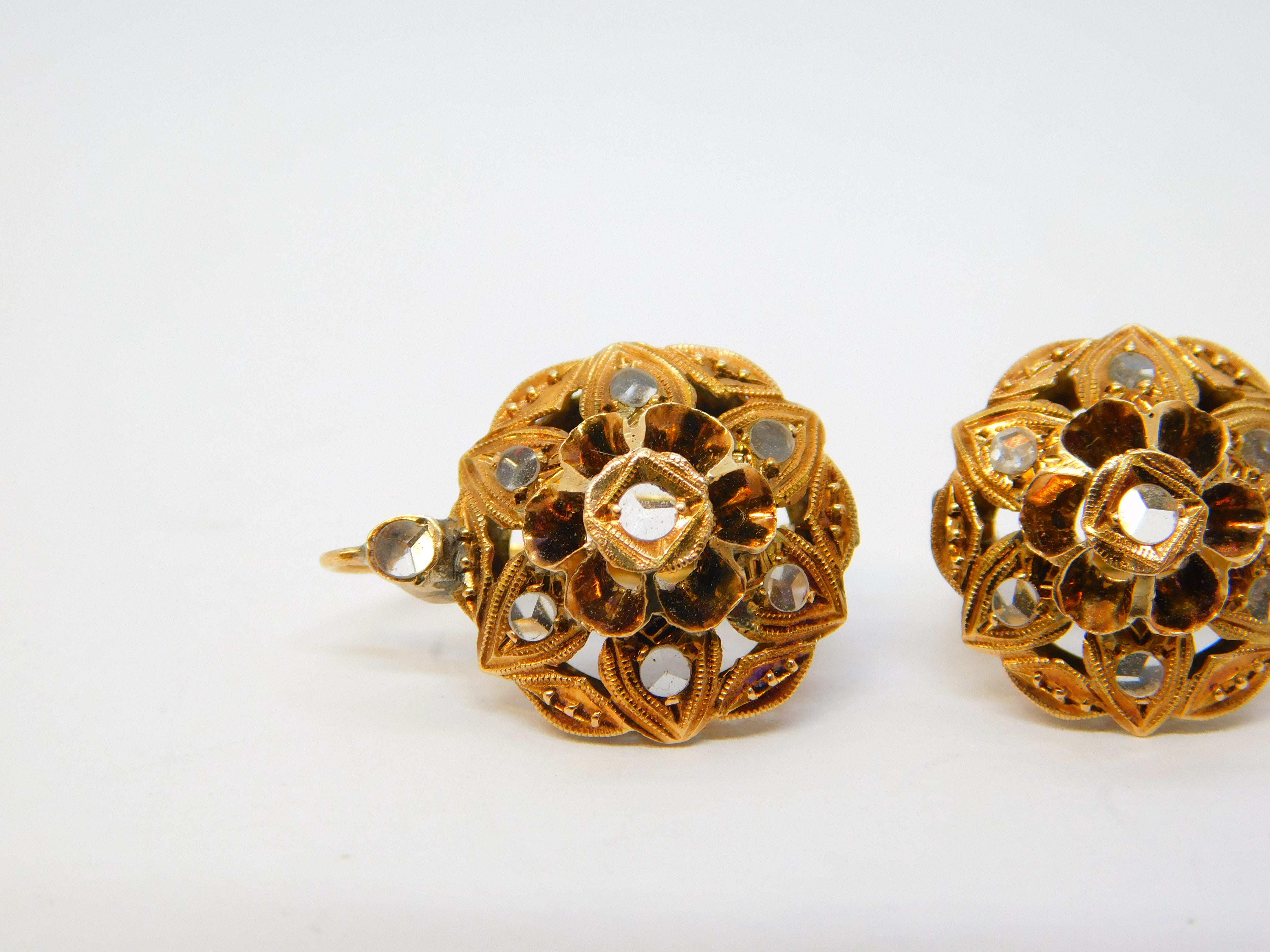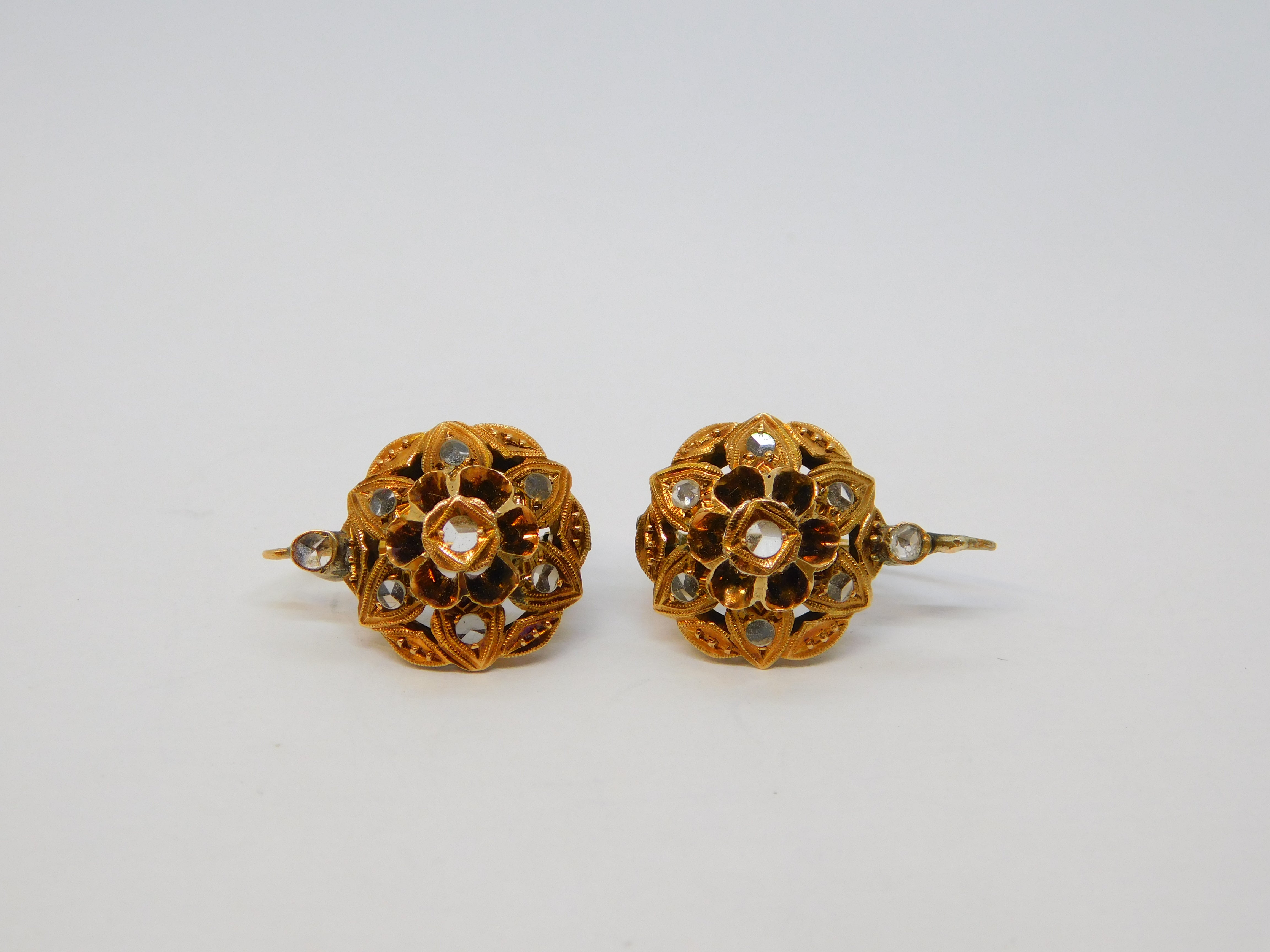 Details: A fantastic and wonderfully designed antique 19th century austro-hungarian 14ct yellow gold & old-cut diamond floral earrings with lovely detailing hallmarked to the backs c1860, the gold has also been XRF tested. This is a wonderful item that would make a perfect gift or addition to any collection. The BOX pictured is for PRESENTATION ONLY and is NOT included in the listings but used to frame the pictures unless specifically stated otherwise.