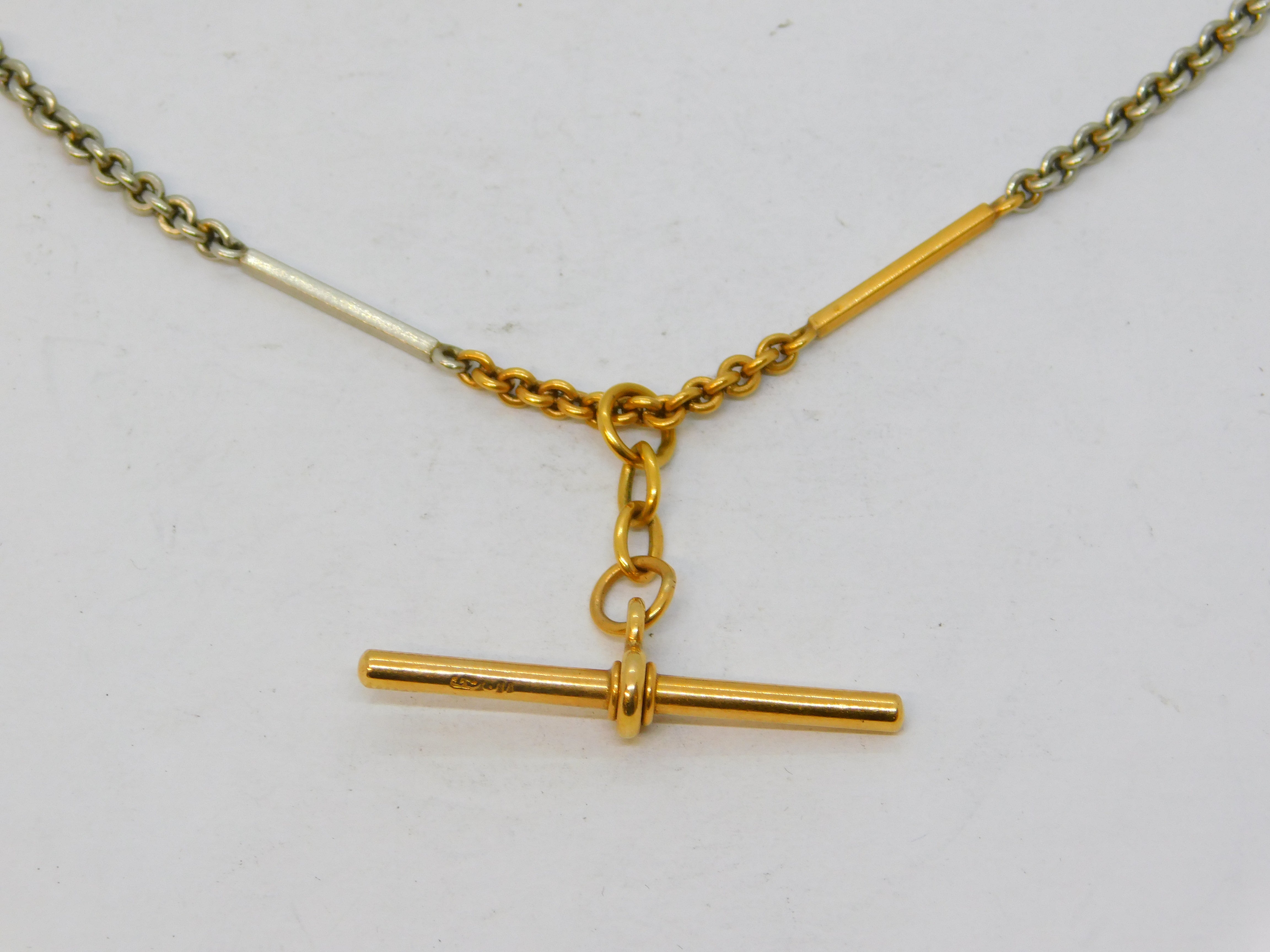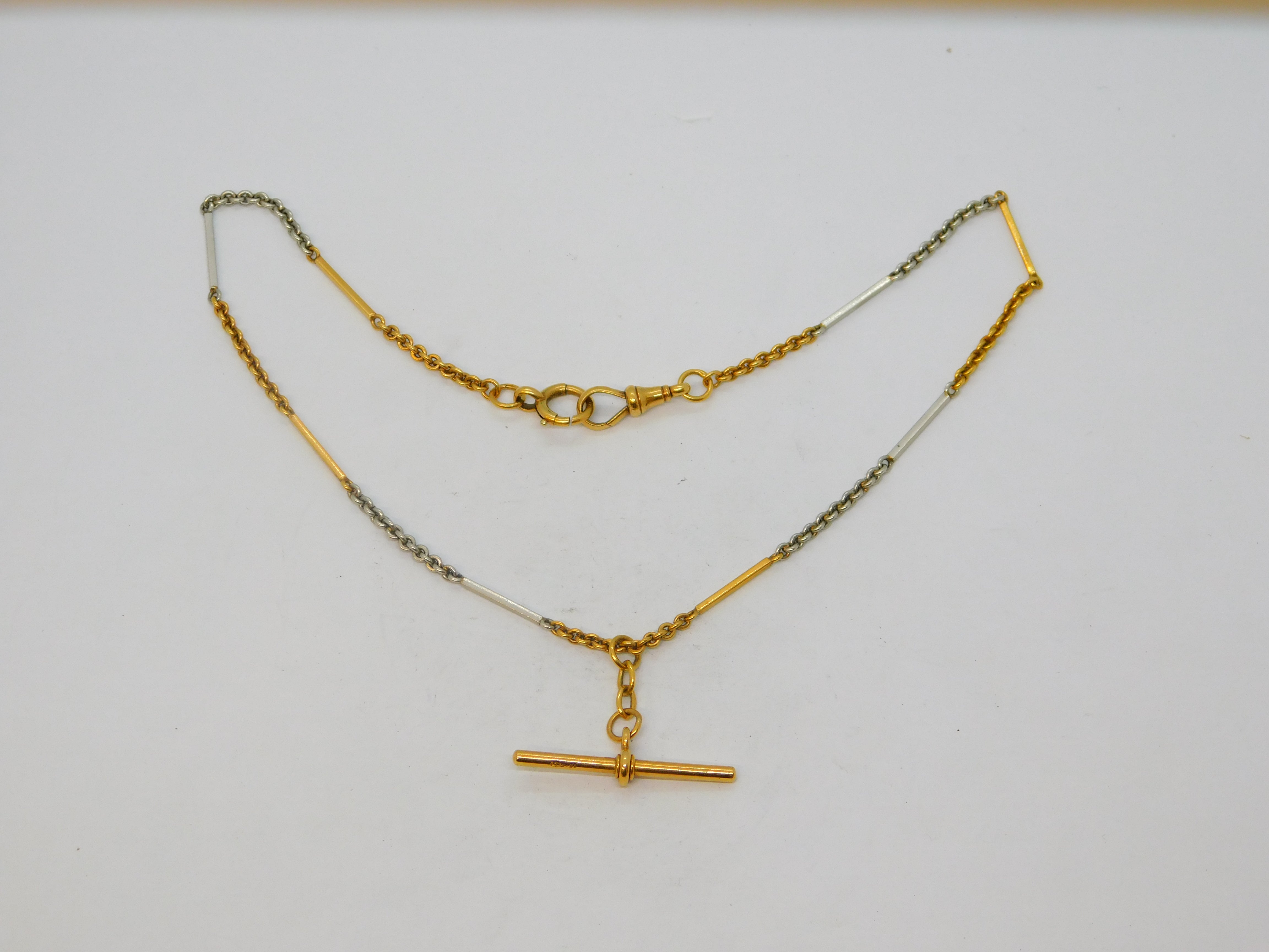Details: A fantastic and wonderfully designed antique 19th century 18ct yellow & white gold baton link watch chain with charming t-bar, dog clip and bolt ring hallmarked in multiple places and XRF tested c1890. This is a wonderful item that would make a perfect gift or addition to any collection.