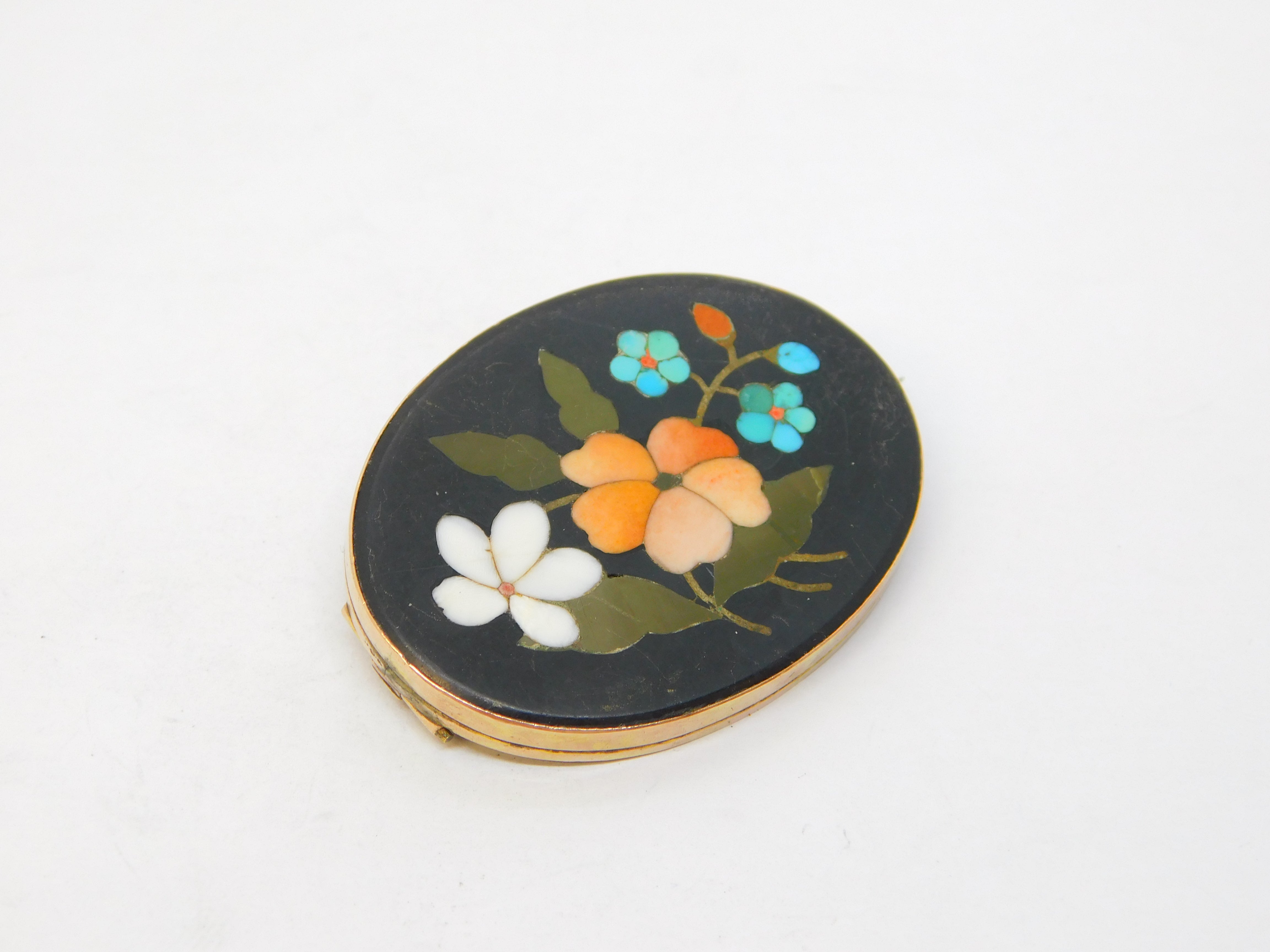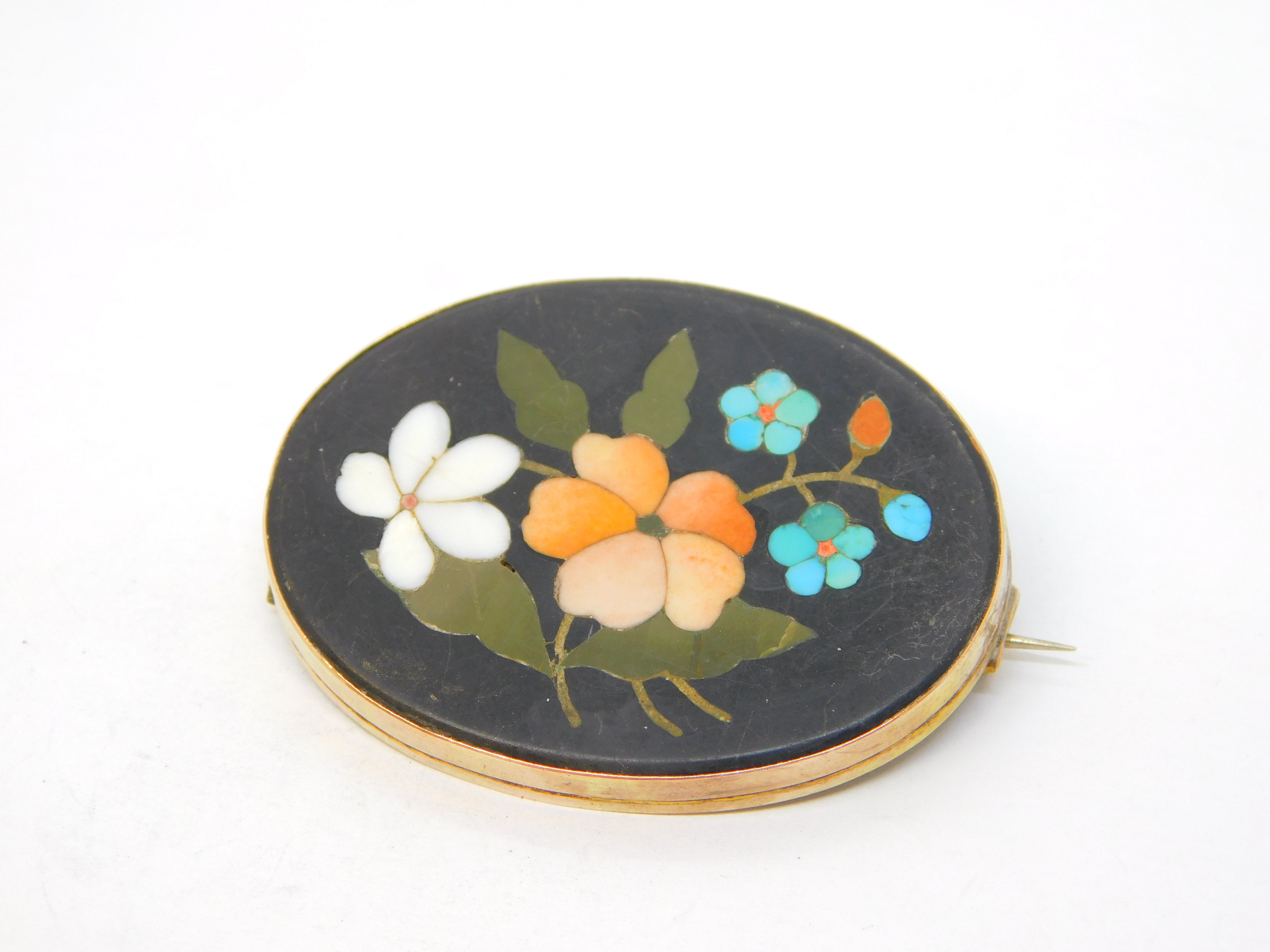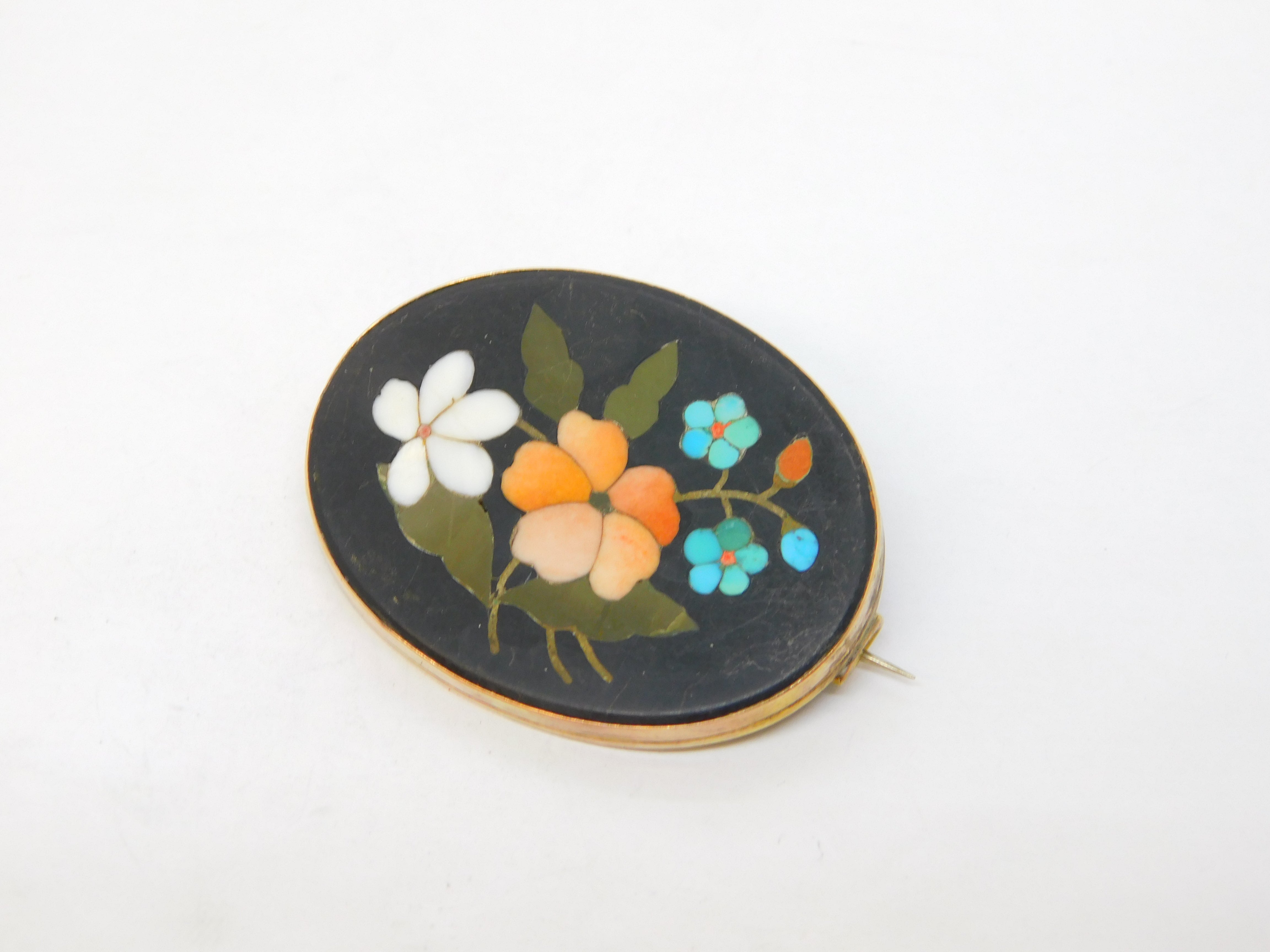 Details: A fantastic and wonderfully designed antique 19th century 9ct rose gold mounted brooch pin with superb pietra dura floral detailing c1860, the gold has been XRF tested as it is unmarked. This is a wonderful item that would make a perfect gift or addition to any collection.
