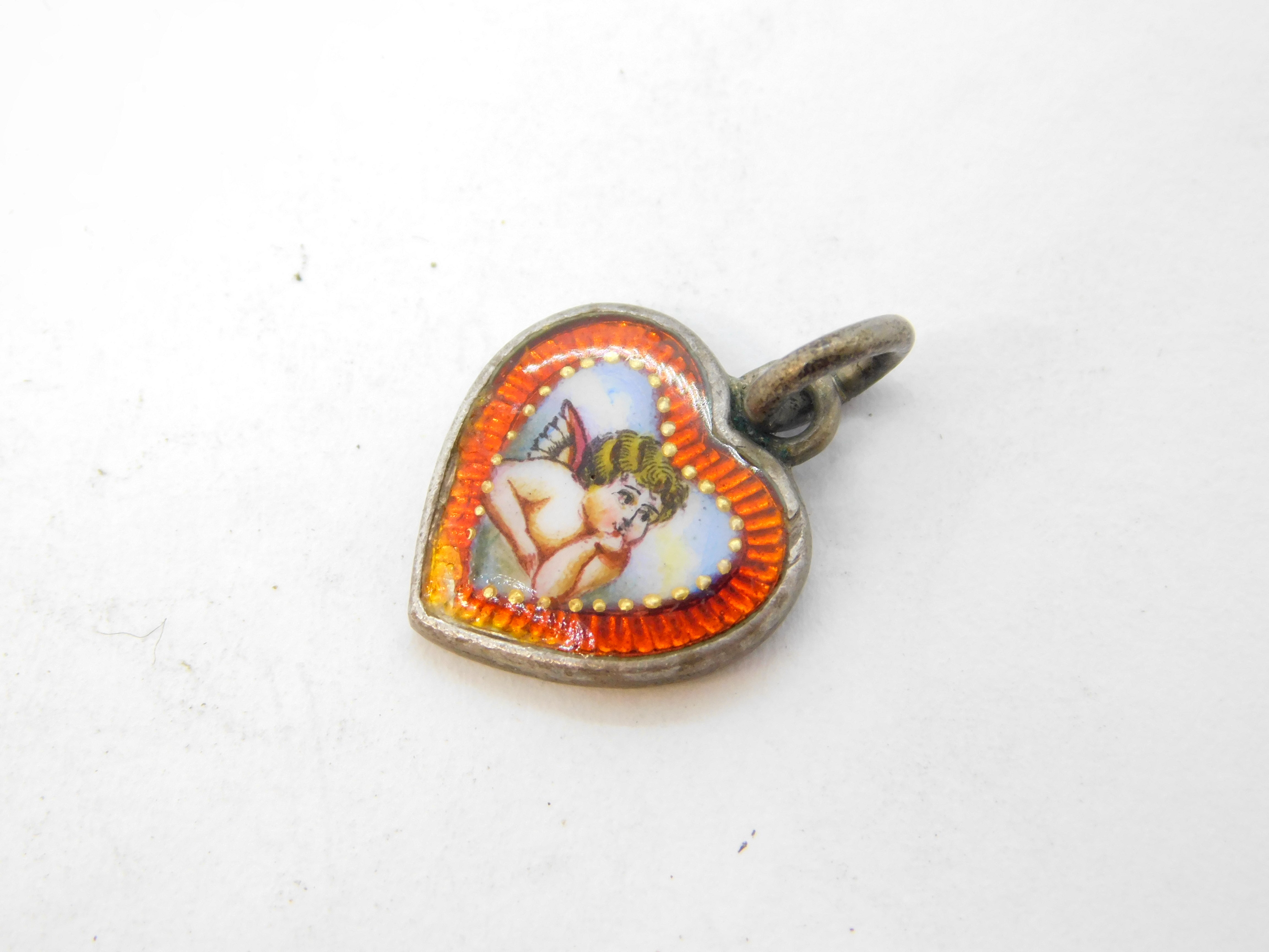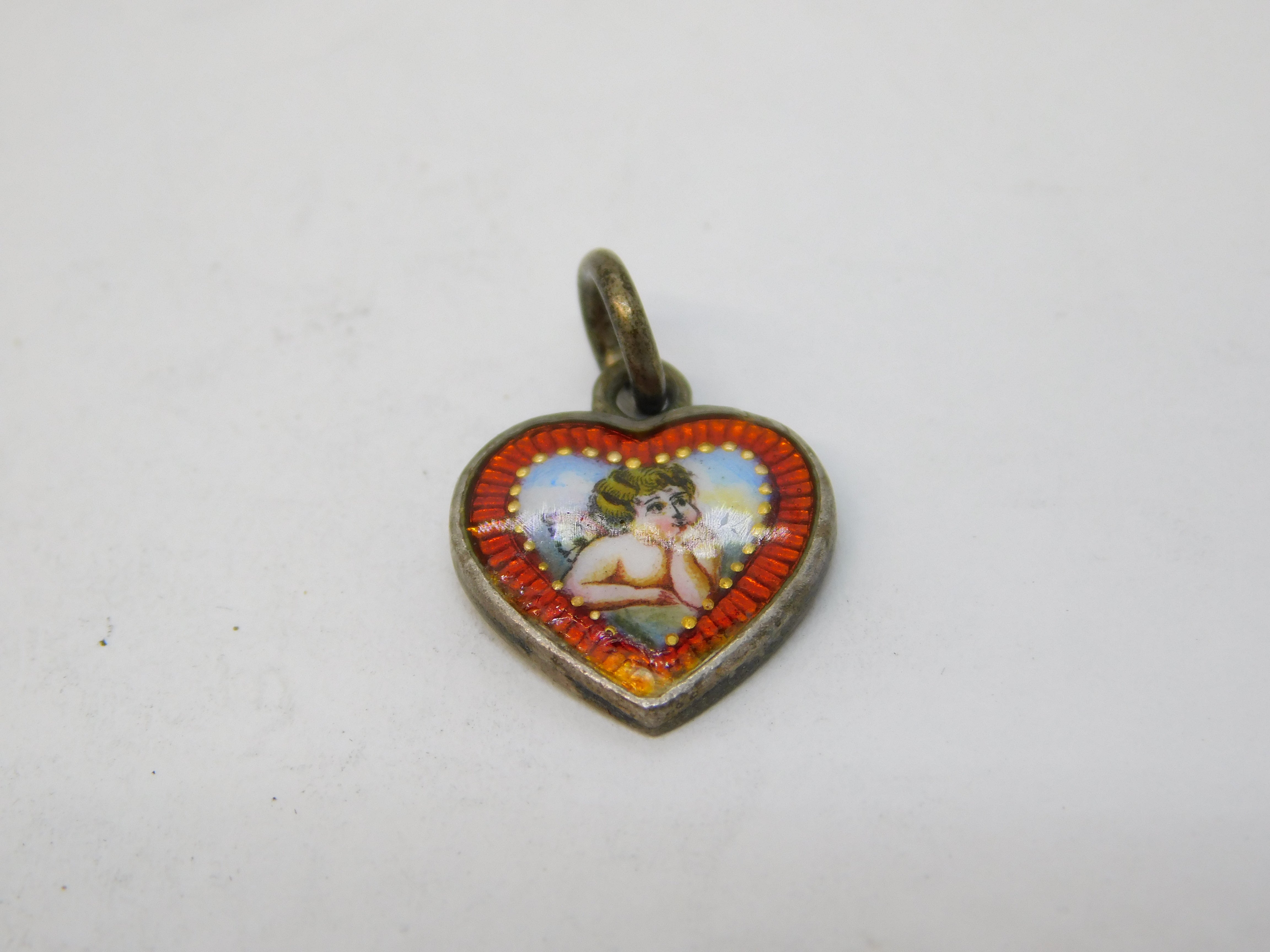 19th Century Austro-Hungarian Sterling Silver & Enamel Cherub Heart Charm c1880