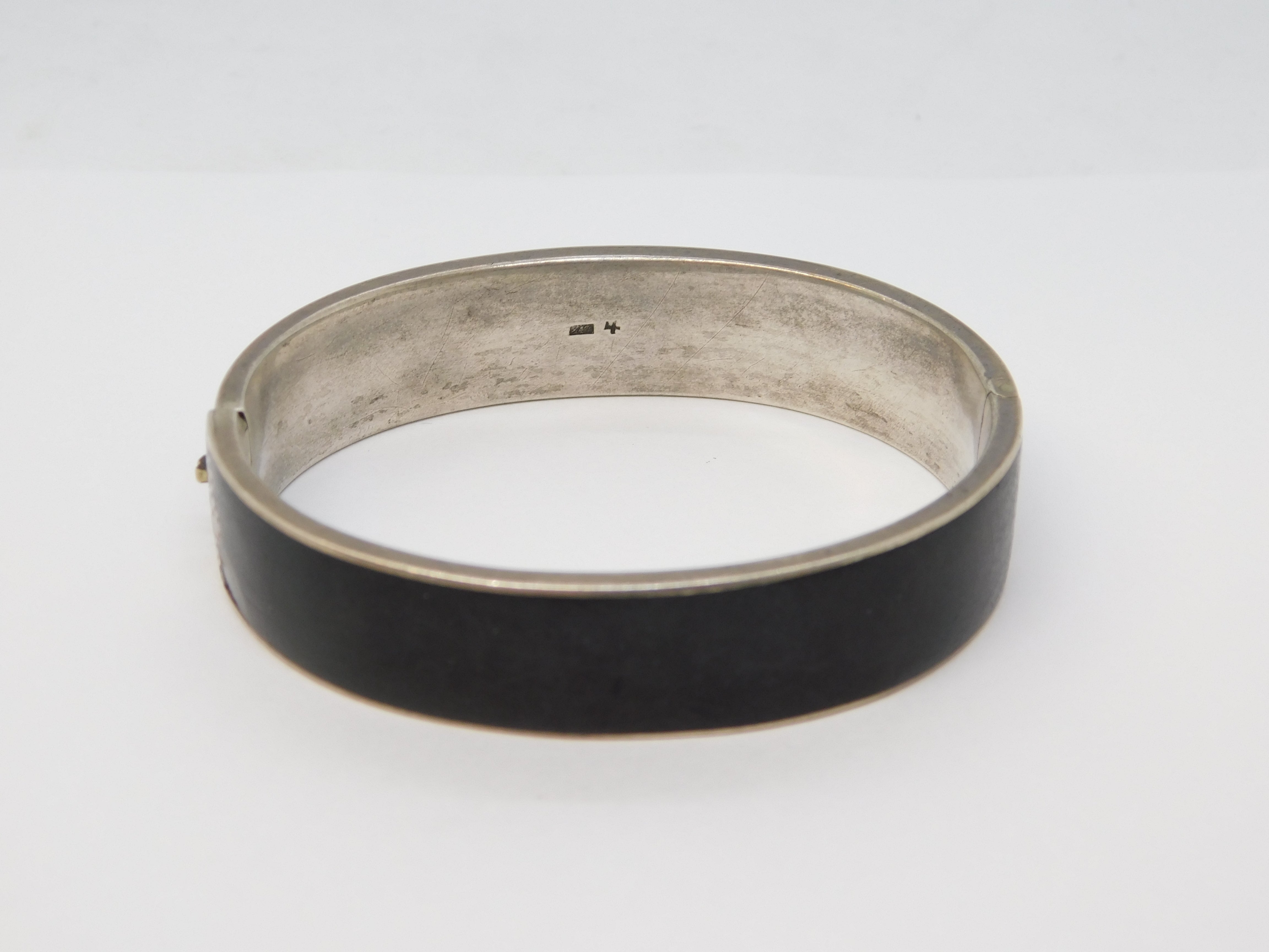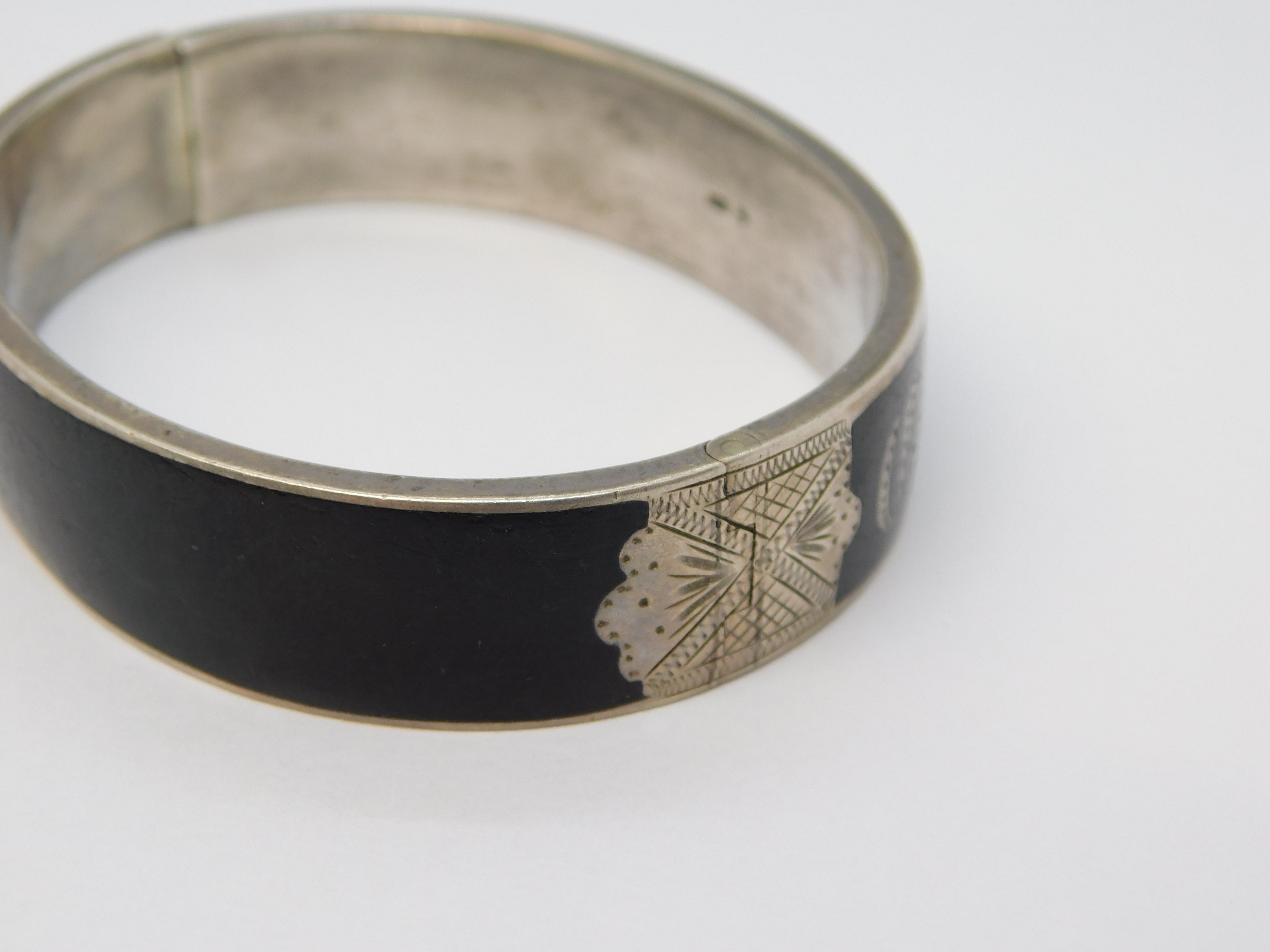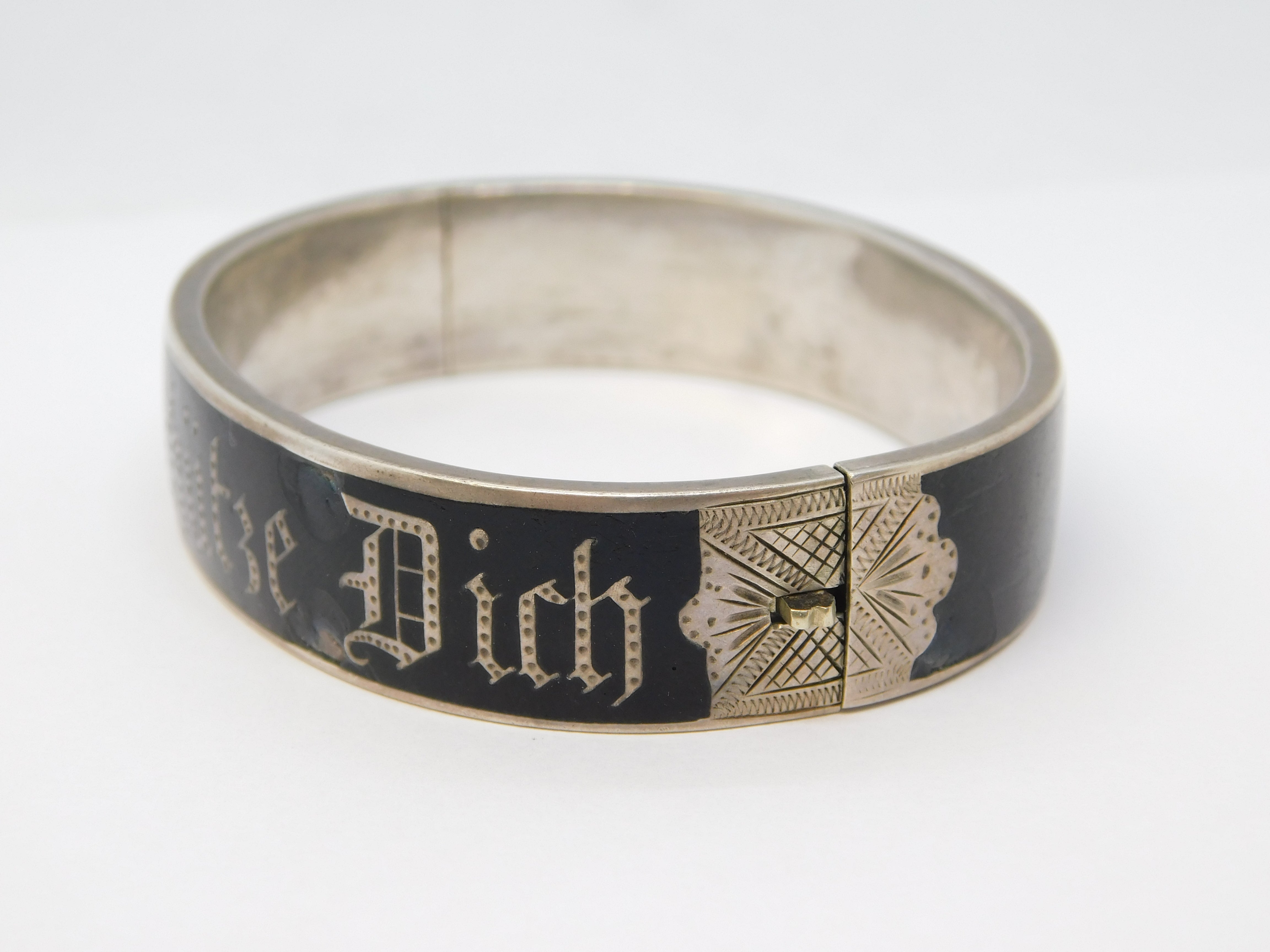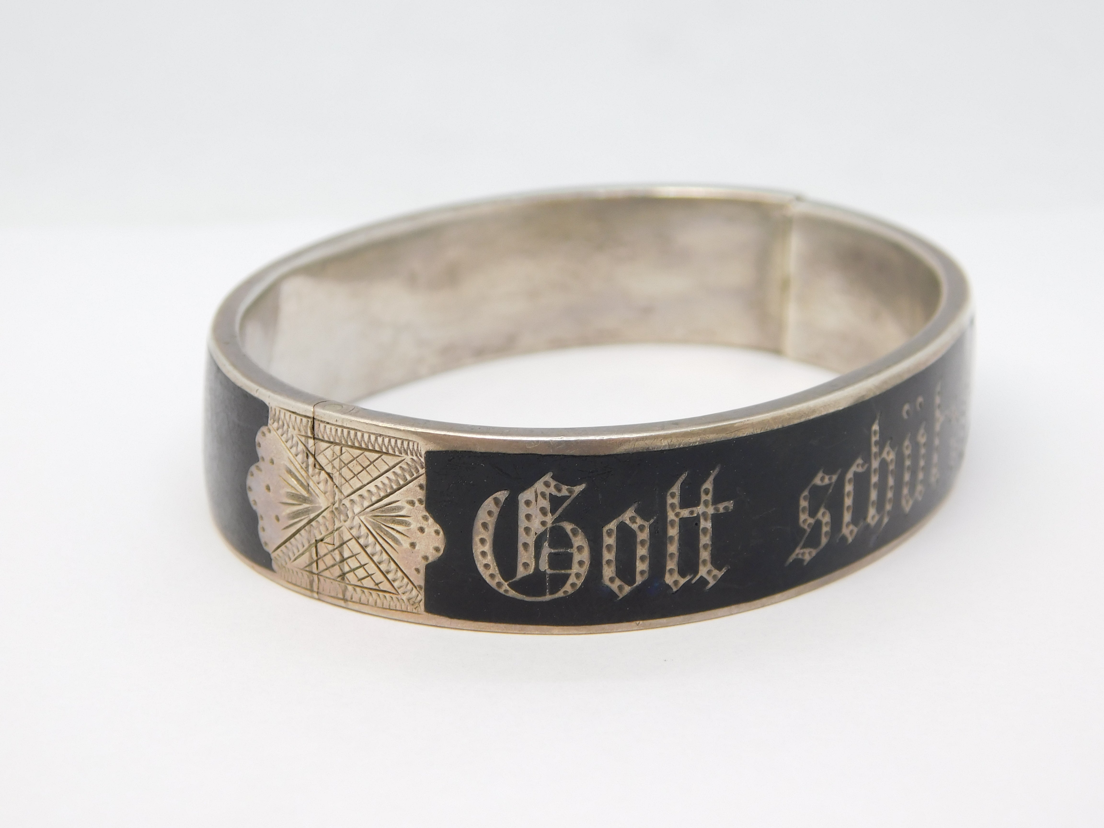 19th Century Silver Black Enamel 'Gott Schütze Dich' Mourning Bangle Antique c1860