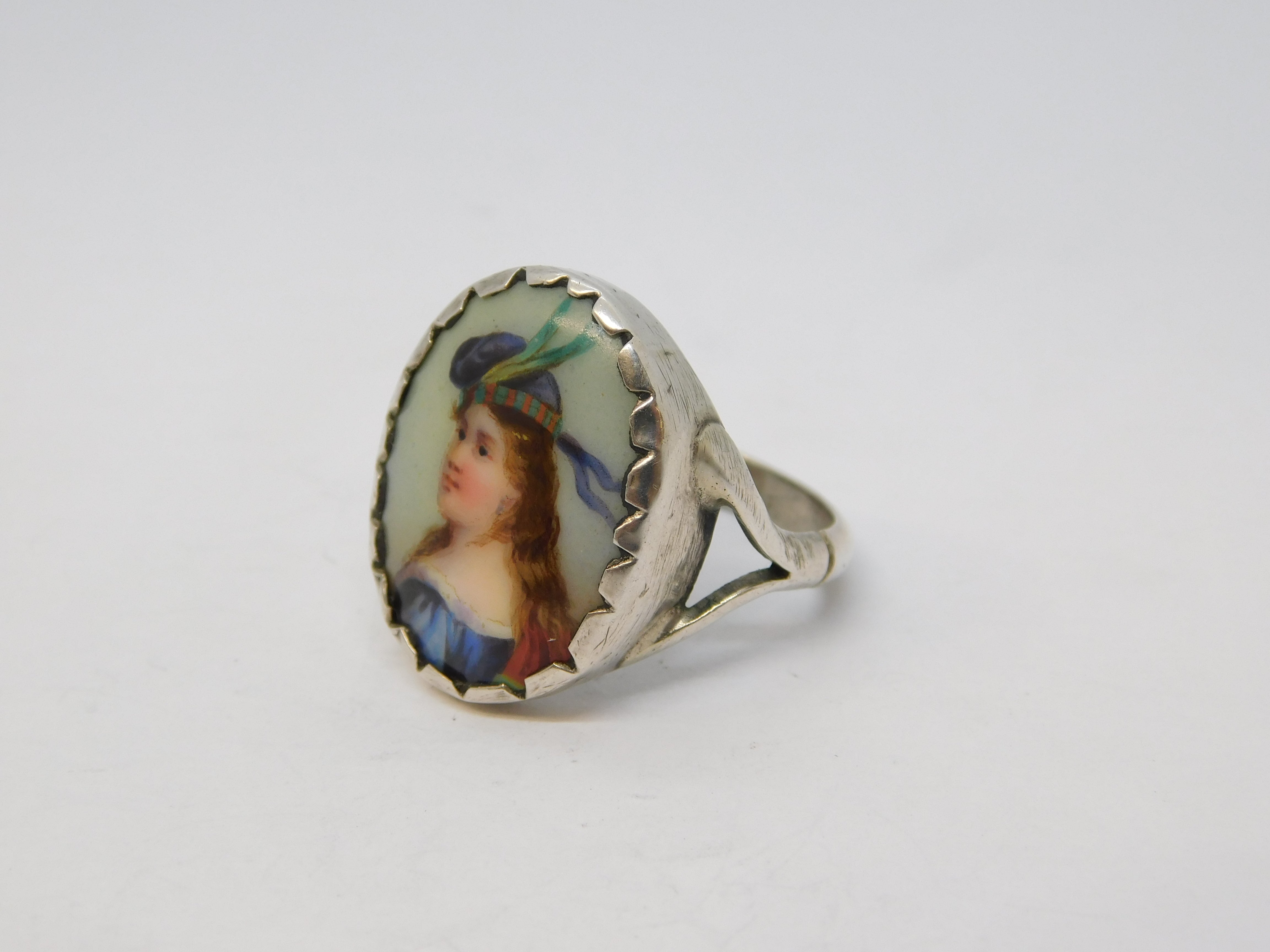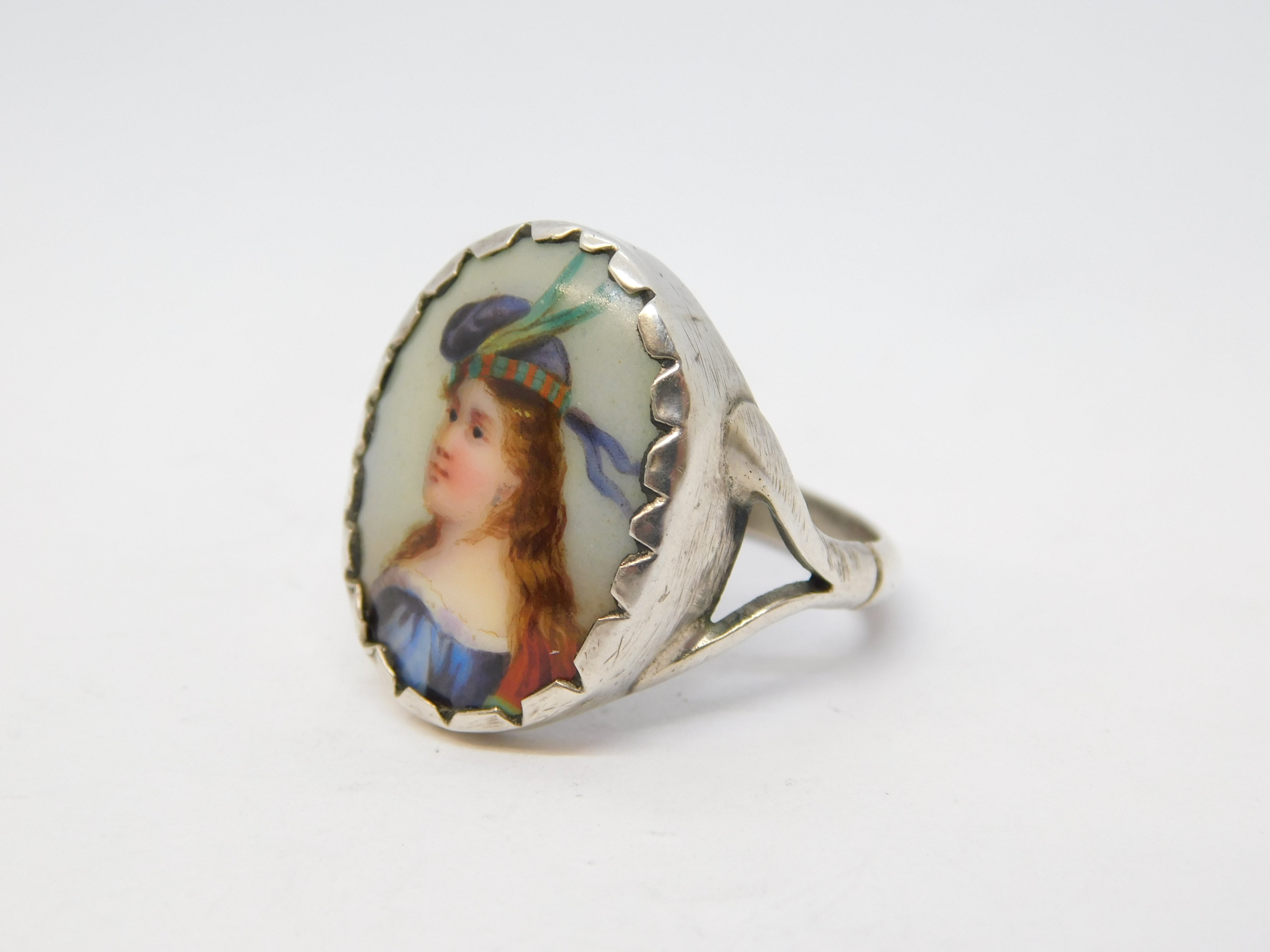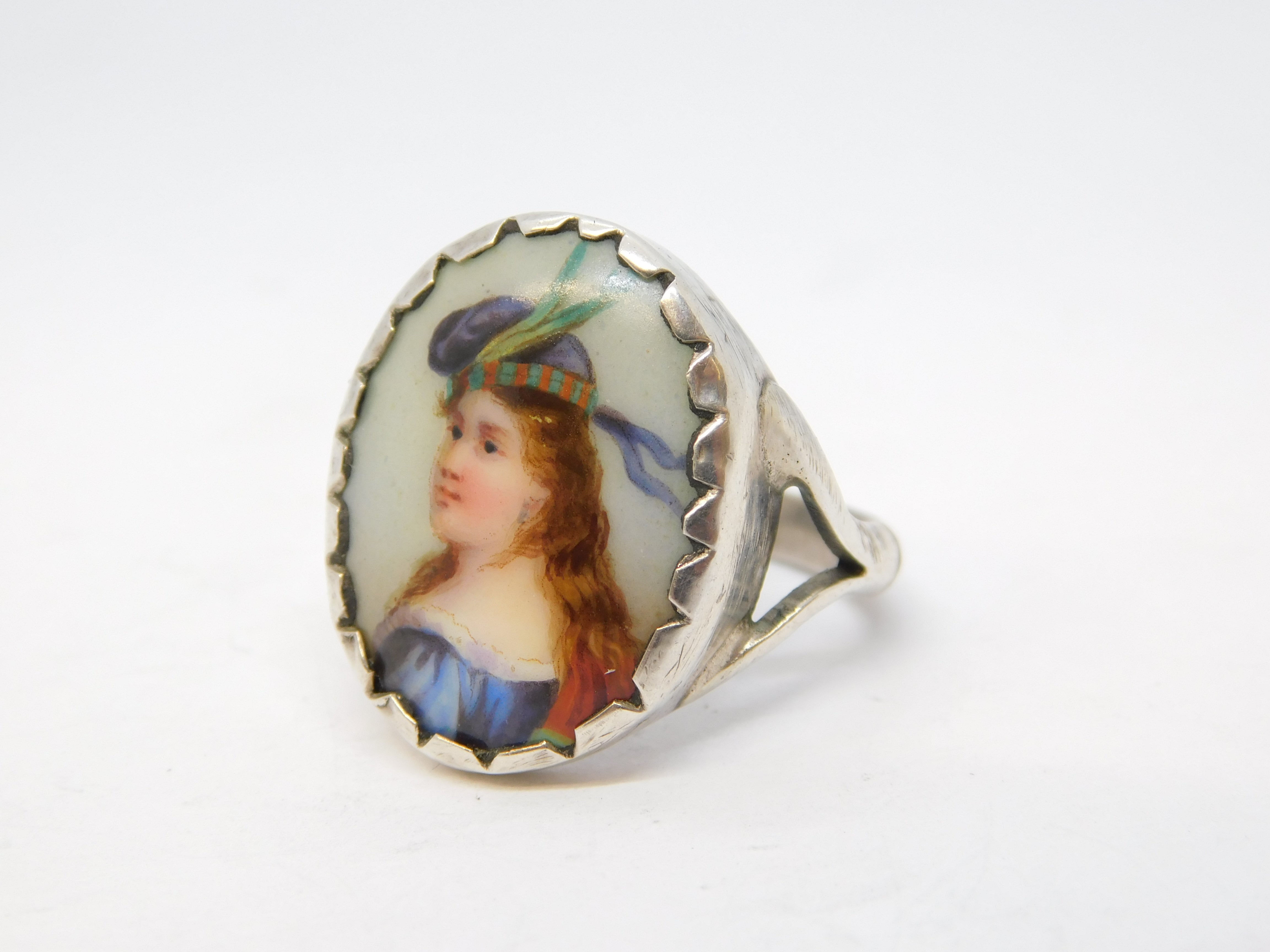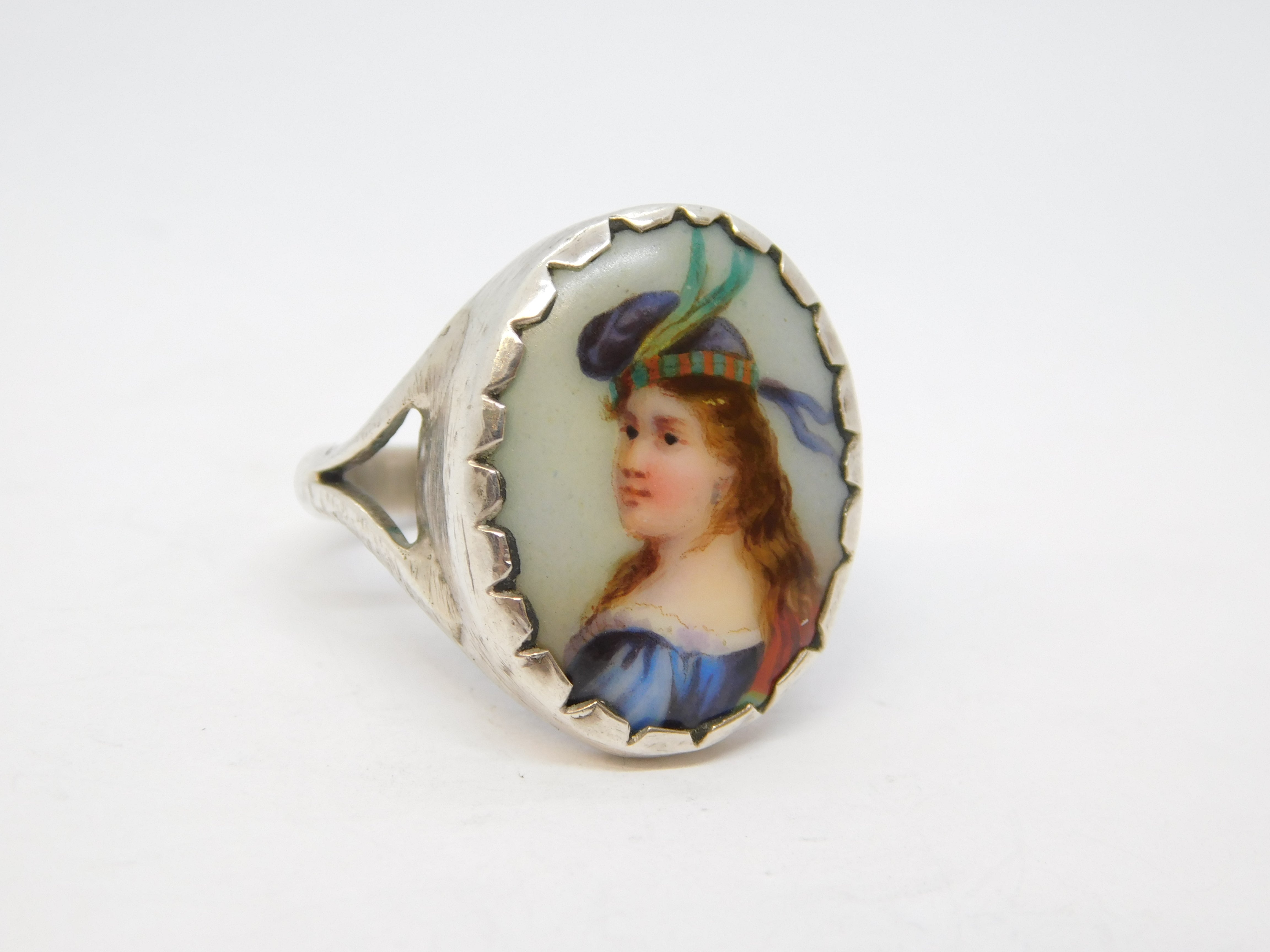 Details: A fantastic and wonderfully designed antique 19th century sterling silver dress ring set with superb hand painted porcelain panel showing a young, possibly Scottish showing a young Mary Queen of Scots, c1860, the silver has been XRF tested as it is unmarked. This is a wonderful item that would make a perfect gift or addition to any collection.