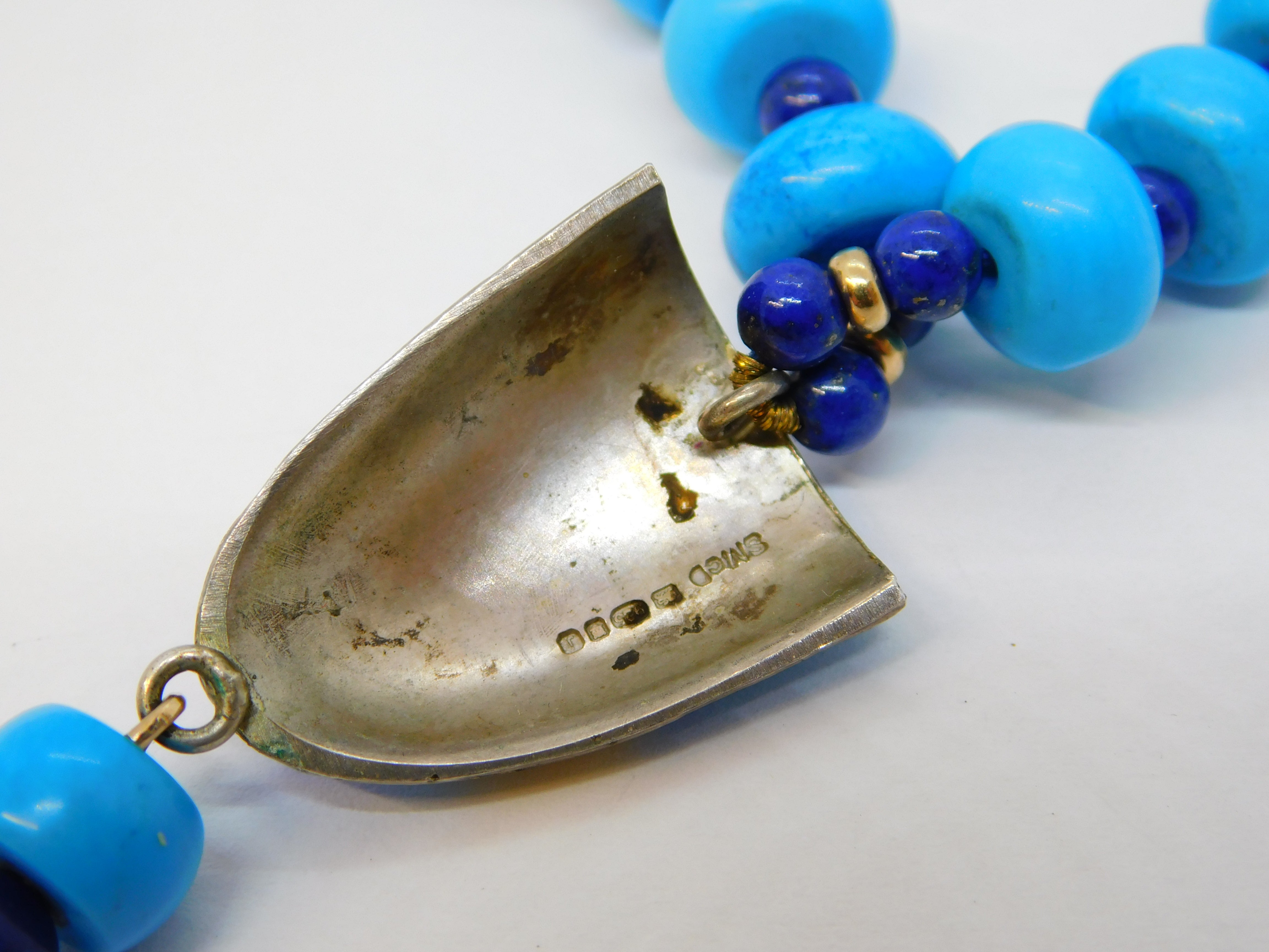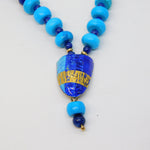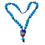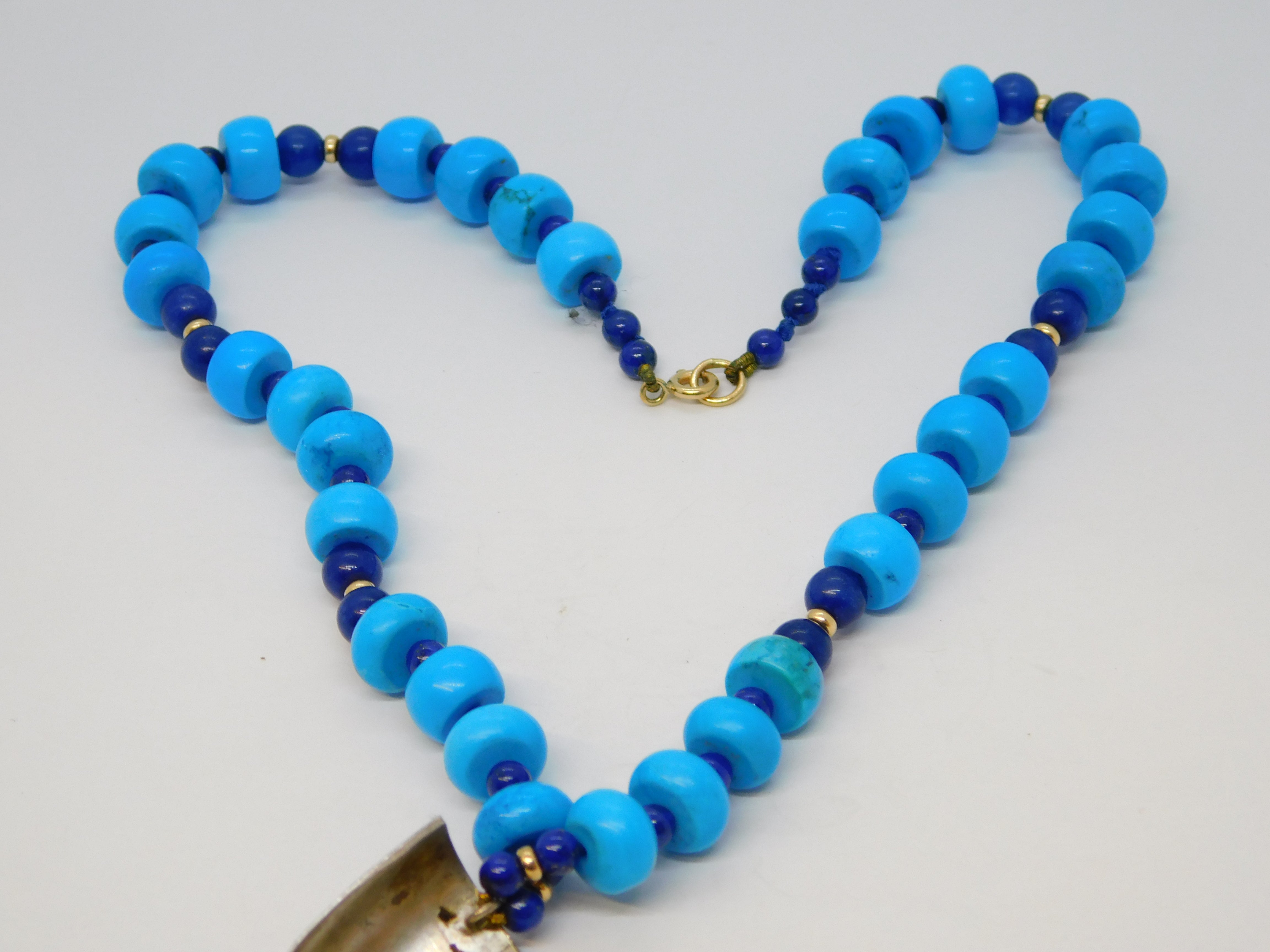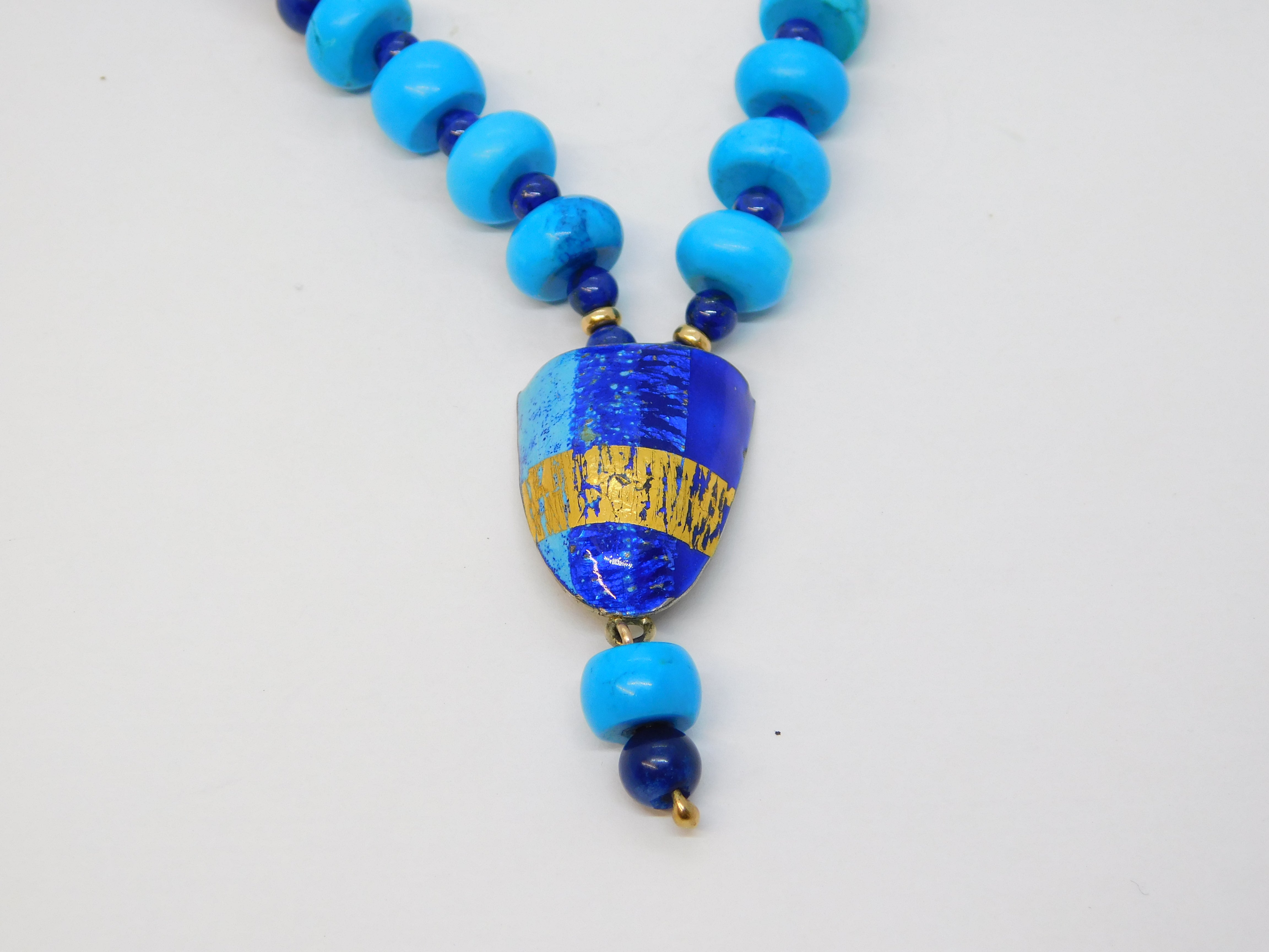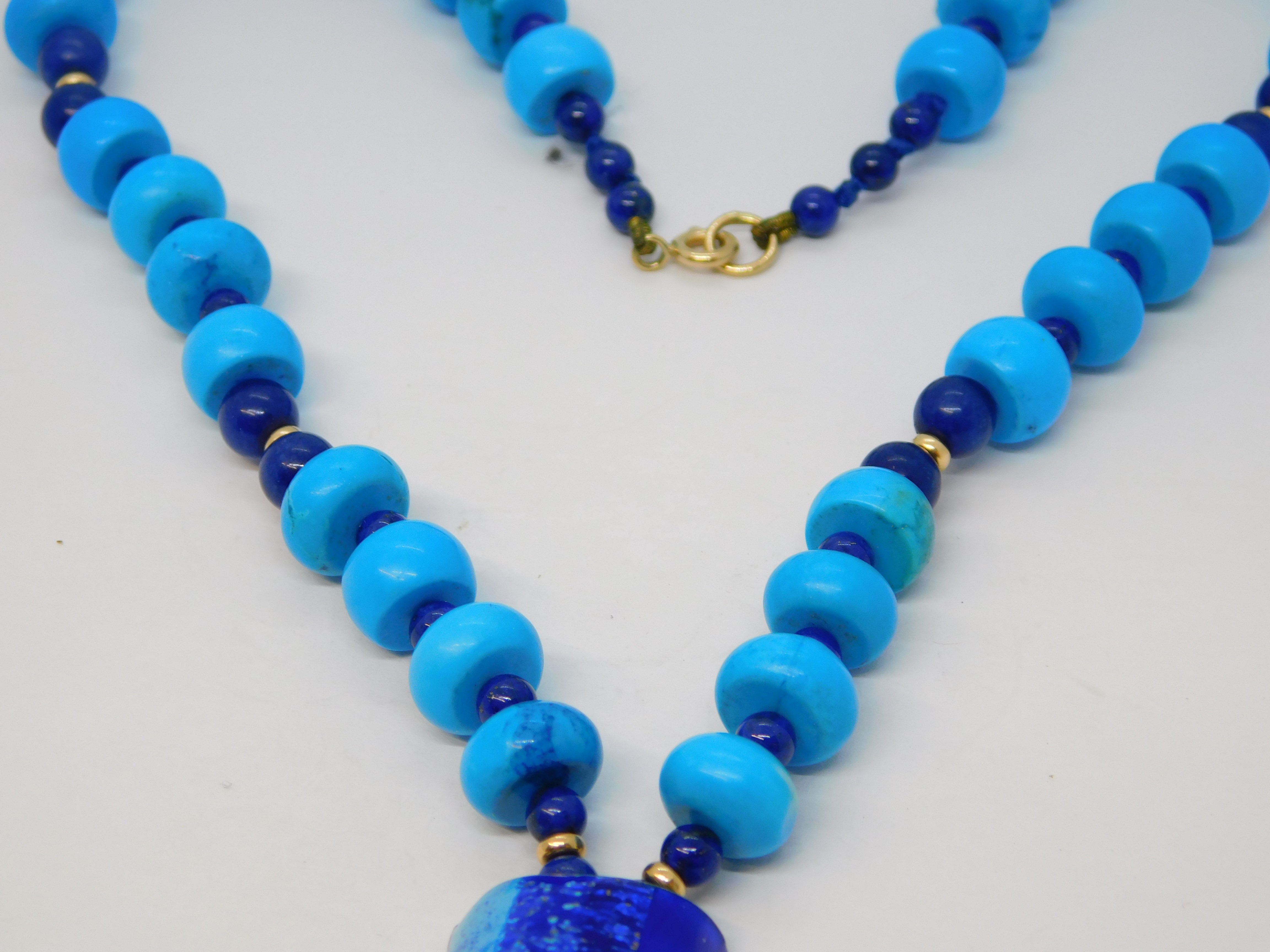 Details: A fantastic and wonderfully designed vintage 9ct yellow gold, lapis lazuli and turquoise set beaded necklace set with sterling silver enamel drop pendant hallmarked London 2008 to the reverse. This is a wonderful item that would make a perfect gift or addition to any collection.