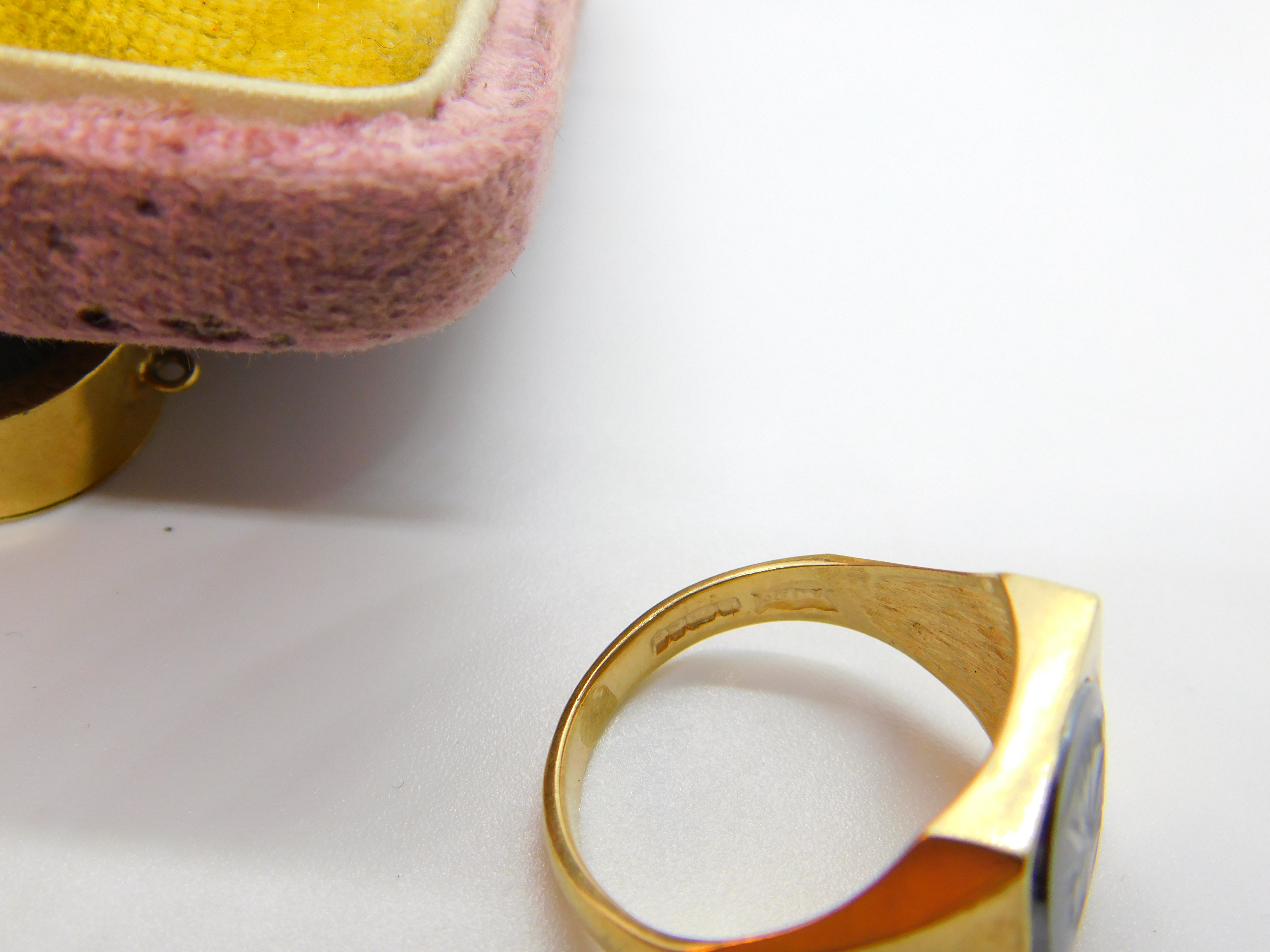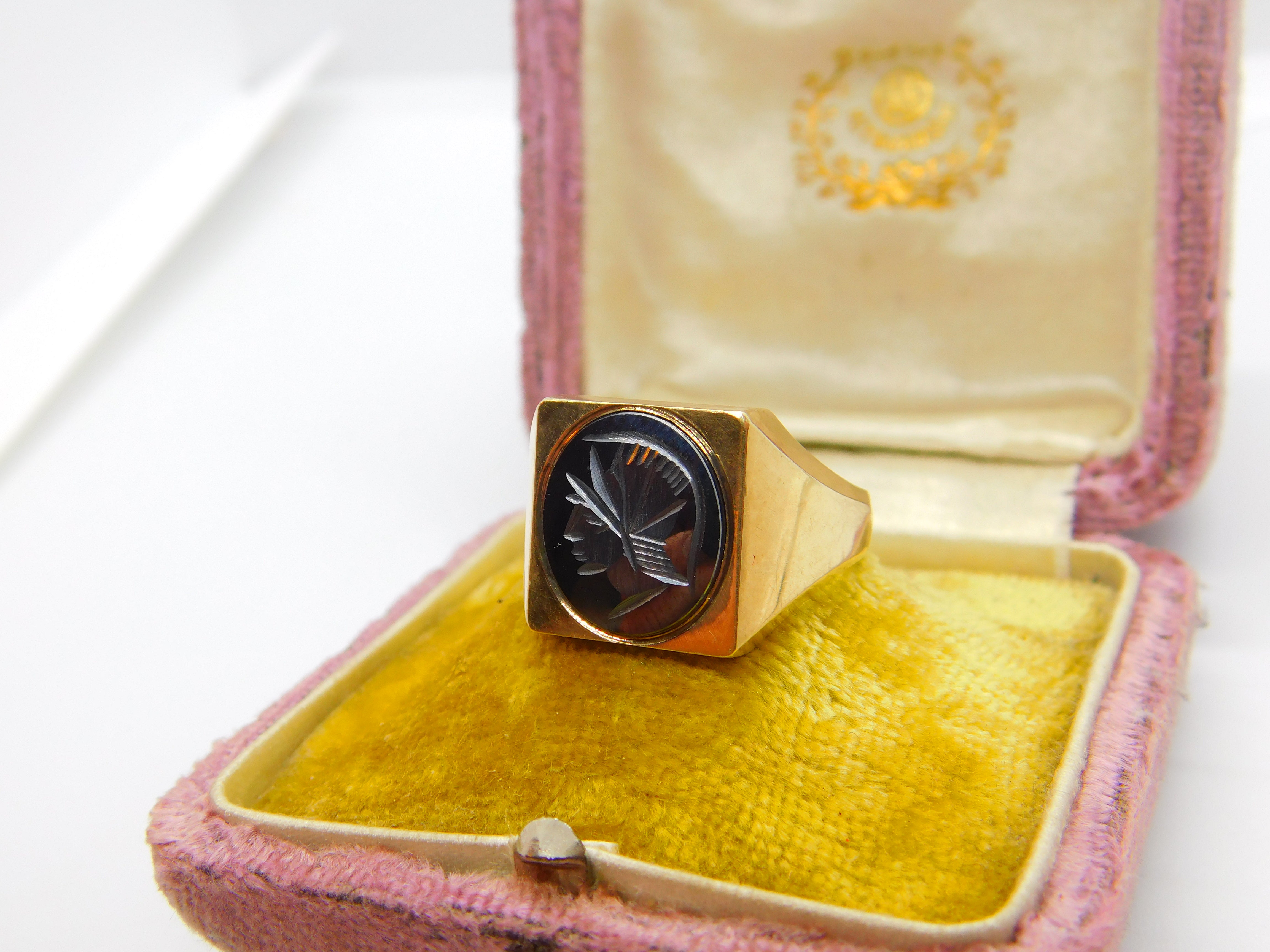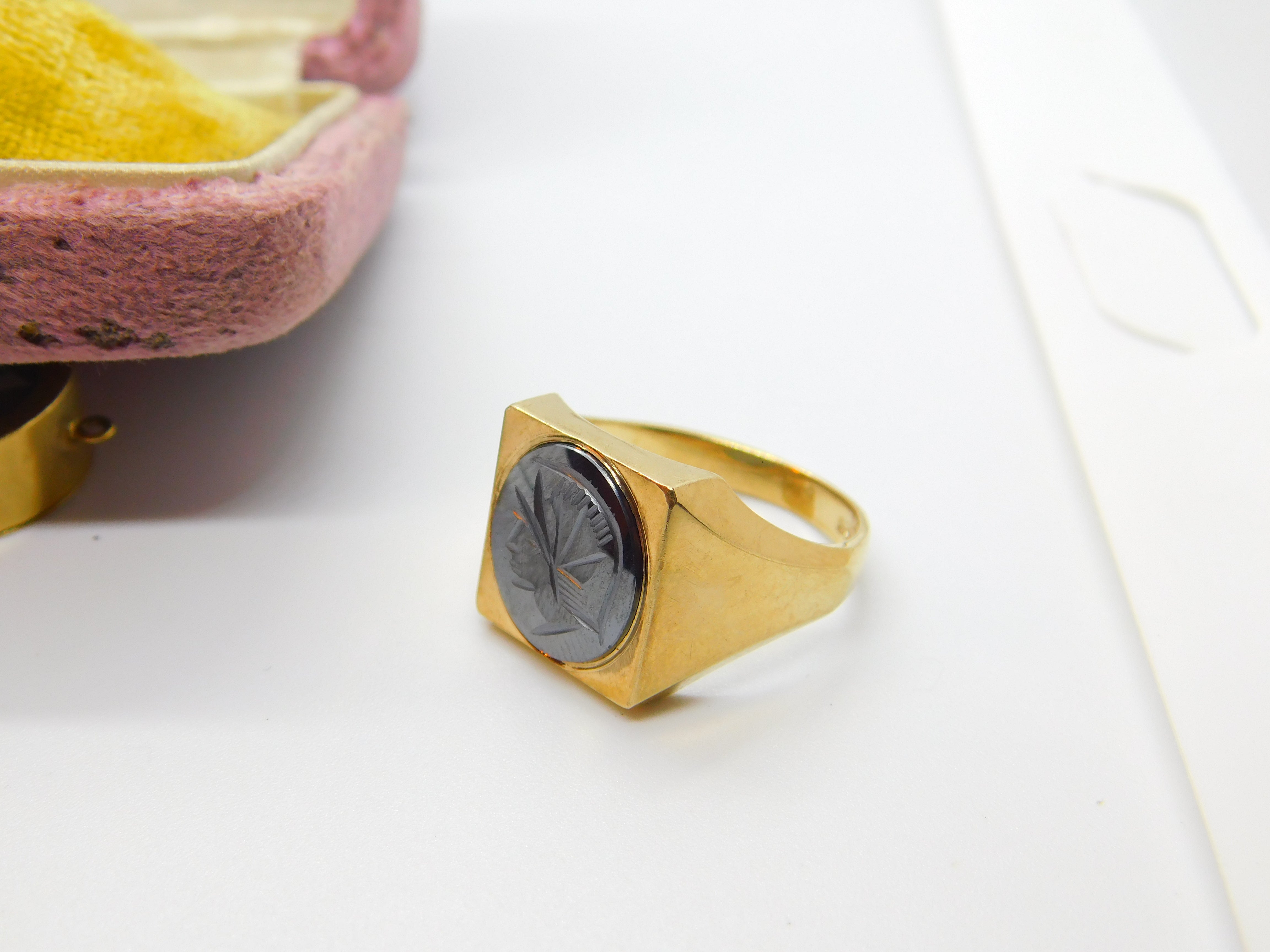 Details: A fantastic and wonderfully designed vintage 9ct yellow gold chunky gents signet ring set with carved haematite centurion panel to the centre hallmarked Birmingham 1975 to the inner band. This is a wonderful item that would make a perfect gift or addition to any collection. The BOX pictured is for PRESENTATION ONLY and is NOT included in the listings but used to frame the pictures unless specifically stated otherwise.