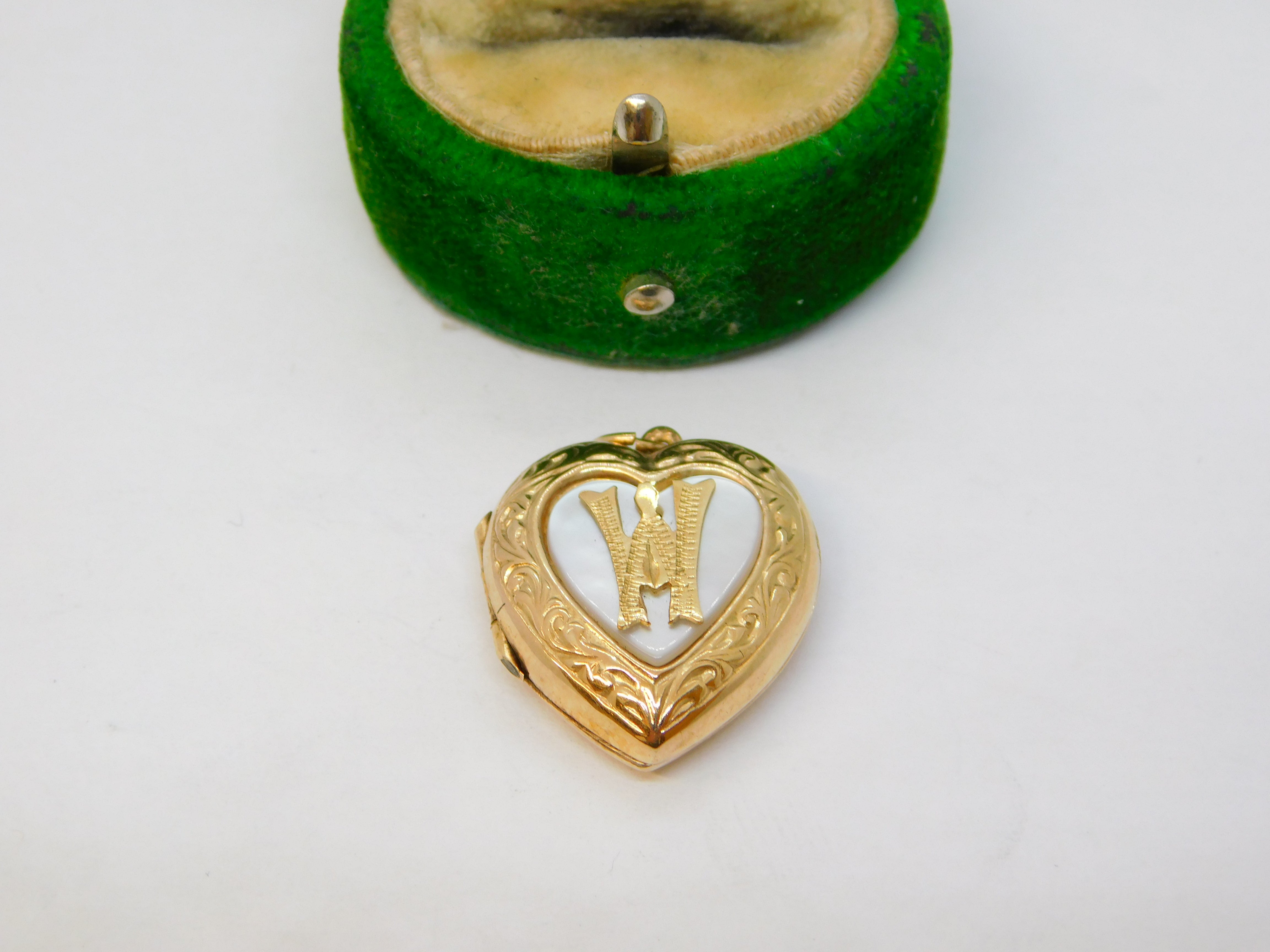 9ct Gold & Mother of Pearl 'W' Initial Sweetheart Locket Pendant Antique c1920