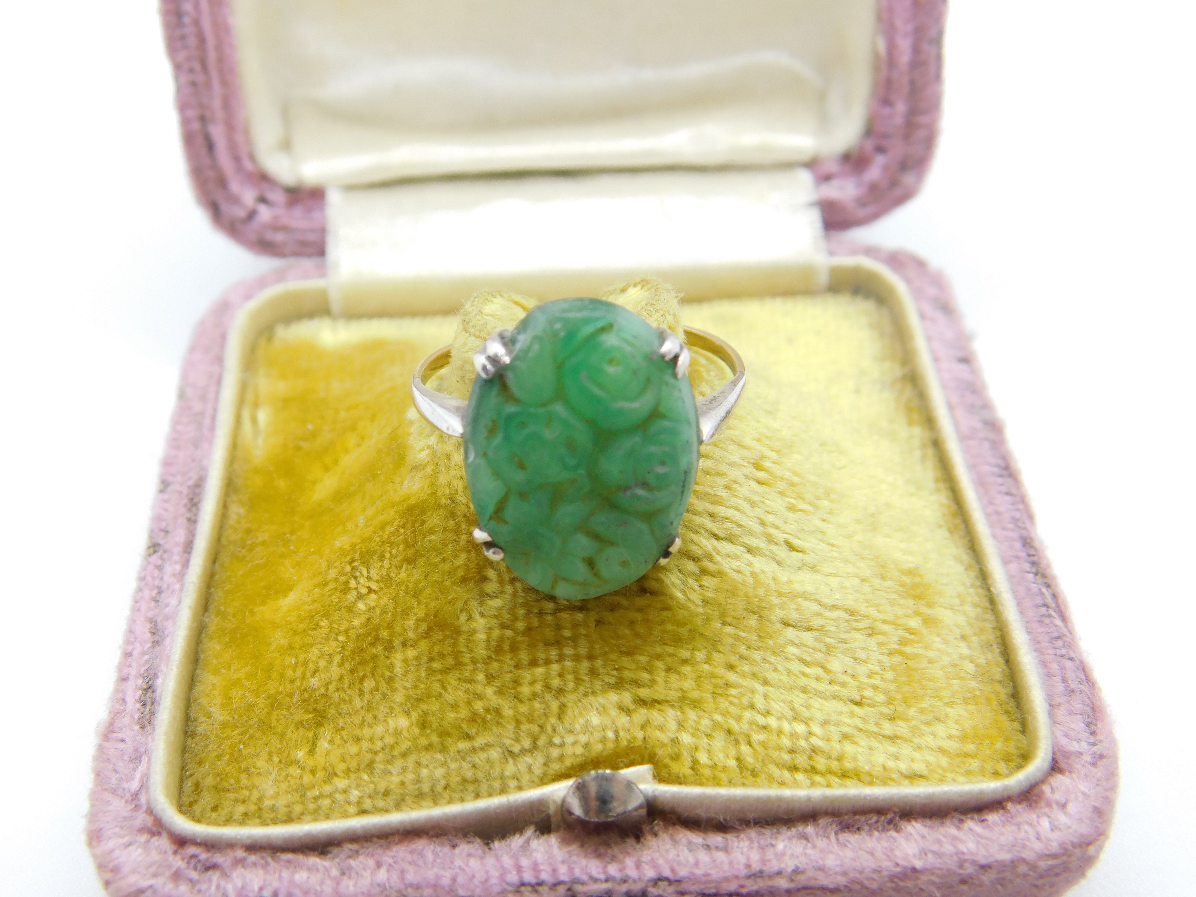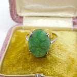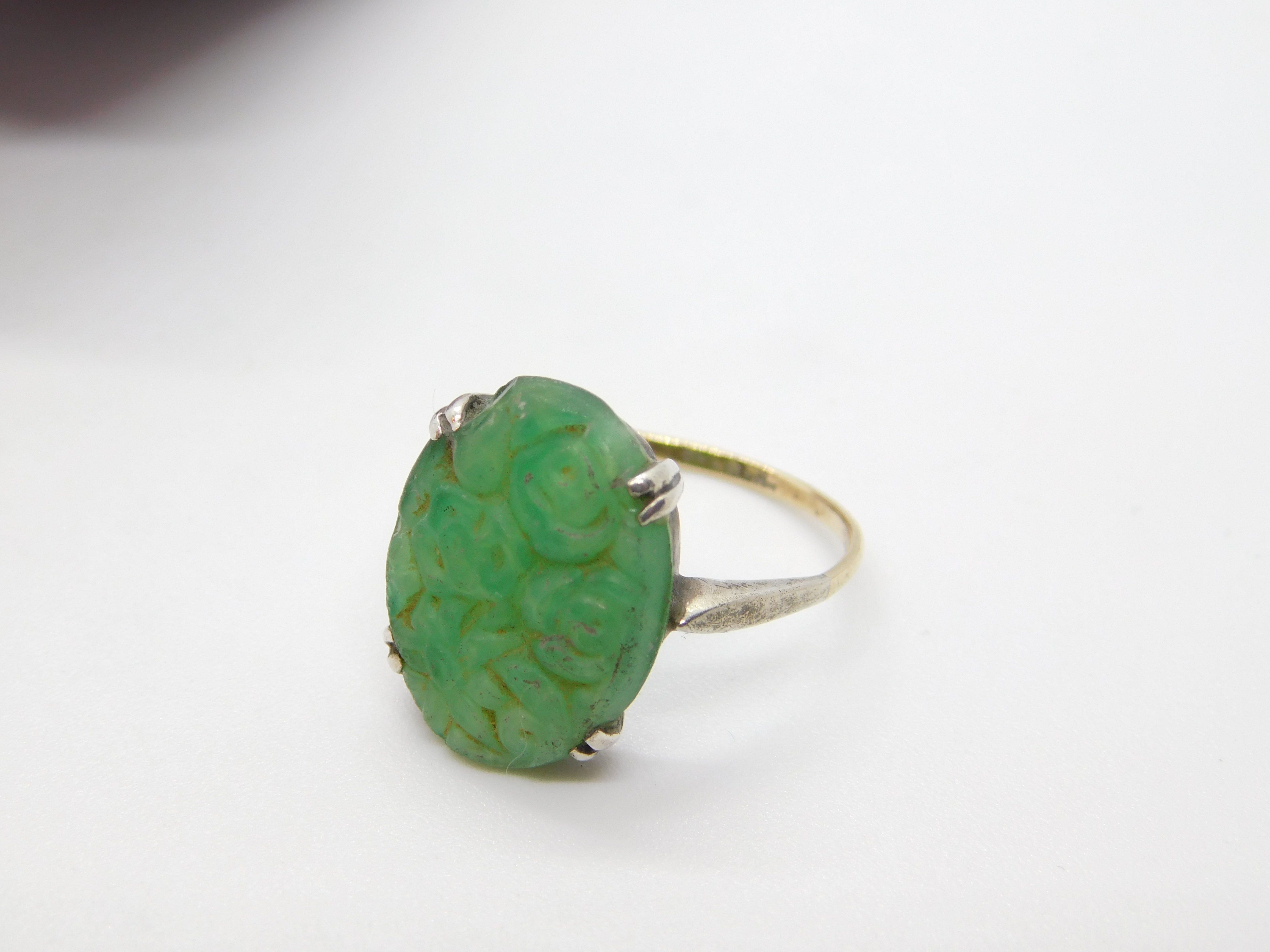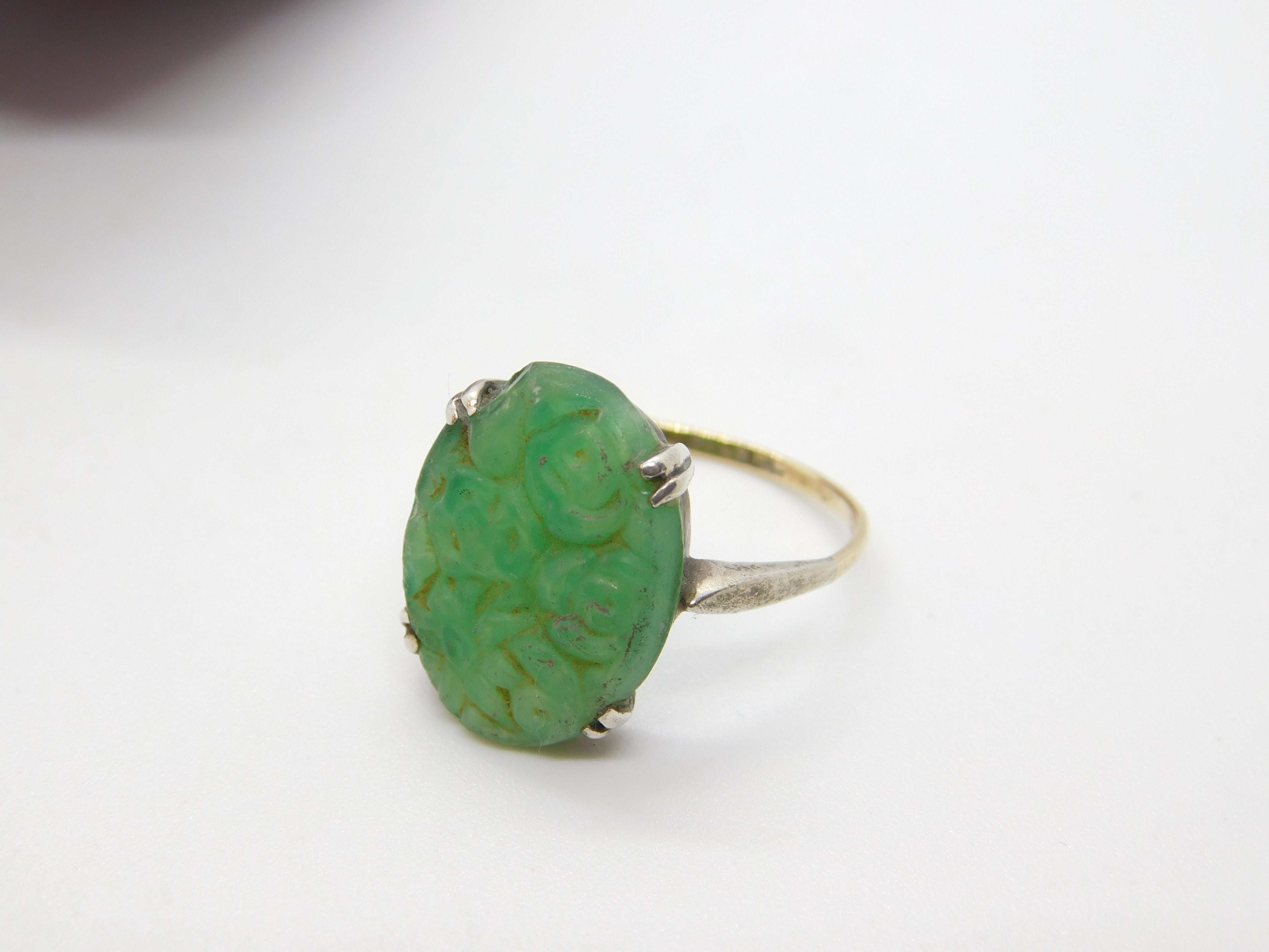 9ct Gold & Silver Set Carved Chrysanthemum Jade Ring Antique c1920 Deco