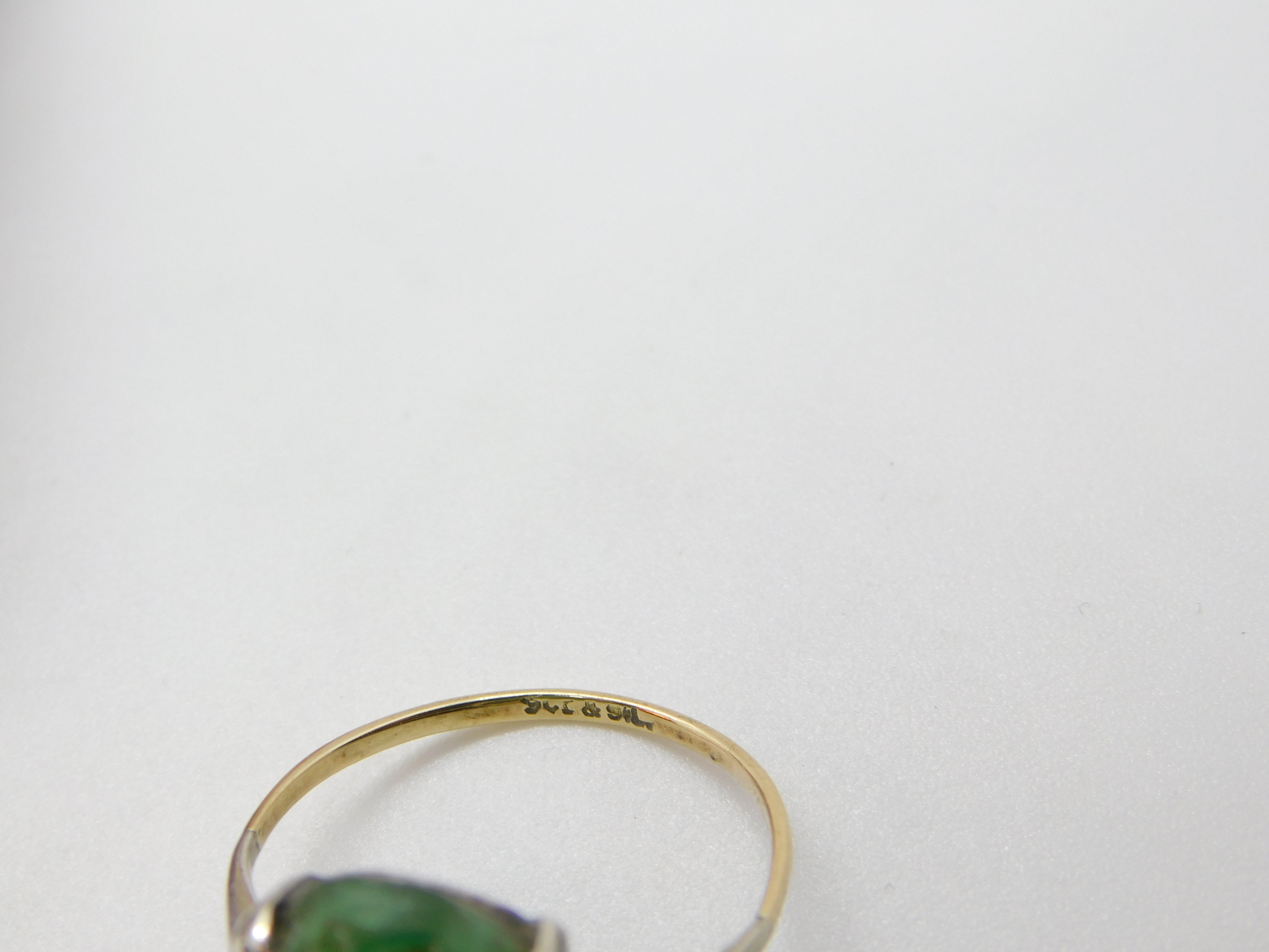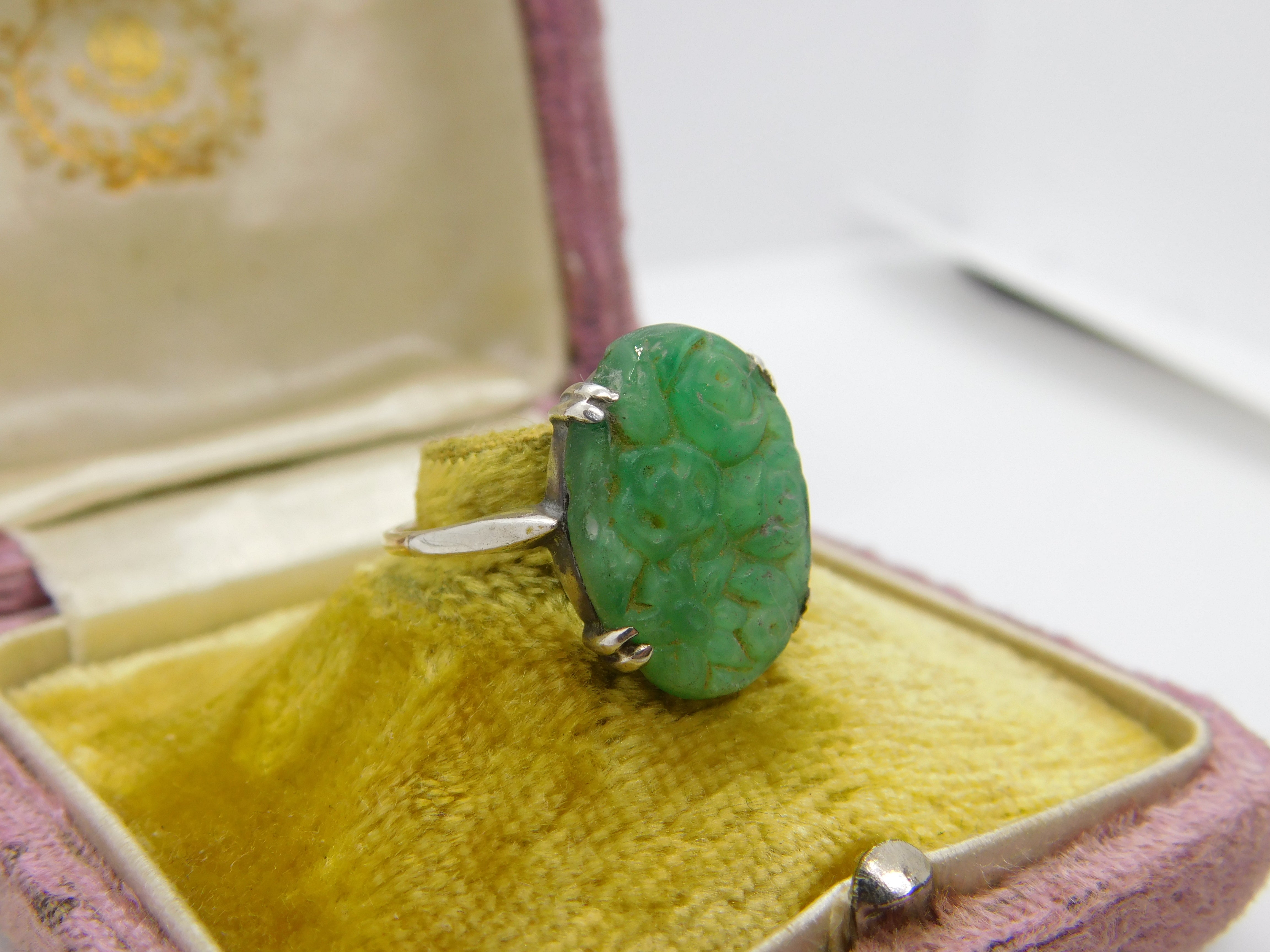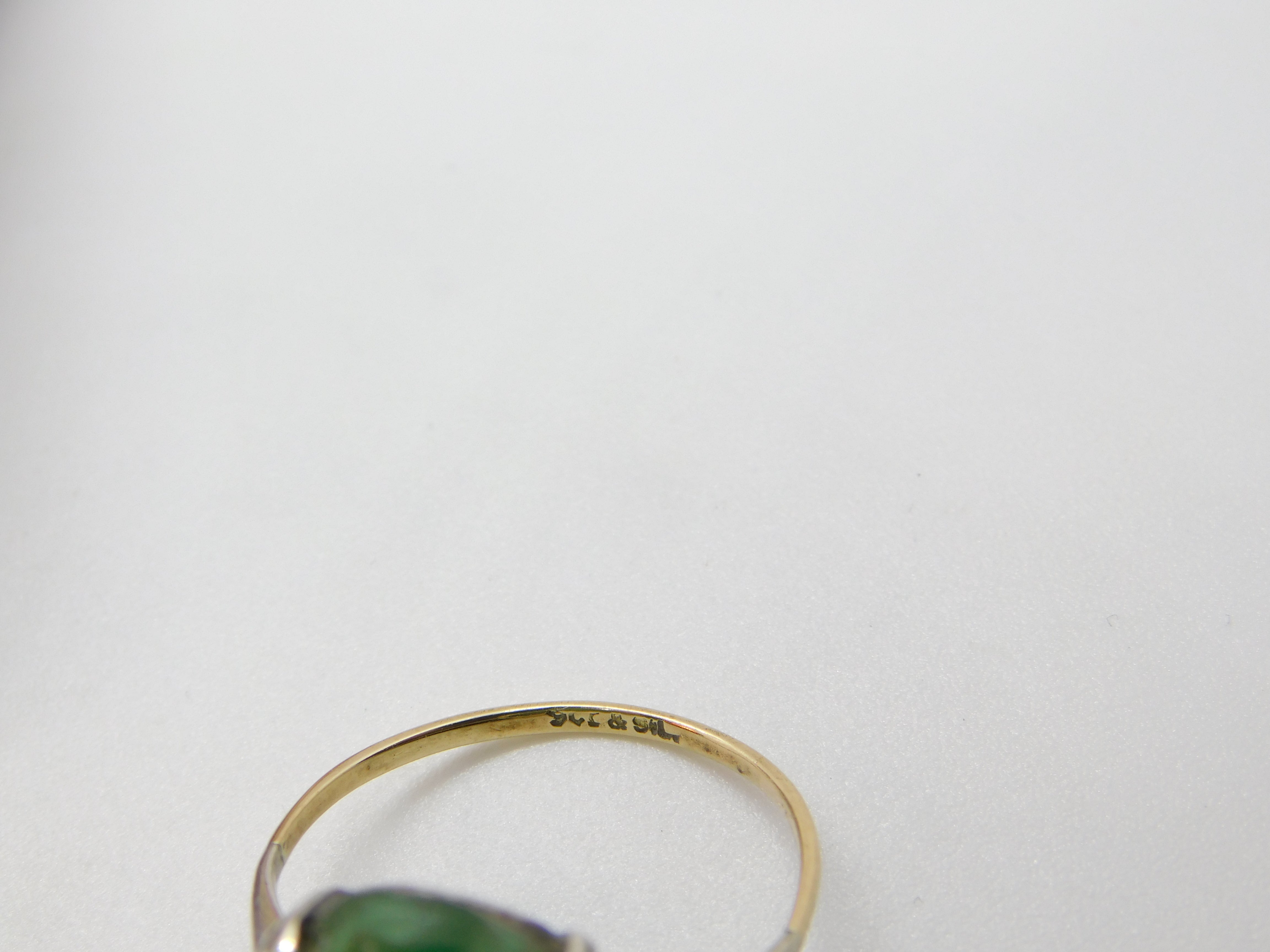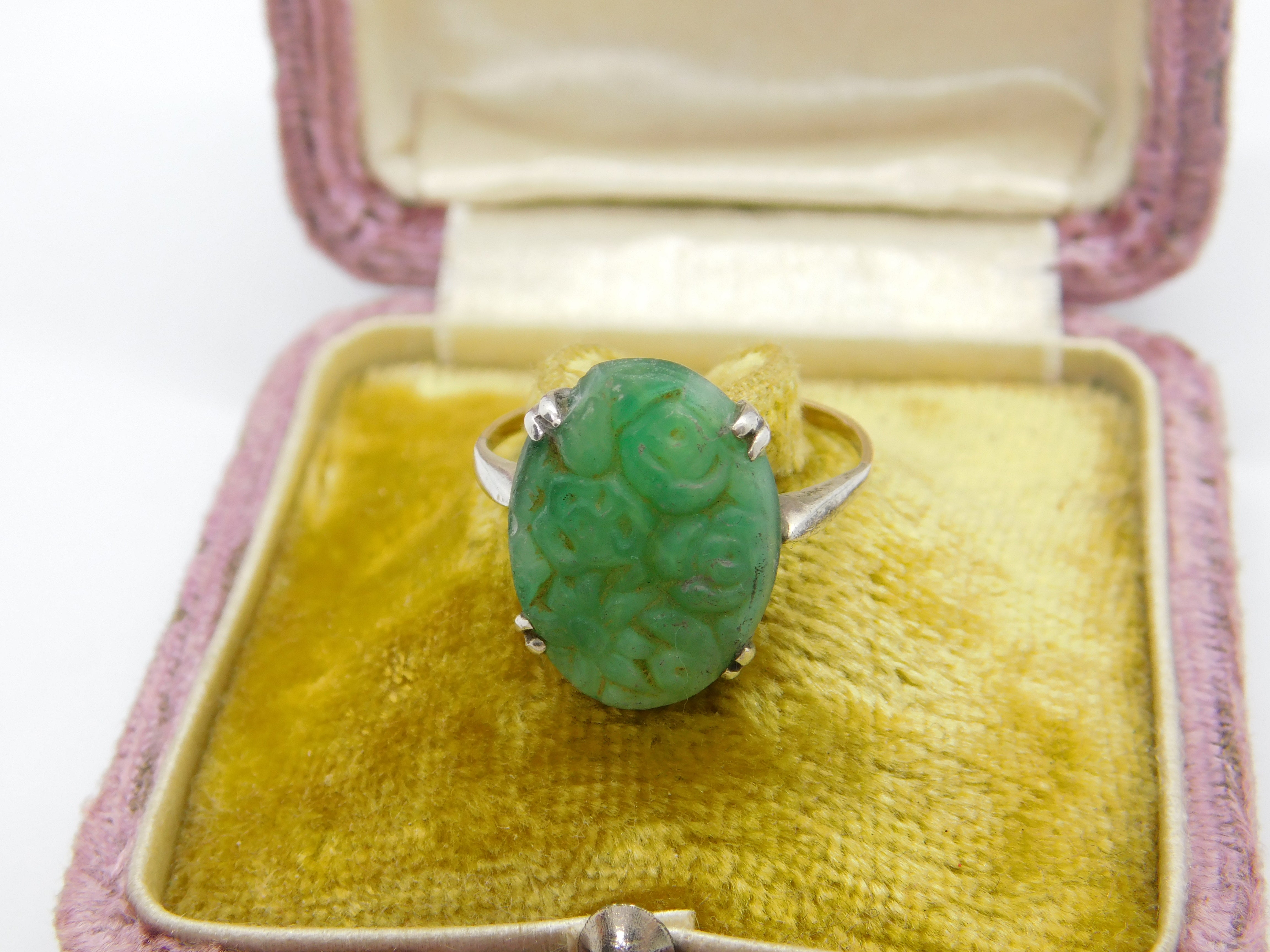 9ct Gold & Silver Set Carved Chrysanthemum Jade Ring Antique c1920 Deco