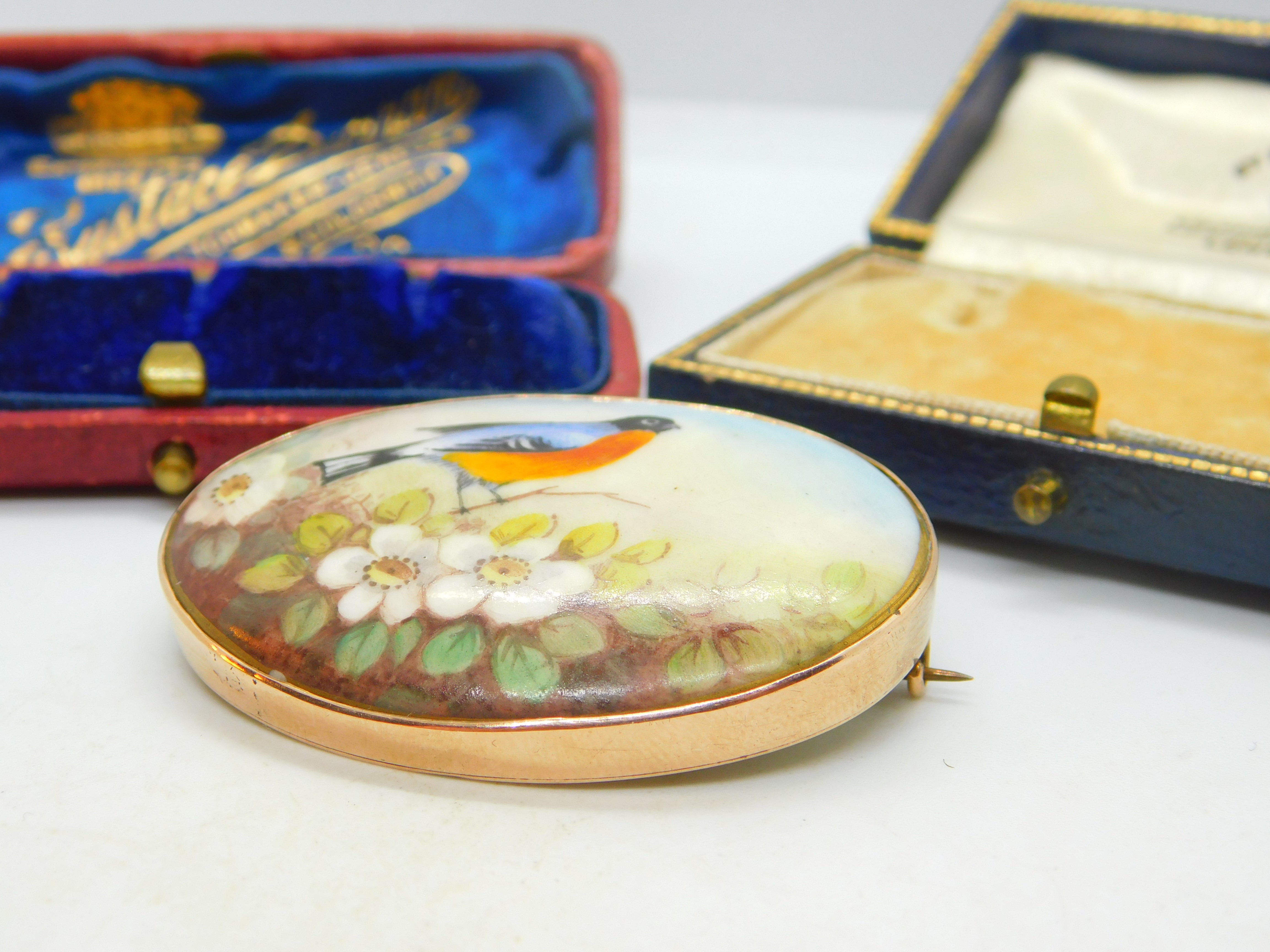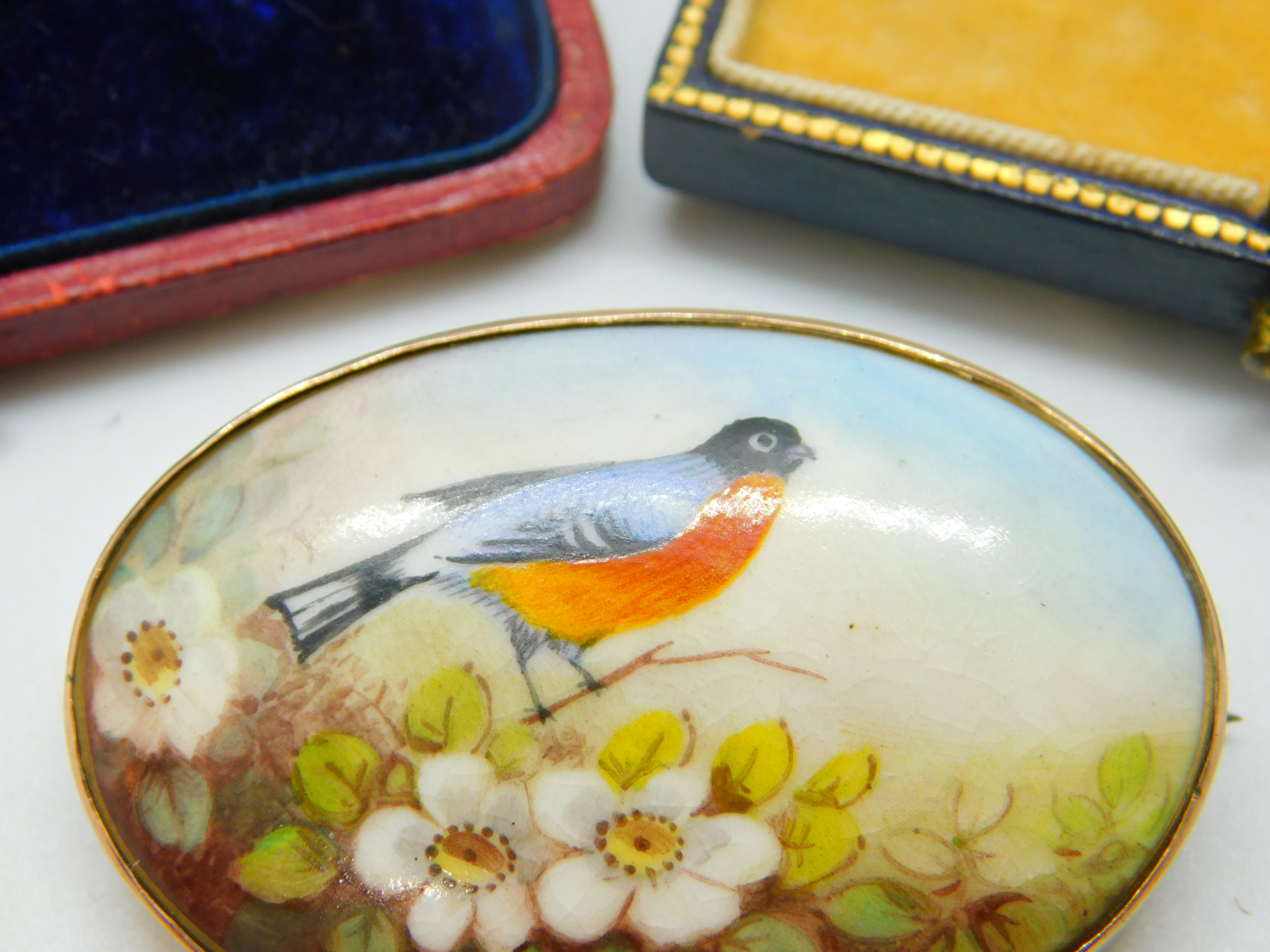 9ct Rose Gold Crown Staffordshire Painted Bird Brooch Antique c1920 Art Deco