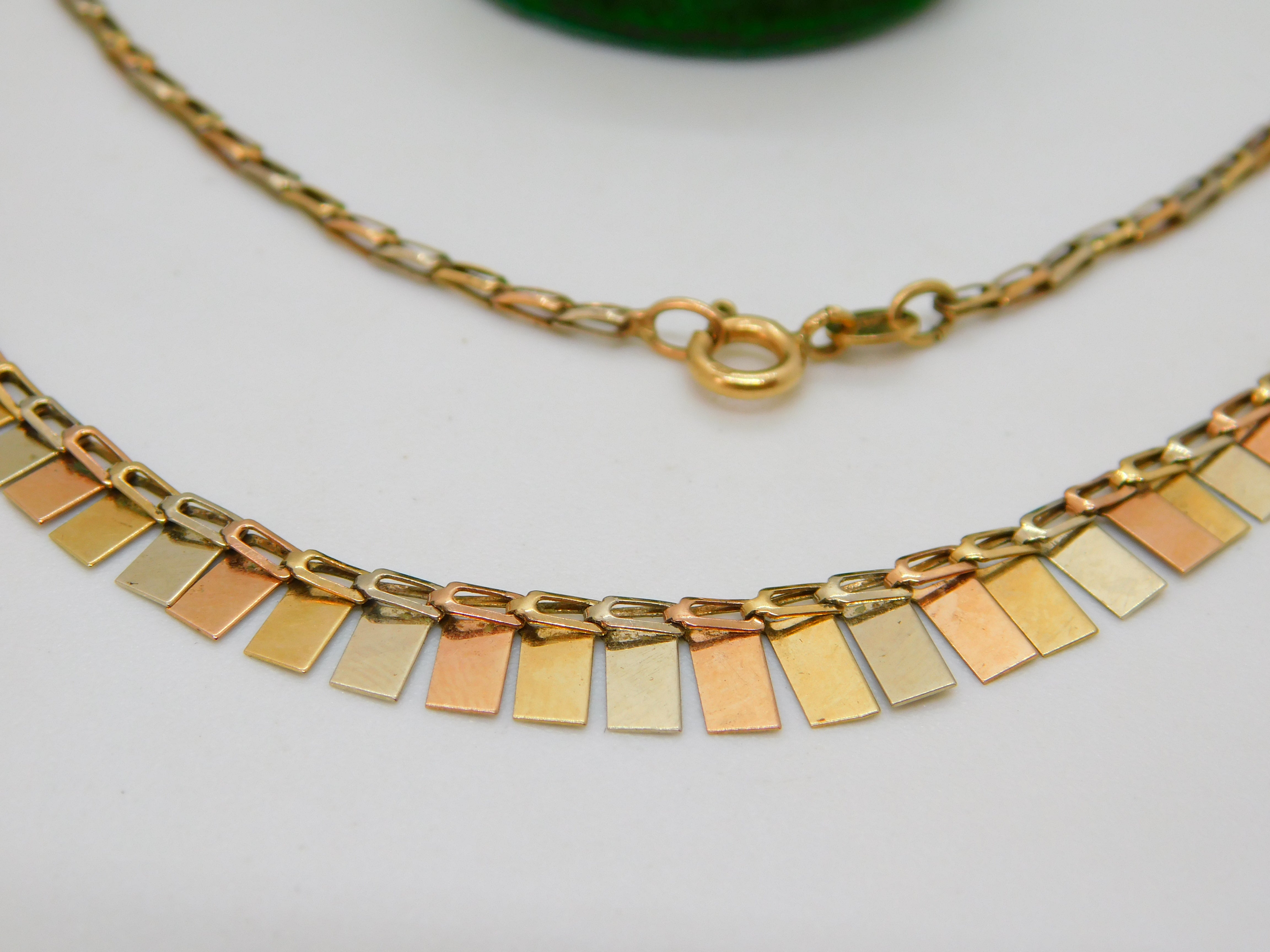 Details: A fantastic and wonderfully designed vintage 9ct tri-colour gold shimmering dress necklace with lovely detailing hallmarked London 1994 to the bale. This is a wonderful item that would make a perfect gift or addition to any collection. The BOX pictured is for PRESENTATION ONLY and is NOT included in the listings but used to frame the pictures unless specifically stated otherwise.