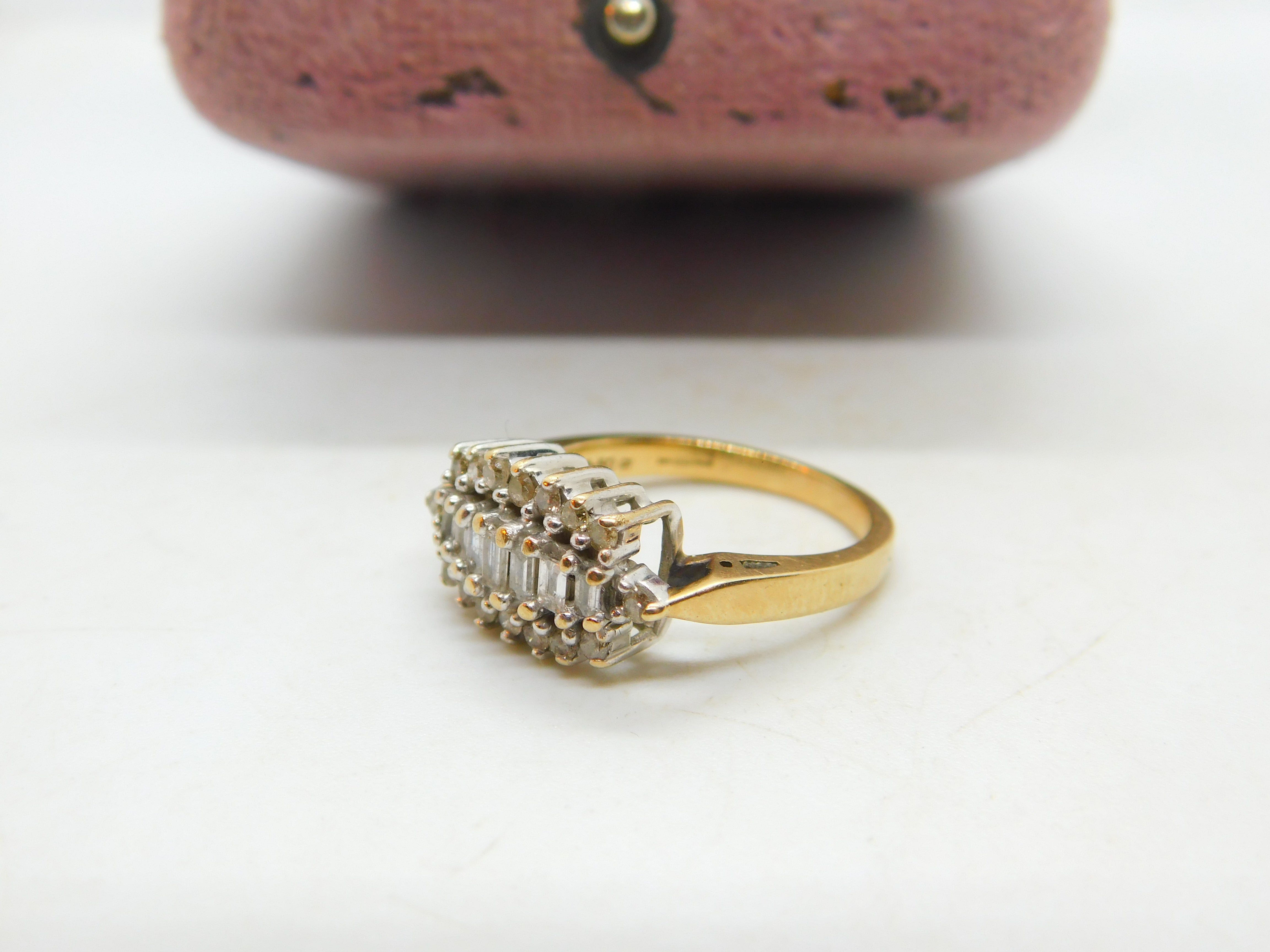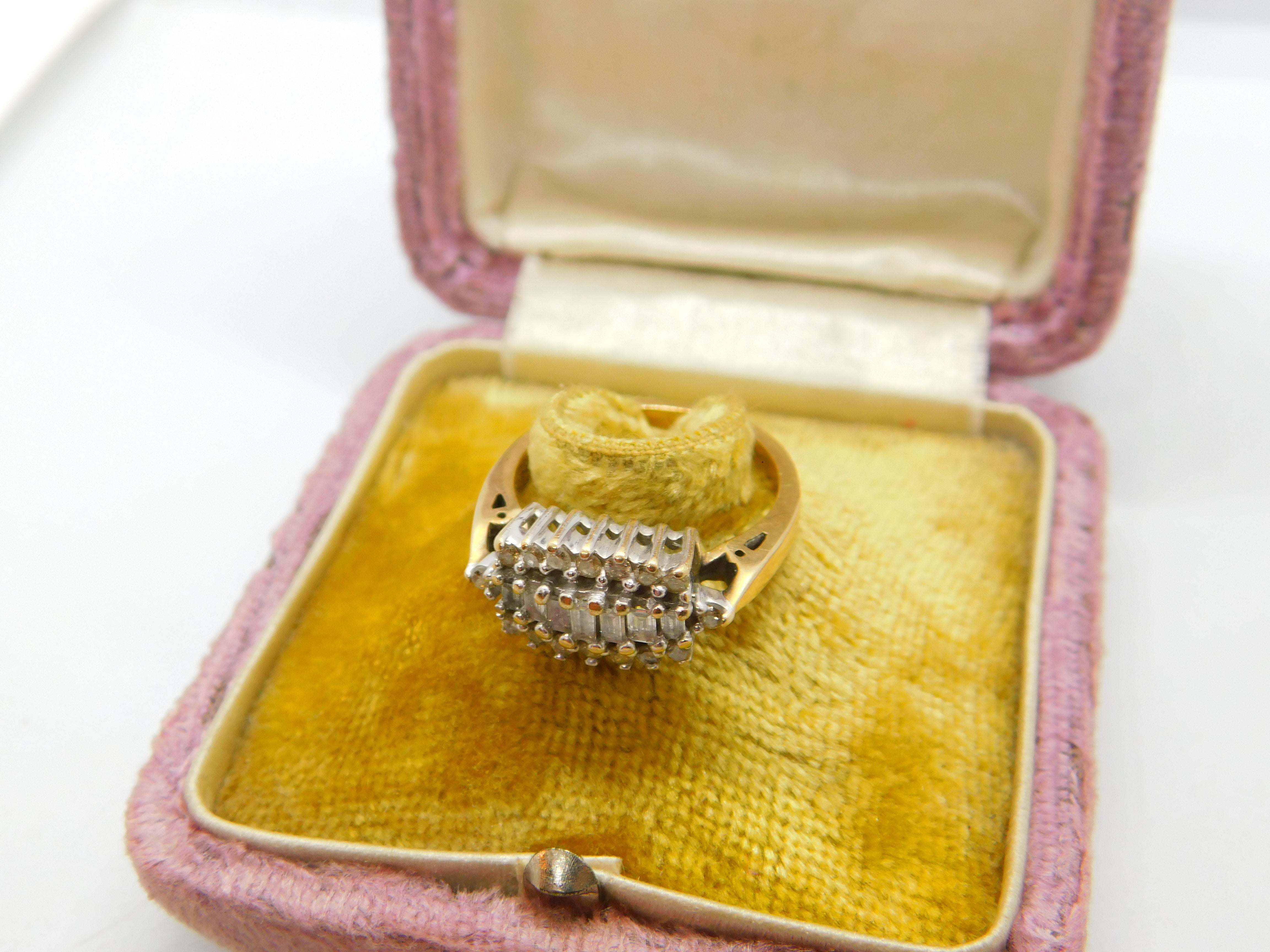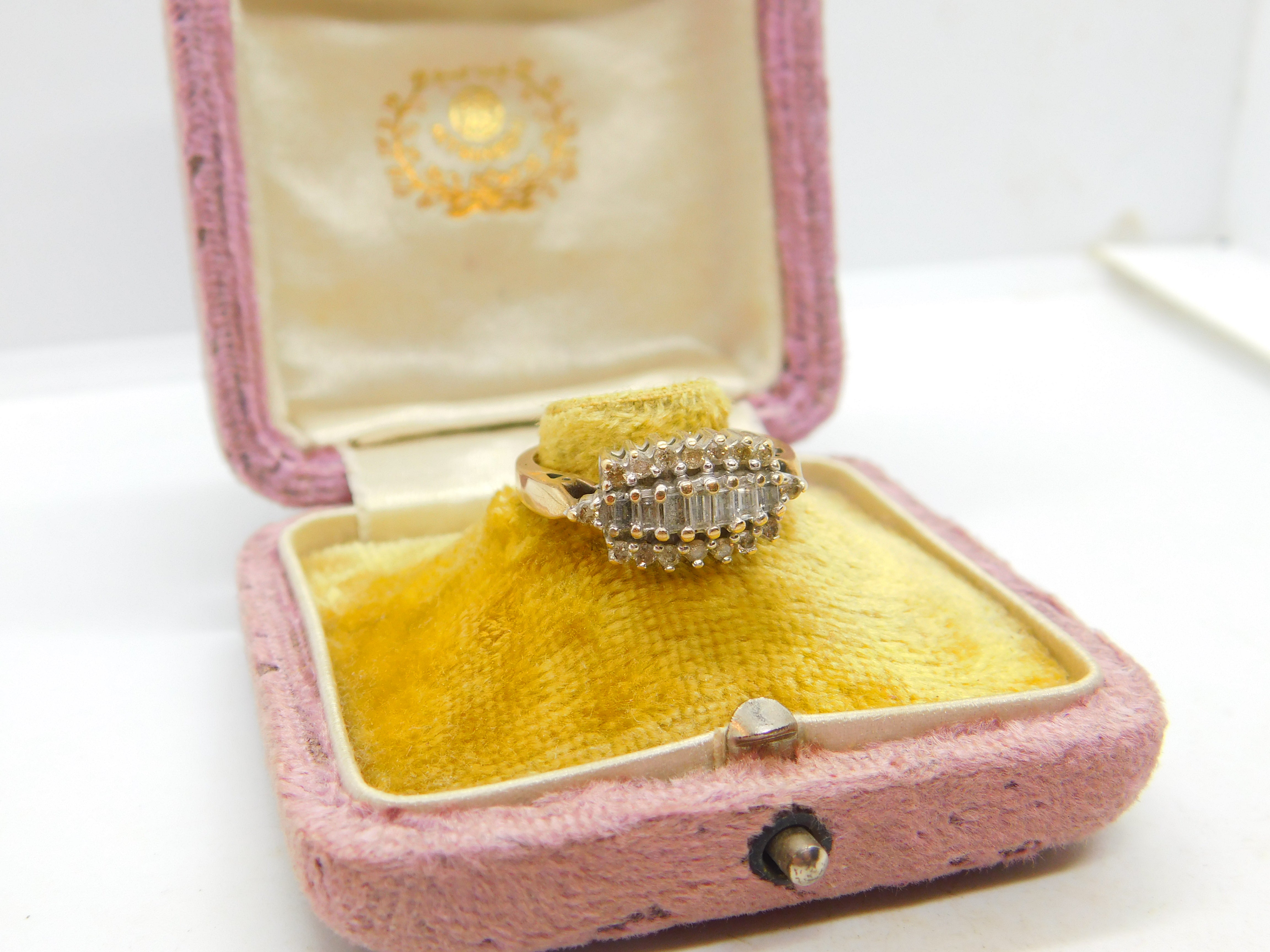 Details: A fantastic and wonderfully designed vintage 9ct yellow gold modernist band ring set with 0.5ct of baguette cut natural diamonds hallmarked Birmingham c1980 along with a 0.5ct mark. The stones have been tested. This is a wonderful item that would make a perfect gift or addition to any collection. The BOX pictured is for PRESENTATION ONLY and is NOT included in the listings but used to frame the pictures unless specifically stated otherwise.