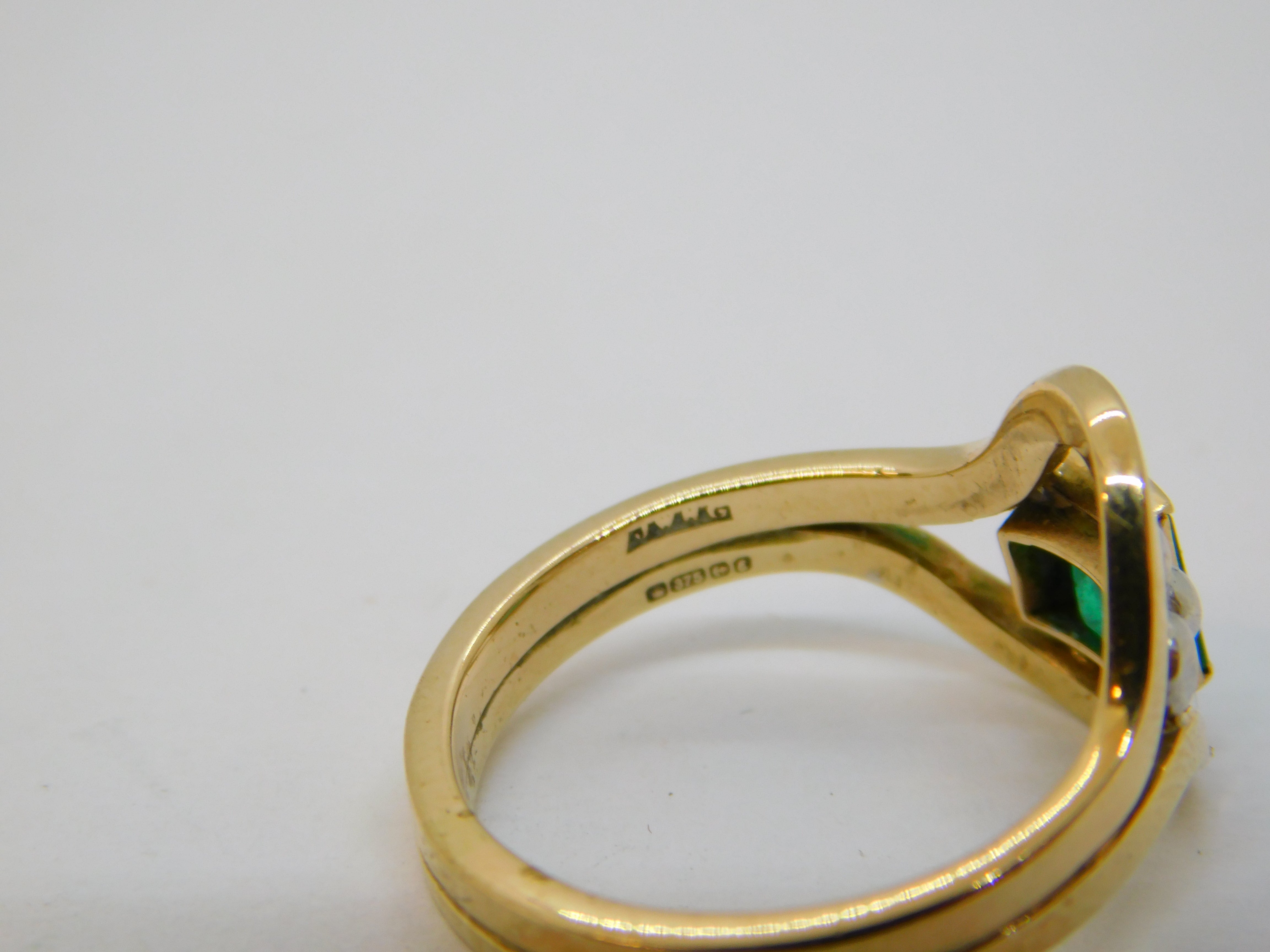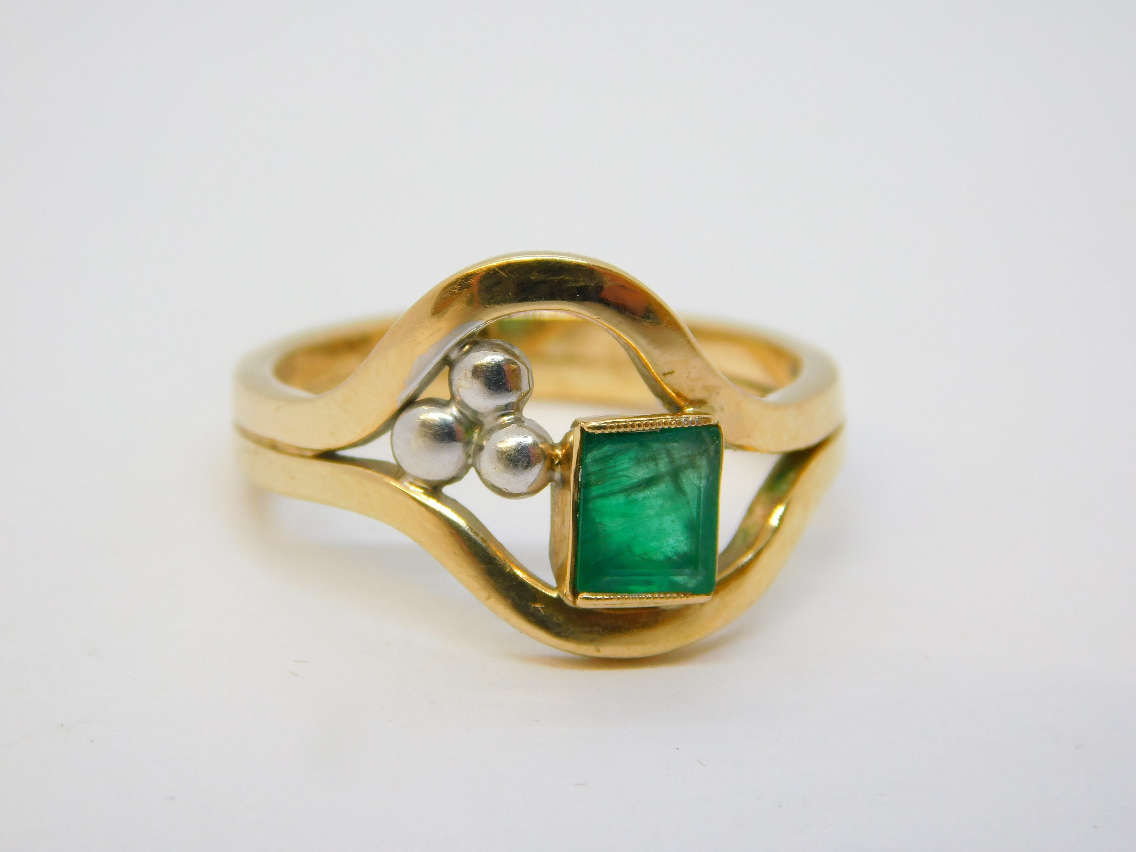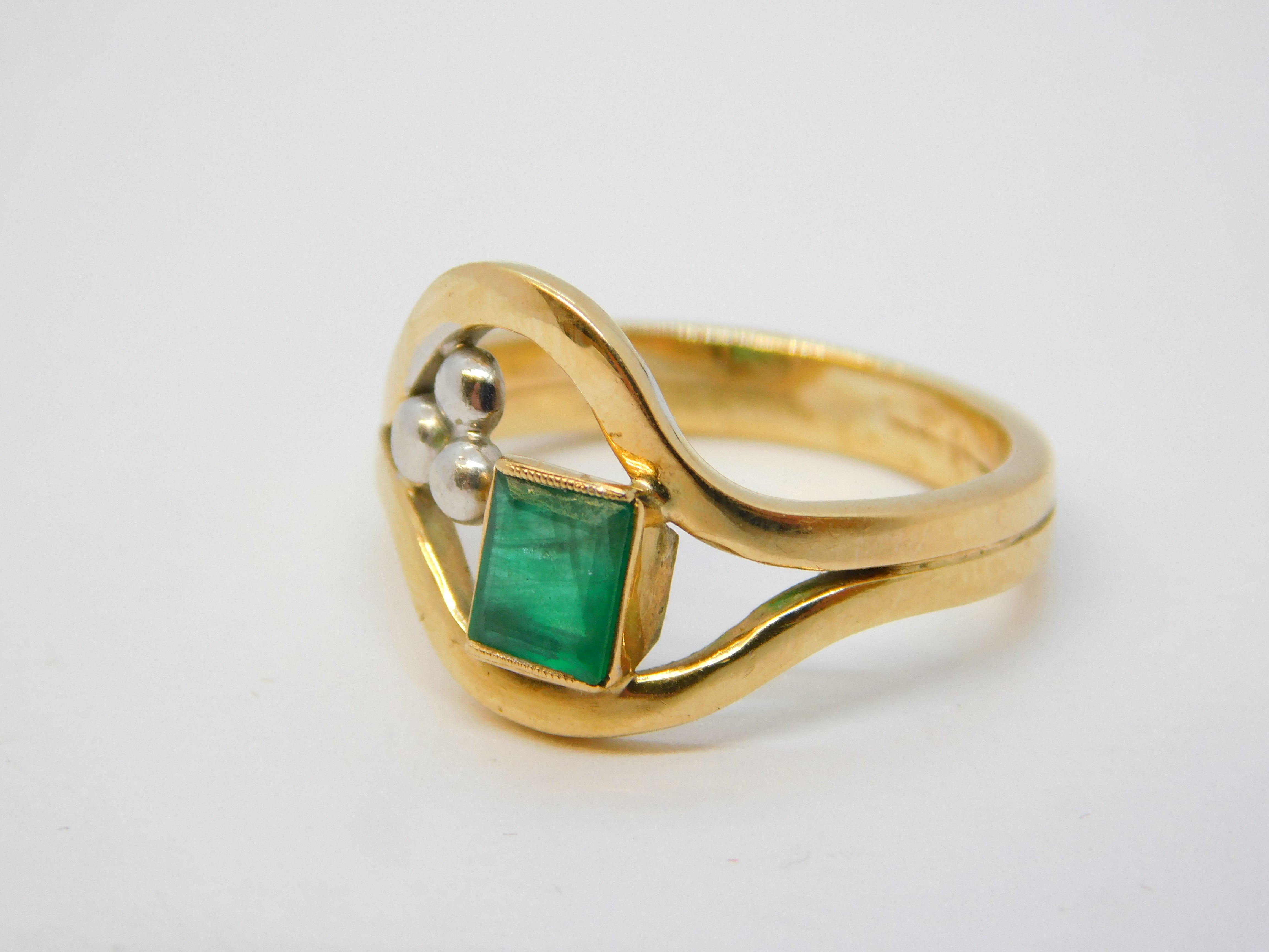 Details: A fantastic and wonderfully designed vintage 9ct yellow gold modernist double-banded dress ring set with a beautifully coloured 0.5ct emerald, likely Columbian, hallmarked Birmingham 1979 to the interior, the stone has been tested. This is a wonderful item that would make a perfect gift or addition to any collection.