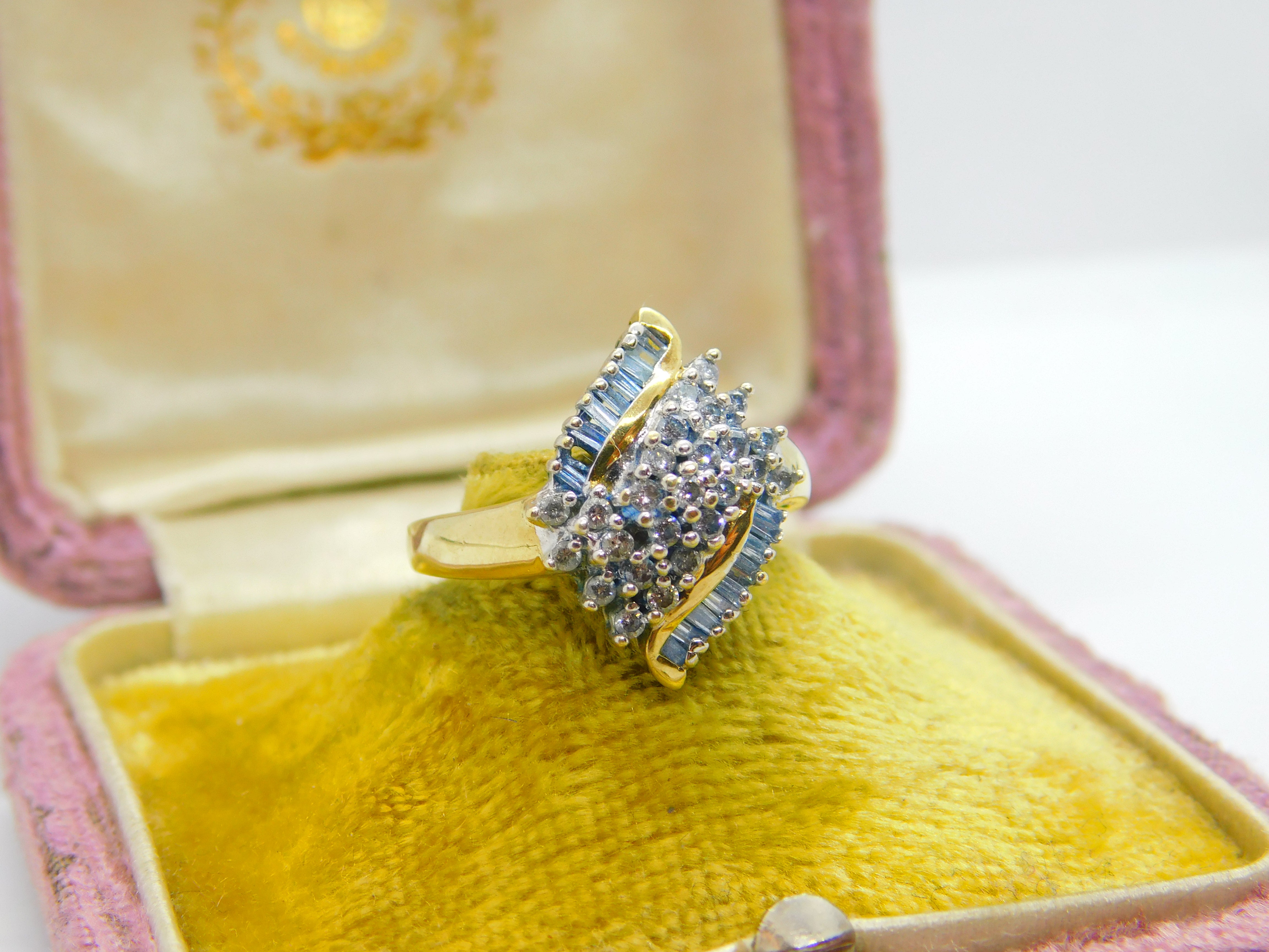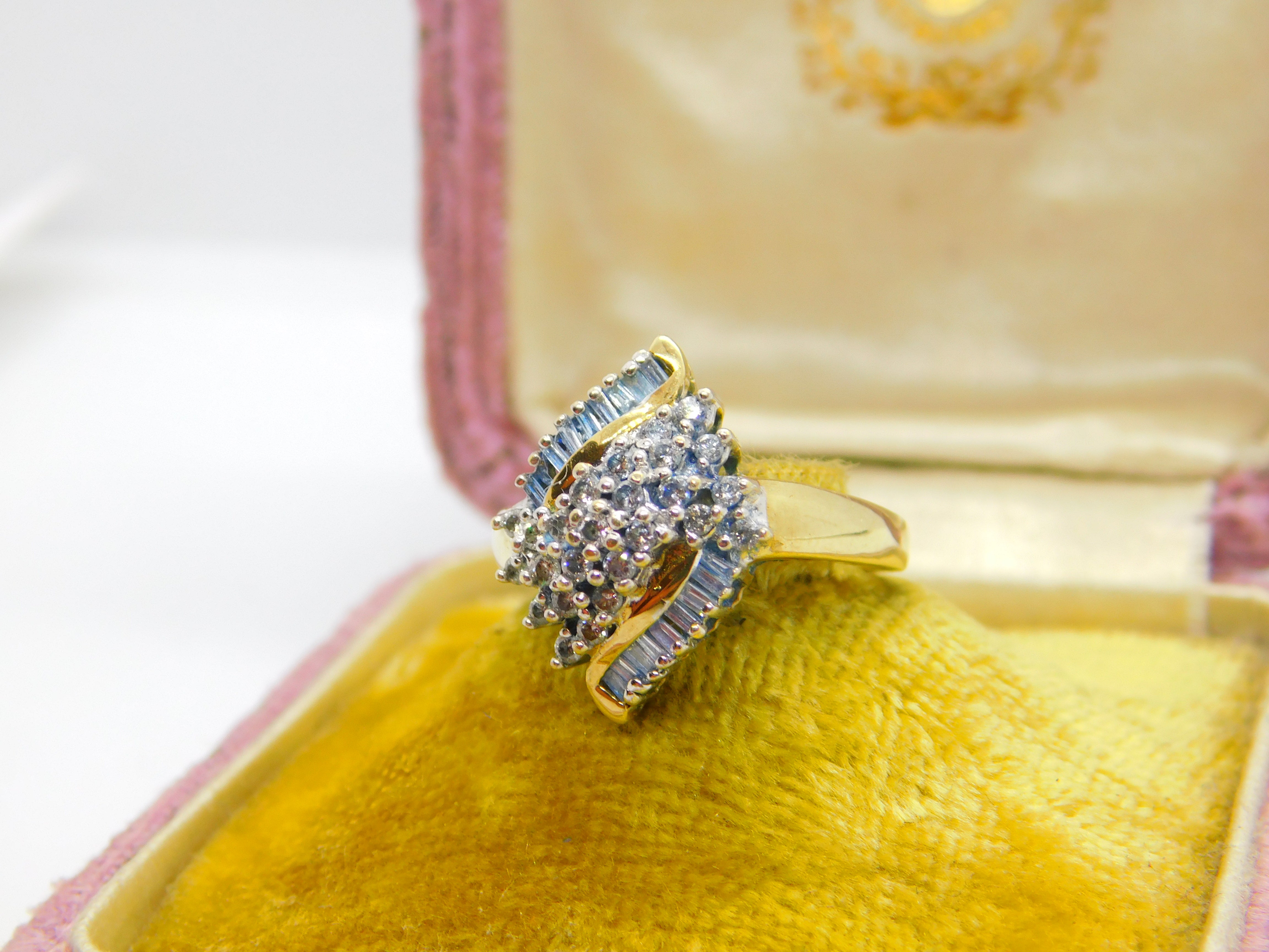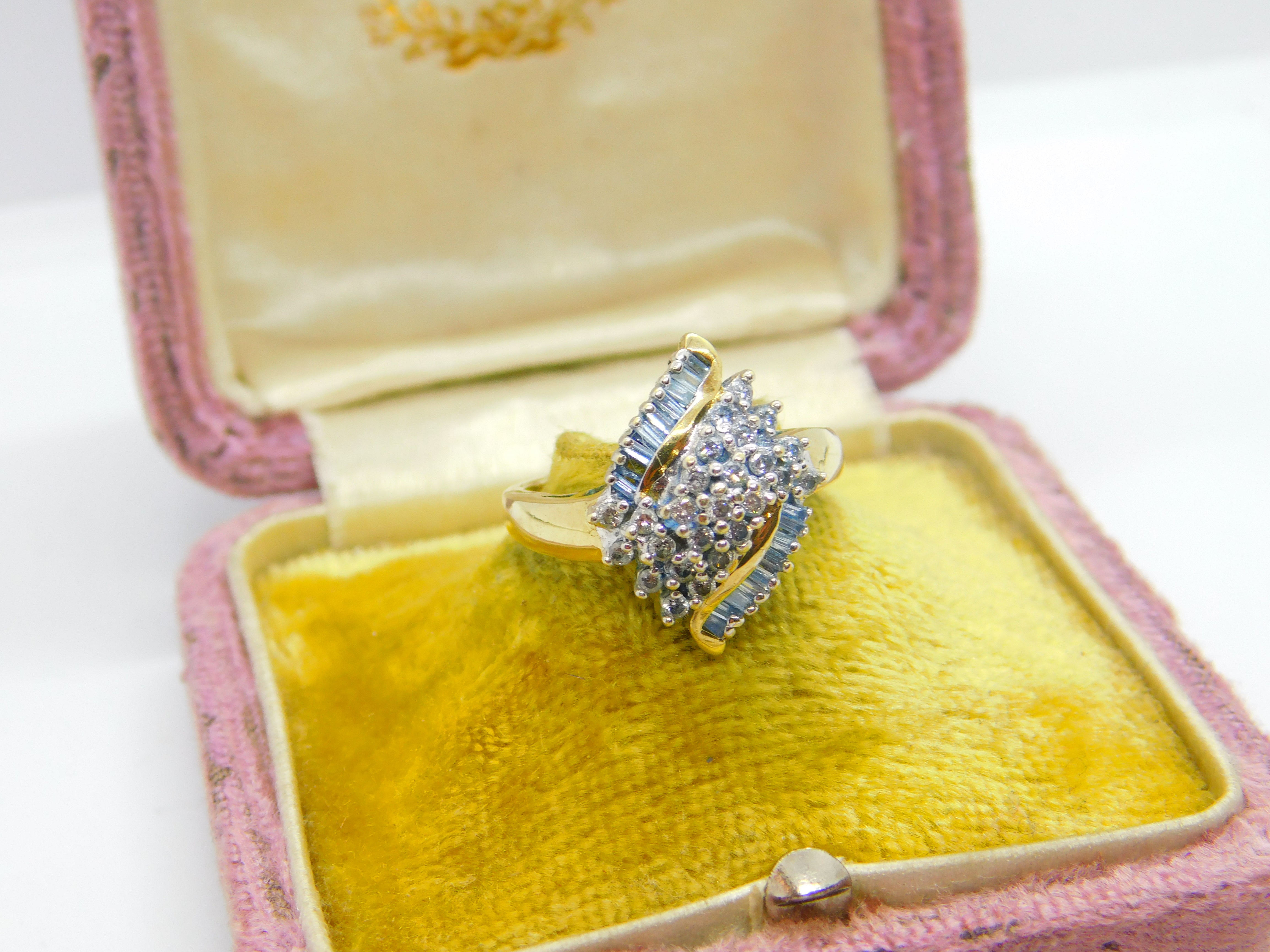 Details: A fantastic and wonderfully designed vintage 9ct yellow gold modernist cluster ring set with both rose cut and baguette cut diamonds hallmarked Birmingham 2002 to the interior. All the stones test as diamonds - a large quantity unsure of exact carat weight. This is a wonderful item that would make a perfect gift or addition to any collection. The BOX pictured is for PRESENTATION ONLY and is NOT included in the listings but used to frame the pictures unless specifically stated otherwise.