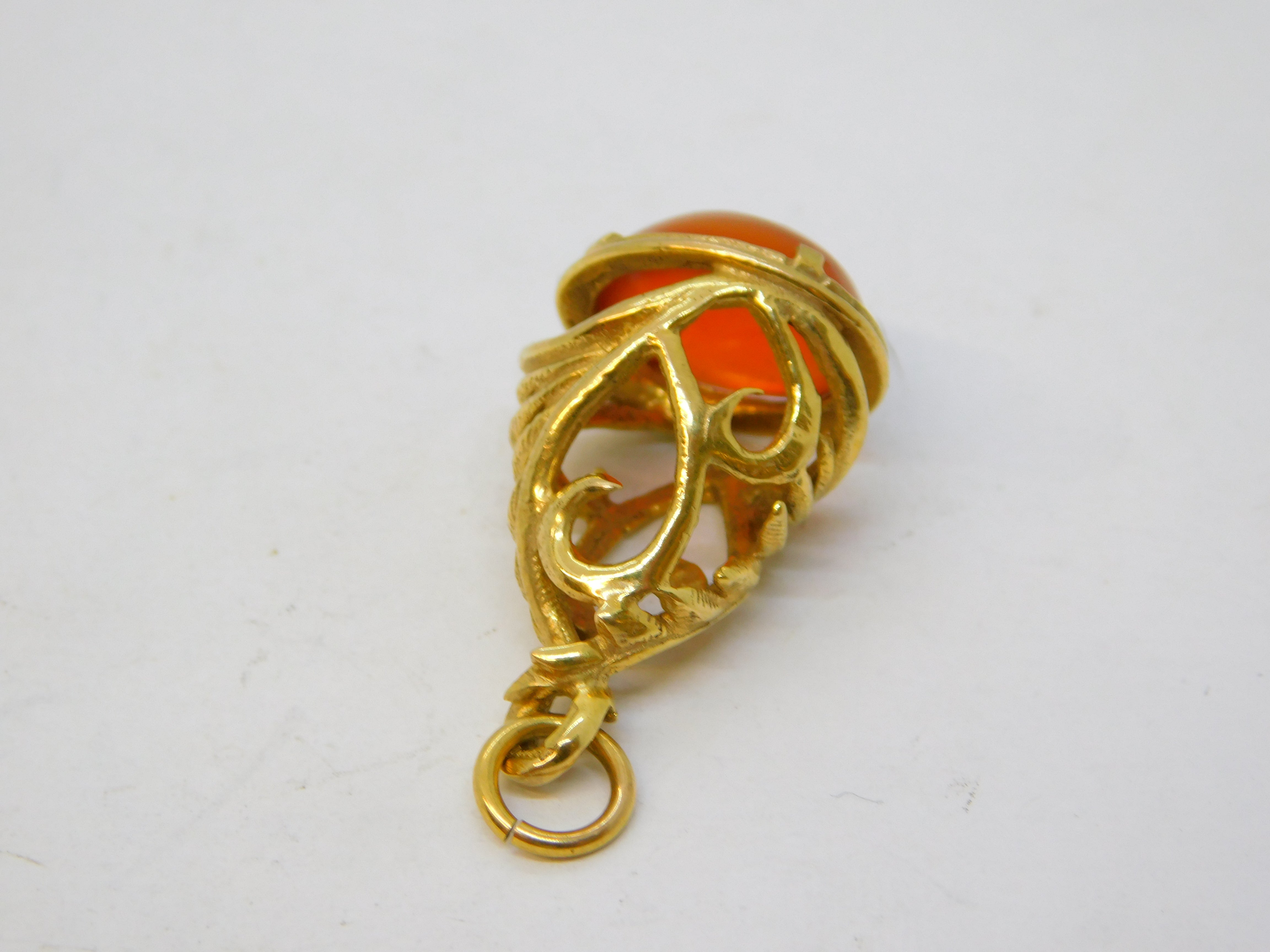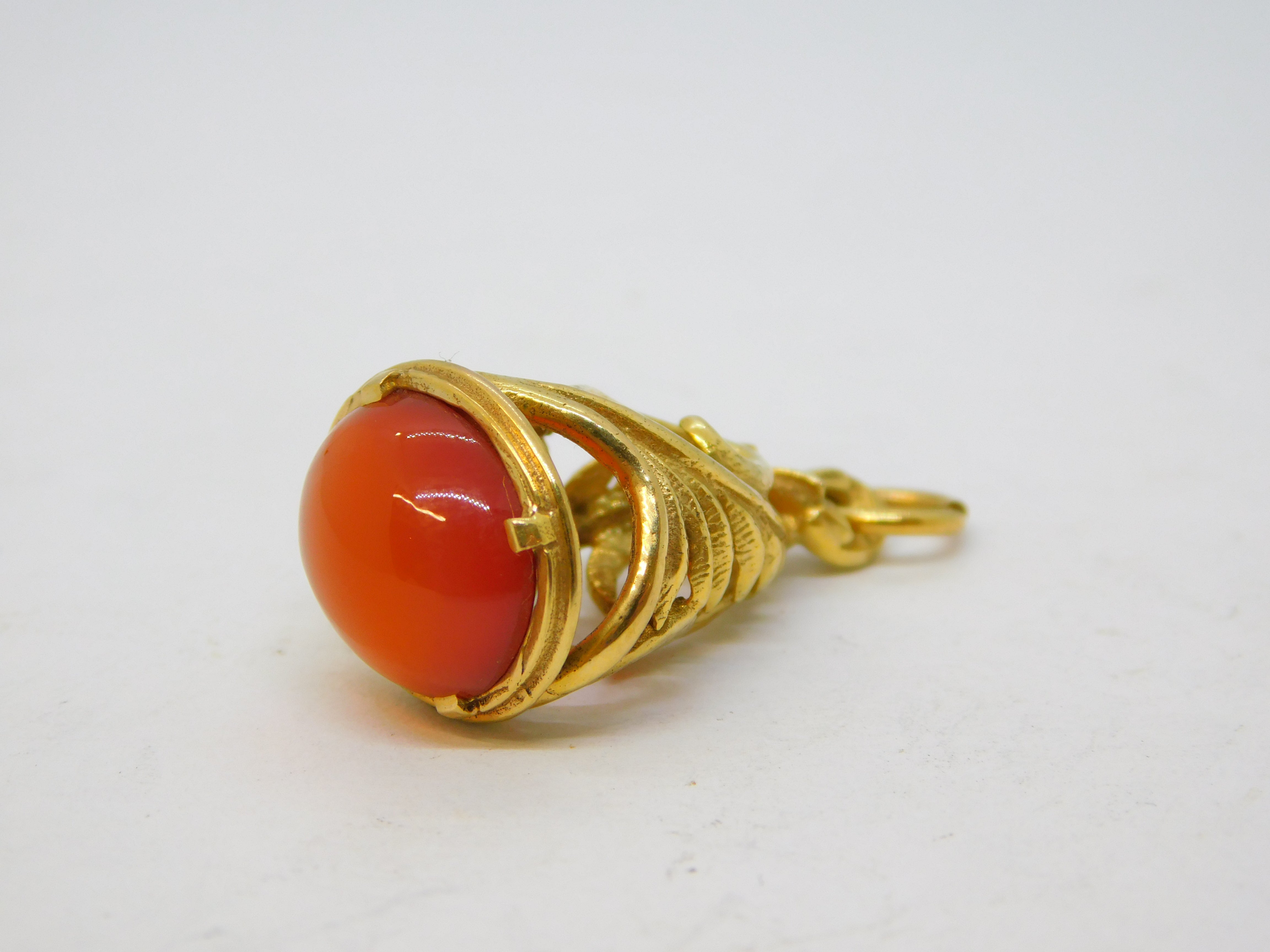 Details: A fantastic and wonderfully designed vintage 9ct yellow gold fob pendant set with cabochon cut carnelian agate stone hallmarked London 1983 to the bale. This is a wonderful item that would make a perfect gift or addition to any collection.