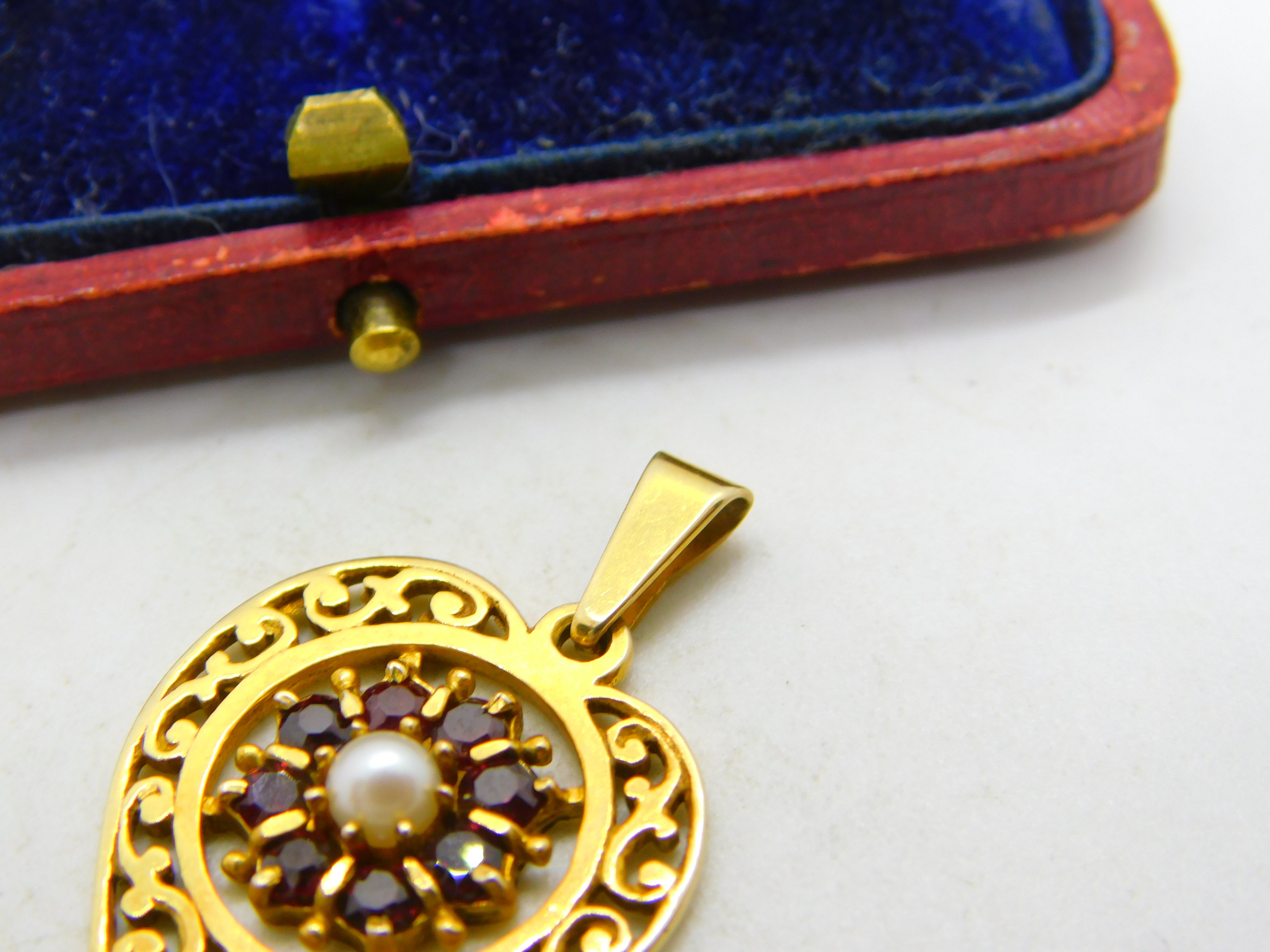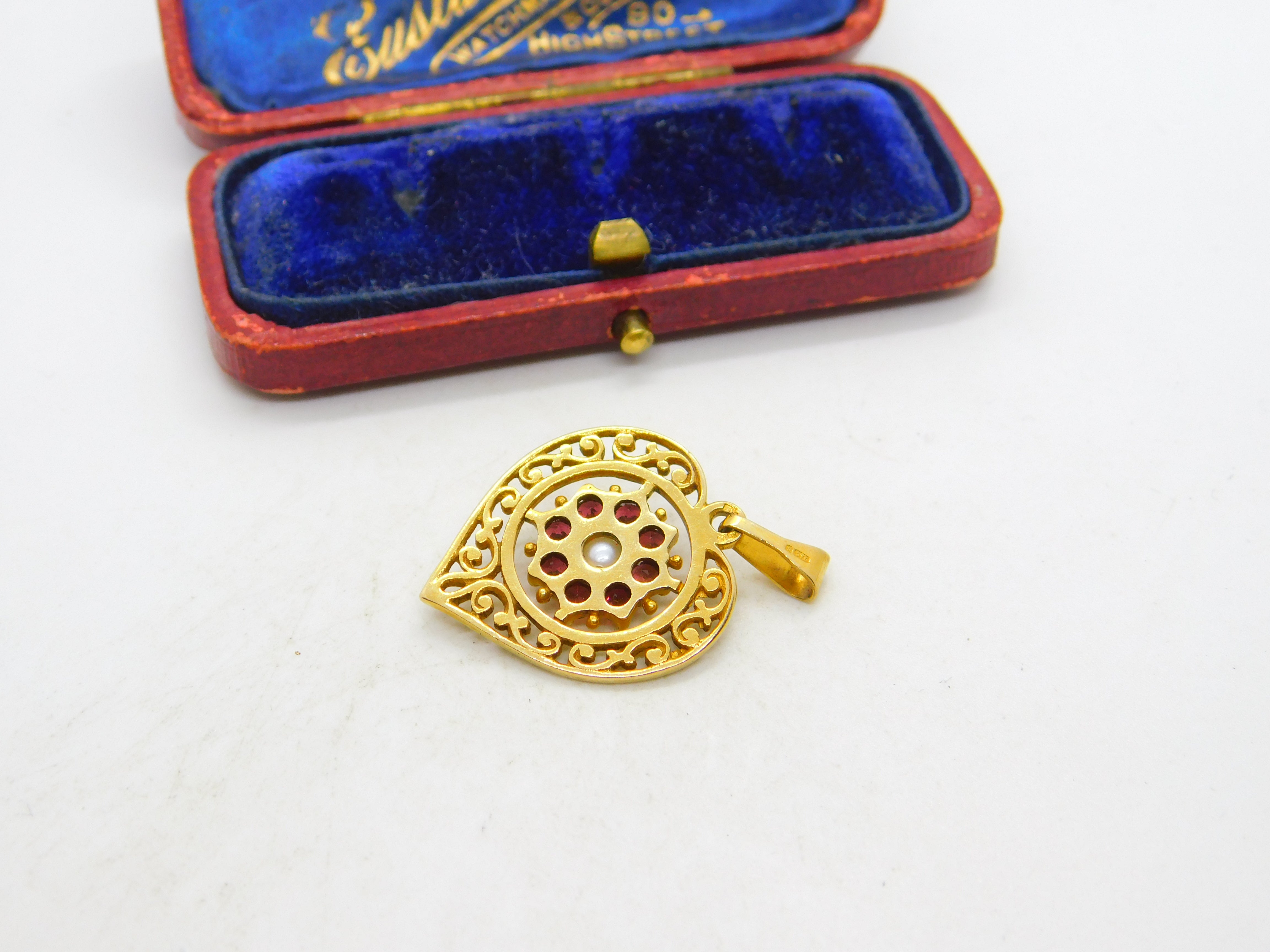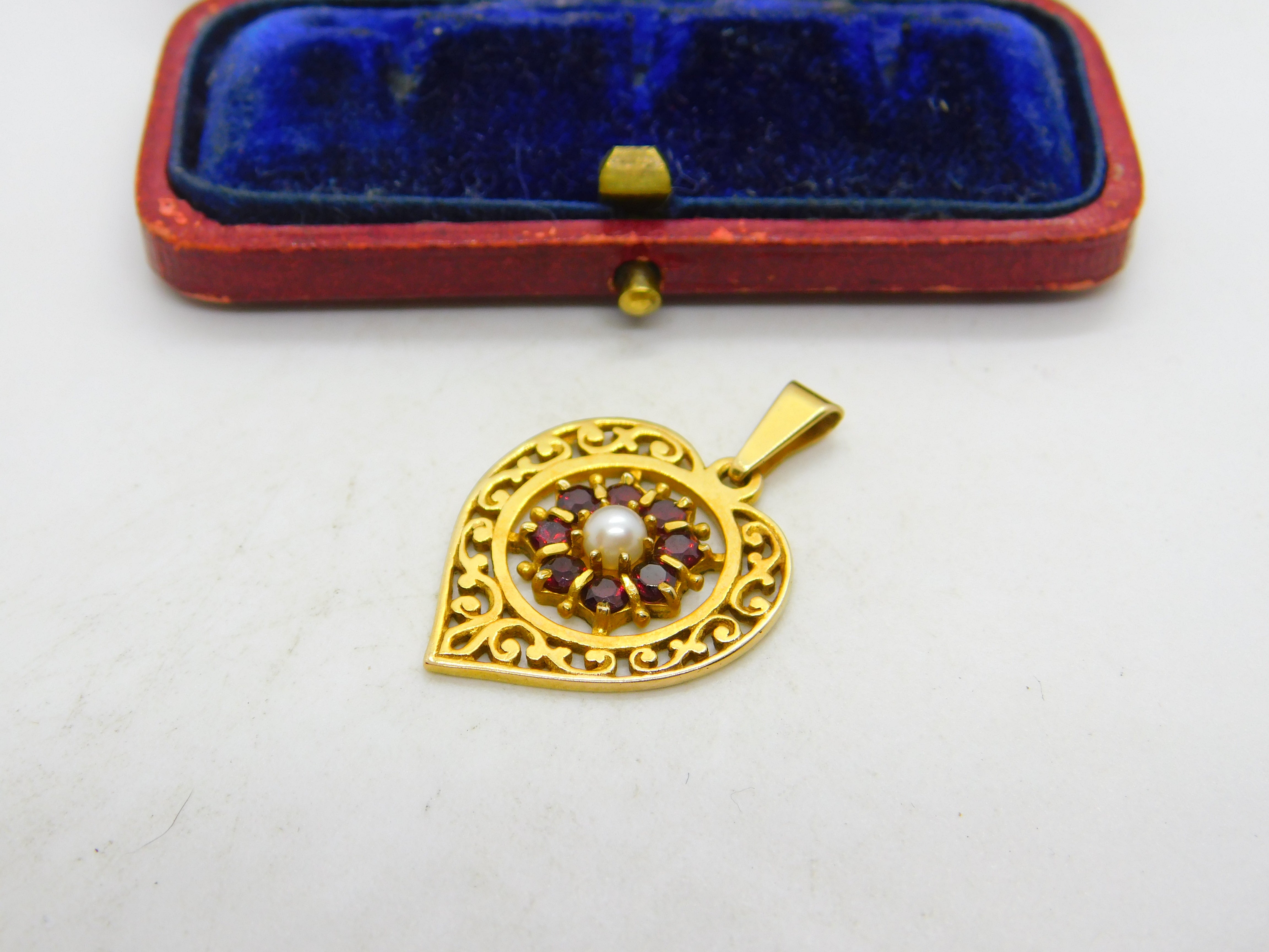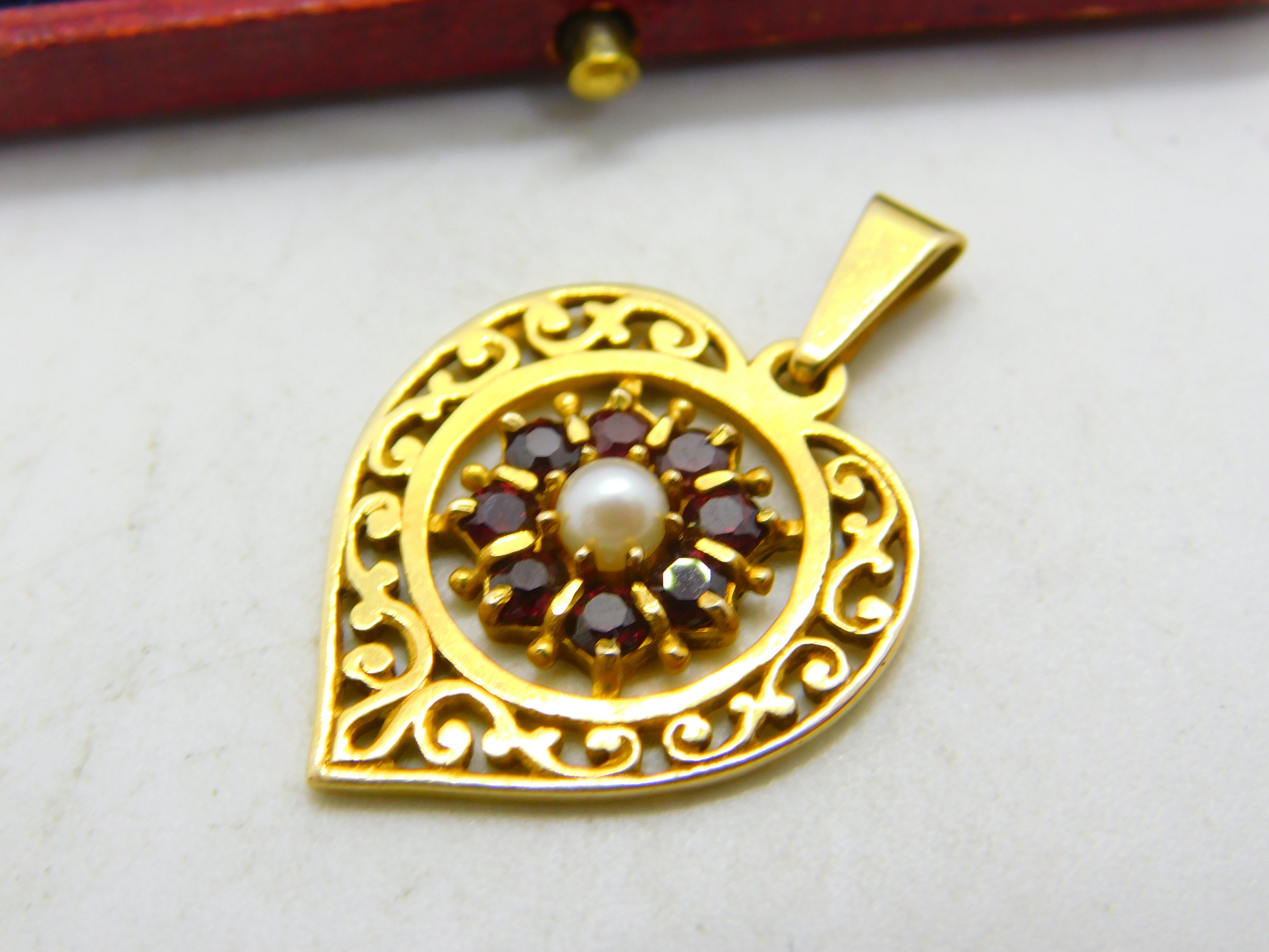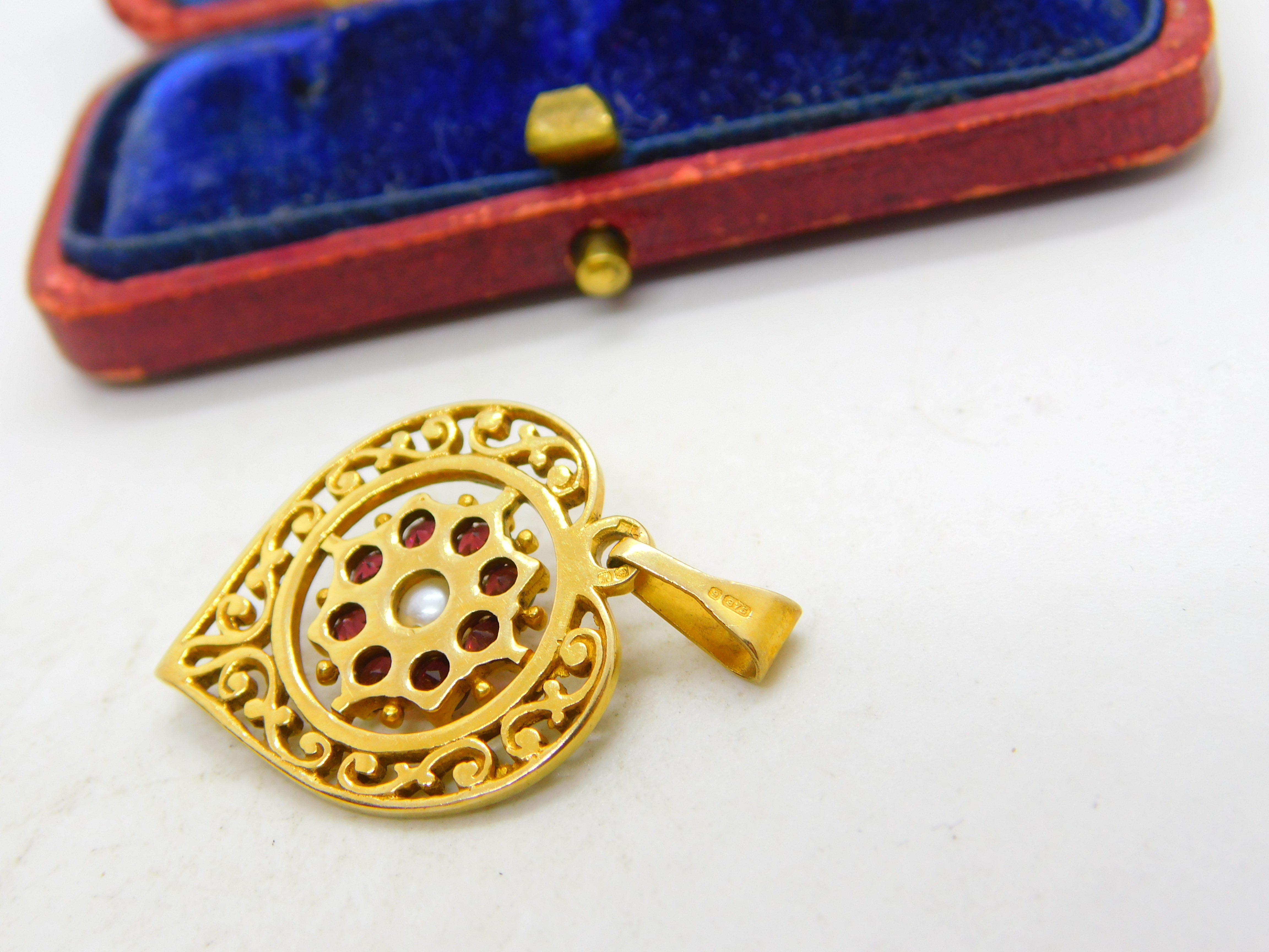 Details: A fantastic and wonderfully designed vintage 9ct yellow gold, garnet and pearl set heart drop pendant hallmarked to the bale c1970. This is a wonderful item that would make a perfect gift or addition to any collection. The BOX pictured is for PRESENTATION ONLY and is NOT included in the listings but used to frame the pictures unless specifically stated otherwise.