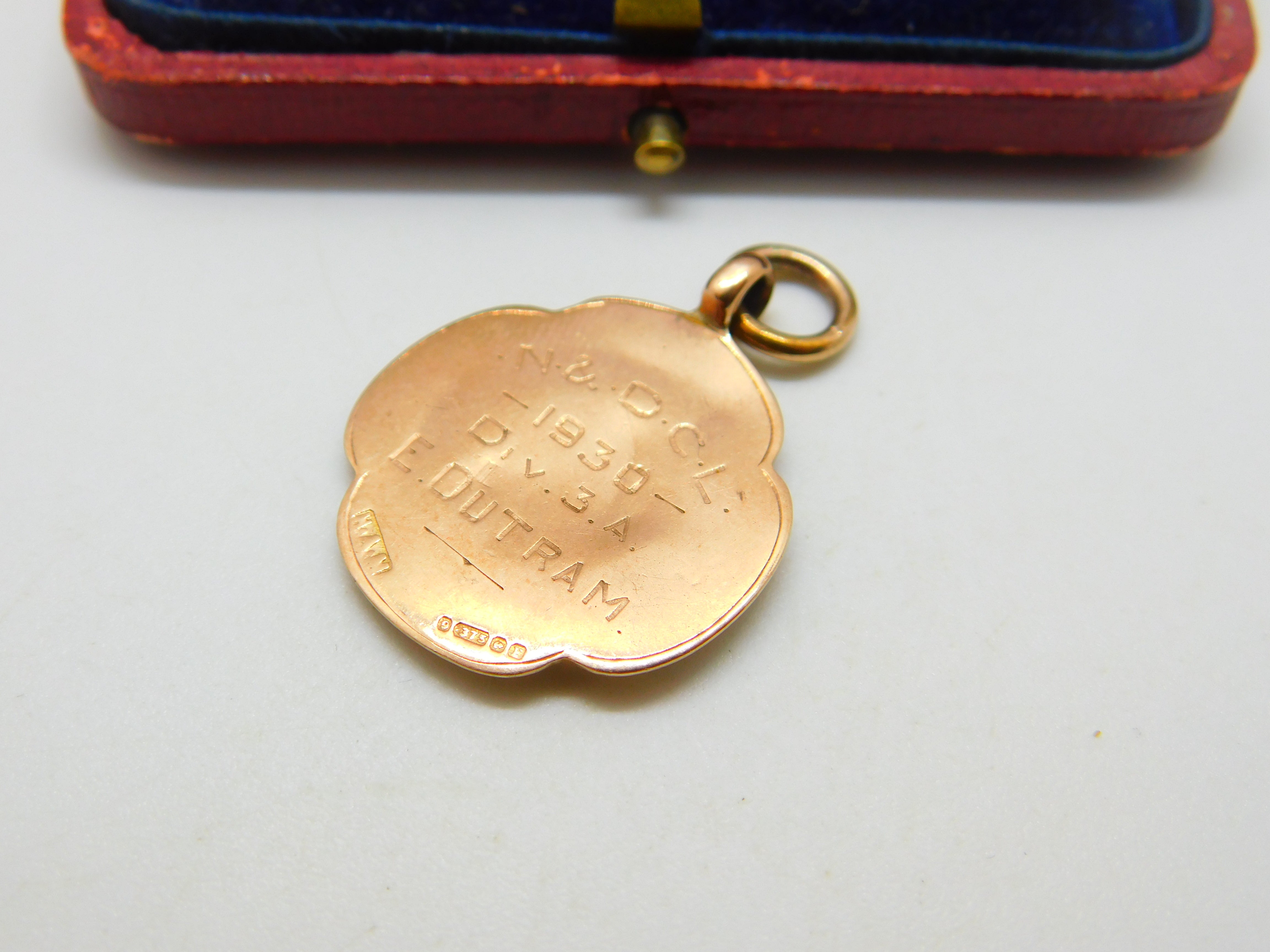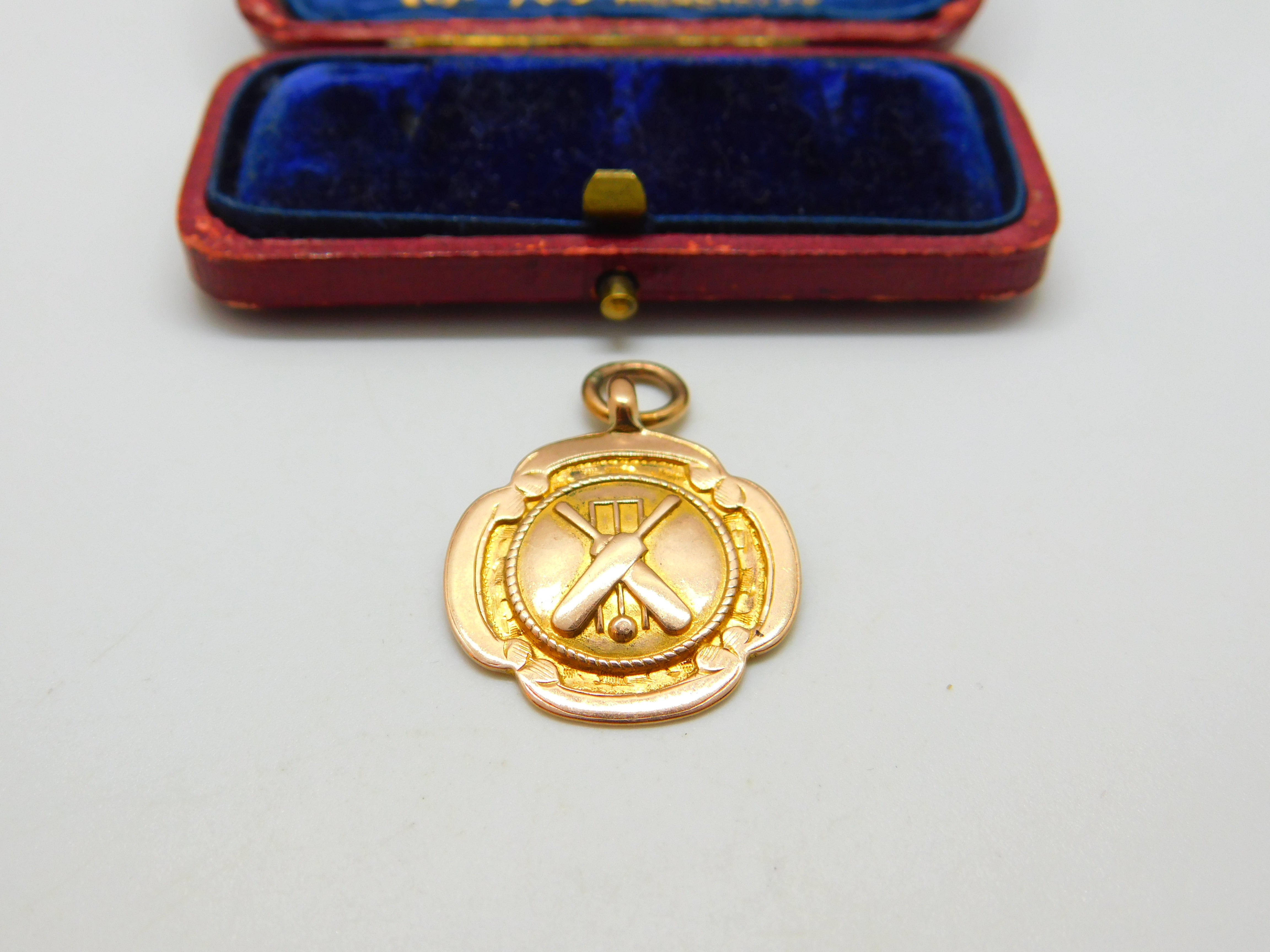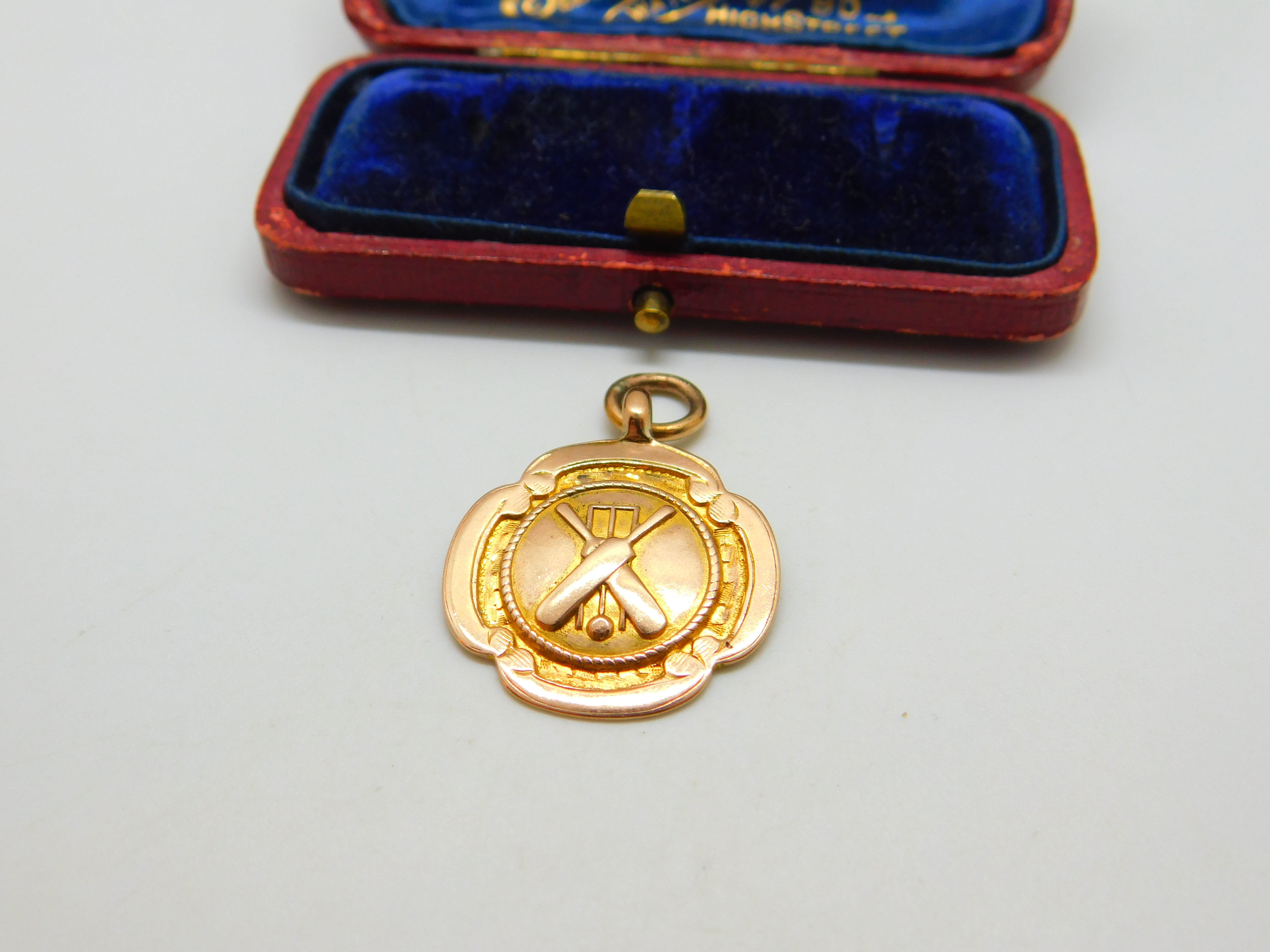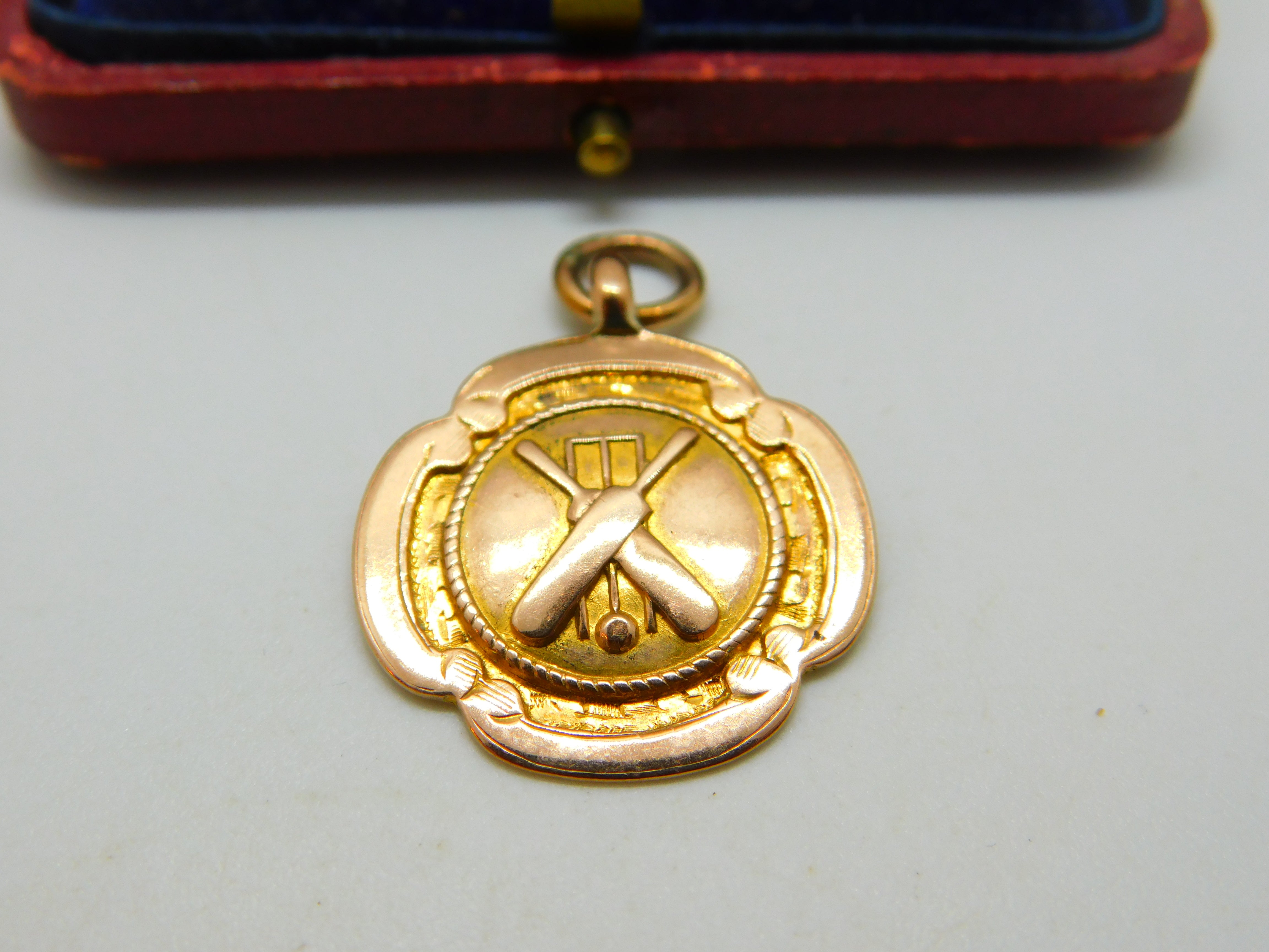 9ct Yellow Gold Cricket Match Fob Medal Antique 1930 Birmingham Art Deco