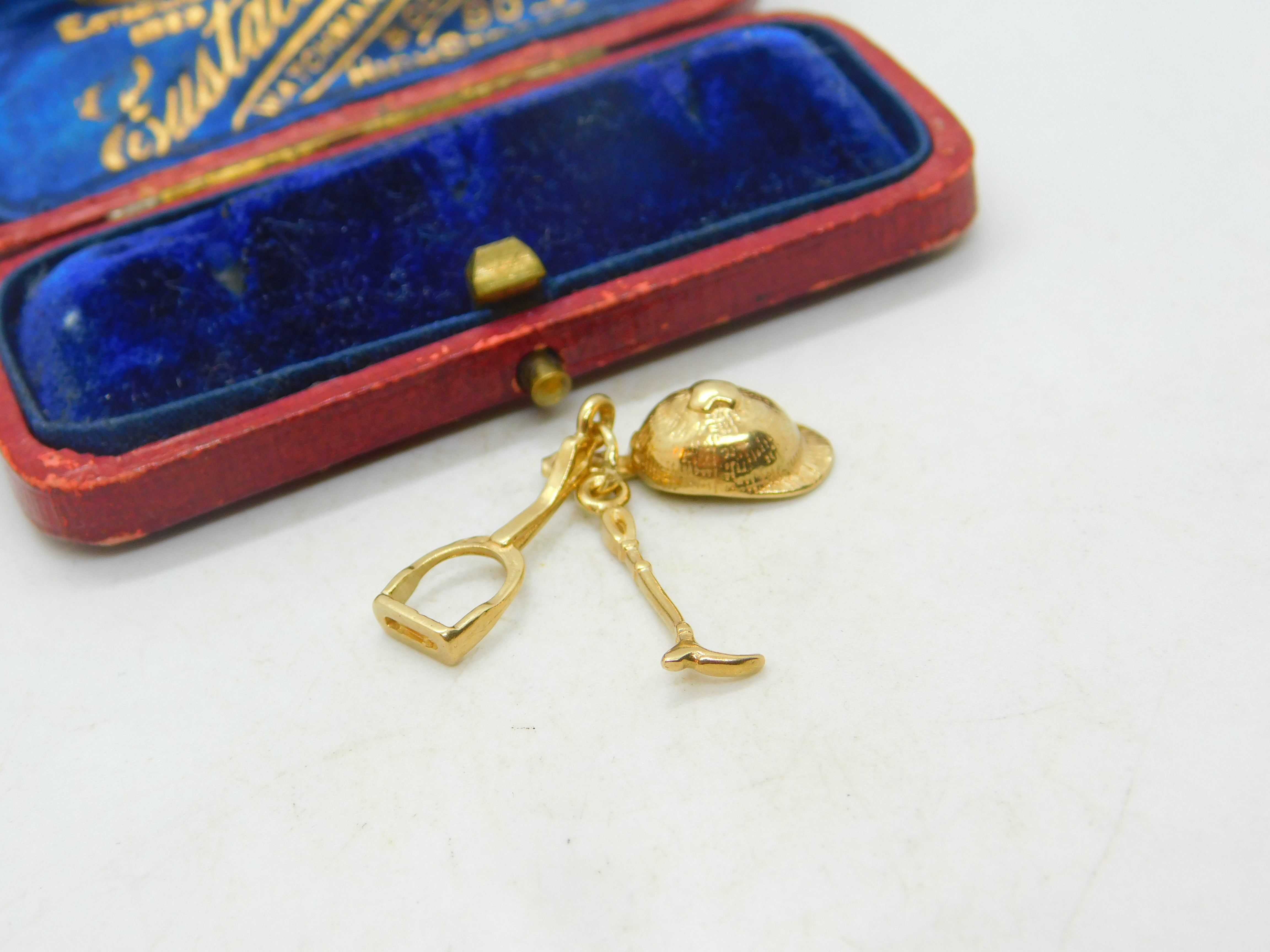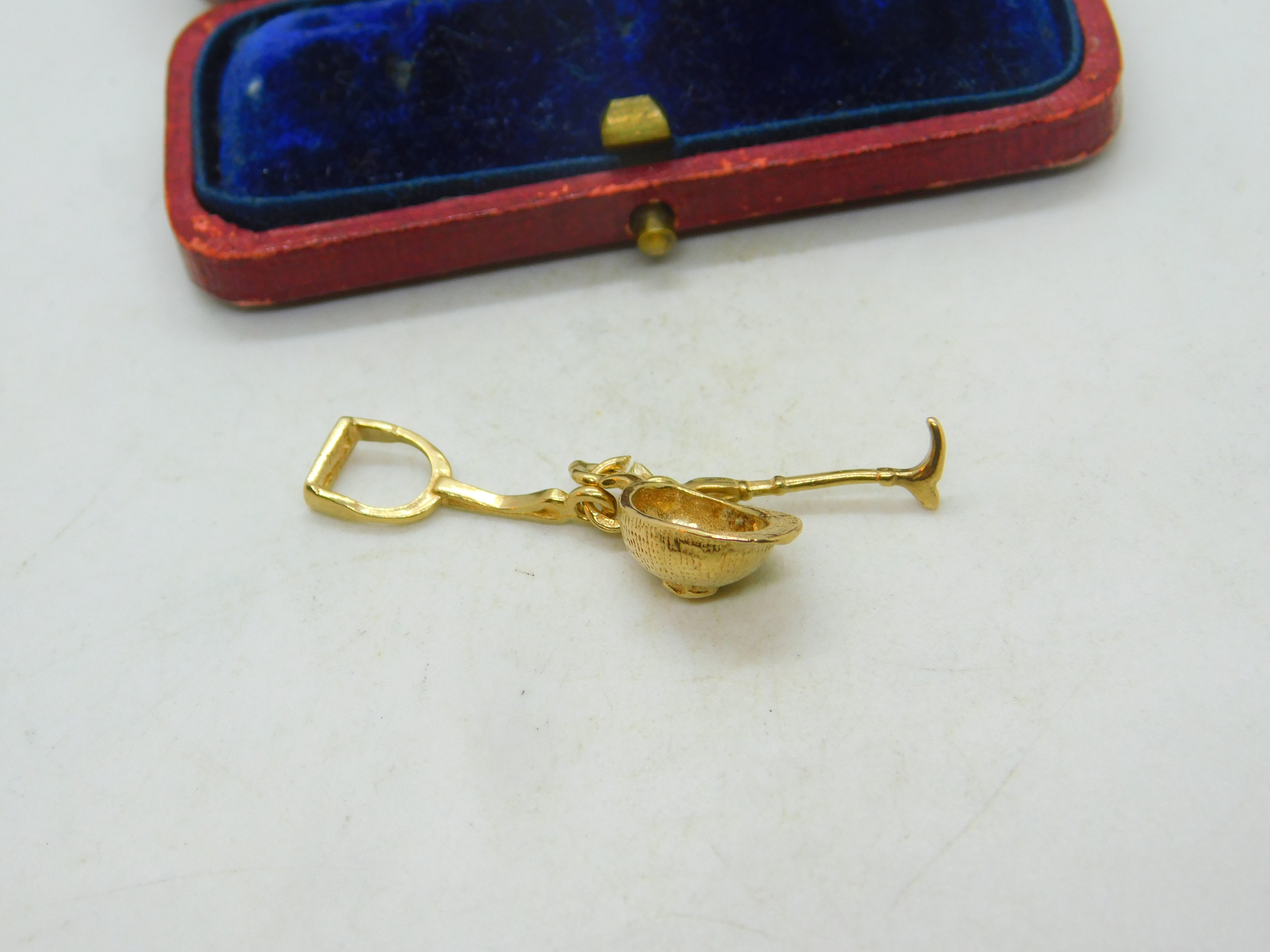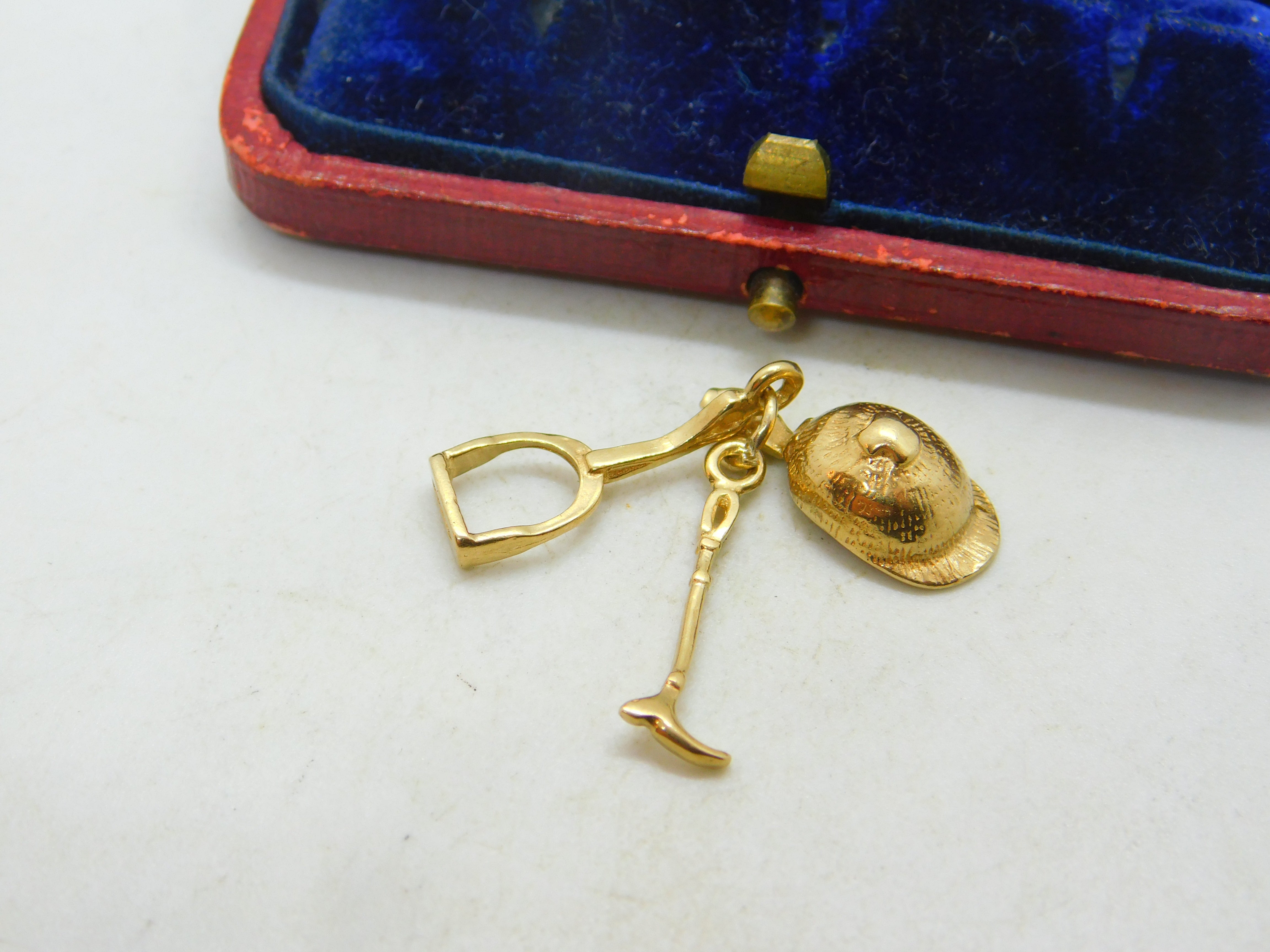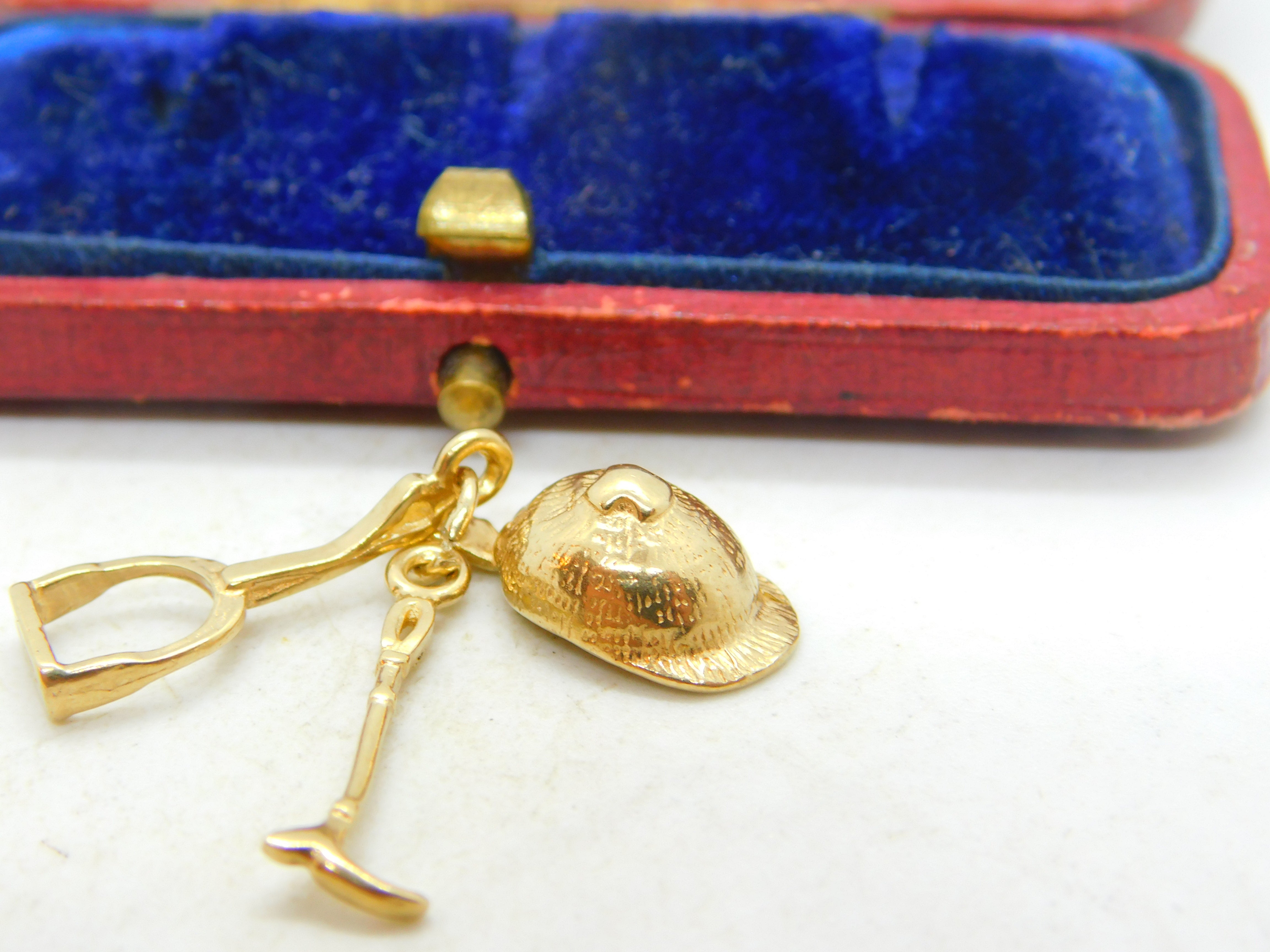 Details: A fantastic and wonderfully designed vintage 9ct yellow gold riding or equestrian charm in the form of a hunting crop, stirrup and a riding hat hallmarked to the bale c1970. This is a wonderful item that would make a perfect gift or addition to any collection. The BOX pictured is for PRESENTATION ONLY and is NOT included in the listings but used to frame the pictures unless specifically stated otherwise.