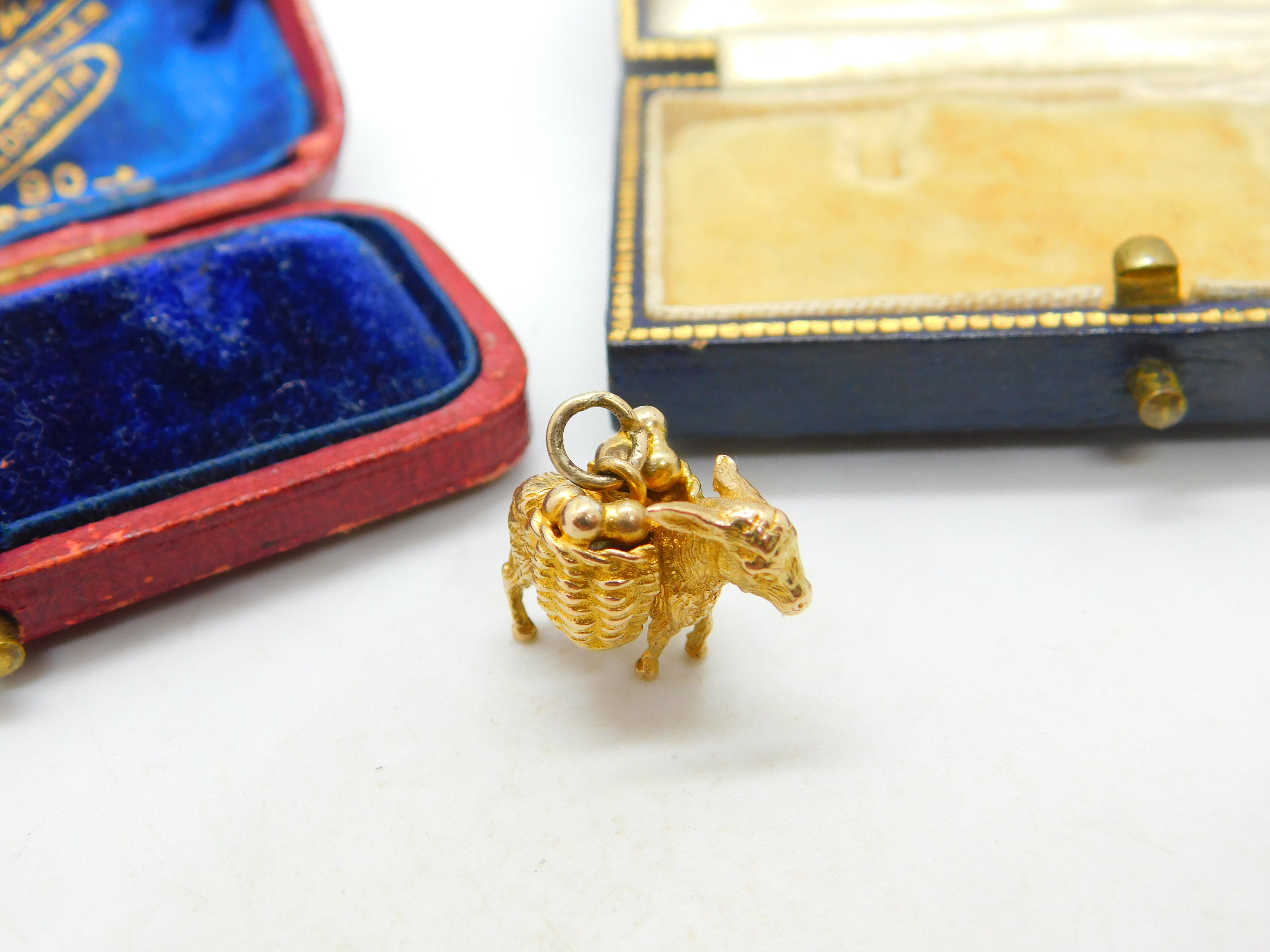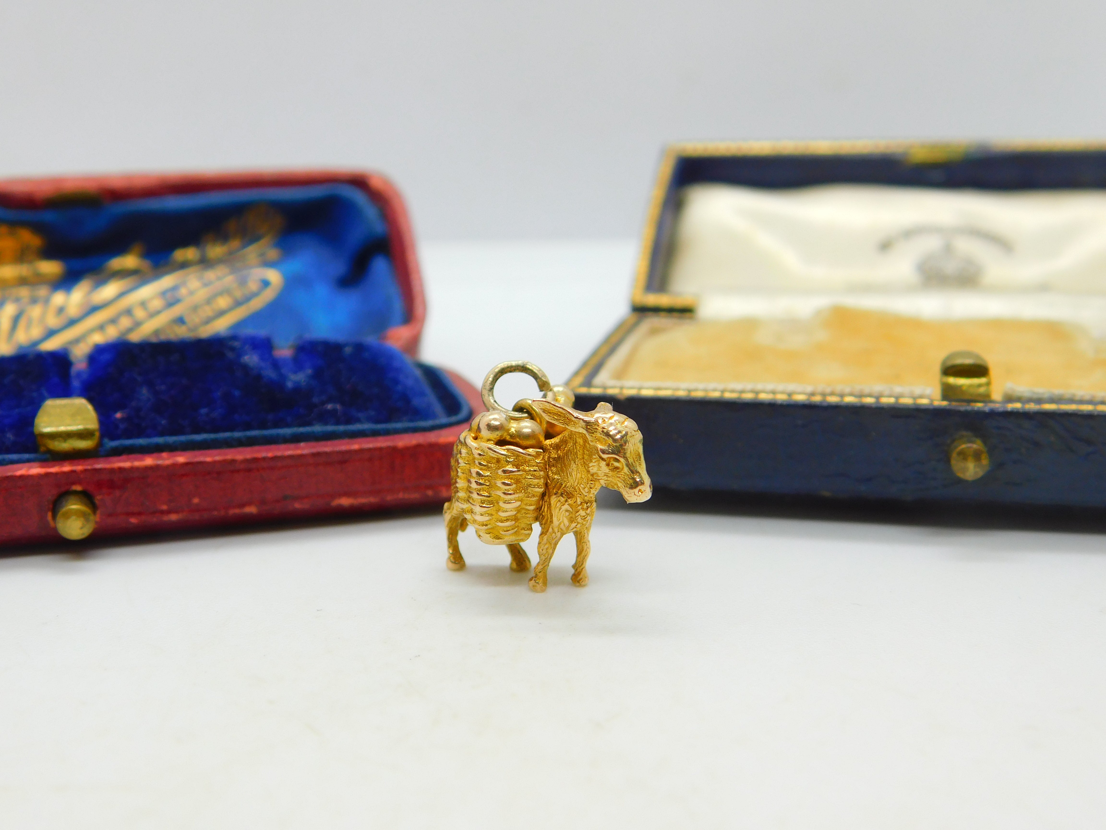 Details: A fantastic and well designed vintage 9ct yellow gold donkey carrying baskets charm pendant with lovely design hallmarked Birmingham 1982 to the base. Great heavy gauge. This is a wonderful item that would make a perfect gift or addition to any collection. The BOX pictured is for PRESENTATION ONLY and is NOT included in the listings but used to frame the pictures unless specifically stated otherwise.