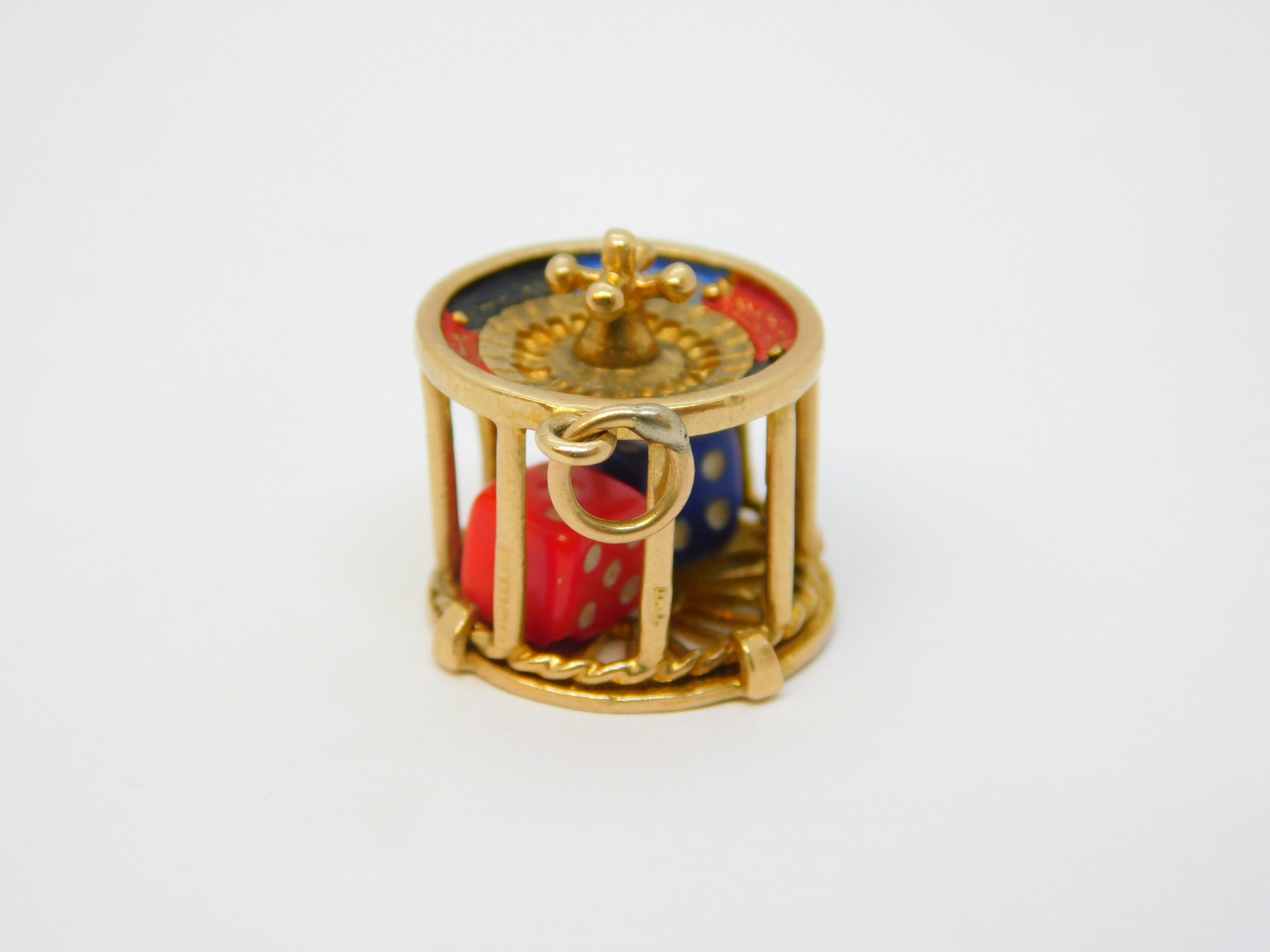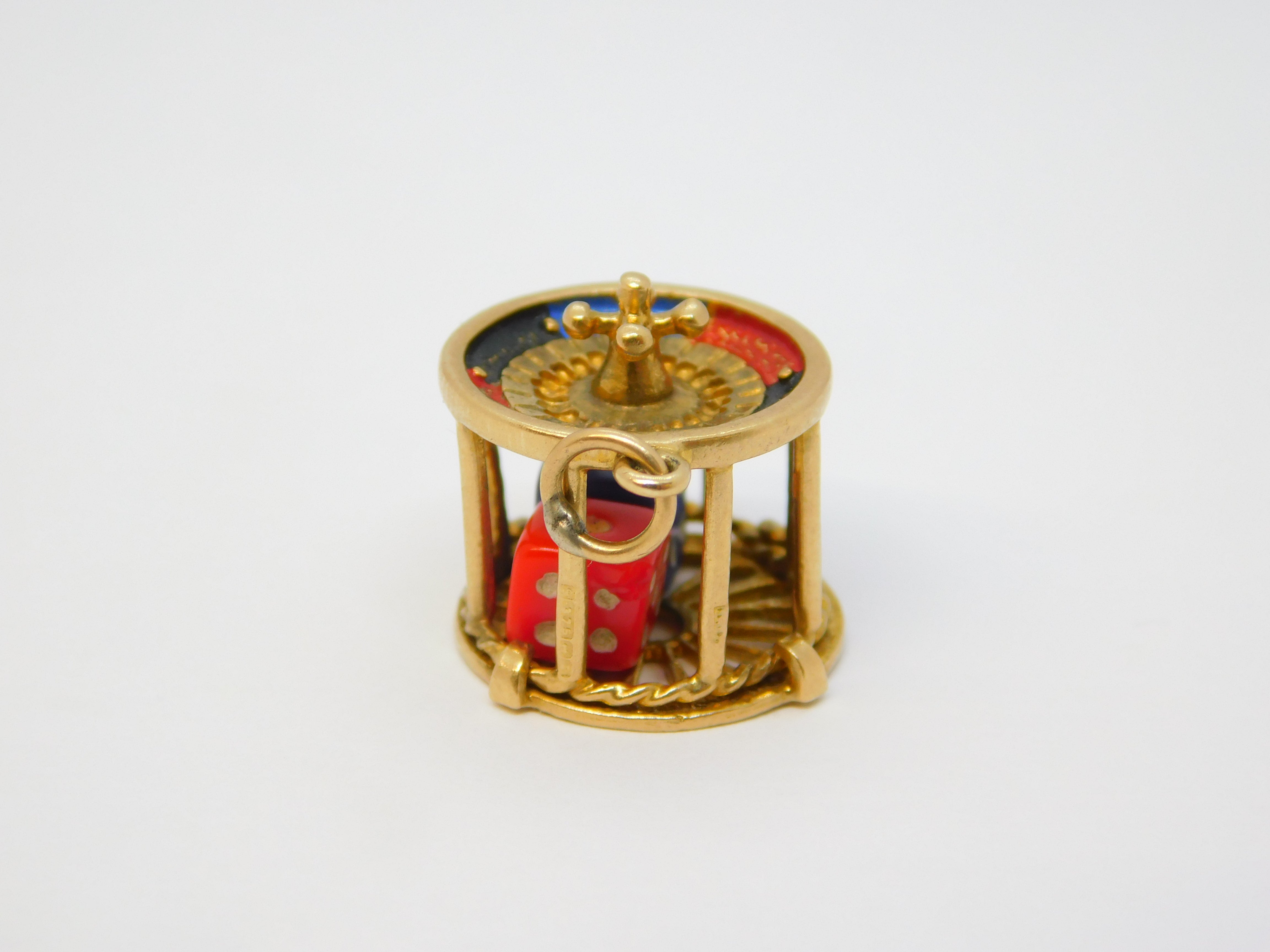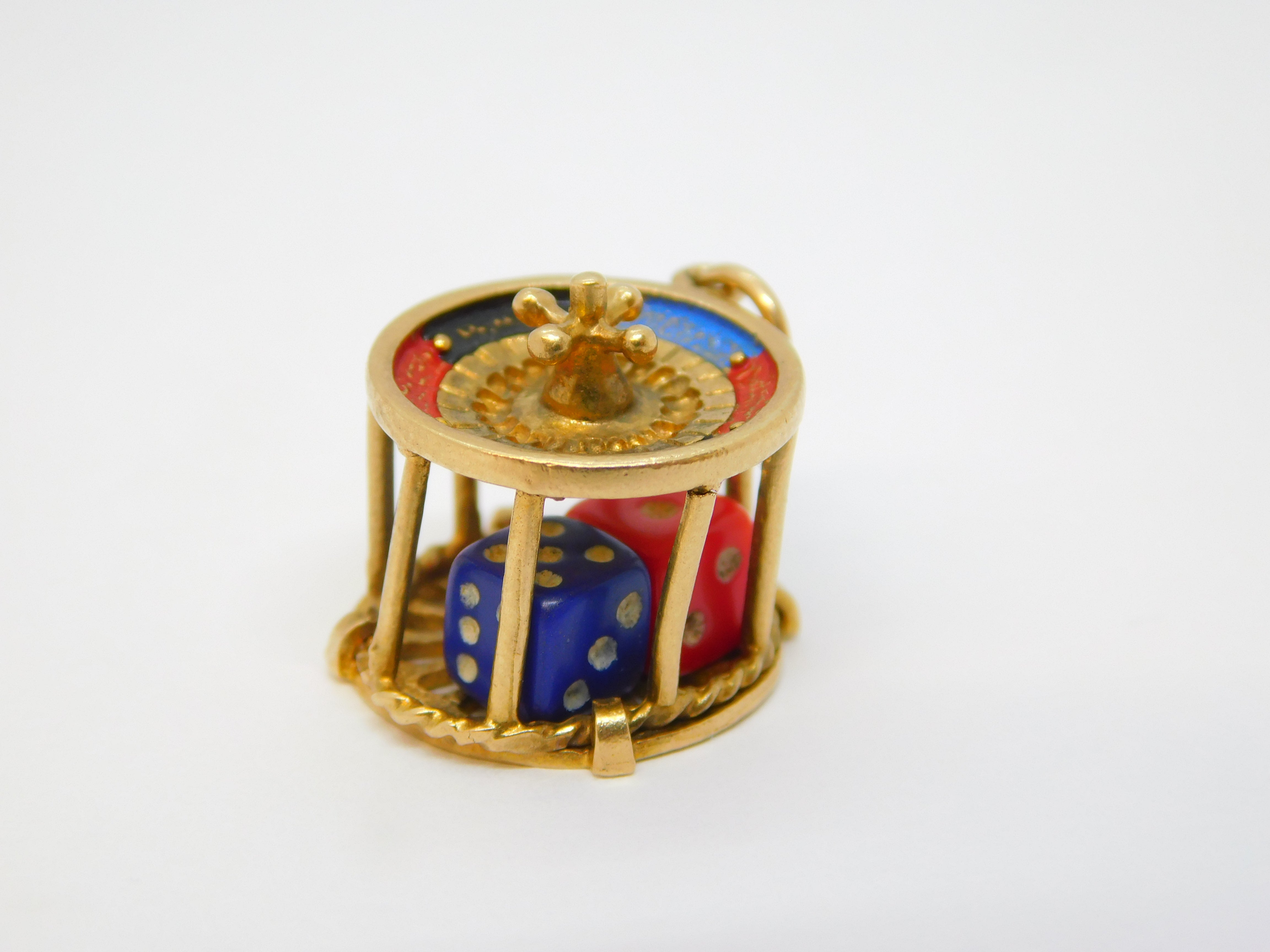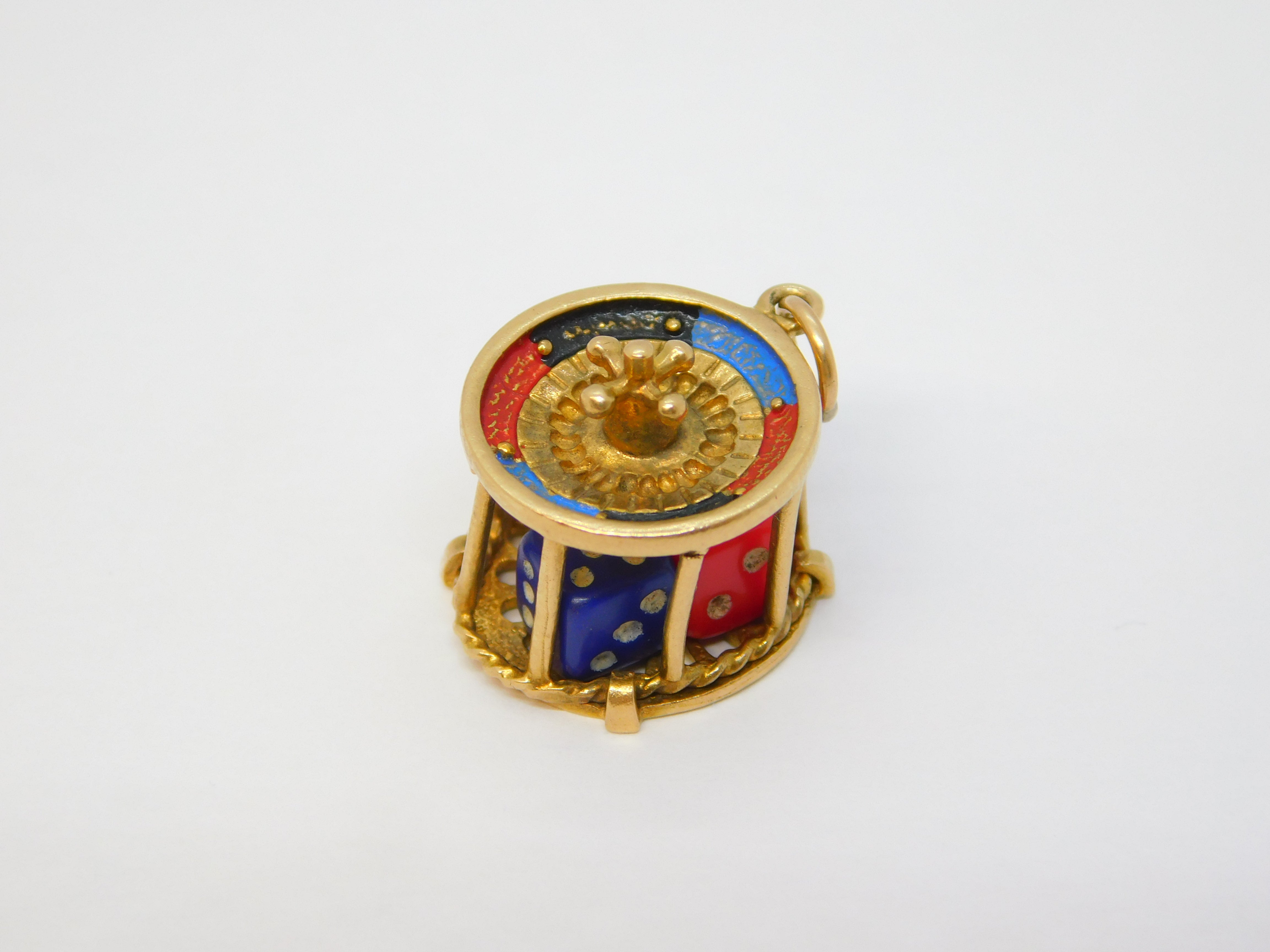 Details: A fantastic and wonderfully designed vintage 9ct yellow gold roulette wheel & dice set with enamel and colourful dice to the interior hallmarked Birmingham 1964 to the edge, minor bending to the charm. This is a wonderful item that would make a perfect gift or addition to any collection.