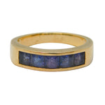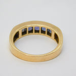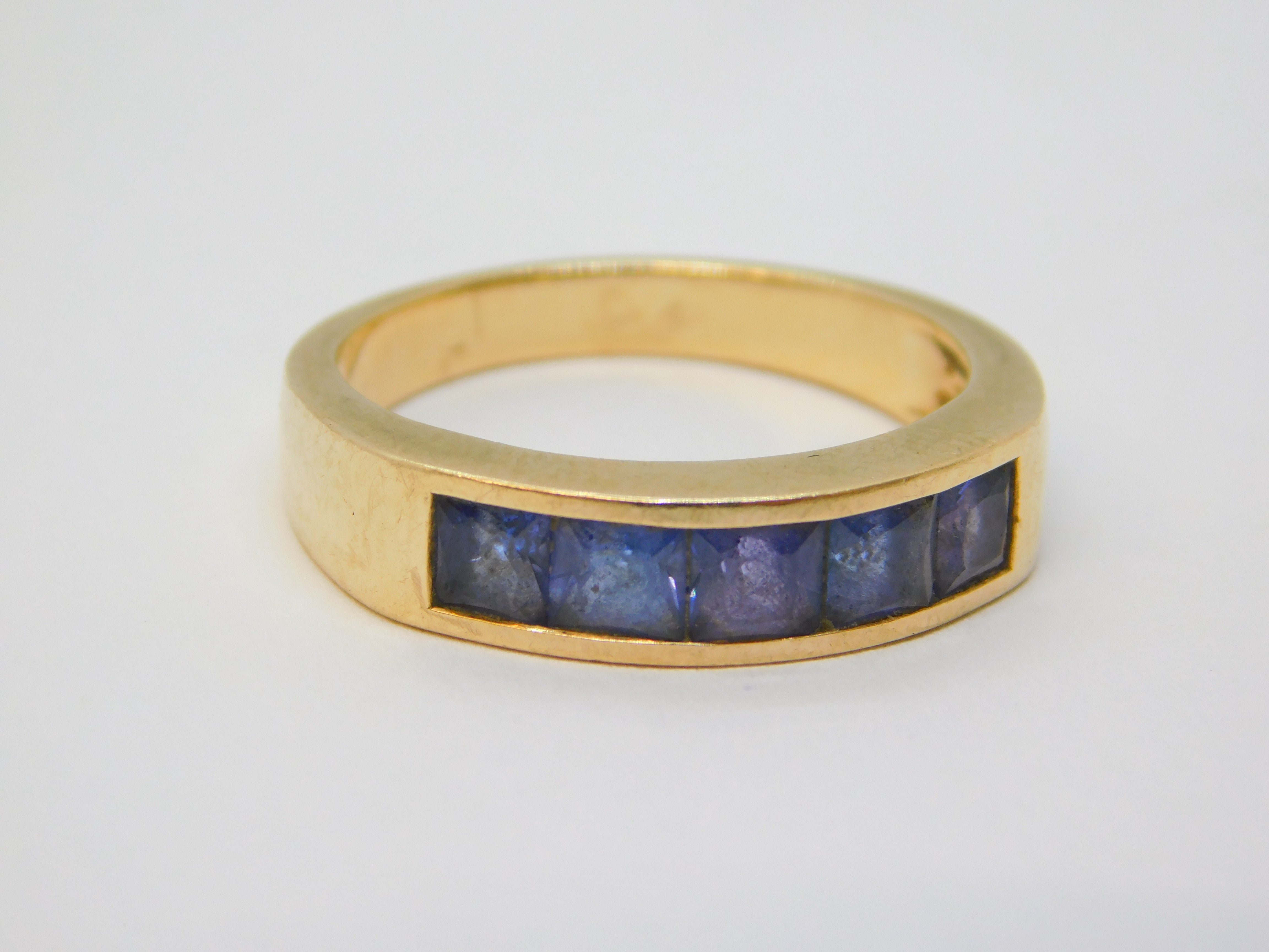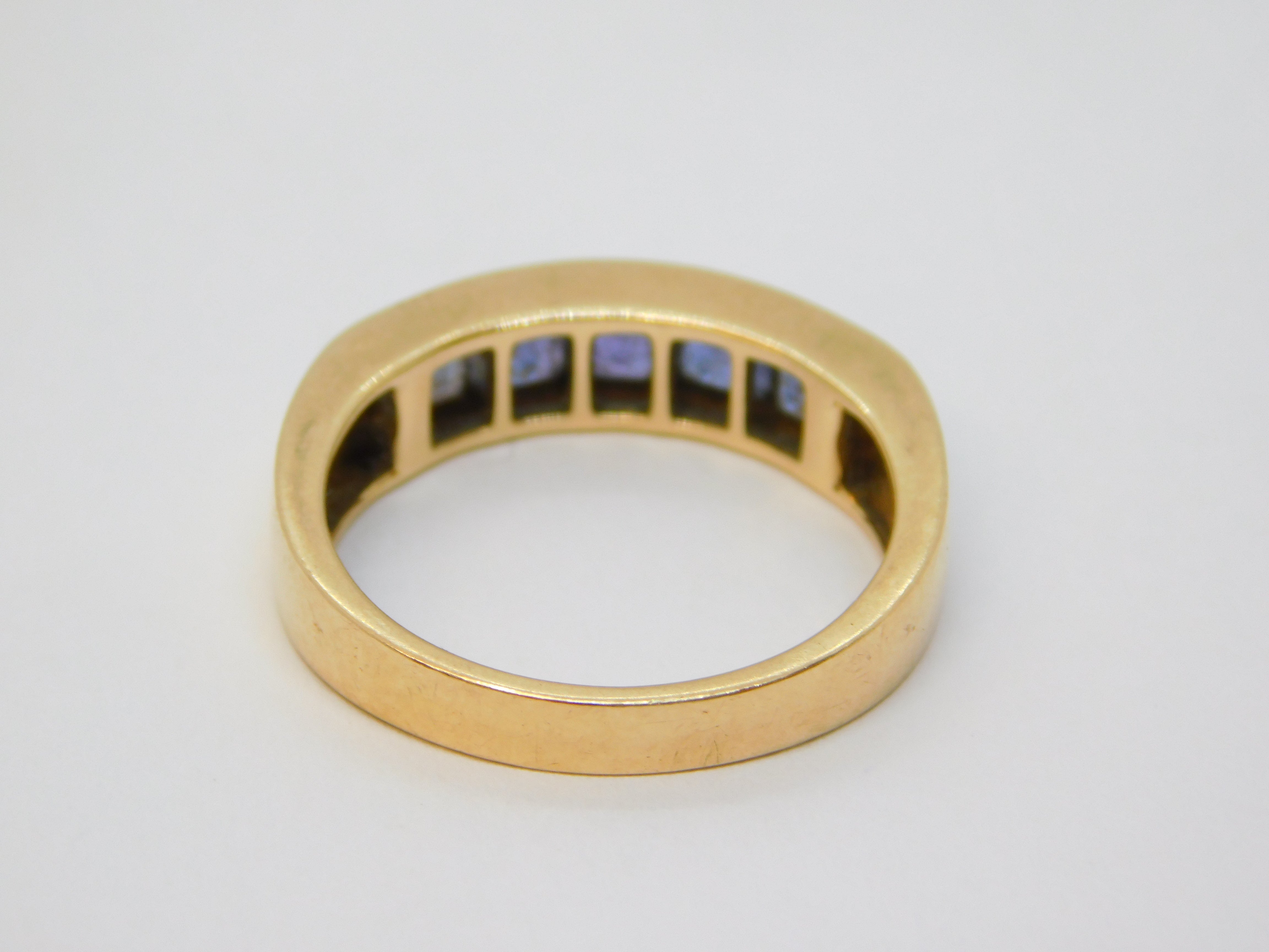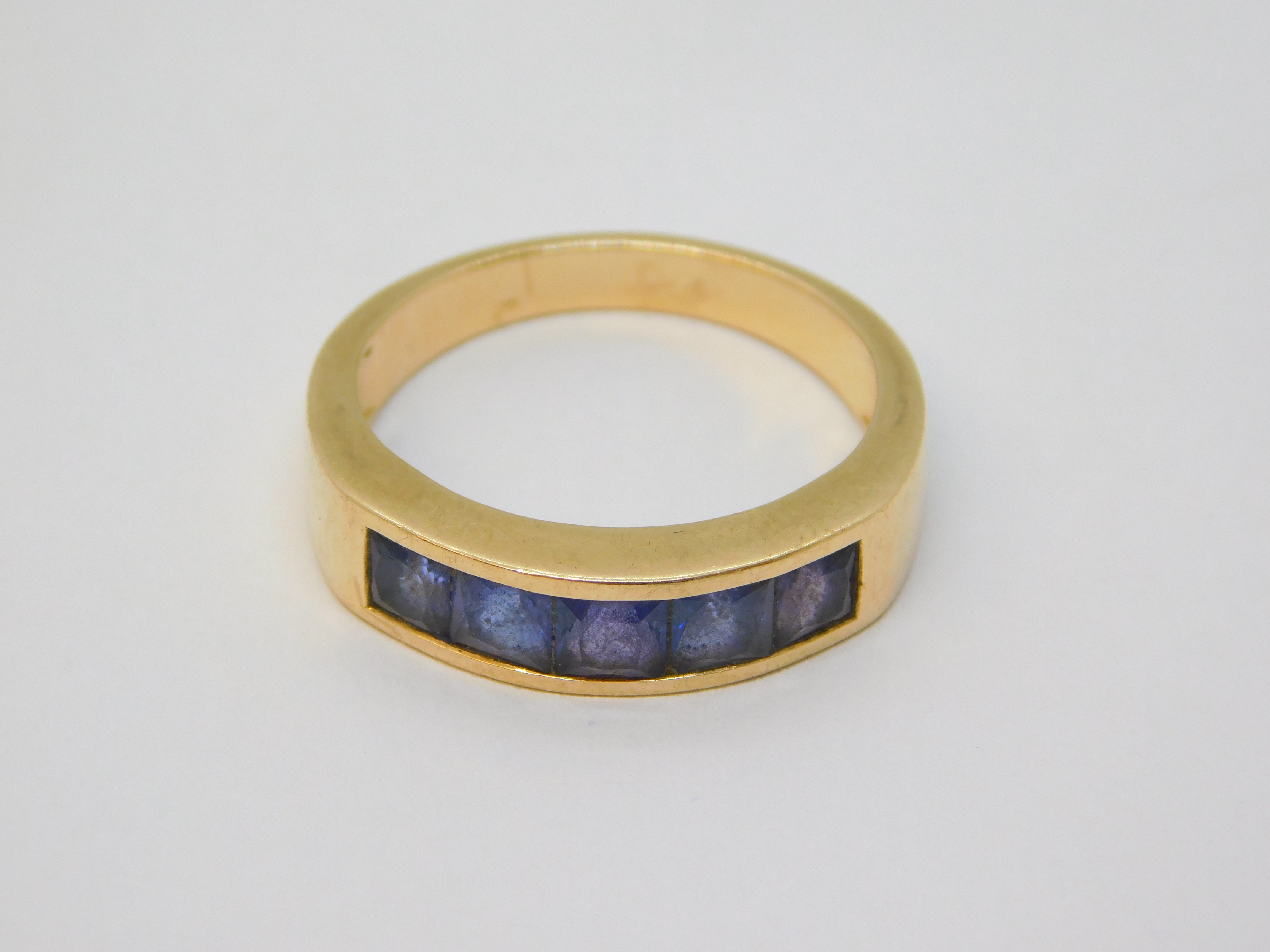 Details: A fantastic and wonderfully designed vintage 9ct yellow gold band ring set with five square-cut tanzanite stones hallmarked London 1995 to the interior band. This is a wonderful item that would make a perfect gift or addition to any collection. We are more than happy to provide XRF reports for items upon request.