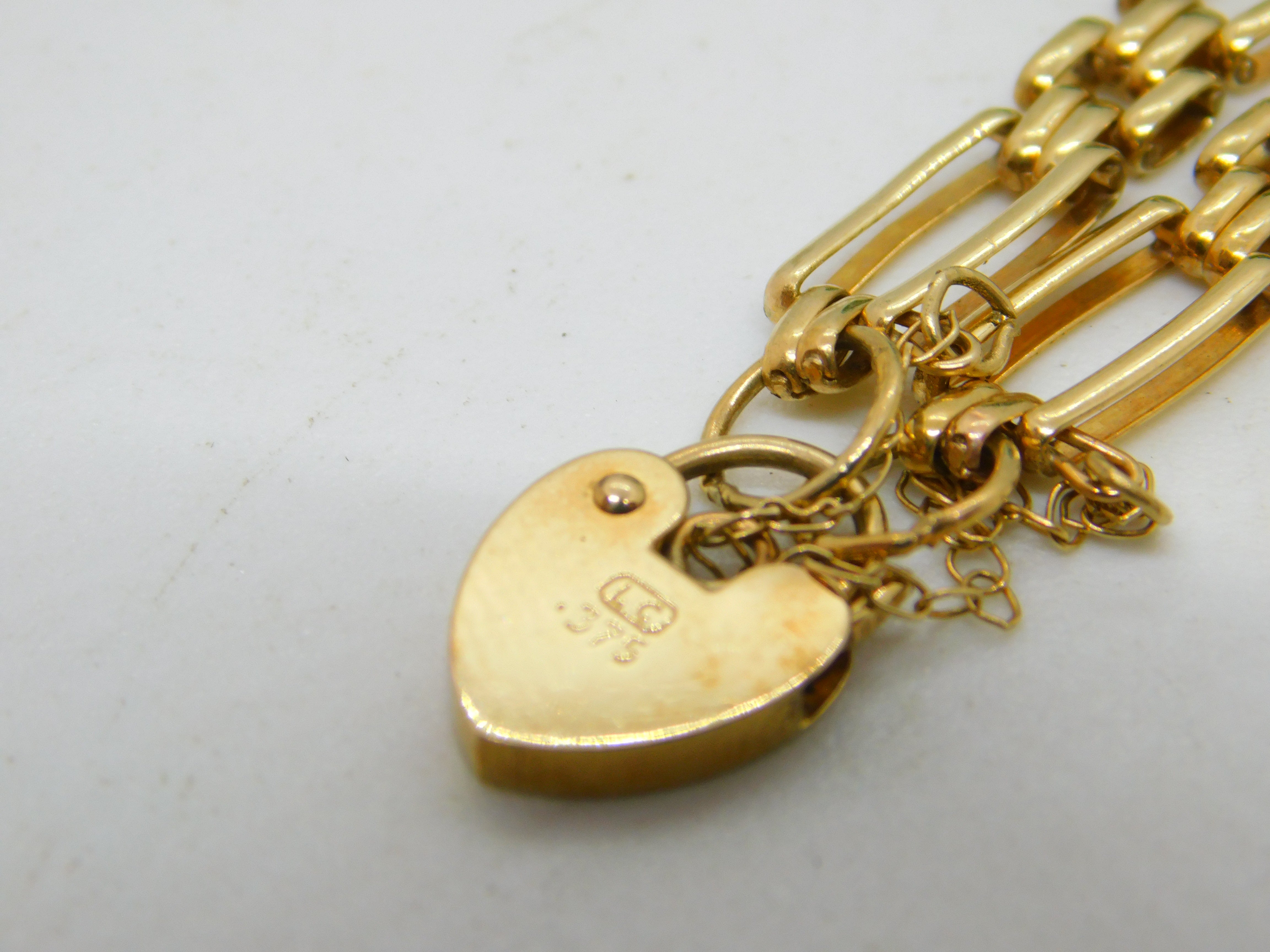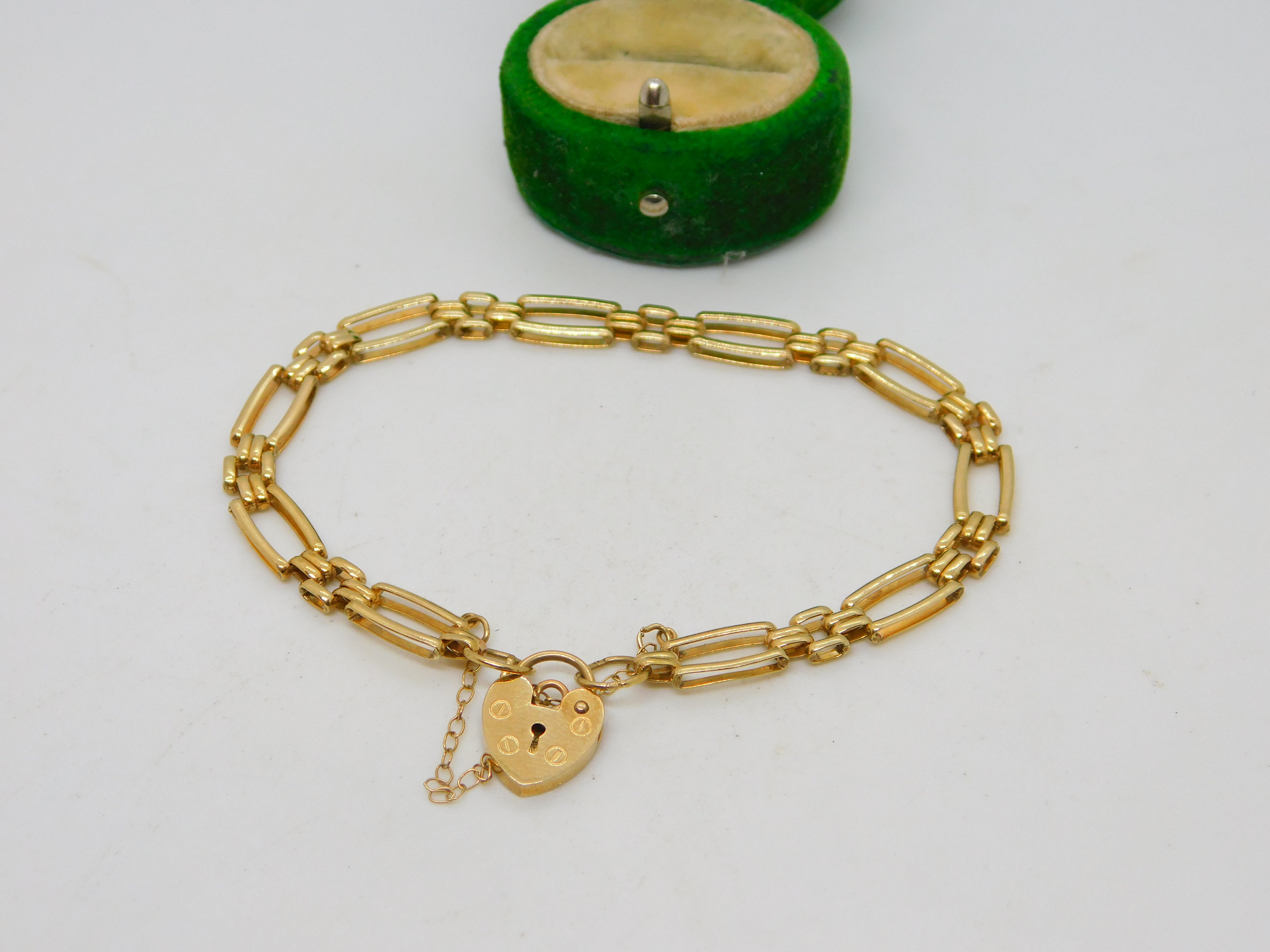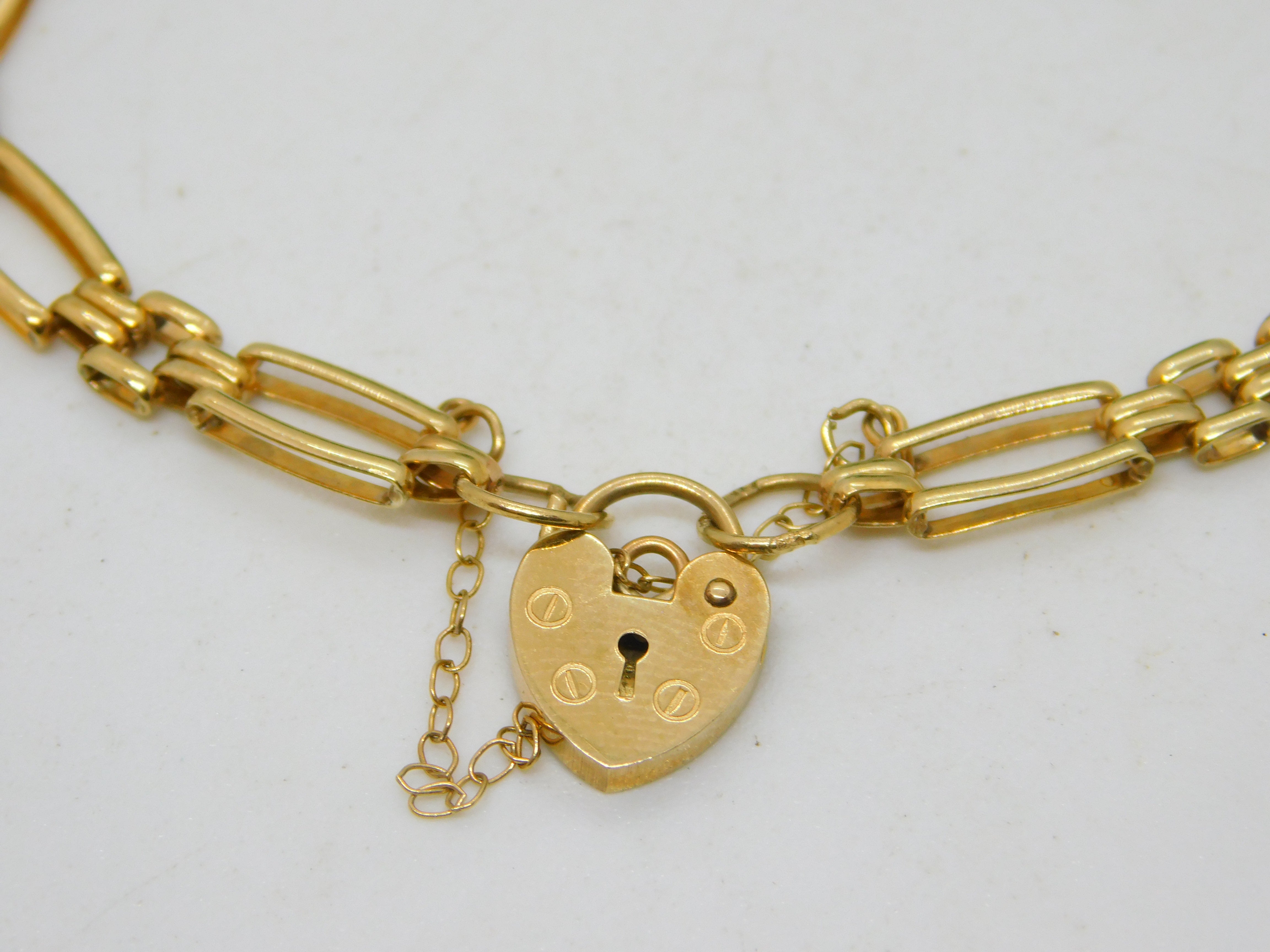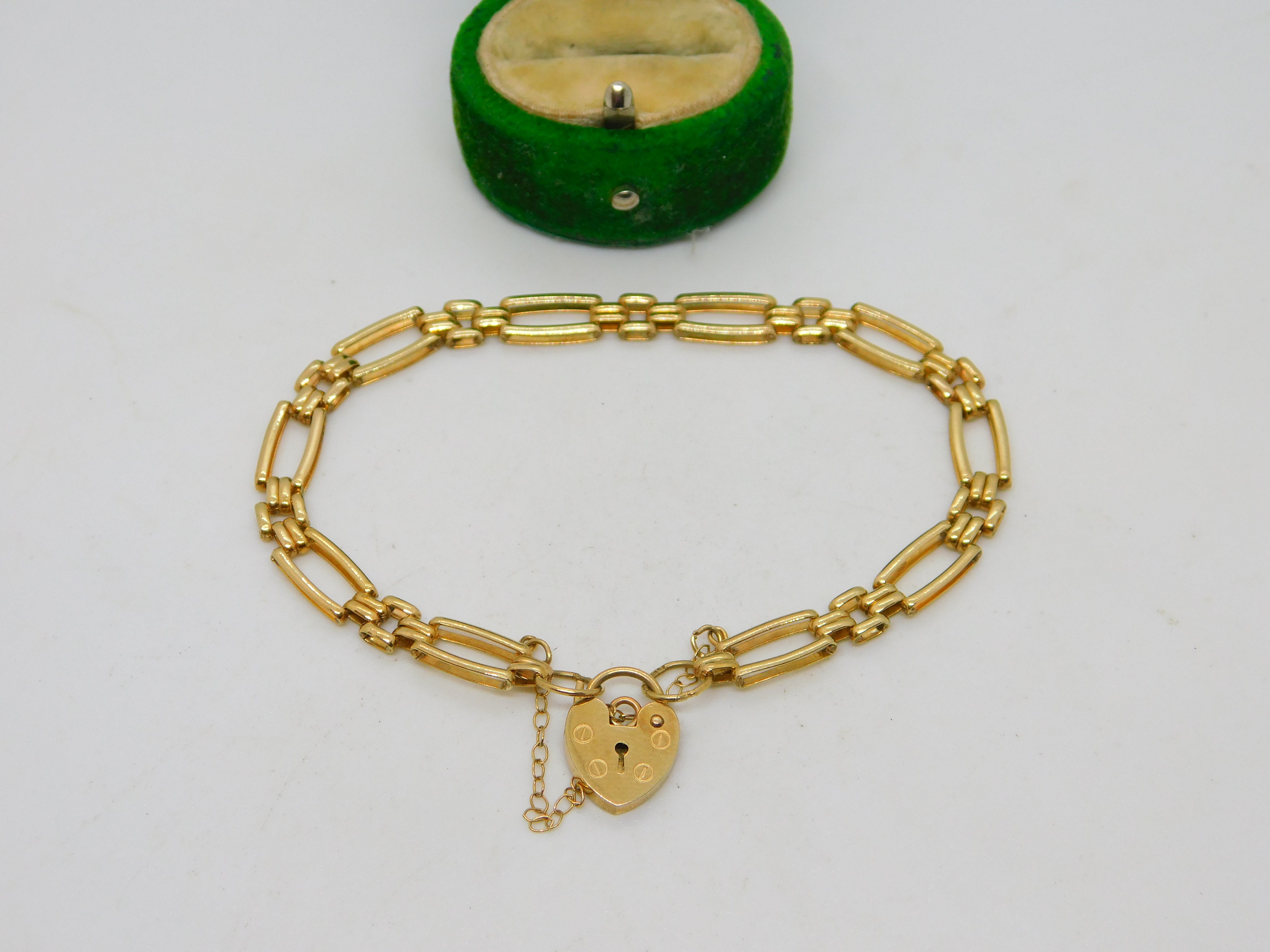 9ct Yellow Gold Gate Link Charm Bracelet Heart Lock Clasp Vintage c1970