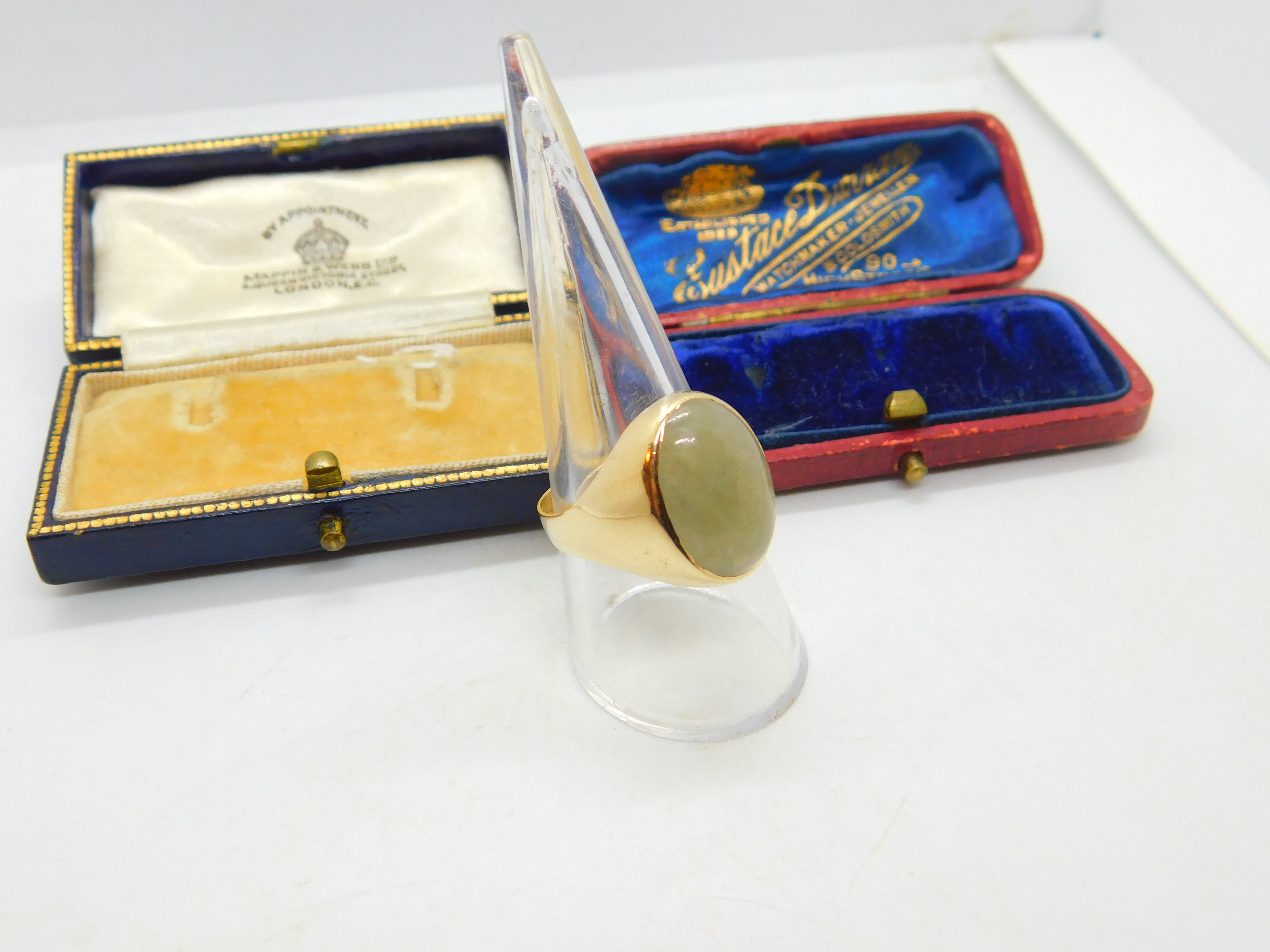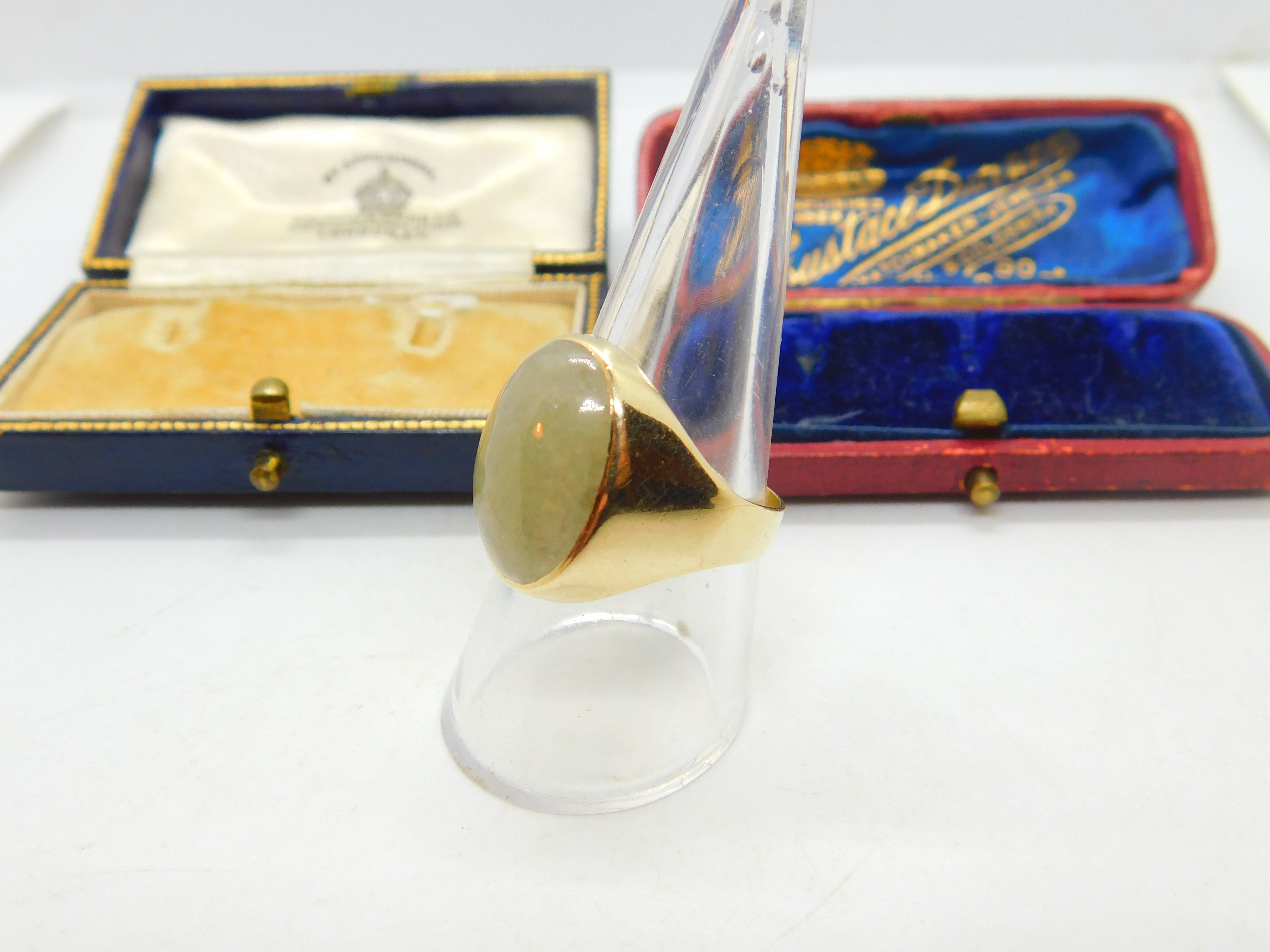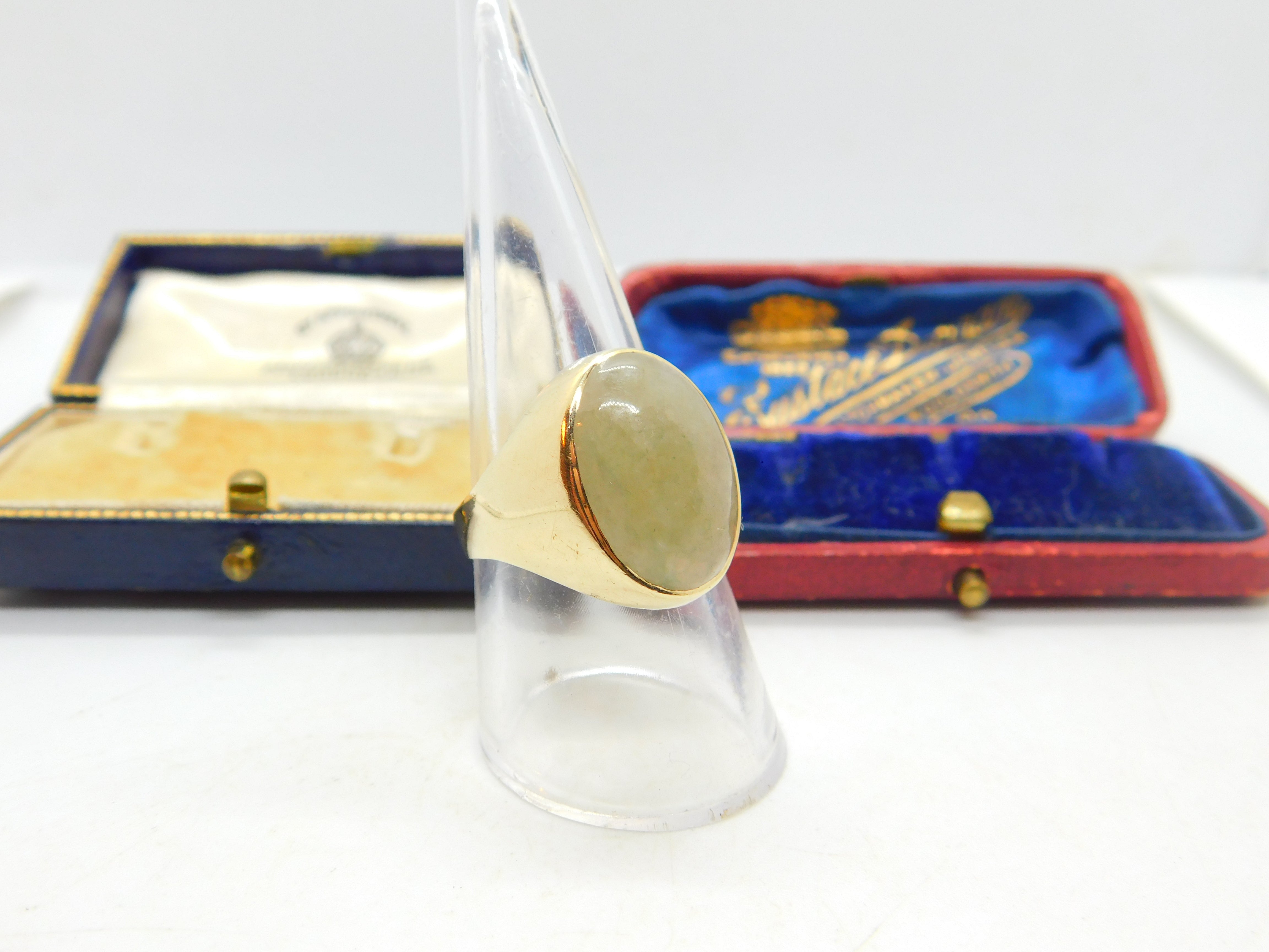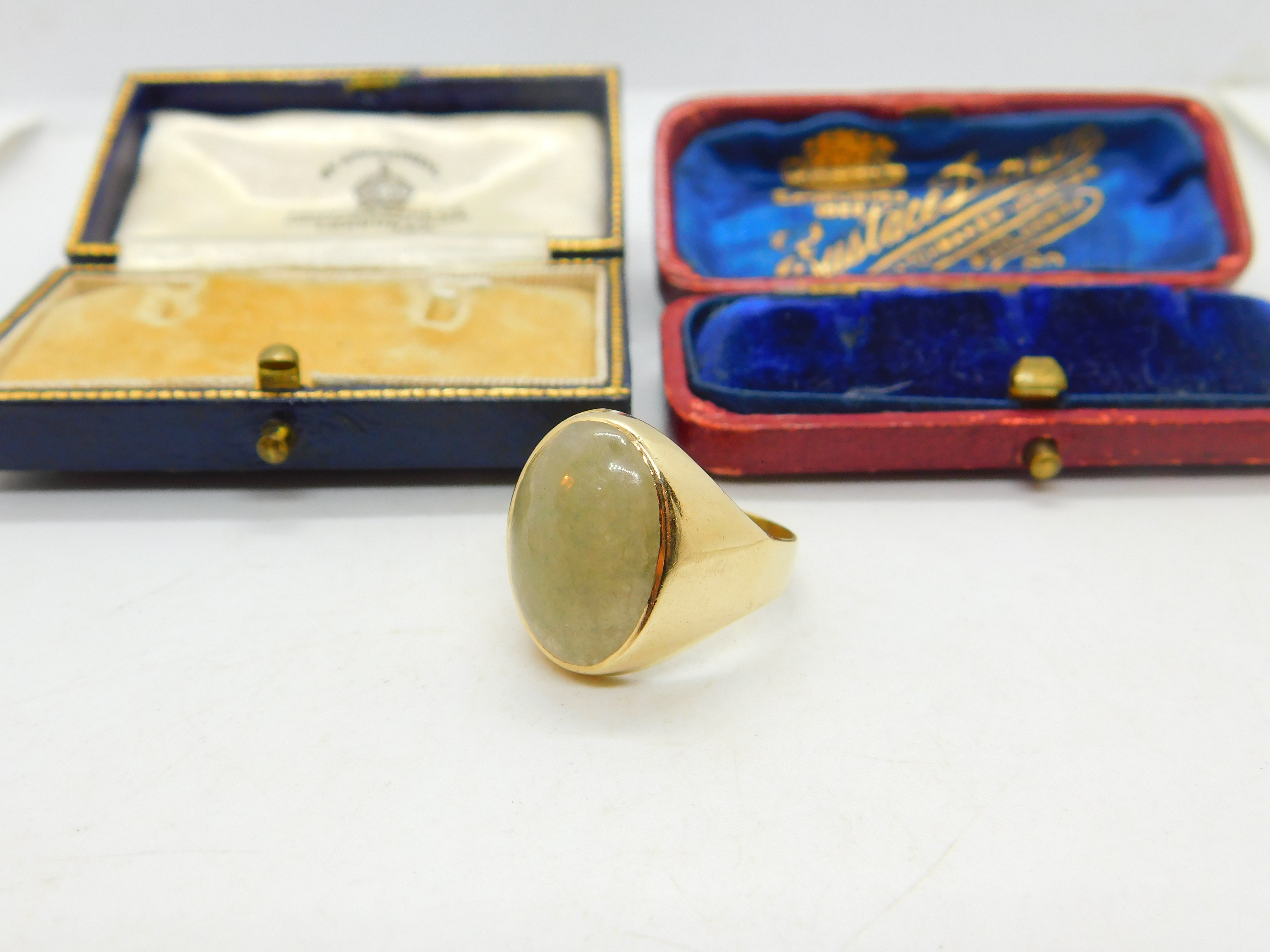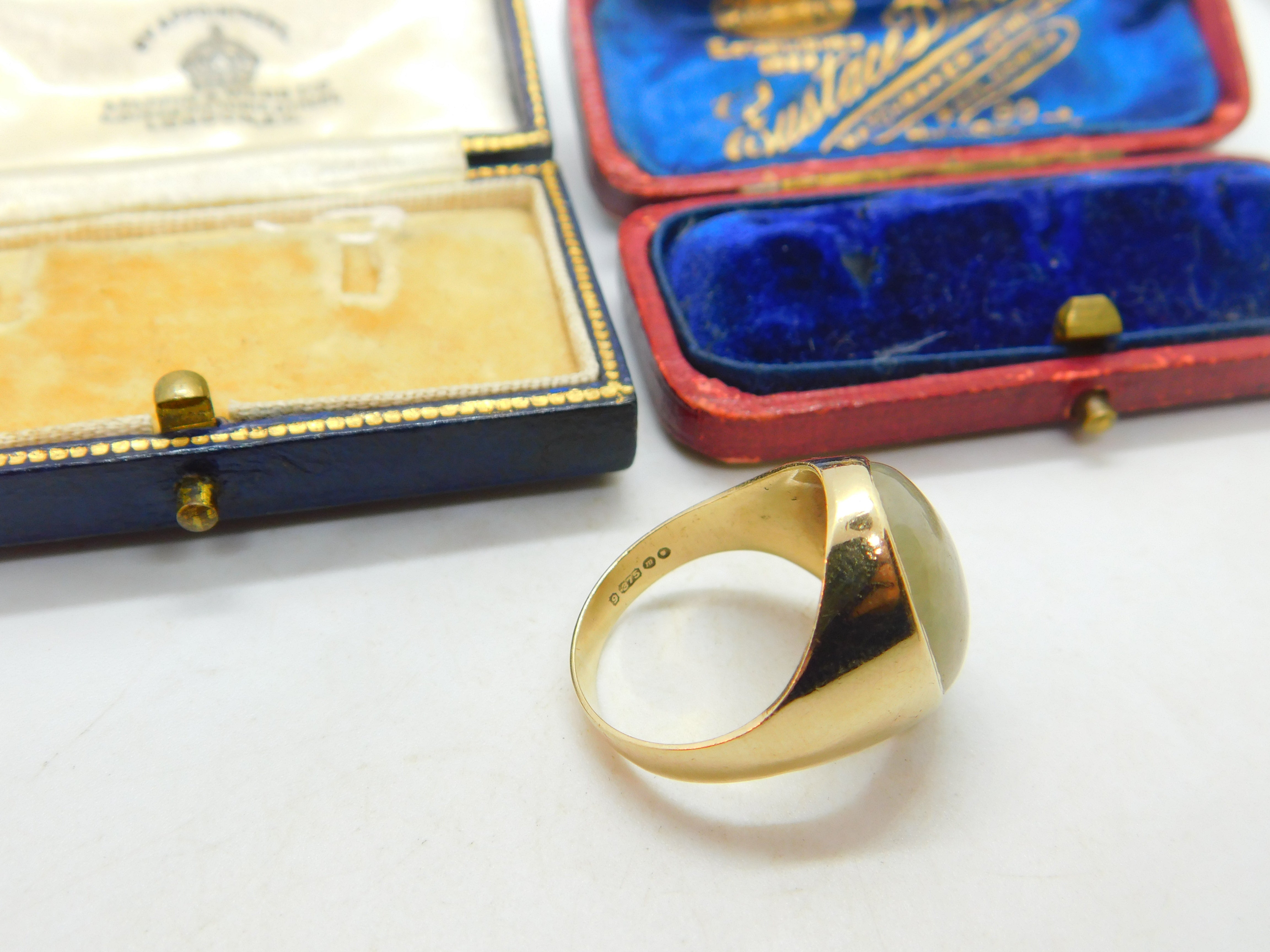 Details: A fantastic and wonderfully stylish vintage 9ct yellow gold and large cabochon jade signet ring with nice detail hallmarked London 1967 to the interior band. This is a wonderful item that would make a perfect gift or addition to any collection. The BOX pictured is for PRESENTATION ONLY and is NOT included in the listings but used to frame the pictures unless specifically stated otherwise.
