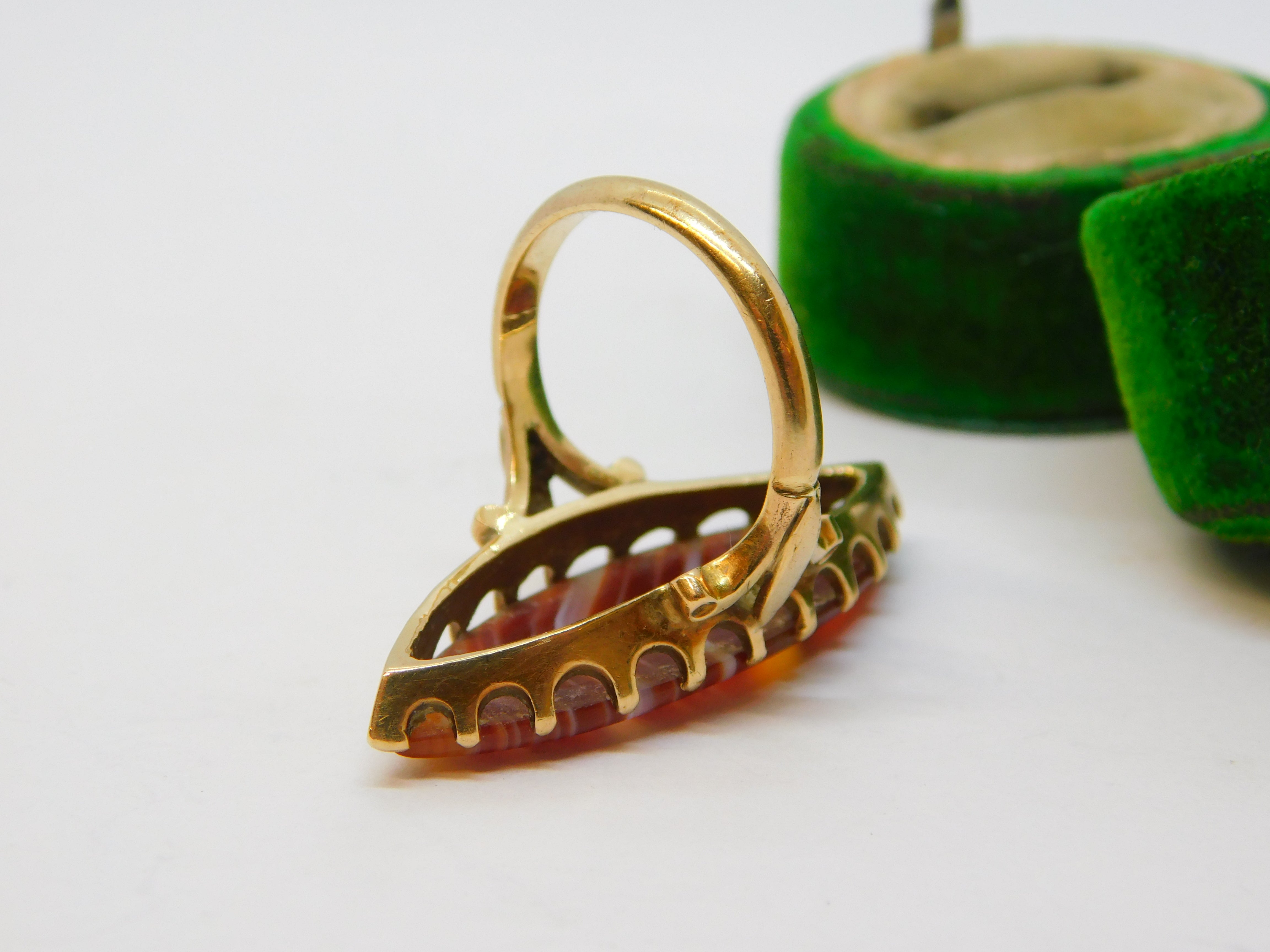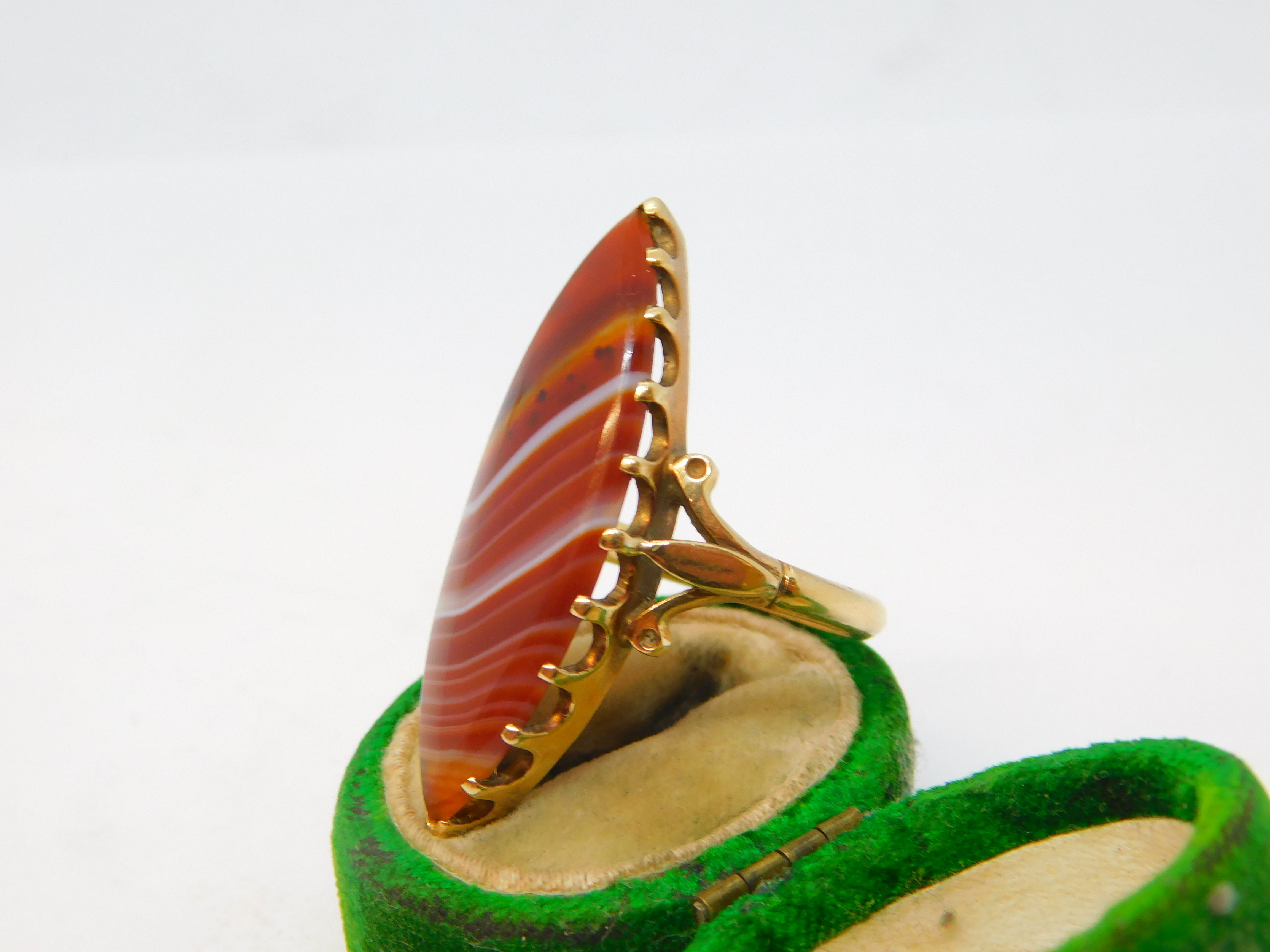 Details: A fantastic and wonderfully designed antique Victorian large 9ct yellow gold mounted large marquise-cut banded red agate dress ring with superb detailing hallmarked to the interior band c1900. This is a wonderful item that would make a perfect gift or addition to any collection.