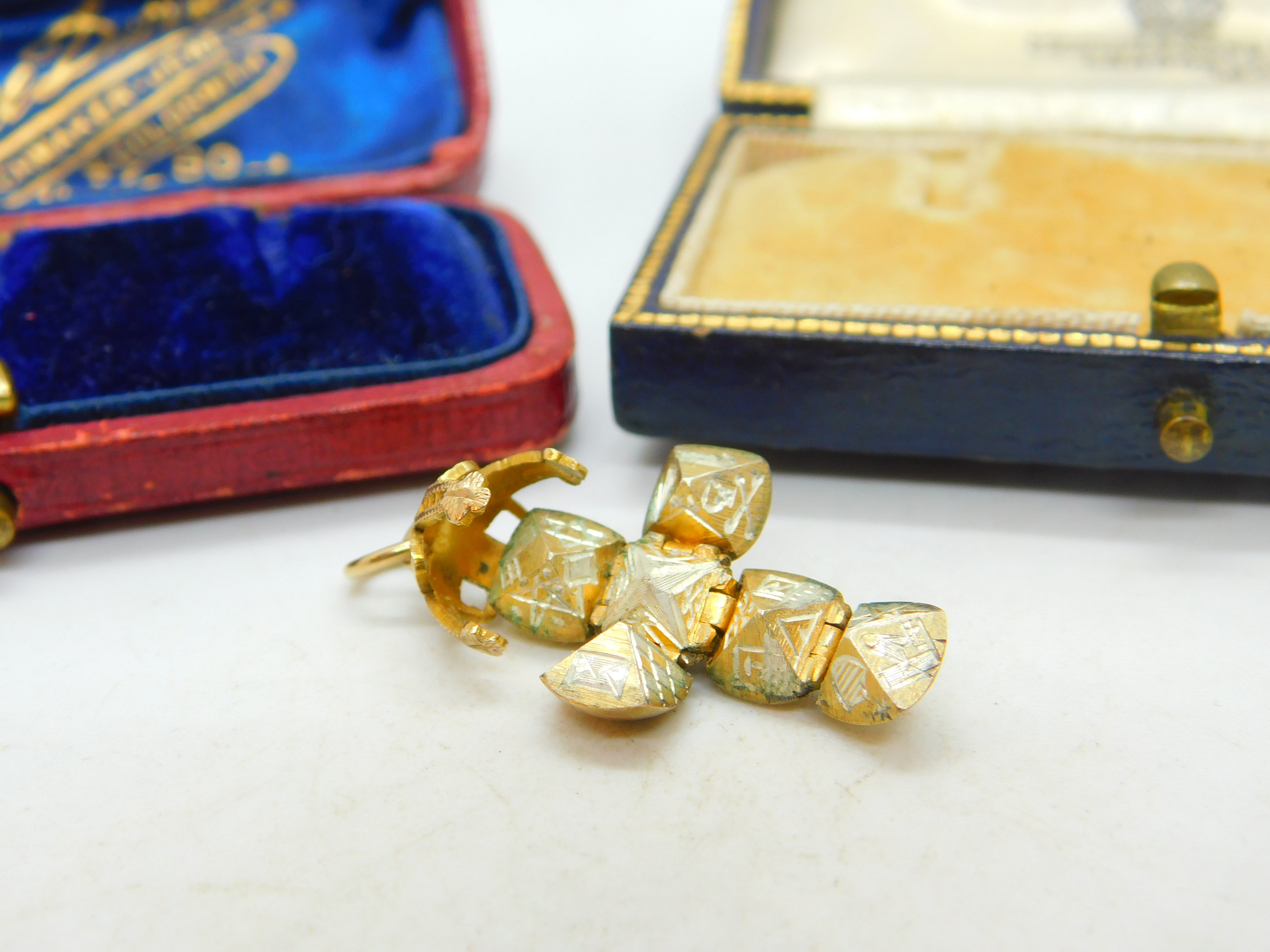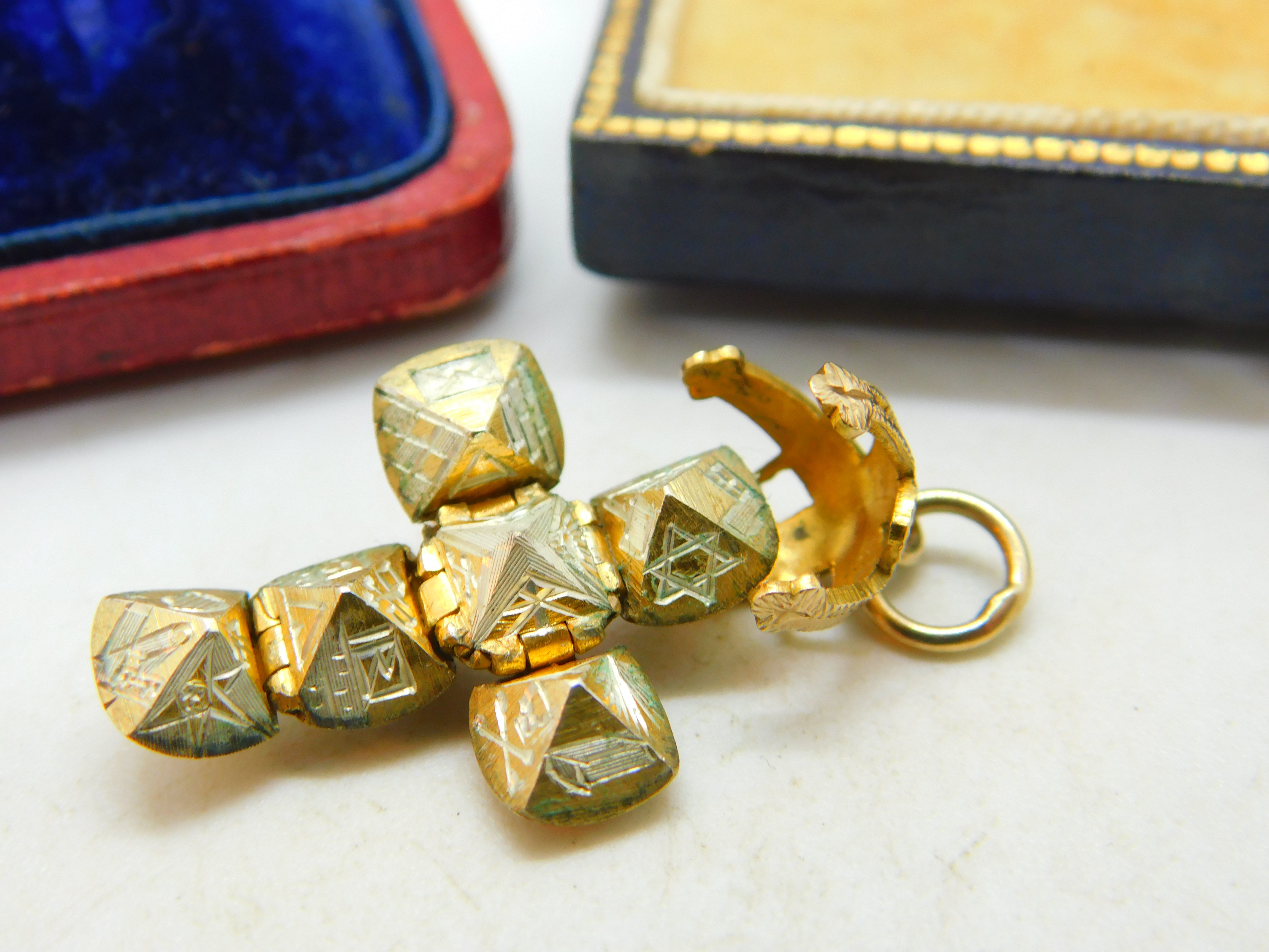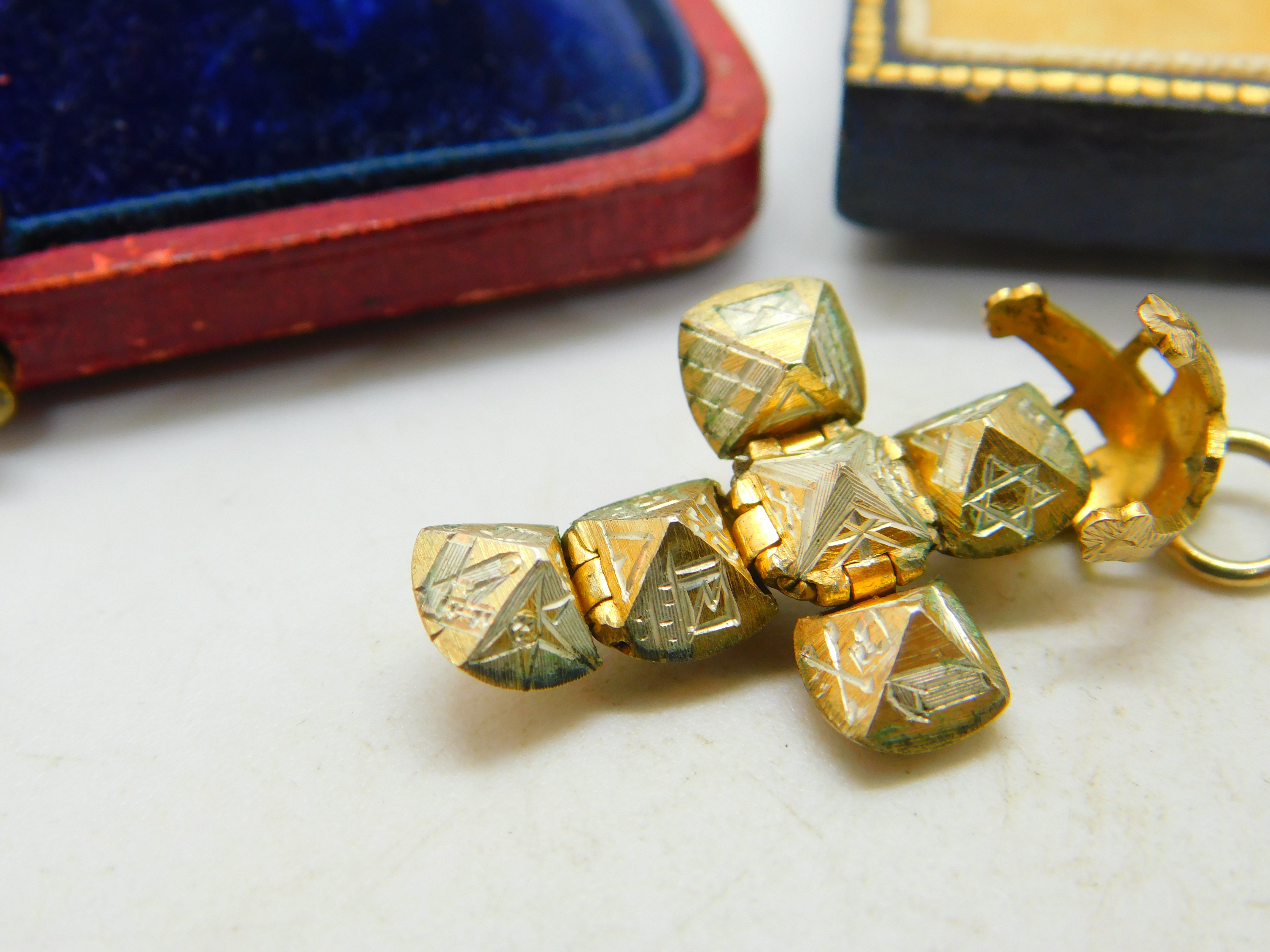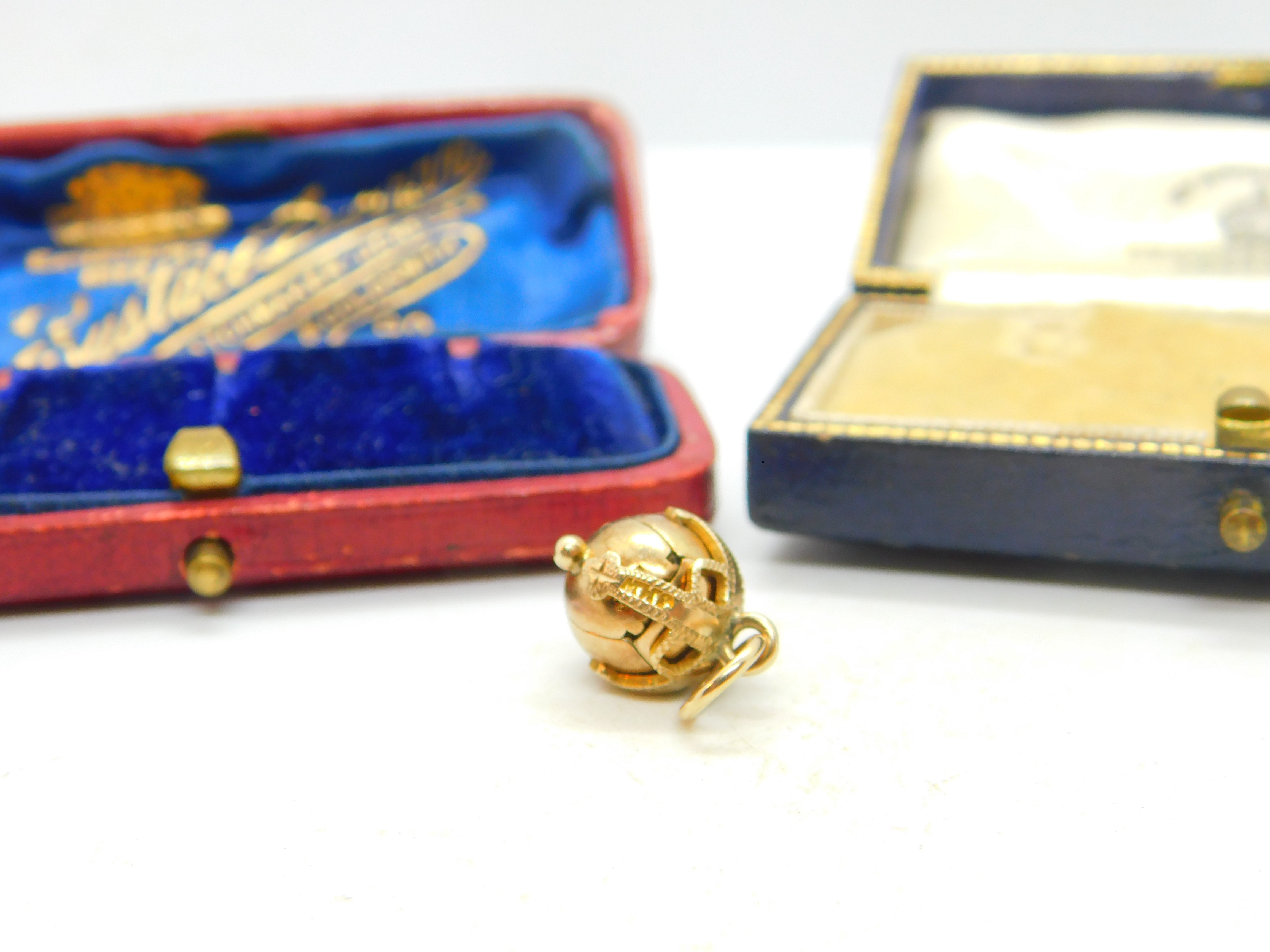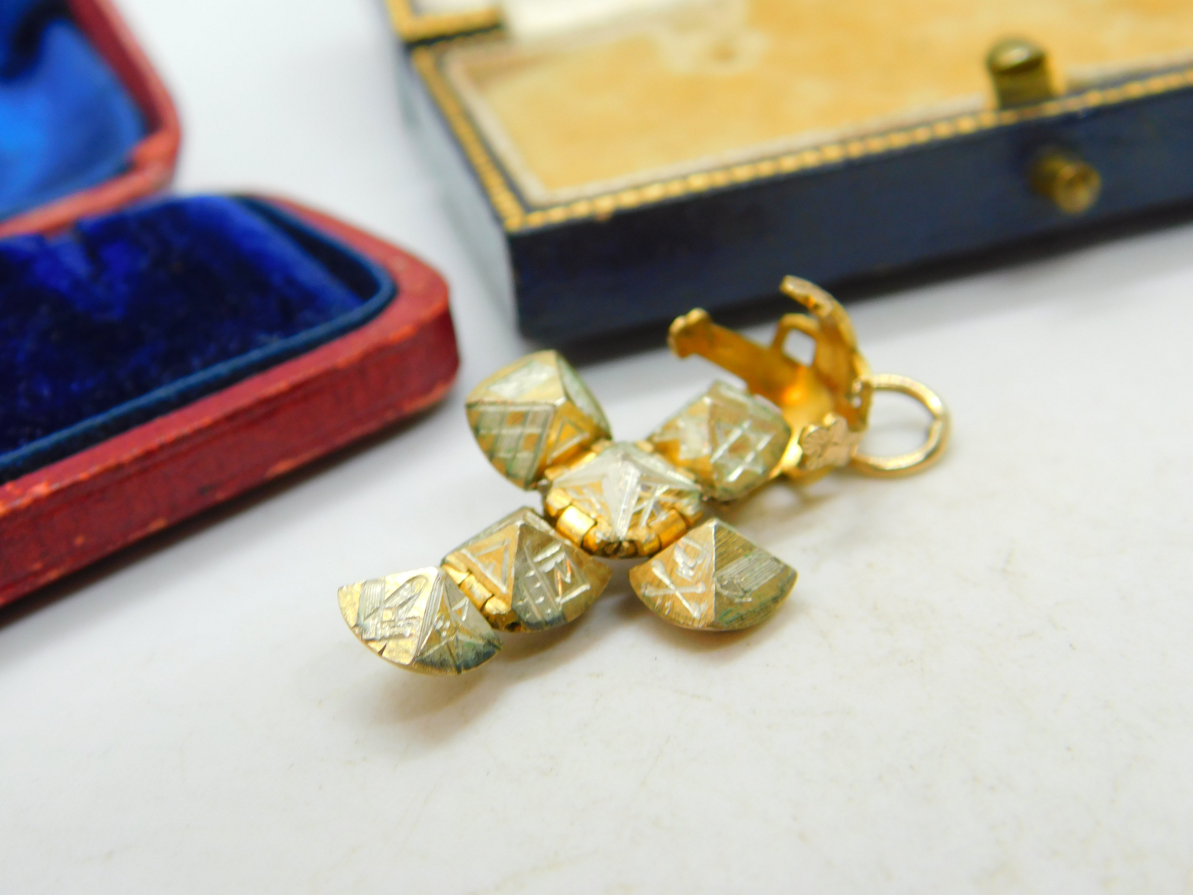 An intriguing 9ct yellow gold on Sterling Silver Masonic opening ball or orb into cross Pendant or charm. This Art Deco Freemasons pendant is in good used condition and closes good and secure. marked to the base: 'made In England'.