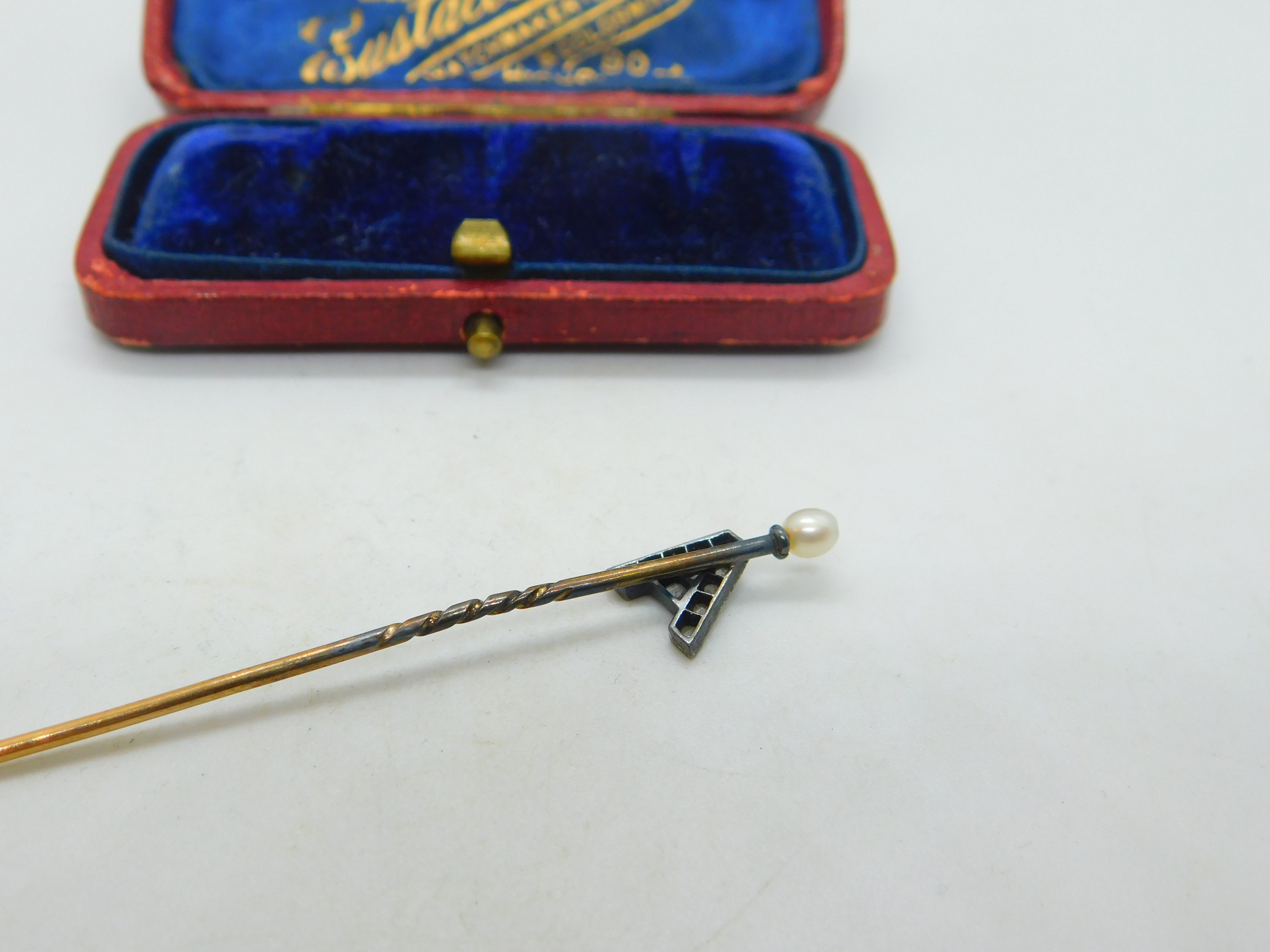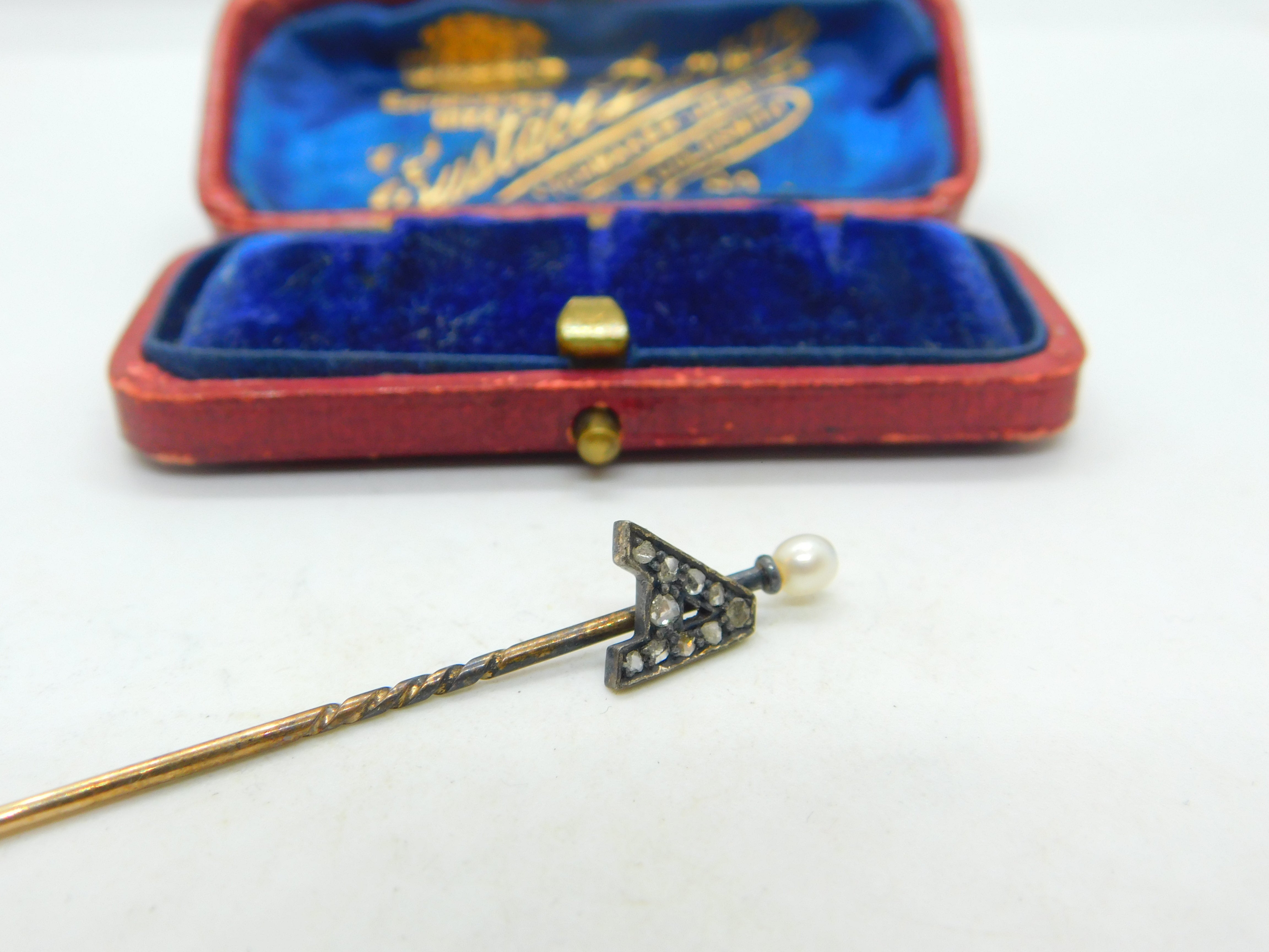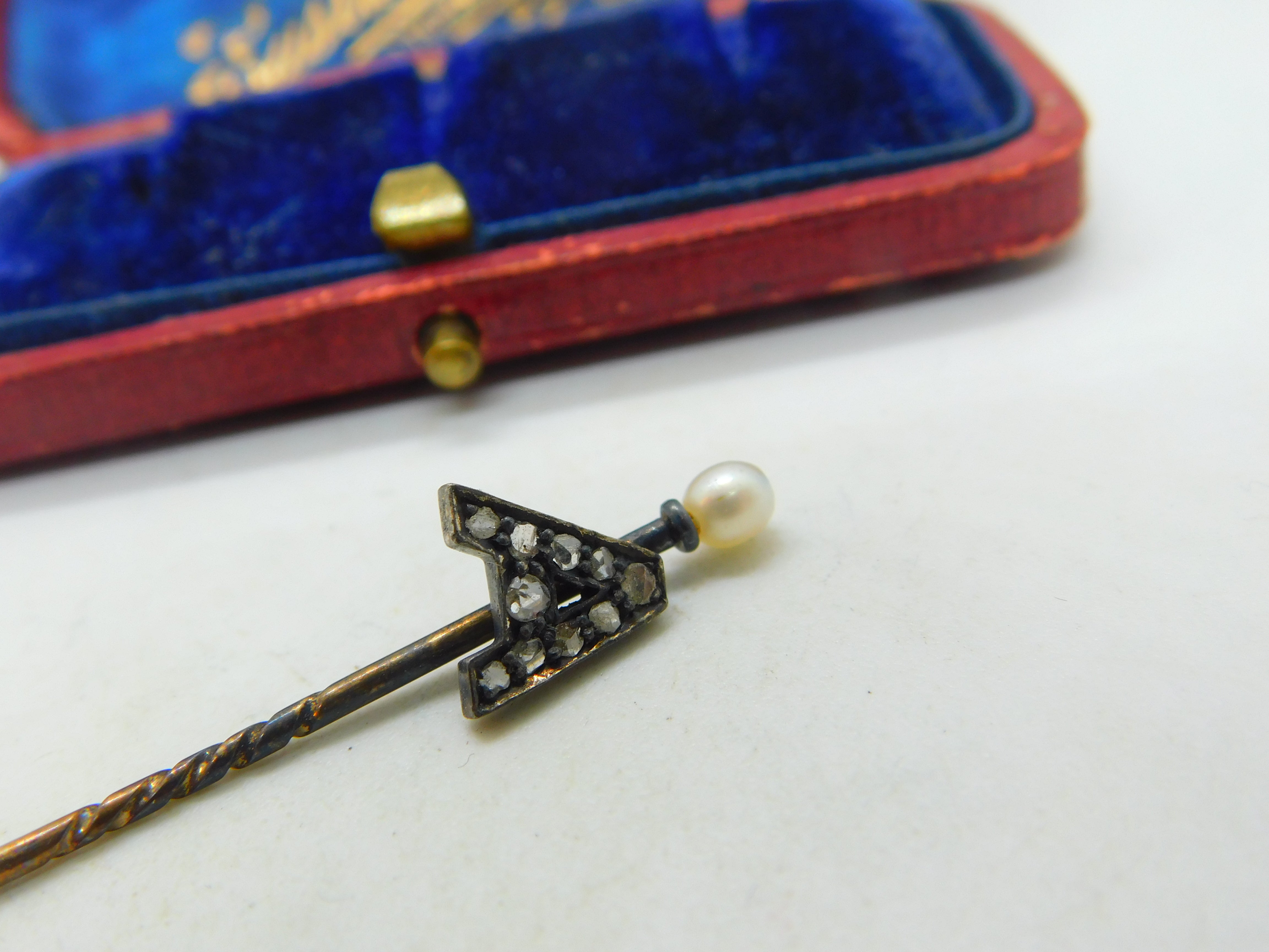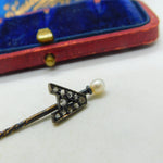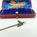 9ct Yellow Gold, Pearl & Diamond Set 'A' Initial Stick Pin Antique c1900