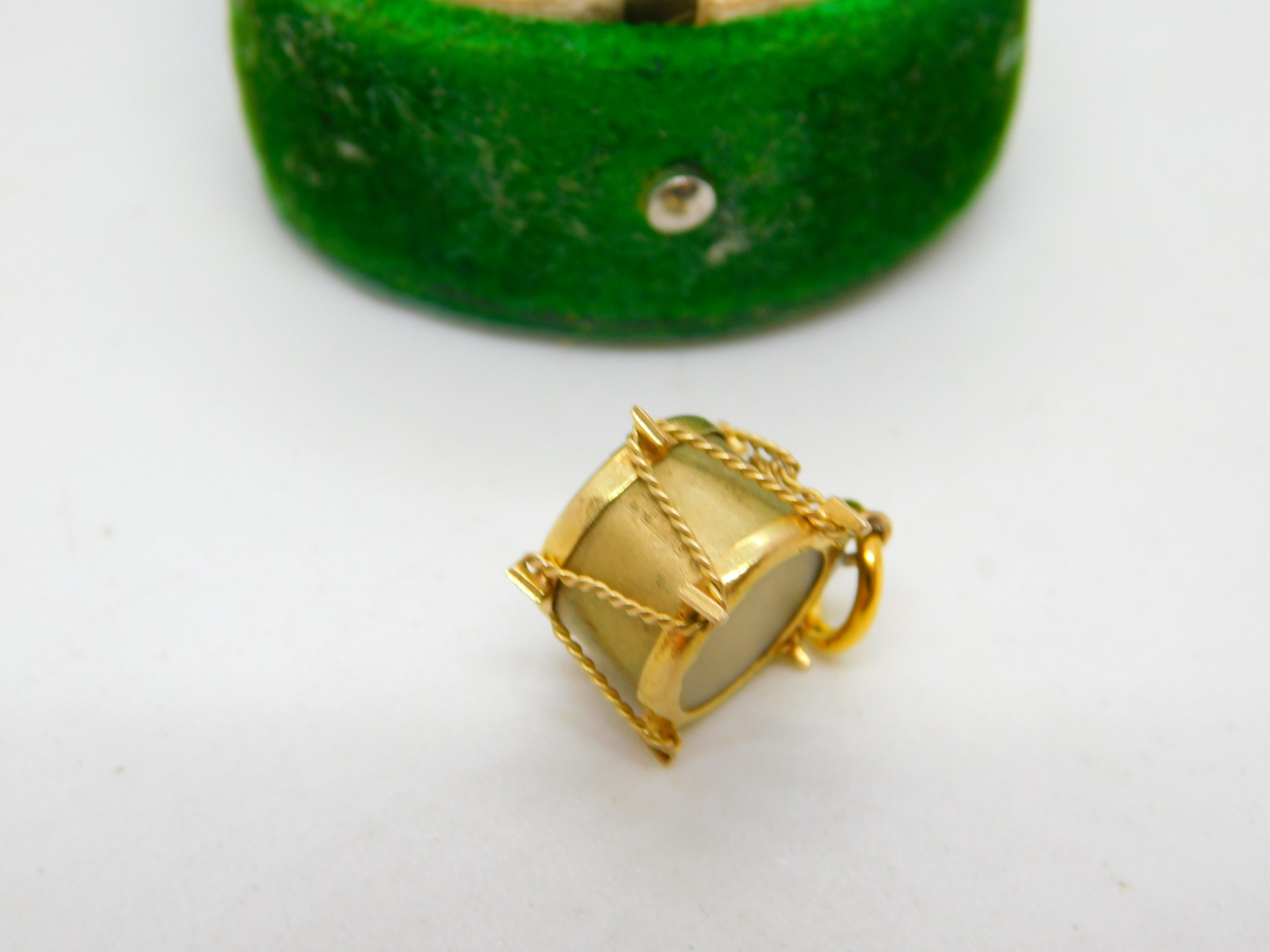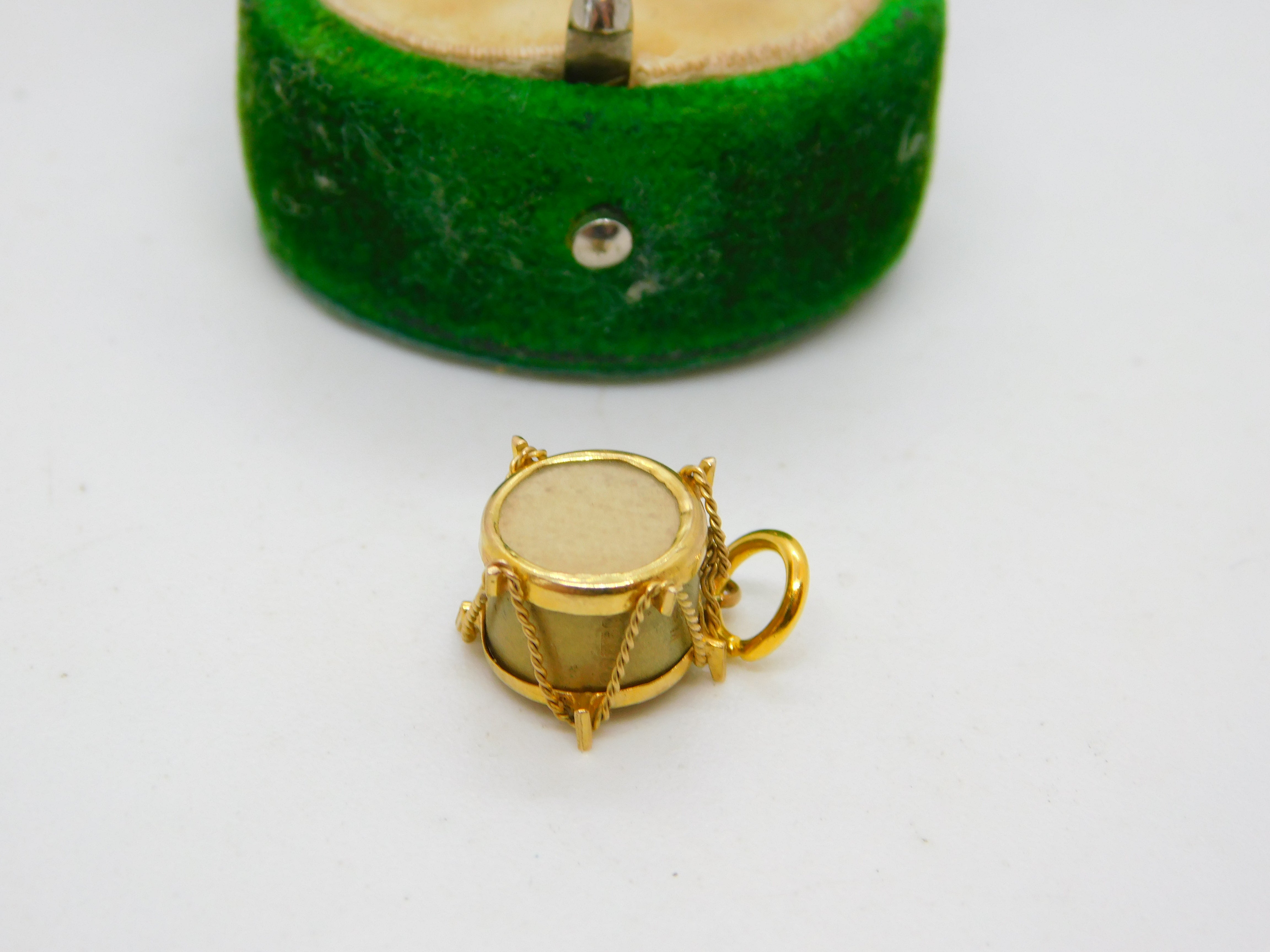 Details: A fantastic and wonderfully designed vintage 9ct yellow gold percussion drum charm or pendant hallmarked London 1977 to the edge. This is a wonderful item that would make a perfect gift or addition to any collection. The BOX pictured is for PRESENTATION ONLY and is NOT included in the listings but used to frame the pictures unless specifically stated otherwise.
